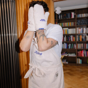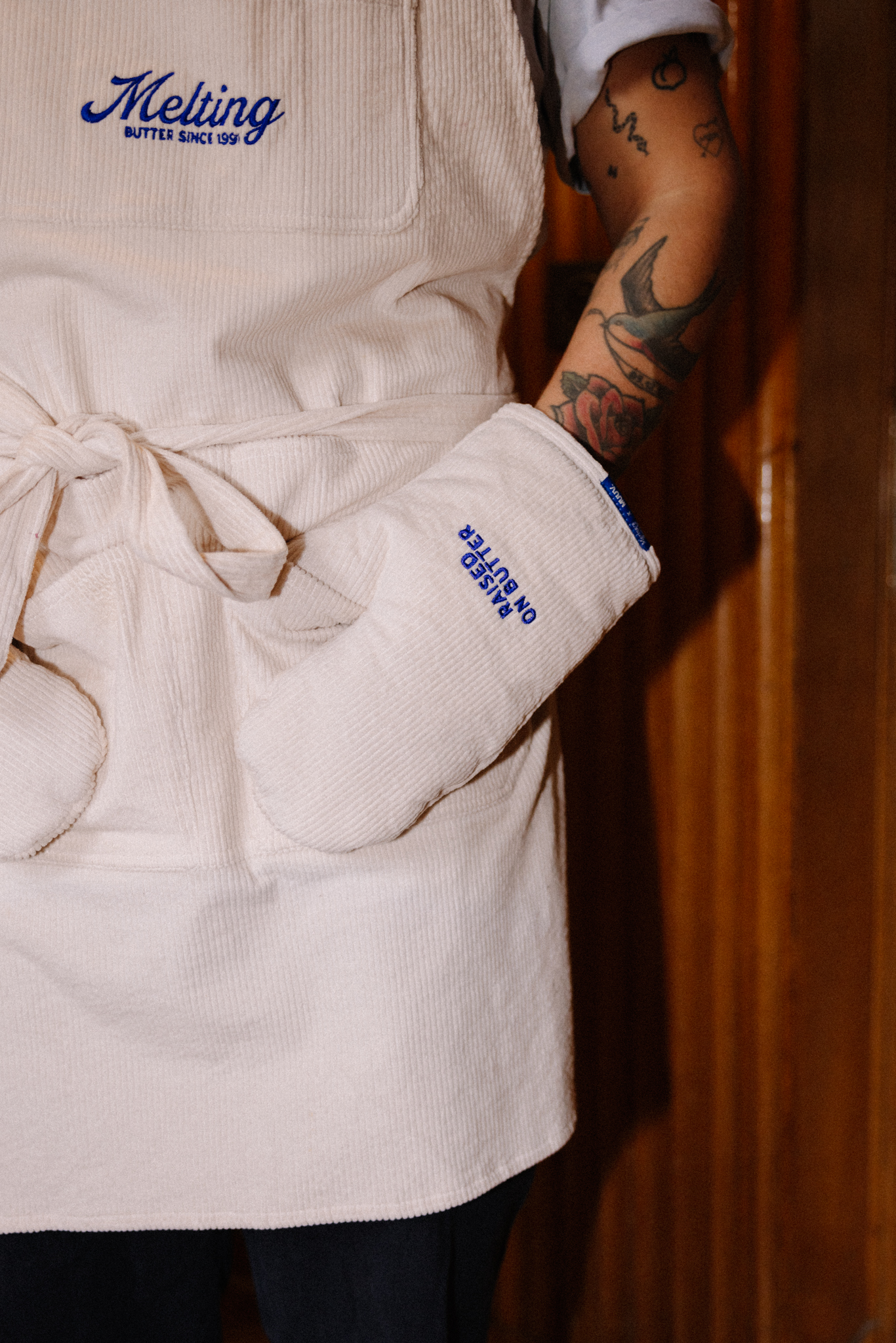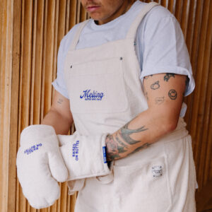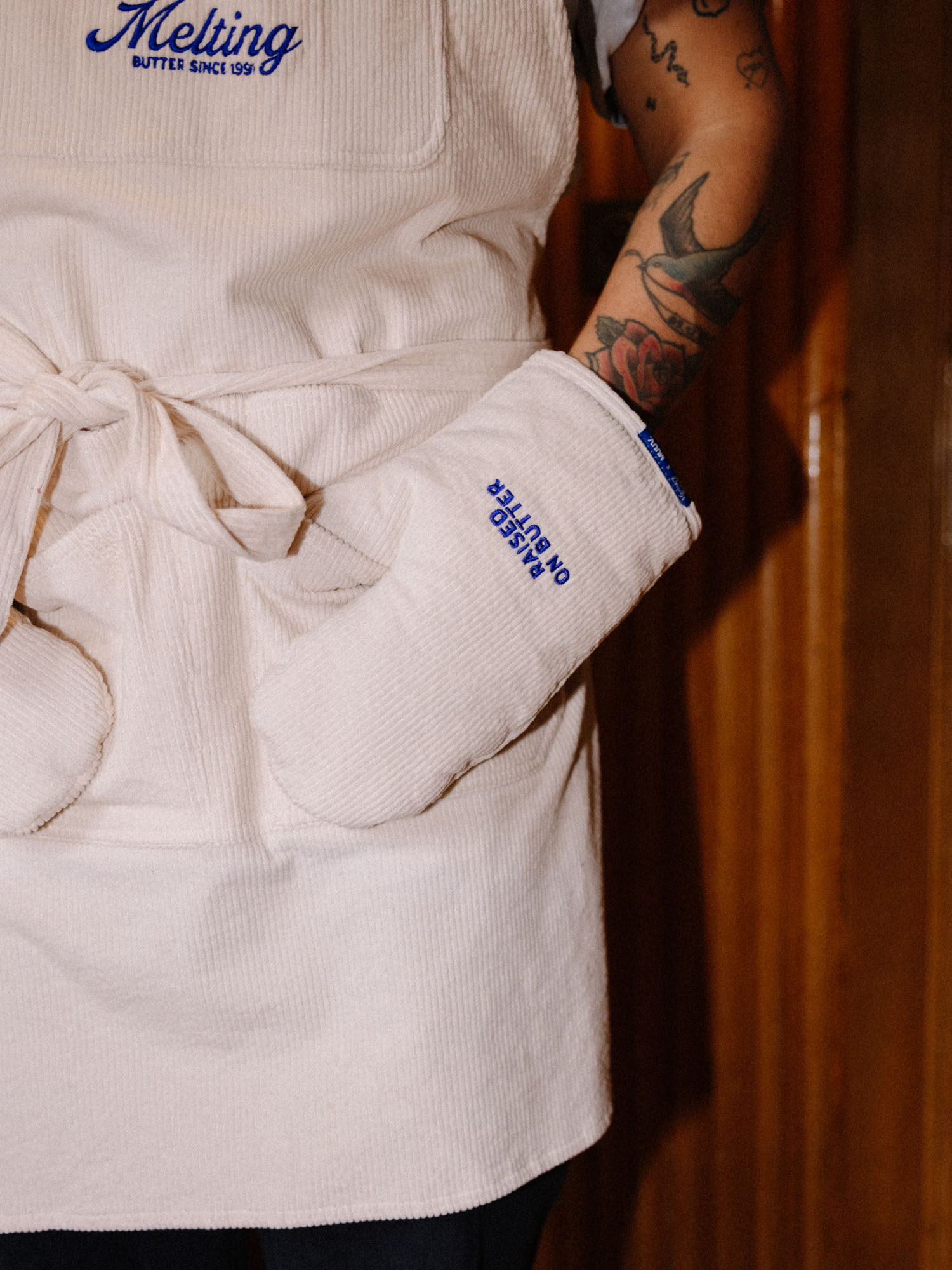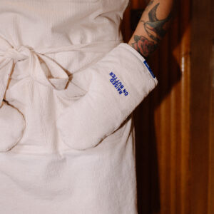 Rękawica kuchenna uszyta z bawełnianego sztruksu z haftem w kolorze kobaltowym z napisem “RAISED ON BUTTER” na obu rękawicach. Odporne na wysoką temperaturę rękawice chronią dłonie przed gorącymi brytfannami i patelniami. To połączenie doskonałej jakości, praktycznych rozwiązań i dobrego stylu. Rękawica posiada pętelkę do zawieszenia w kuchni. To niezbędny element wyposażenia każdej kuchni, idealnie sprawdzi się jako prezent dla miłośników gotowania oraz estetycznych rozwiązań.