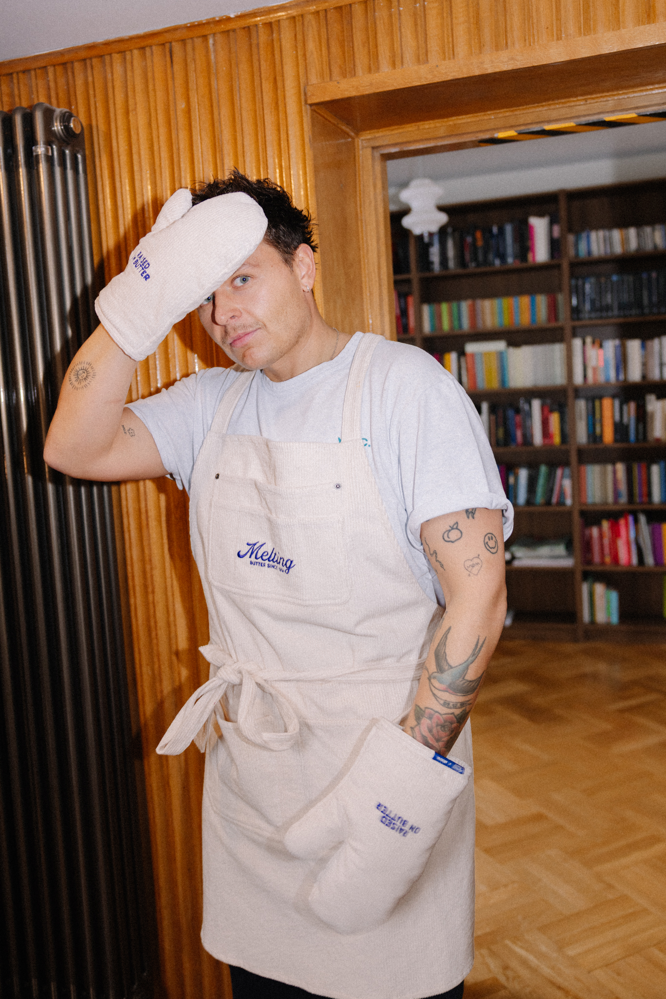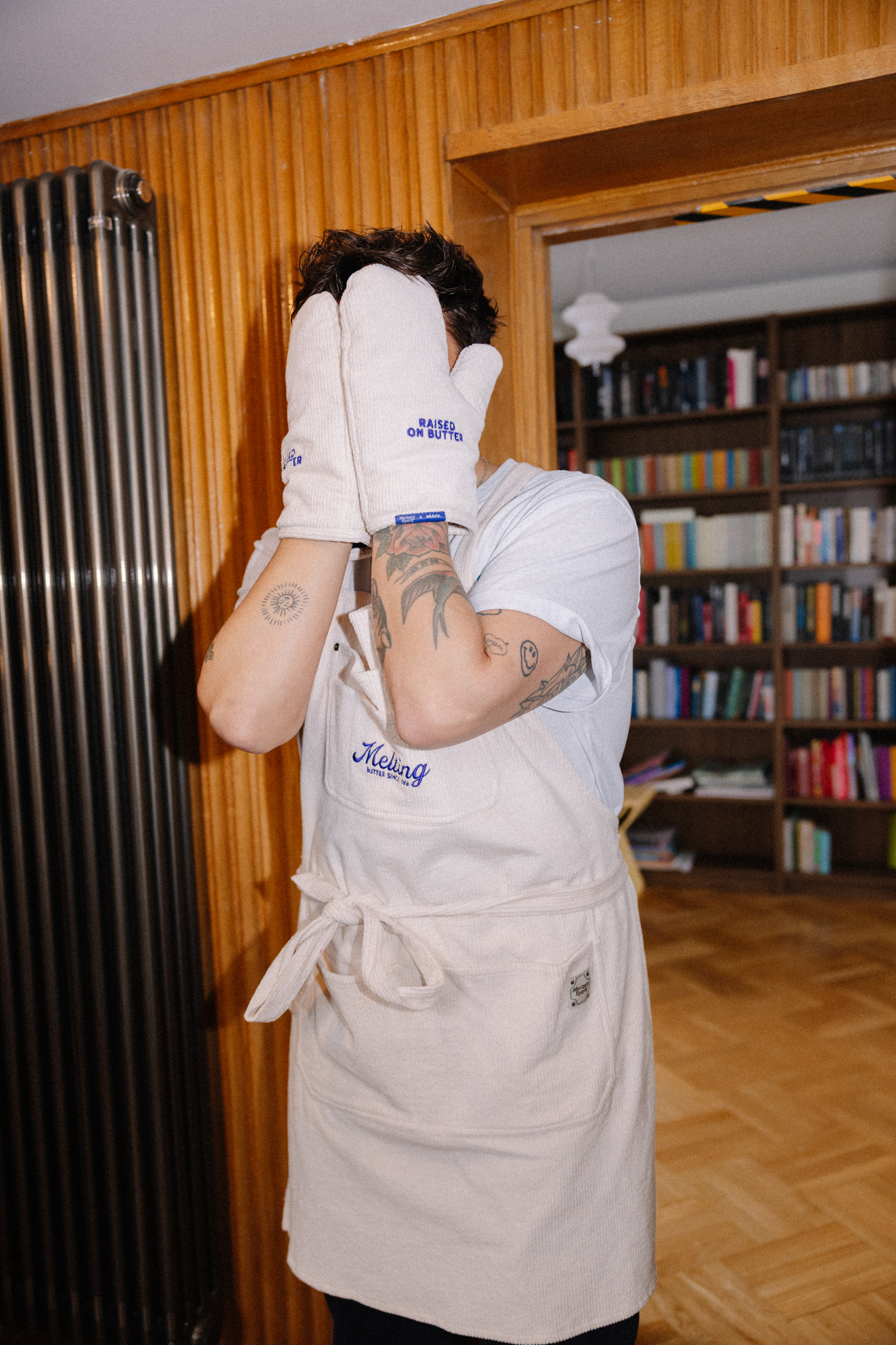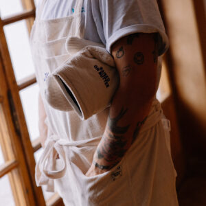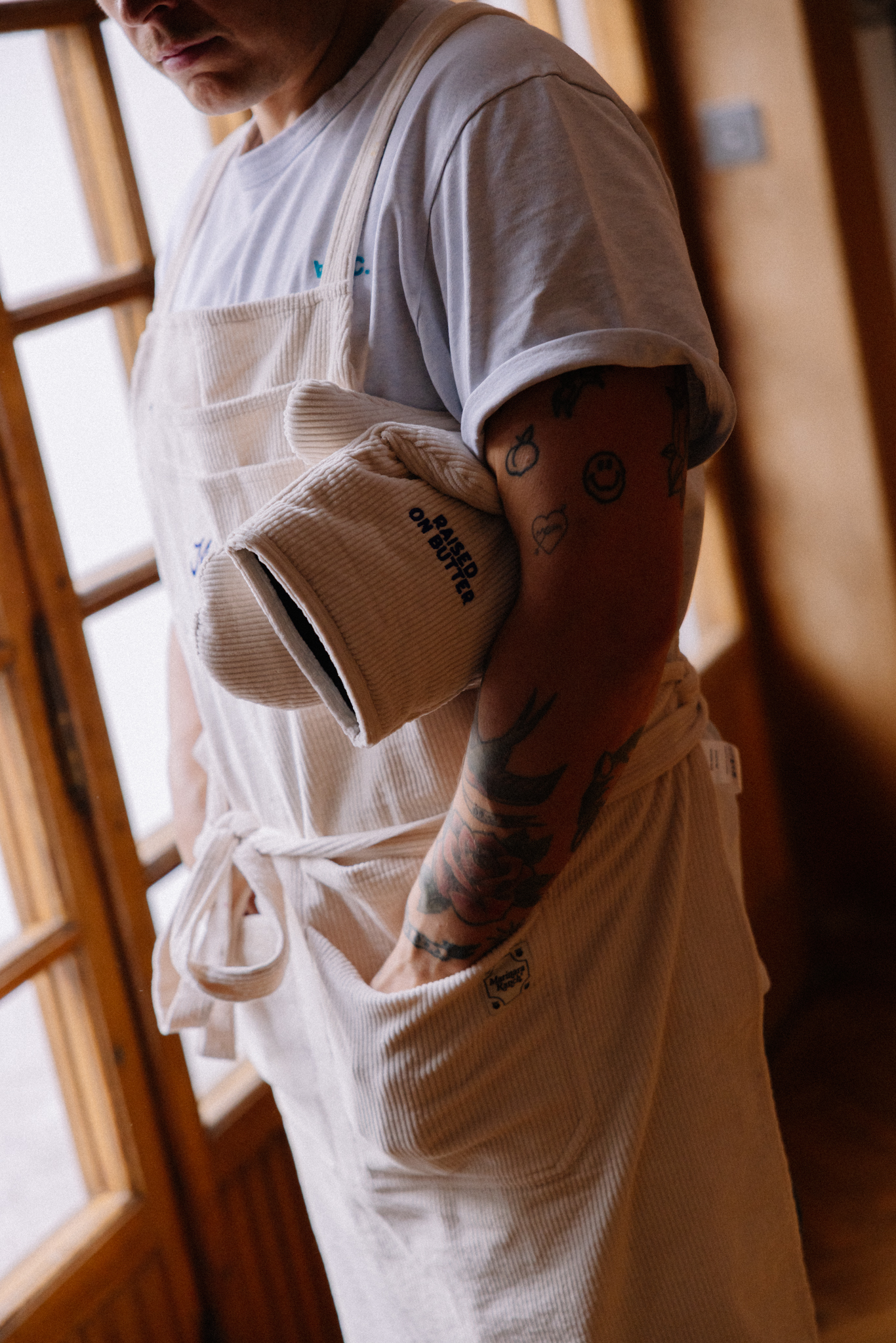 Rękawica kuchenna uszyta z bawełnianego sztruksu z haftem w kolorze kobaltowym z napisem “RAISED ON BUTTER” na obu rękawicach. Odporne na wysoką temperaturę rękawice chronią dłonie przed gorącymi brytfannami i patelniami. To połączenie doskonałej jakości, praktycznych rozwiązań i dobrego stylu. Rękawica posiada pętelkę do zawieszenia w kuchni. To niezbędny element wyposażenia każdej kuchni, idealnie sprawdzi się jako prezent dla miłośników gotowania oraz estetycznych rozwiązań.
