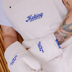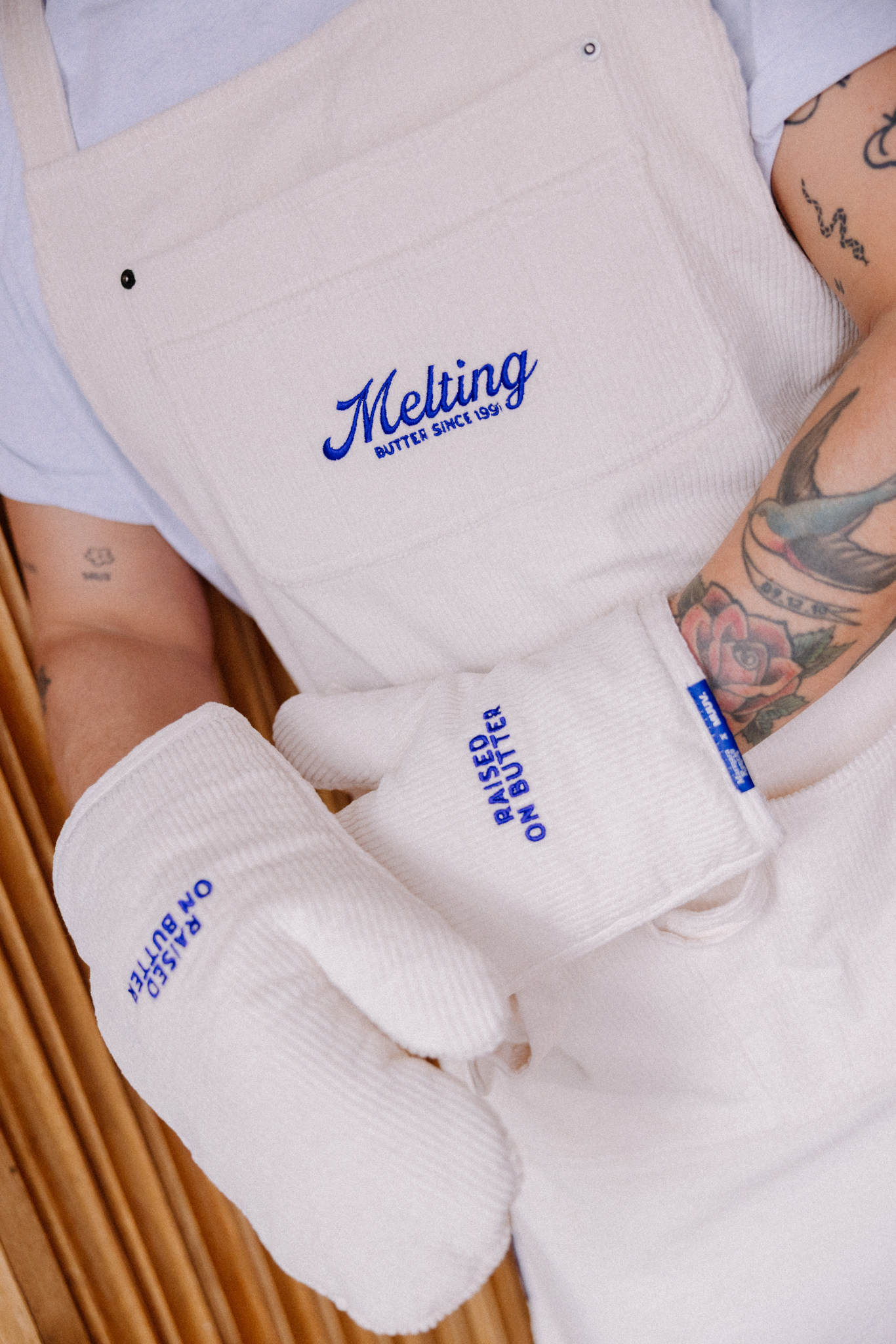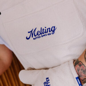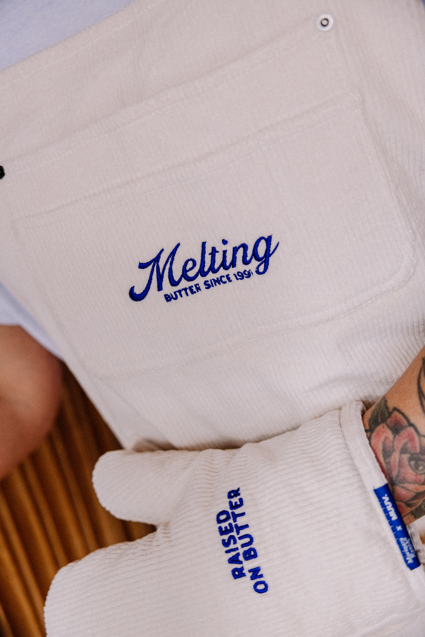 Fartuch kuchenny z haftowanym napisem MELTING BUTTER. Idealnie sprawdzi się do codziennego gotowania, a także na spotkania z przyjaciółmi czy grillowanie. Fartuch posiada funkcjonalne kieszenie na piersi i na wysokości pasa. Model posiada przyszyty pasek na szyje oraz paski do wiązania na wysokości talii. Jego sztruksowe wykończenie to modny wybór, który świetnie komponuje się z każdą kuchnią. Jest to również świetna opcja na prezent.