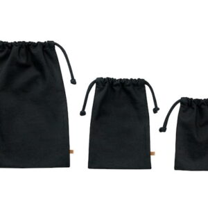Zestaw trzech, różnej wielkości, woreczków uszytych z matowej, bawełnianej tkaniny o mocnym, gęstym i delikatnie prążkowanym splocie, która nadaje im charakter jakościowego dodatku wykończonego sznureczkiem.
