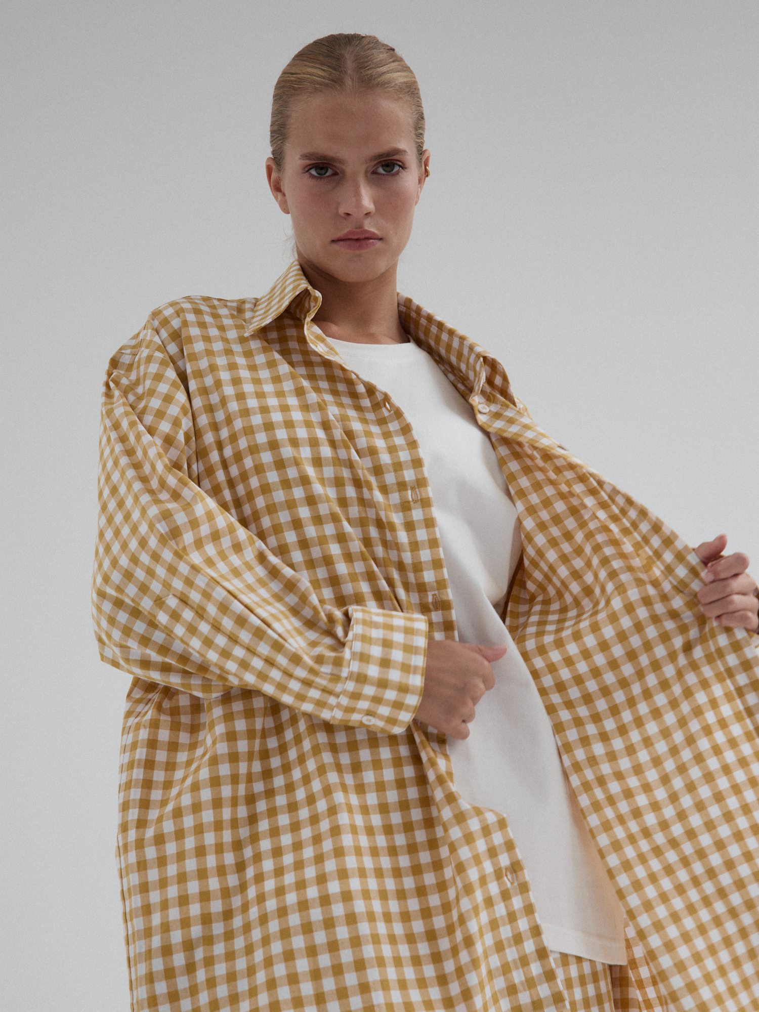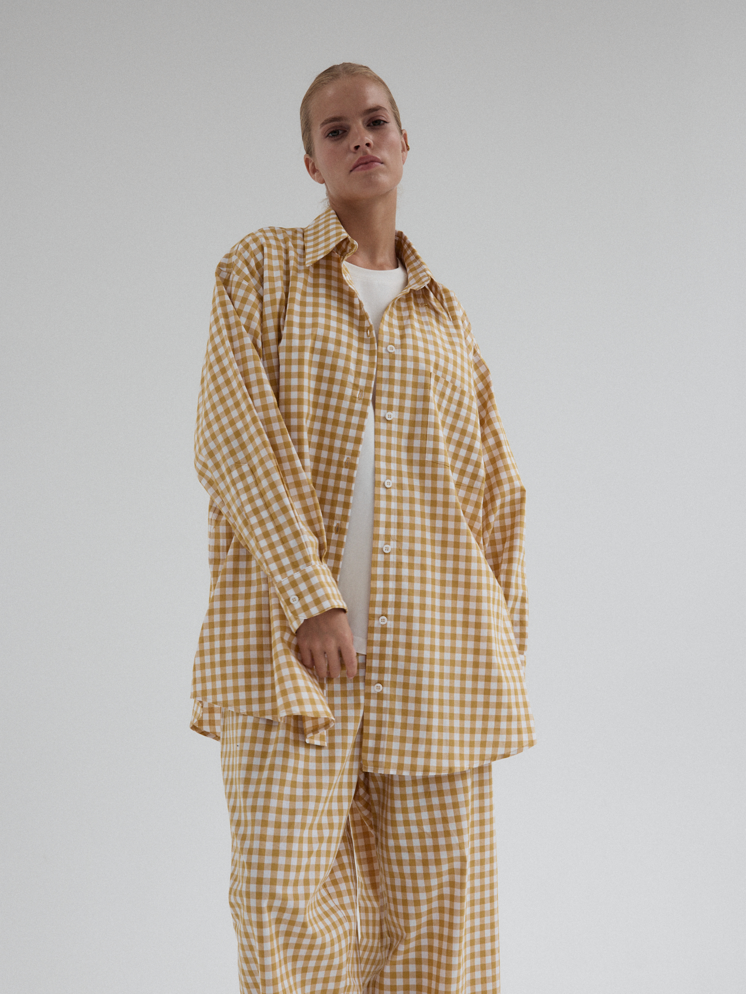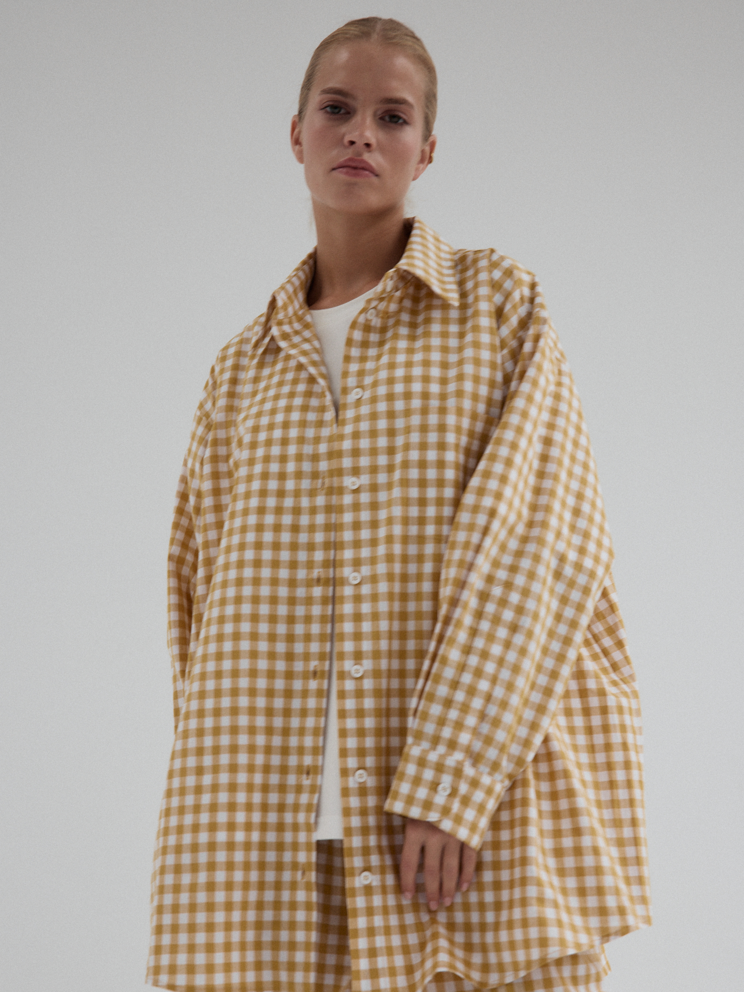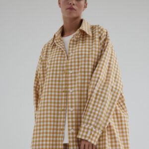 Koszula o luźnym, ultra oversize’owym kroju wykonana z bawełnianej tkaniny. Klasyczna, nieco wydłużona. Prosty, duży kołnierzyk, szerokie mankiety i kieszonka umieszczona z lewej strony dopełnia całości. Model zapinany na guziki. Świetne urozmaicenie minimalistycznych stylizacji. Model idealnie komponuje się z każdym rodzajem dołu. W komplecie ze spodniami MOIRE tworzy oryginalny set.
