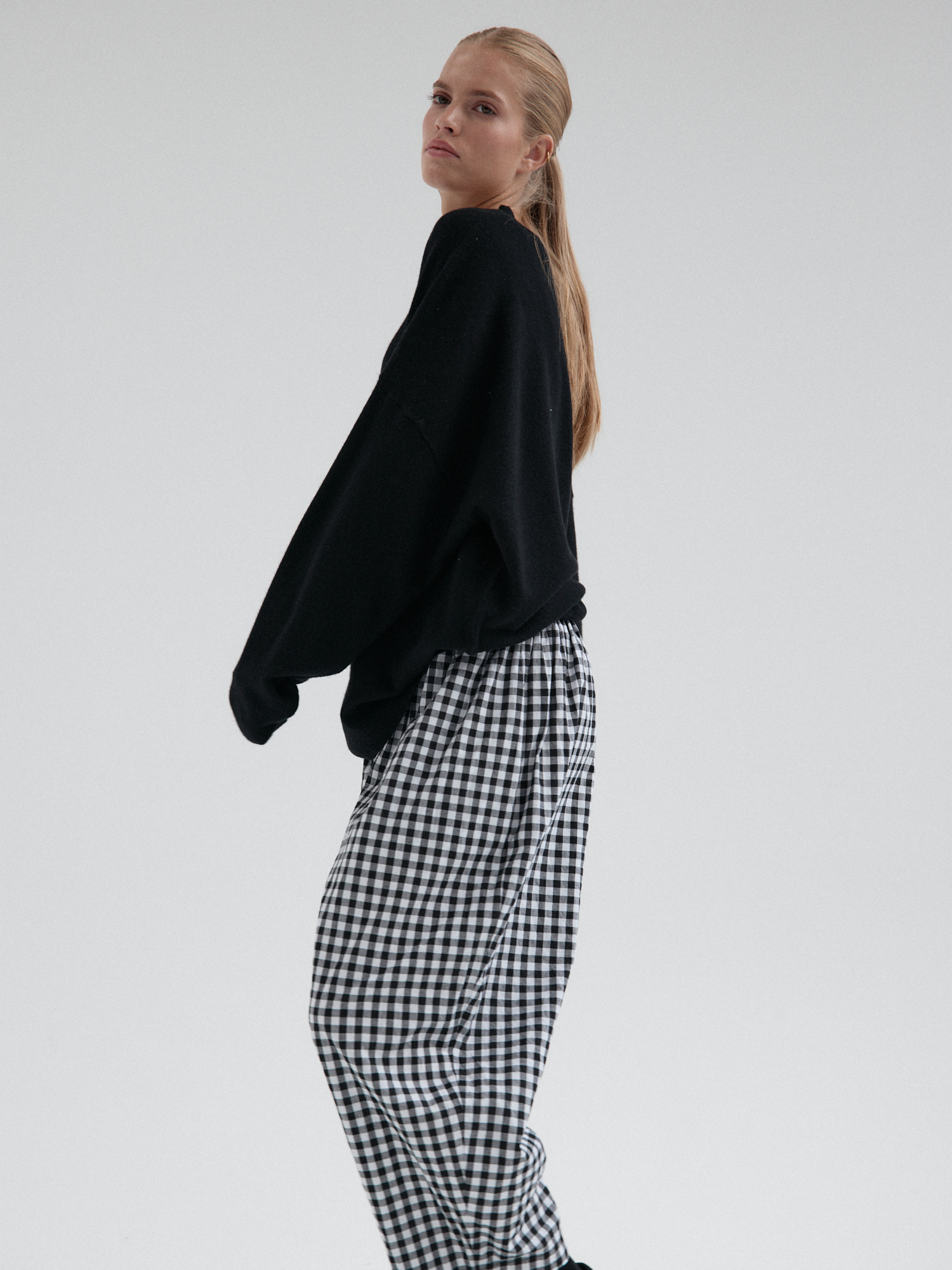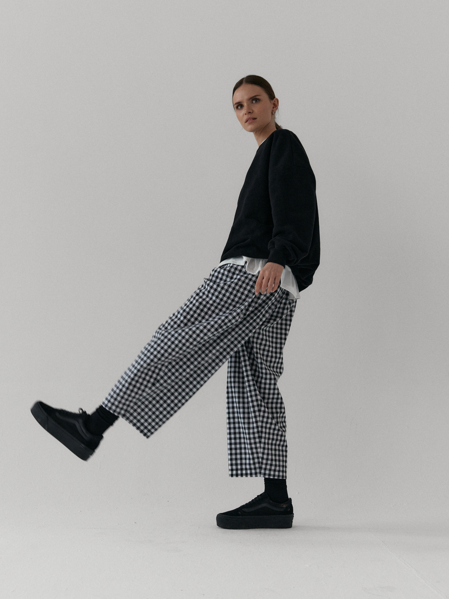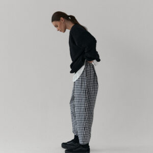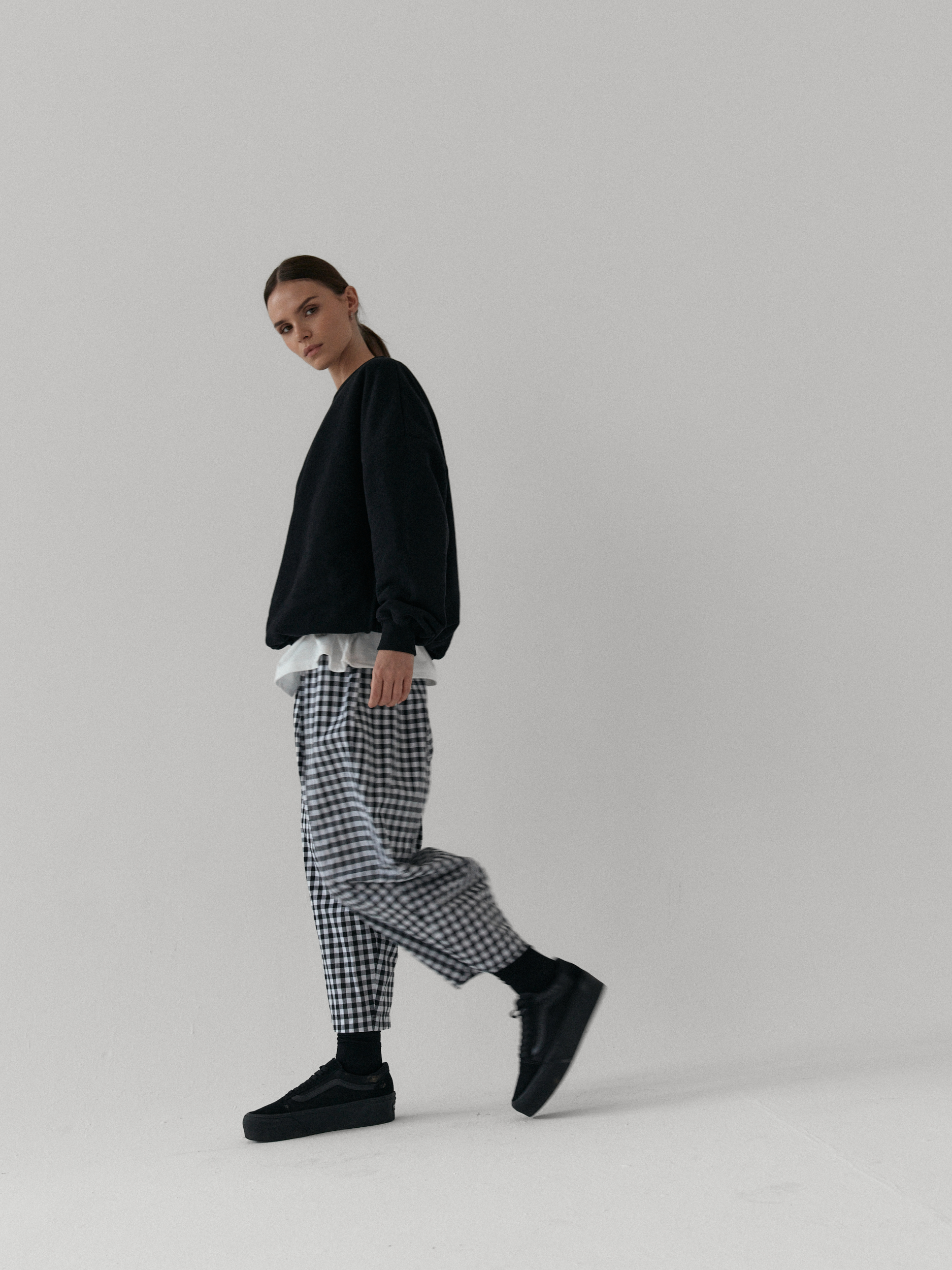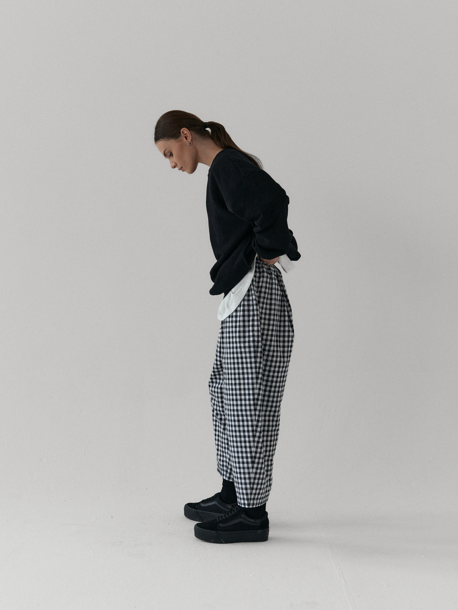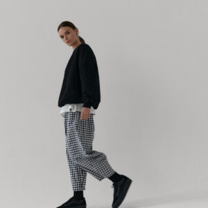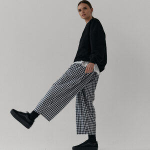 Wyjątkowe spodnie o kroju balloon. Uszyte z lekkiej, przewiewnej tkaniny w klasyczną kratkę, stanowią idealne połączenie swobody i elegancji. Szeroka, luźna nogawka zwężająca się ku dołowi tworzy charakterystyczny, nowoczesny fason, a elastyczna talia z marszczeniem gwarantuje komfort i idealne dopasowanie do sylwetki. Dzięki unikalnej formie spodnie stanowią świetne urozmaicenie codziennych stylizacji. Z naszą koszulą MOIRE tworzy idealny zestaw na każdą okazję.