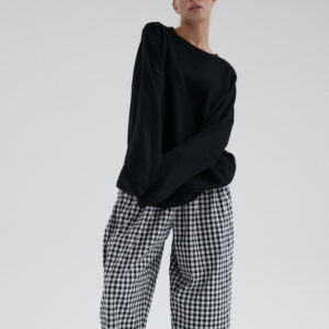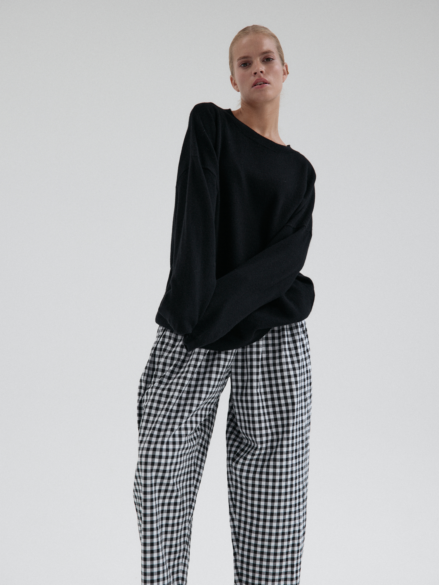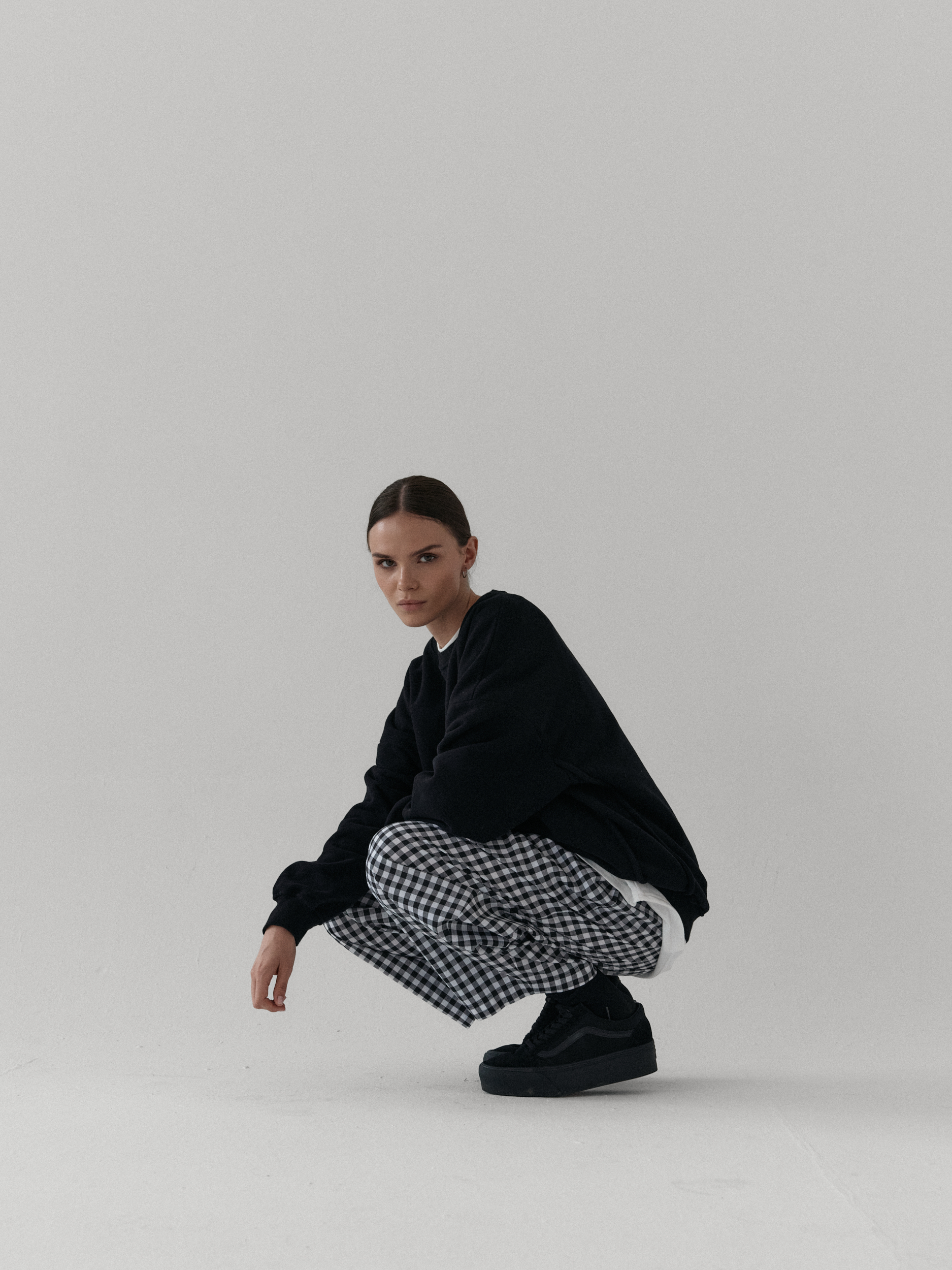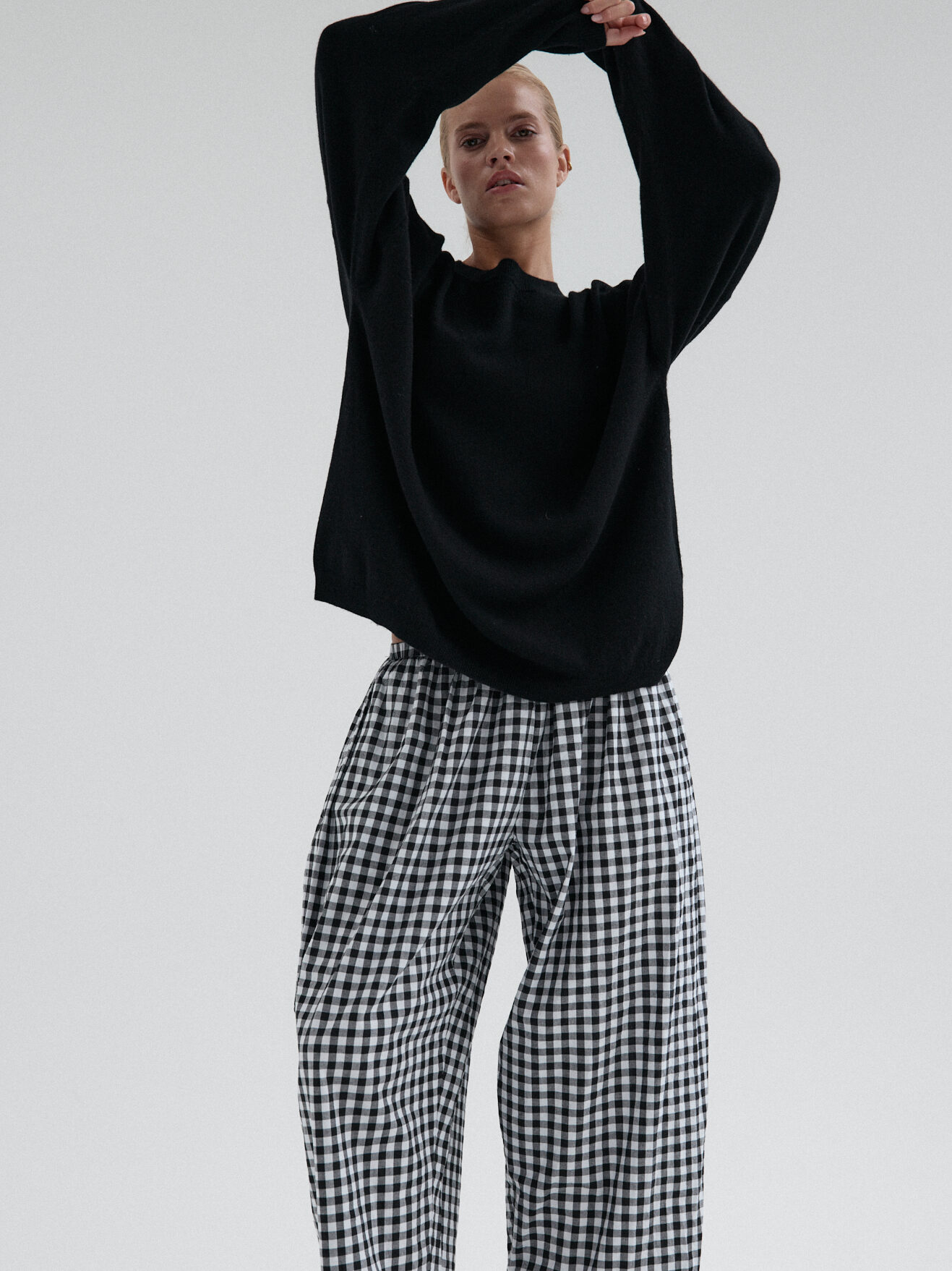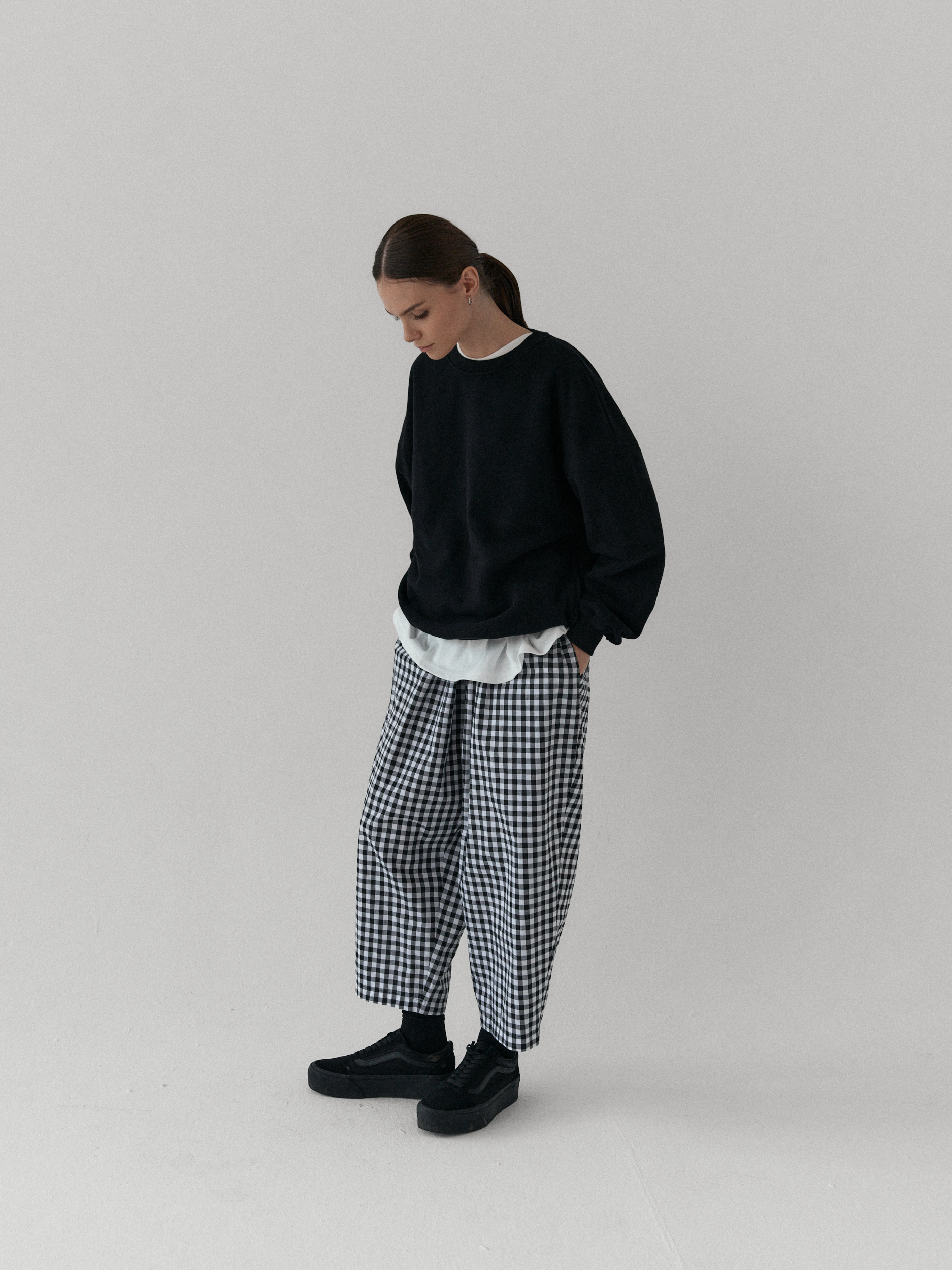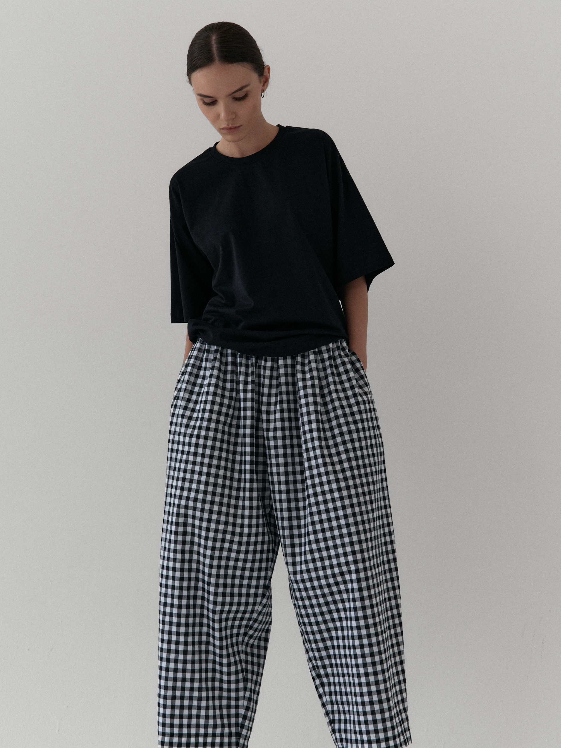 Wyjątkowe spodnie o kroju balloon. Uszyte z lekkiej, przewiewnej tkaniny w klasyczną kratkę, stanowią idealne połączenie swobody i elegancji. Szeroka, luźna nogawka zwężająca się ku dołowi tworzy charakterystyczny, nowoczesny fason, a elastyczna talia z marszczeniem gwarantuje komfort i idealne dopasowanie do sylwetki. Dzięki unikalnej formie spodnie stanowią świetne urozmaicenie codziennych stylizacji. Z naszą koszulą MOIRE tworzy idealny zestaw na każdą okazję.