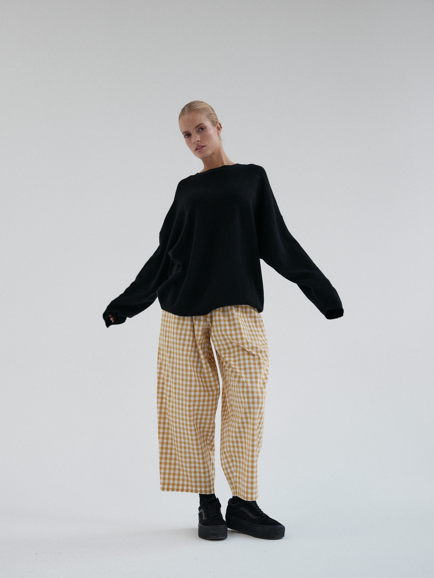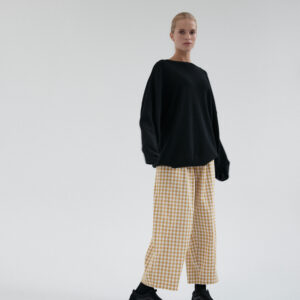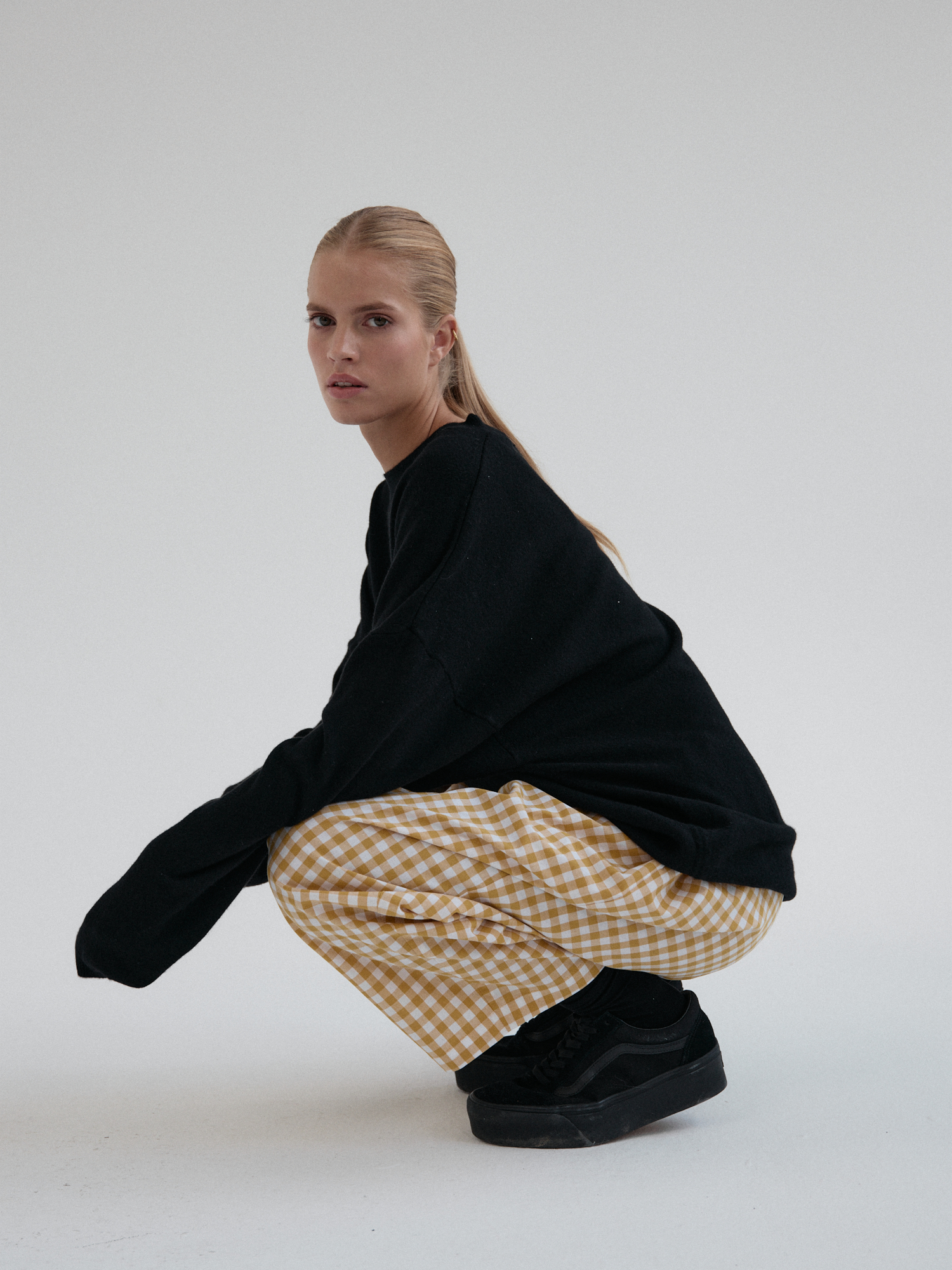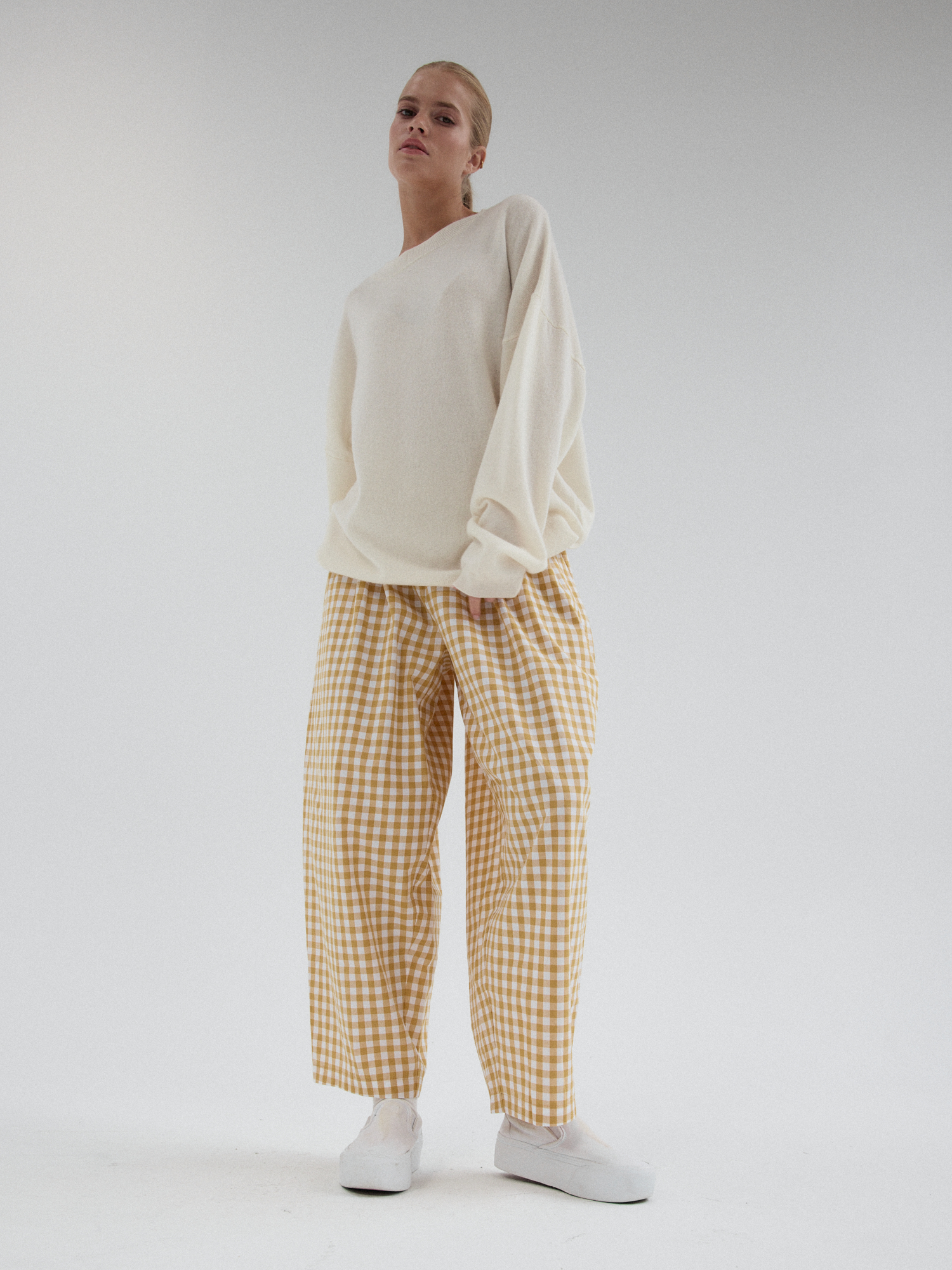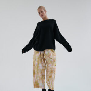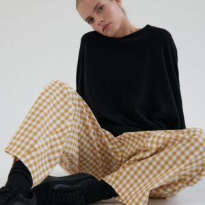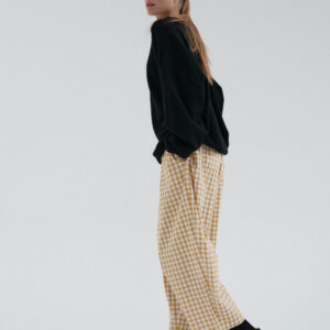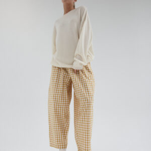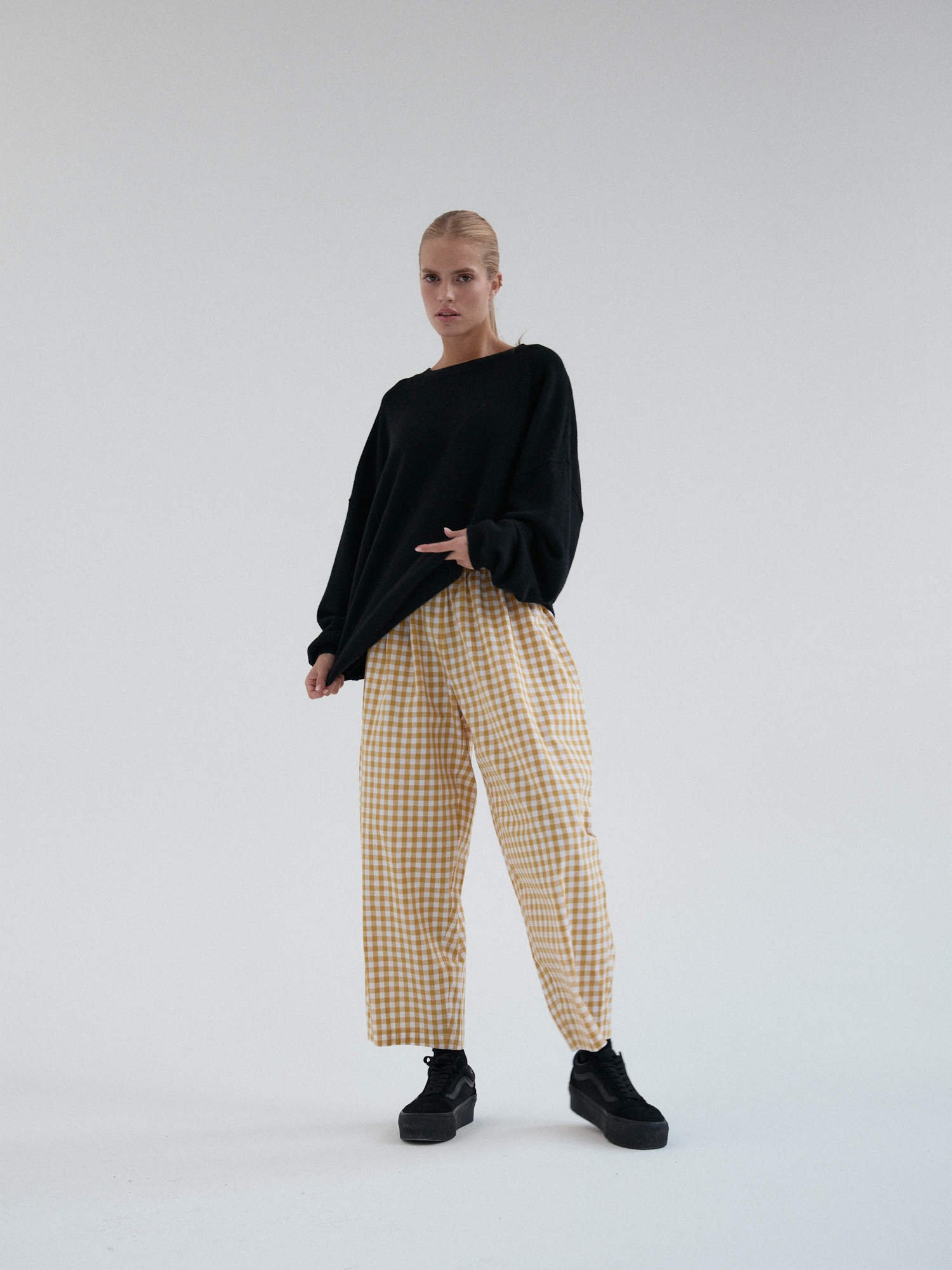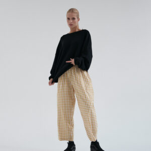 Wyjątkowe spodnie o kroju balloon. Uszyte z lekkiej, przewiewnej tkaniny w klasyczną kratkę, stanowią idealne połączenie swobody i elegancji. Szeroka, luźna nogawka zwężająca się ku dołowi tworzy charakterystyczny, nowoczesny fason, a elastyczna talia z marszczeniem gwarantuje komfort i idealne dopasowanie do sylwetki. Dzięki unikalnej formie spodnie stanowią świetne urozmaicenie codziennych stylizacji. Z naszą koszulą MOIRE tworzy idealny zestaw na każdą okazję.