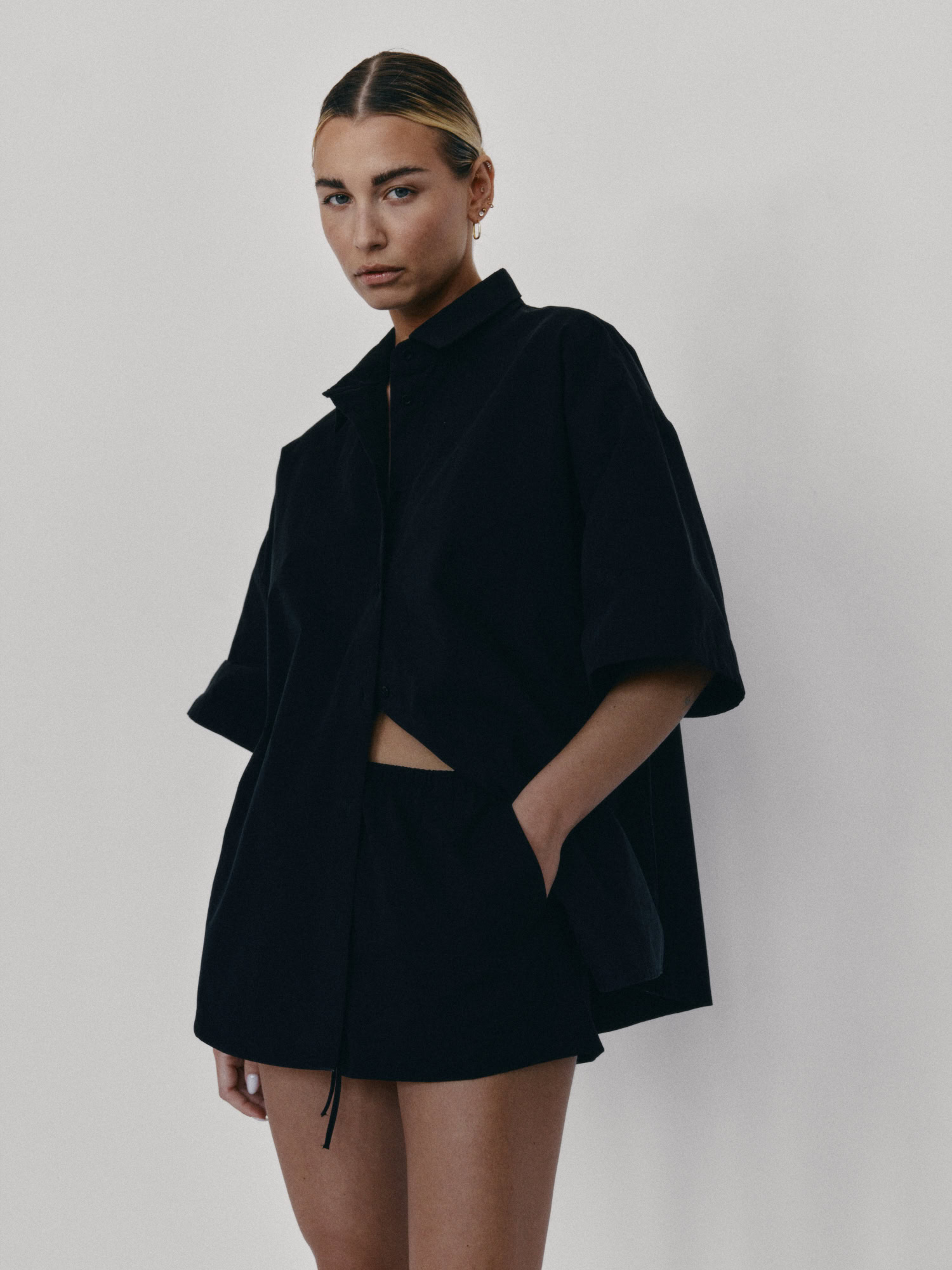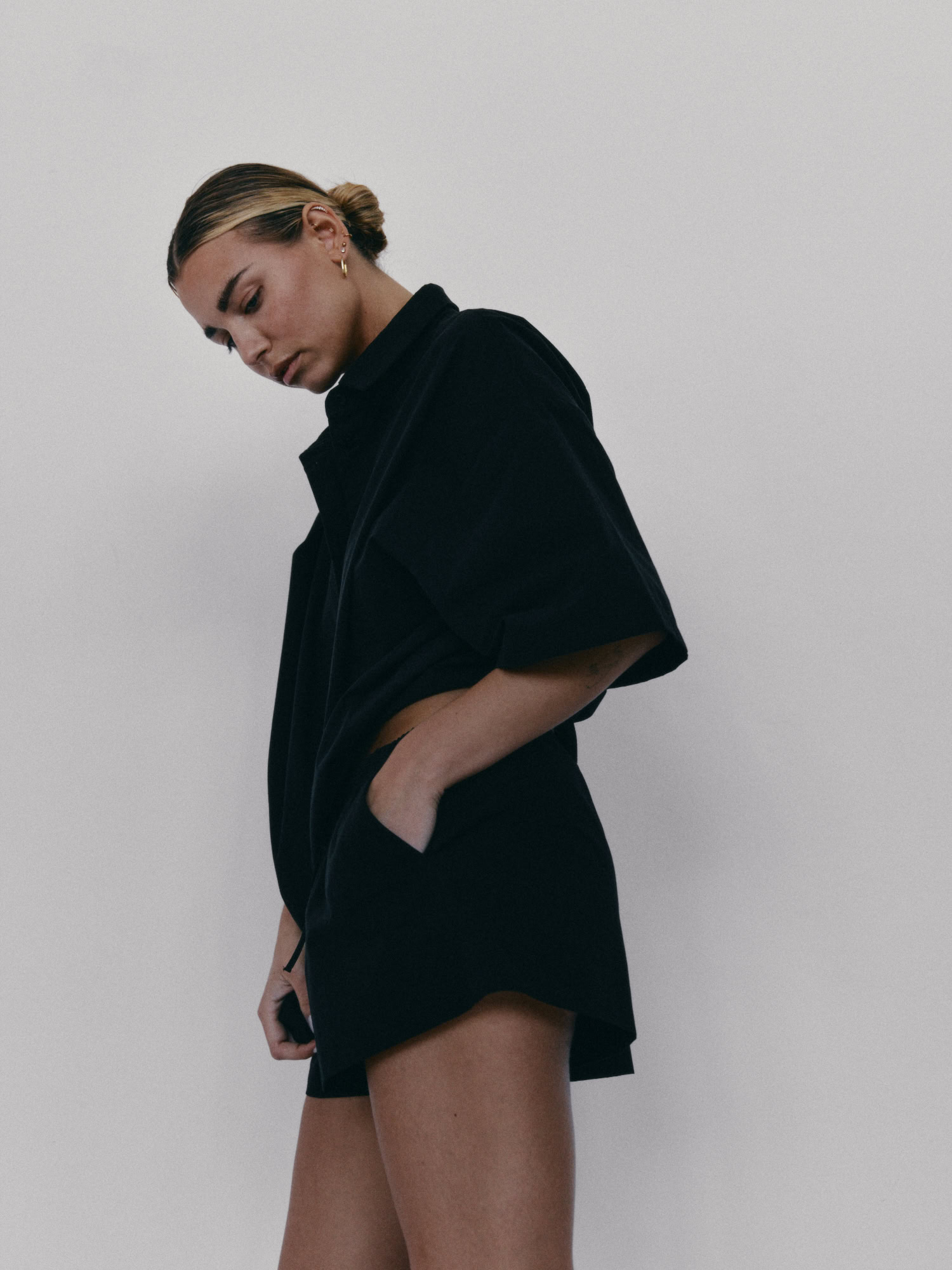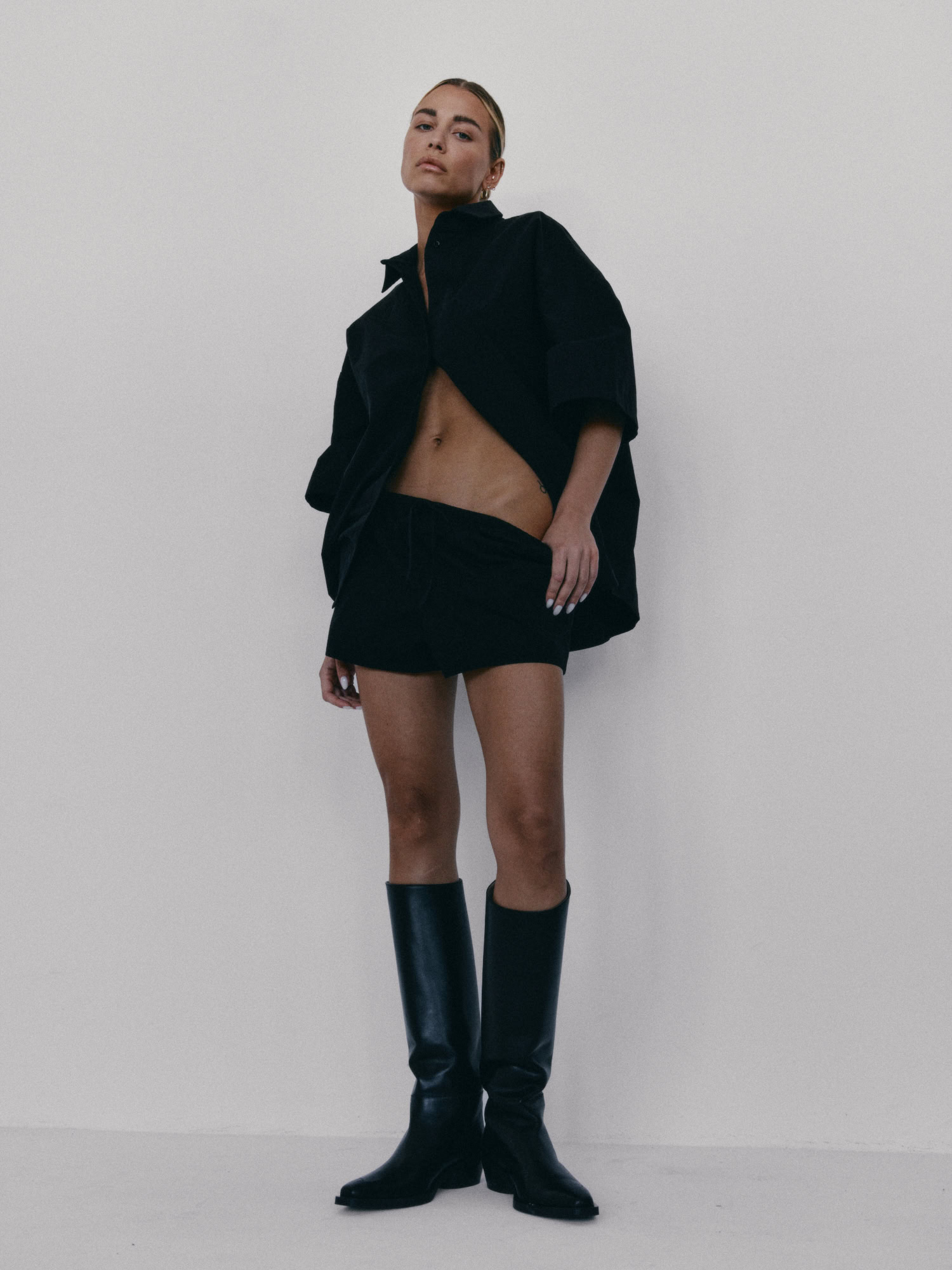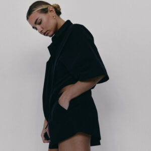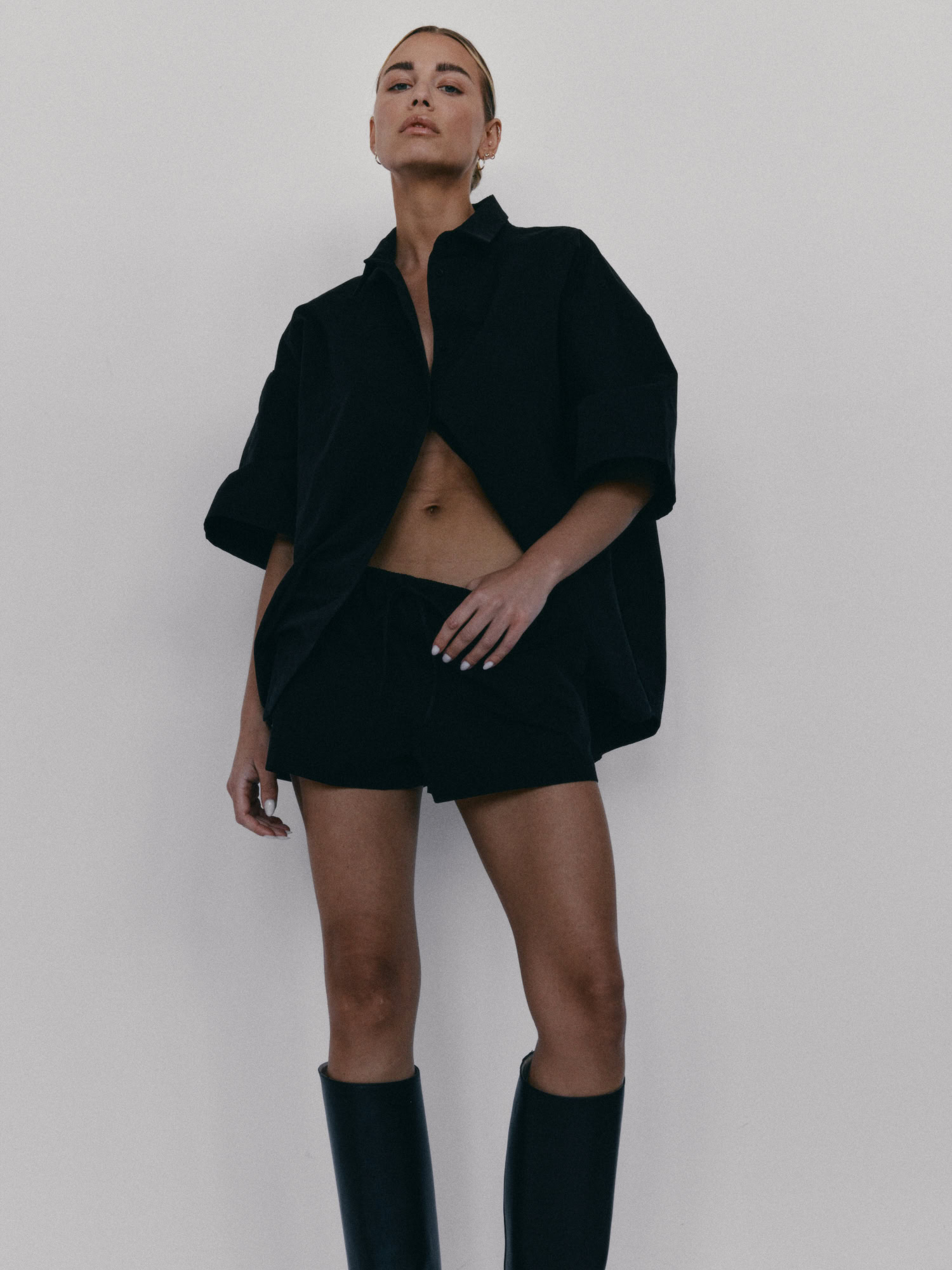 Bawełniane szorty o średnim stanie z elastyczną talią regulowaną sznurkiem. Model posiada dwie funkcjonalne kieszenie. Idealnie sprawdzi się zarówno z oversize’owym T-shirtem jak i dopasowanym topem.
