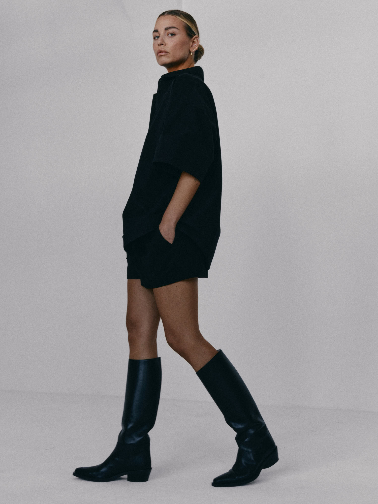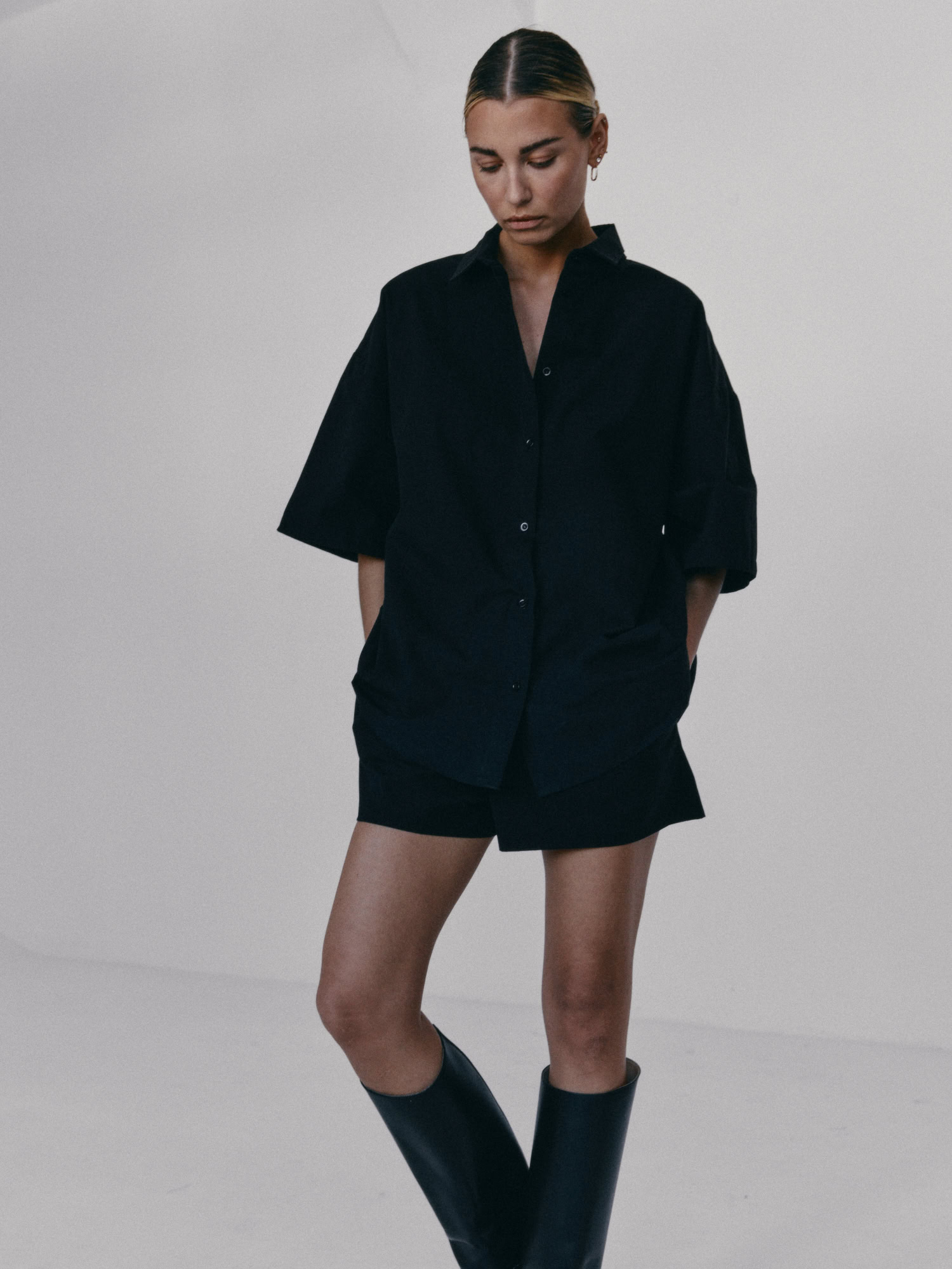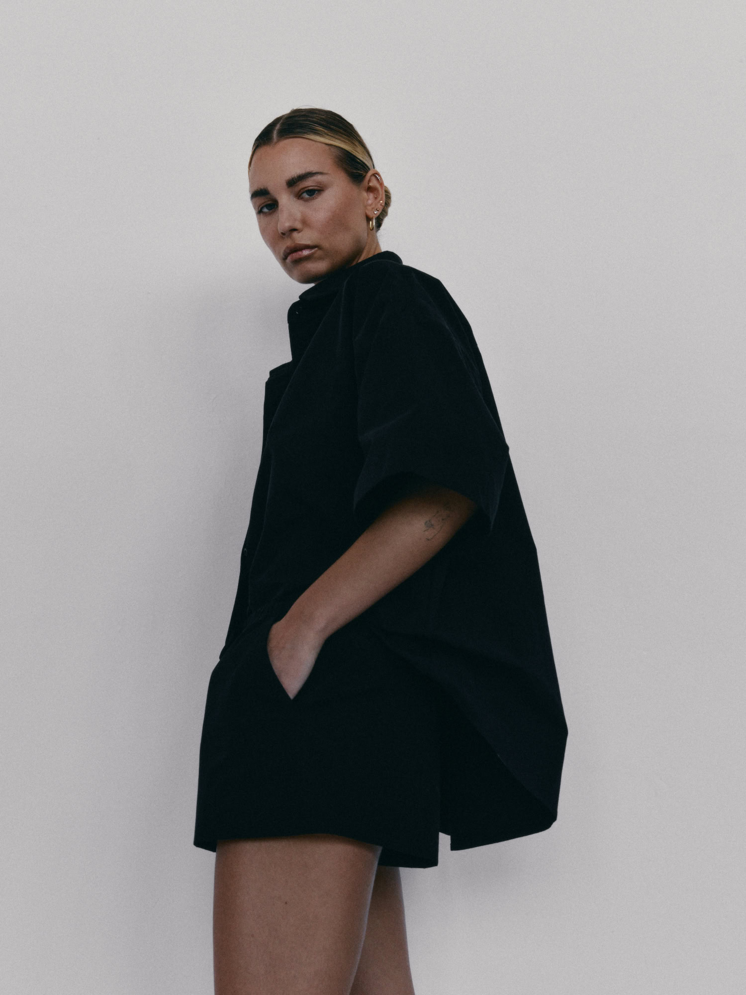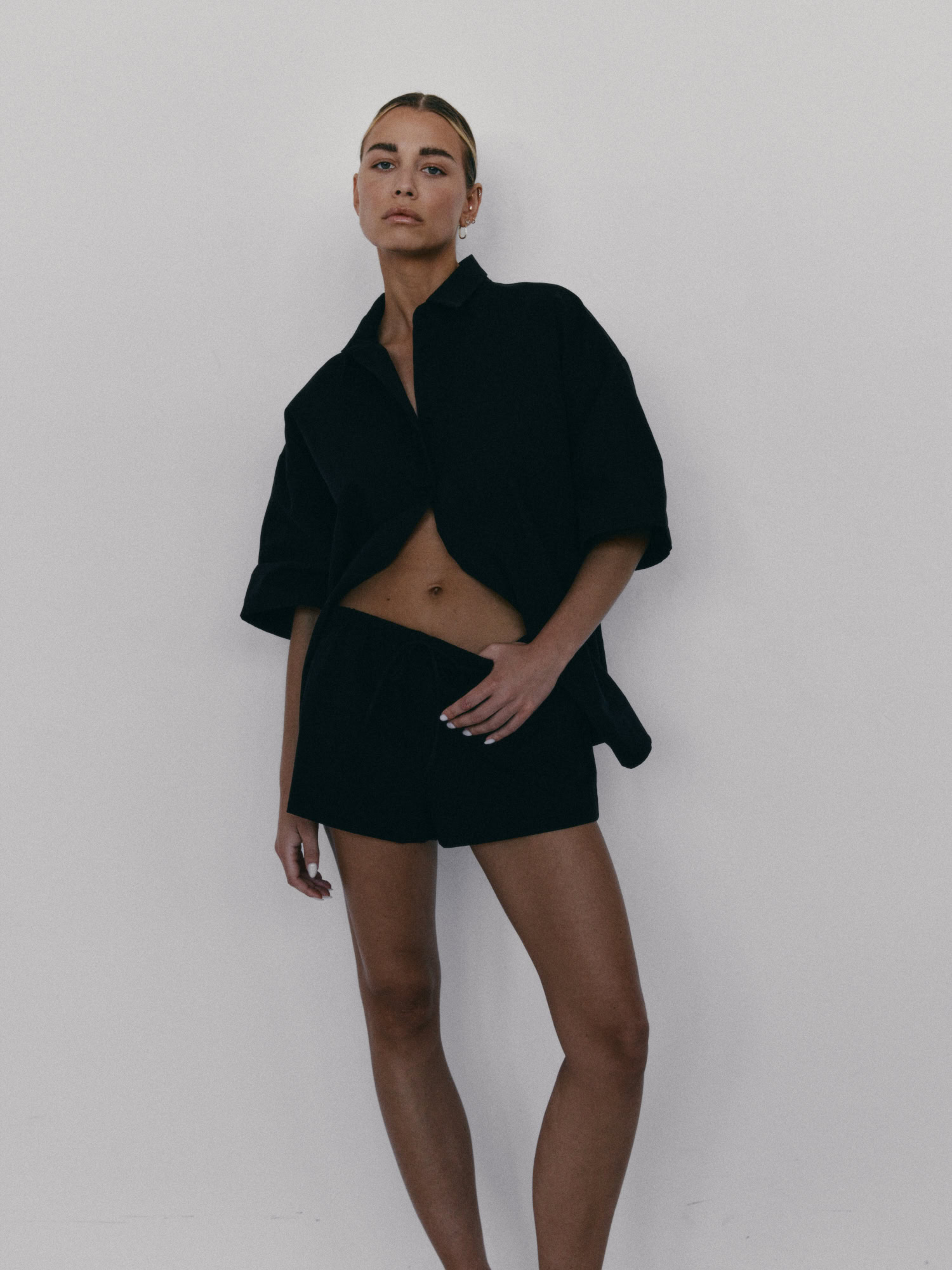 Bawełniane szorty o średnim stanie z elastyczną talią regulowaną sznurkiem. Model posiada dwie funkcjonalne kieszenie. Idealnie sprawdzi się zarówno z oversize’owym T-shirtem jak i dopasowanym topem.