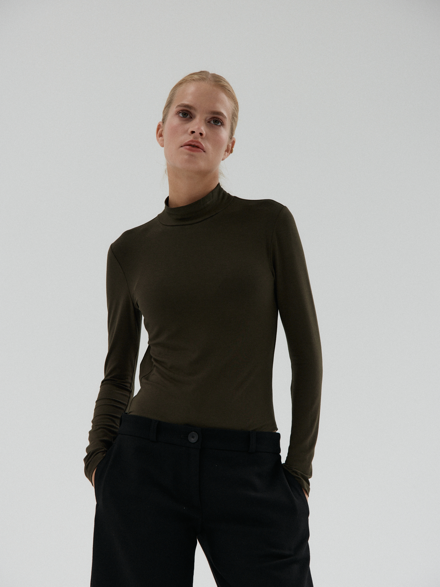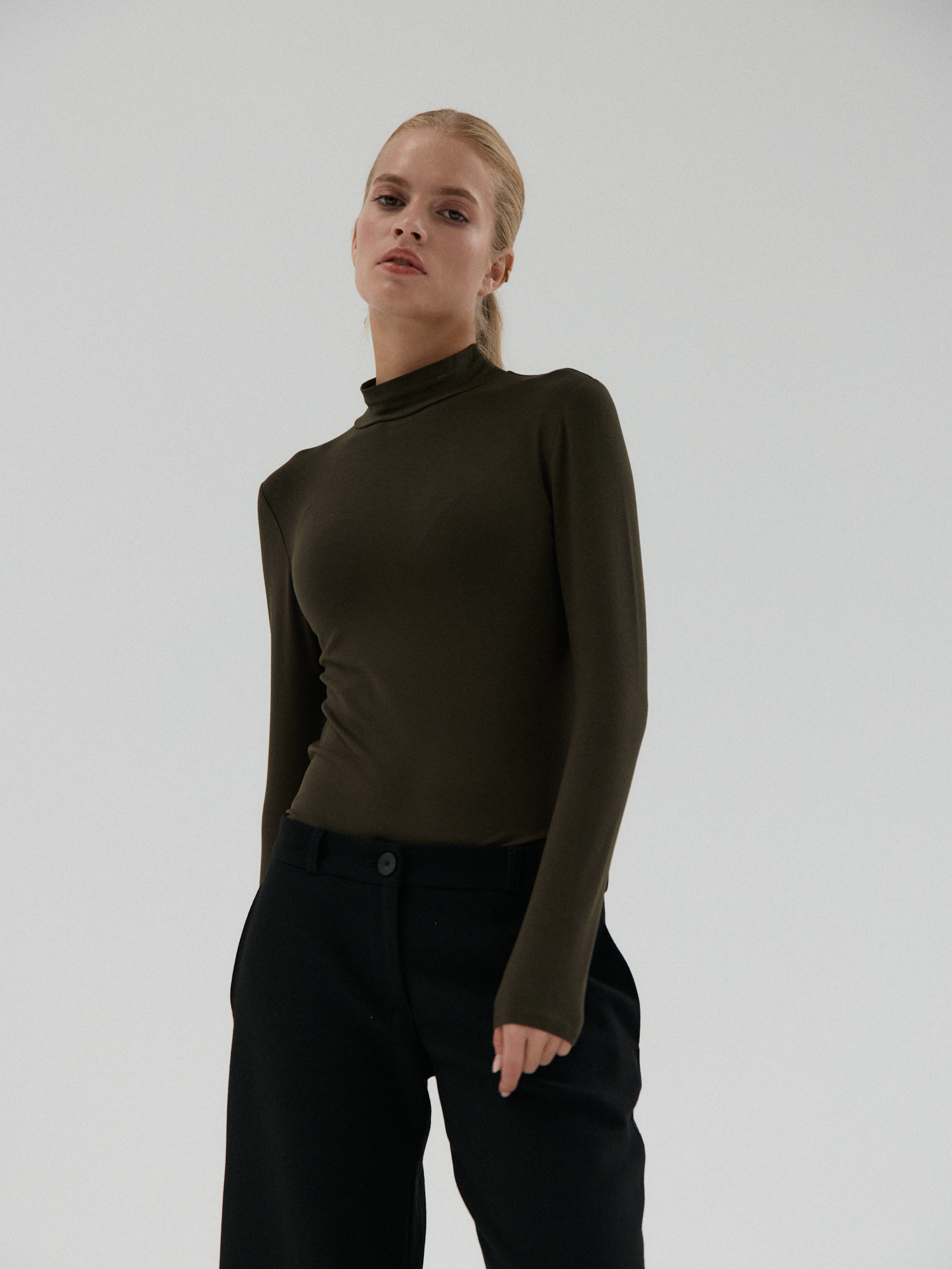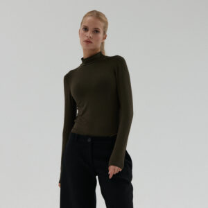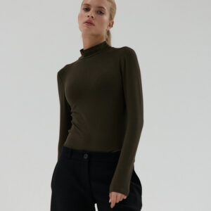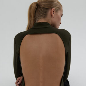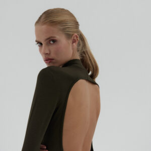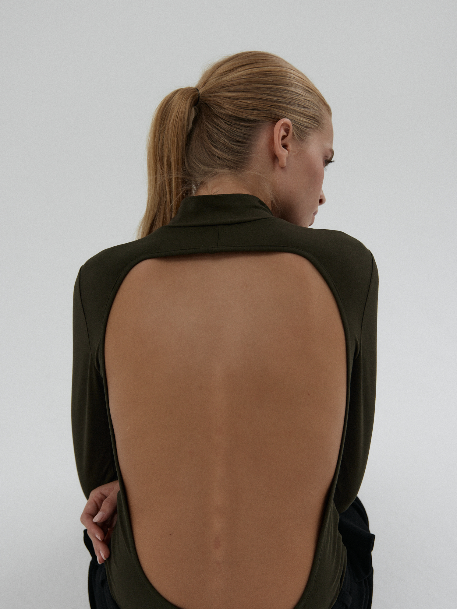 Minimalistyczne body z długim rękawem, półgolfem oraz obszernym, okrągłym wycięciem na plecach. Zapinane na zatrzaski. Produkt mocno opina ciało, pozwalając wydobyć atuty sylwetki, a przy tym nie krępuje ruchów. Body doskonale sprawdzą się w każdej sytuacji.  Najlepiej prezentują się w monochromatycznych zestawach. Będzie świetnie wyglądać zarówno w casualowej, jak i w wieczorowej wersji.