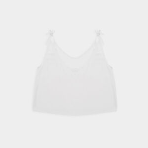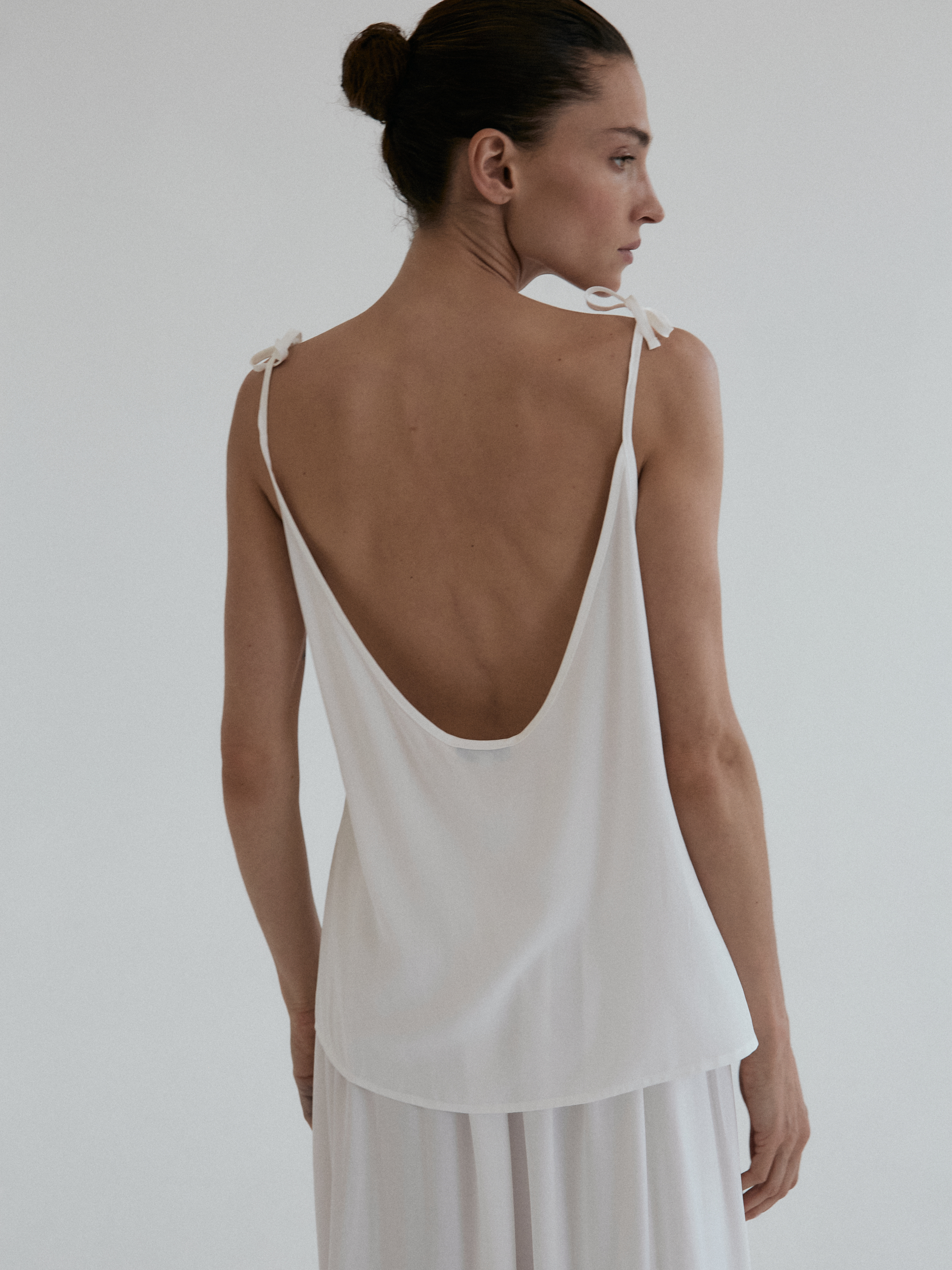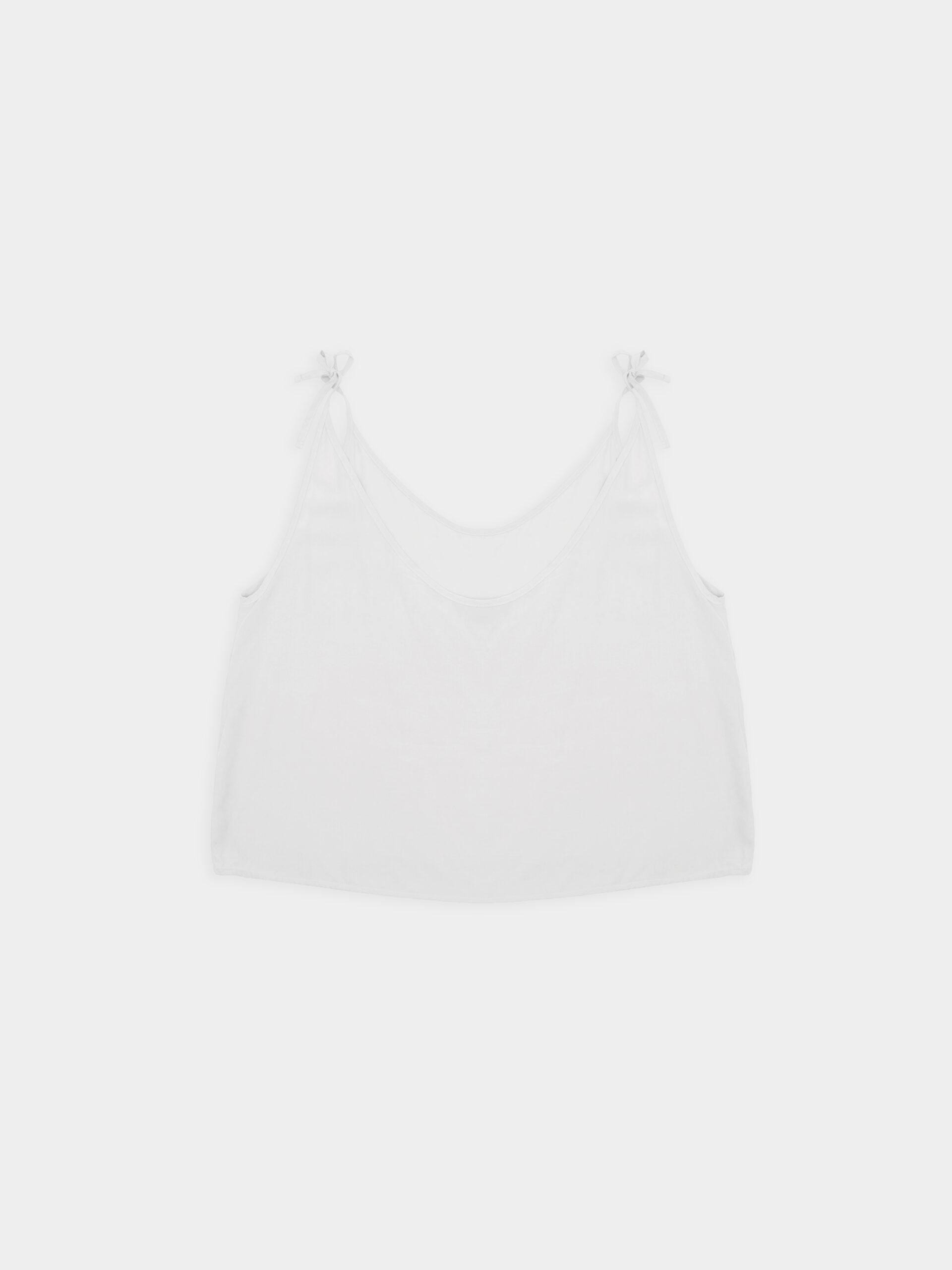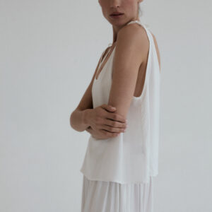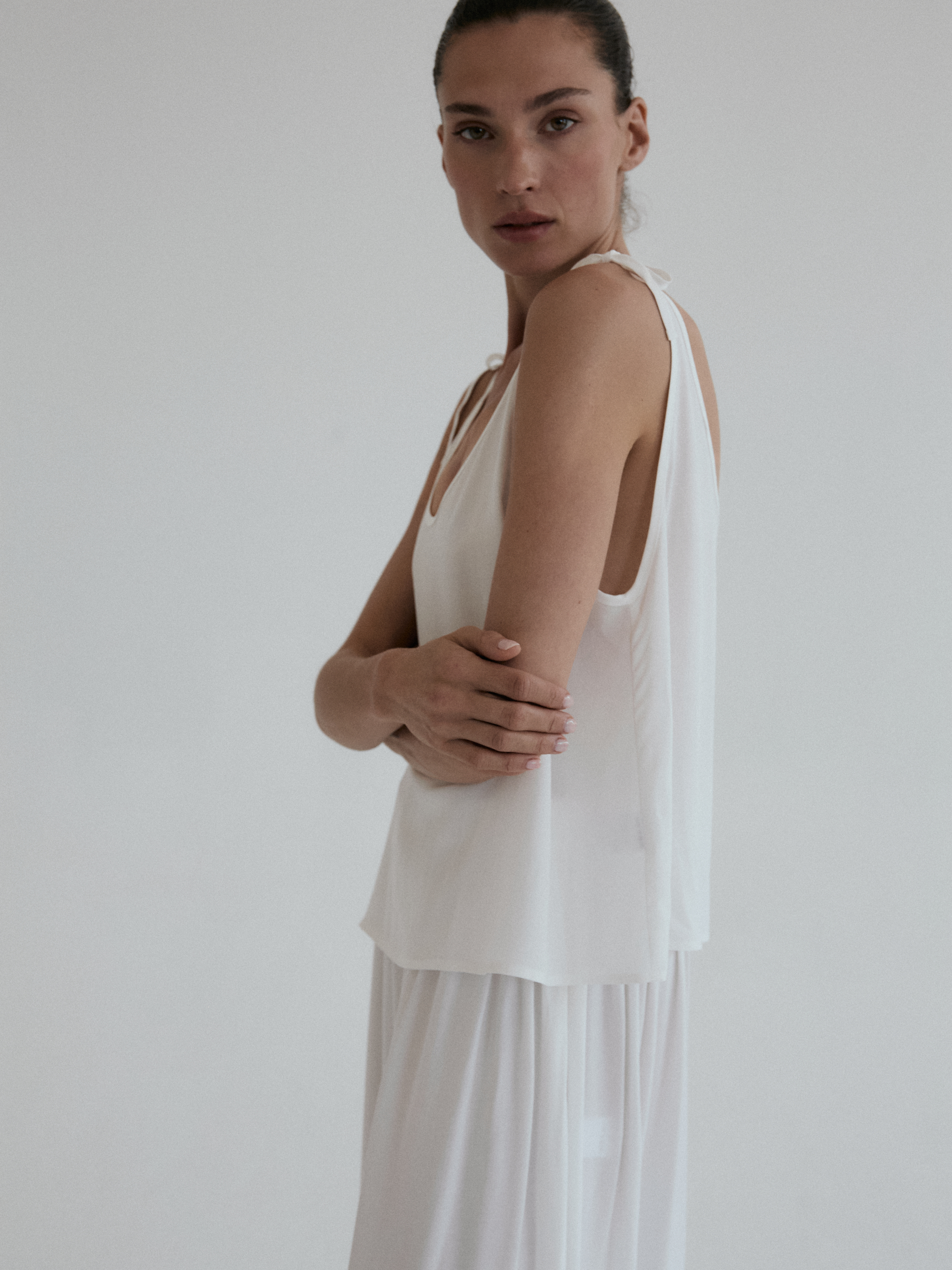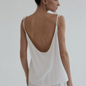 Zwiewna koszulka na cienkich ramiączkach. Głębokie wycięcia doskonale podkreślają zarówno biust jak i linię pleców. Związywane ramiączka pozwalają na dopasowanie koszulki do własnych preferencji. Lejący materiał świetnie się układa i delikatnie opływa ciało.
