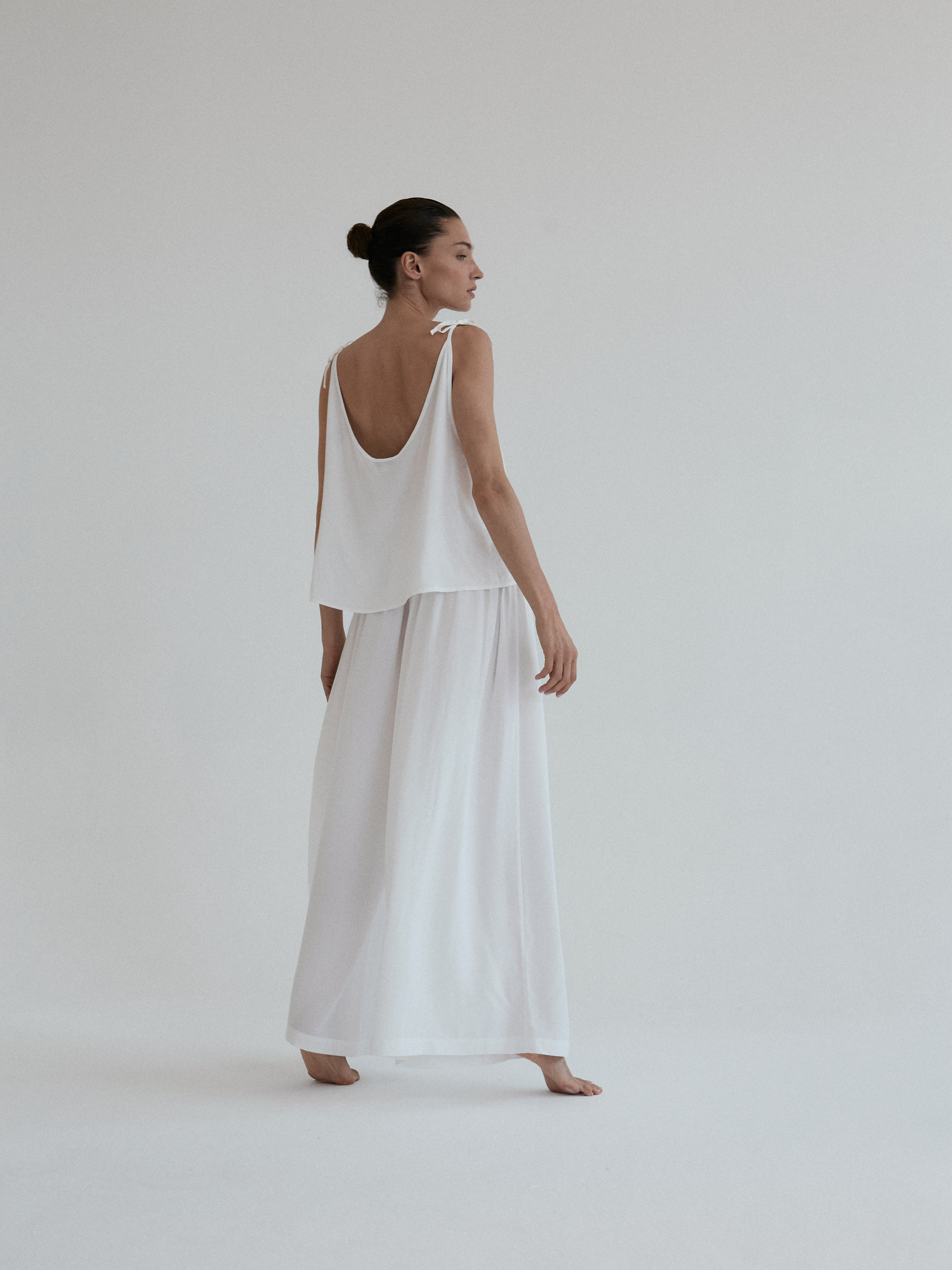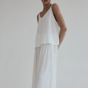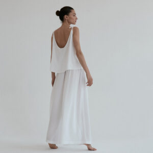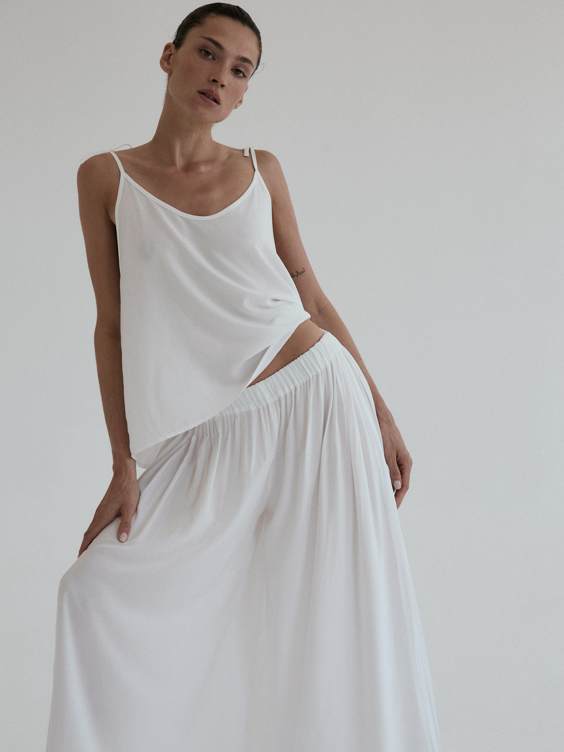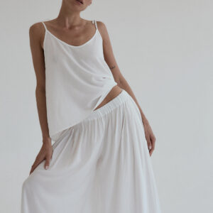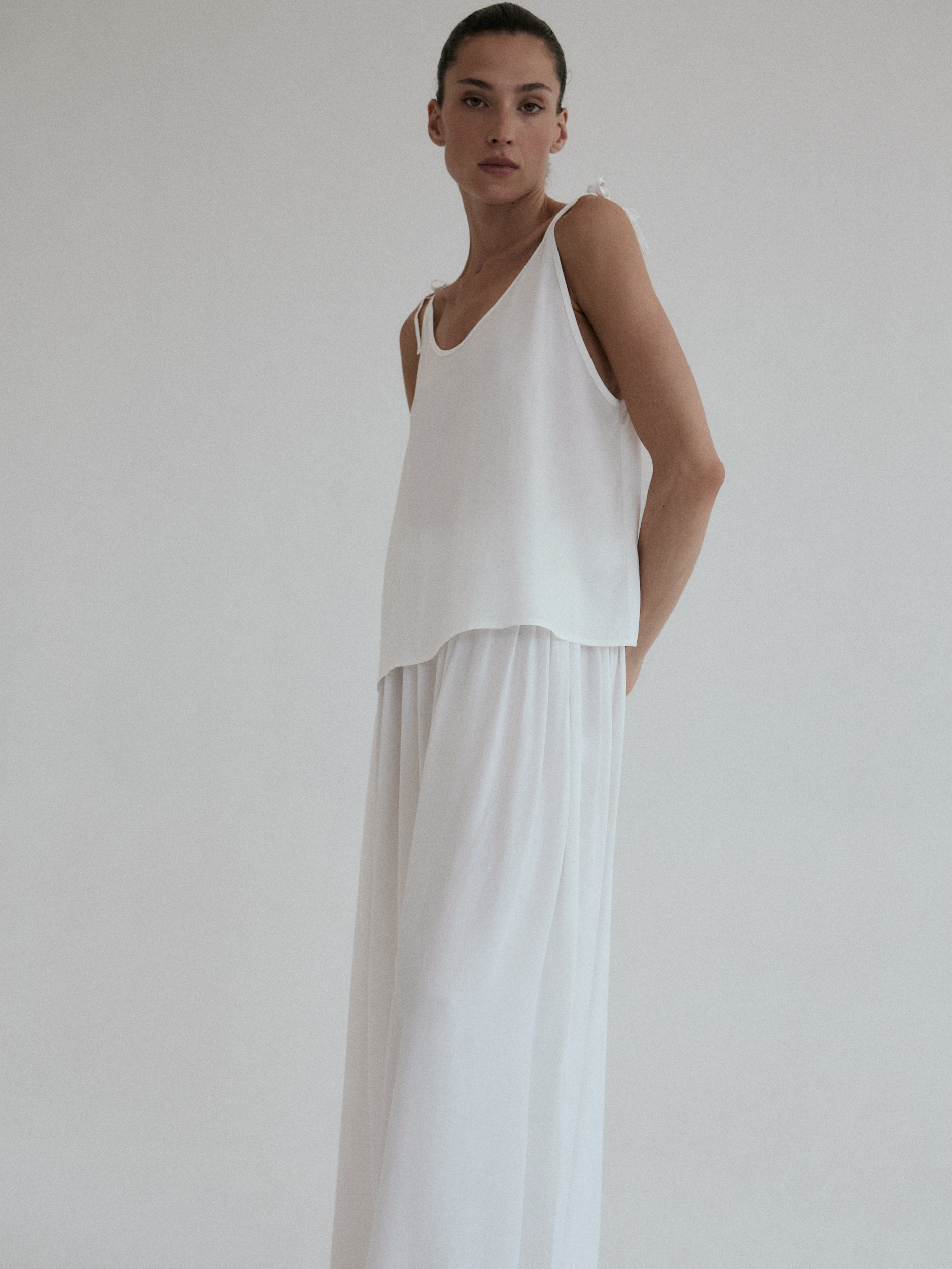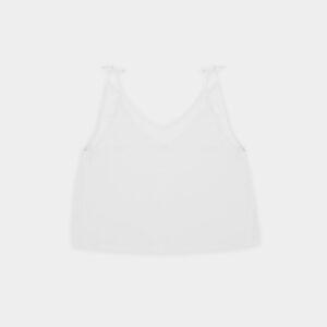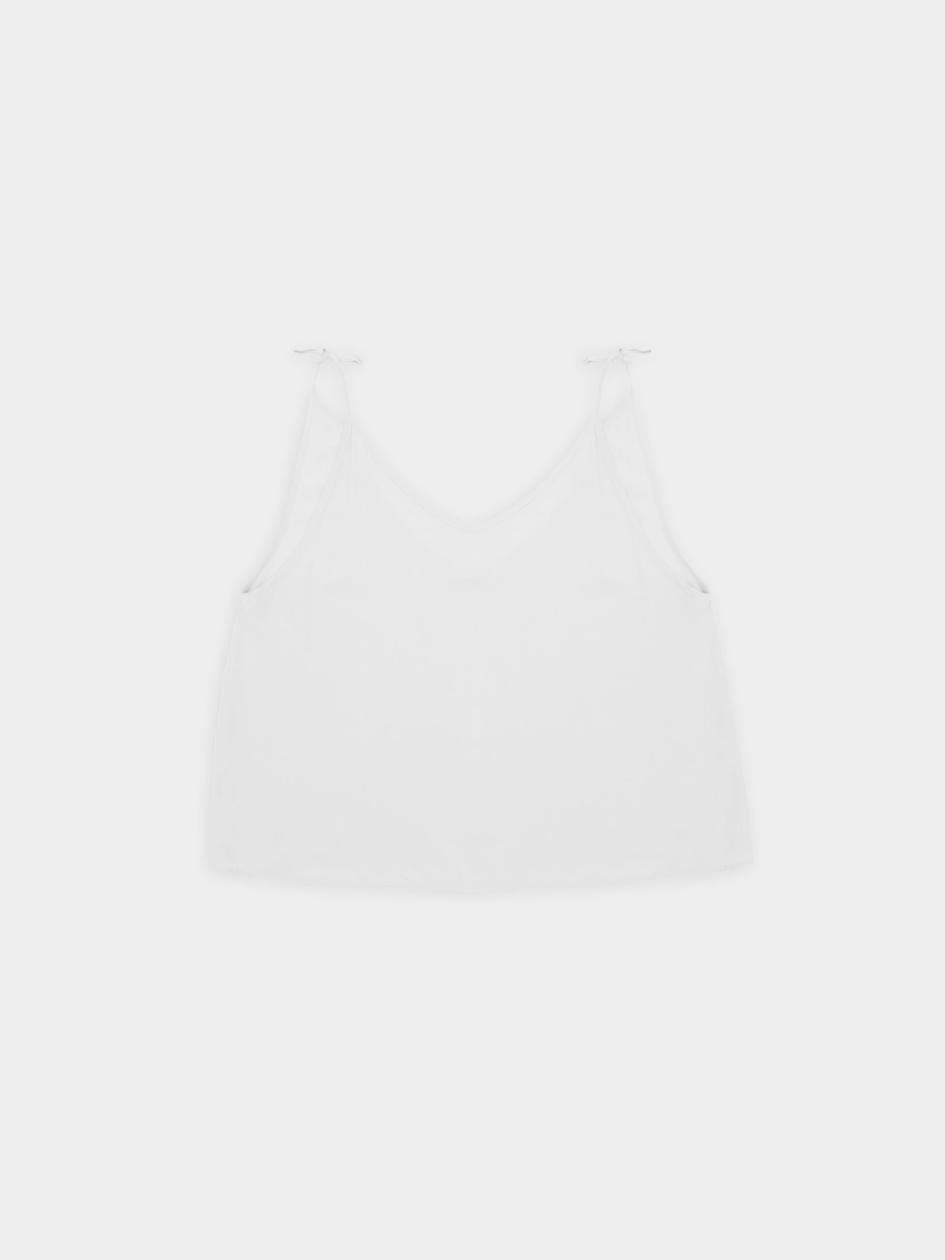 Zwiewna koszulka na cienkich ramiączkach. Głębokie wycięcia doskonale podkreślają zarówno biust jak i linię pleców. Związywane ramiączka pozwalają na dopasowanie koszulki do własnych preferencji. Lejący materiał świetnie się układa i delikatnie opływa ciało.