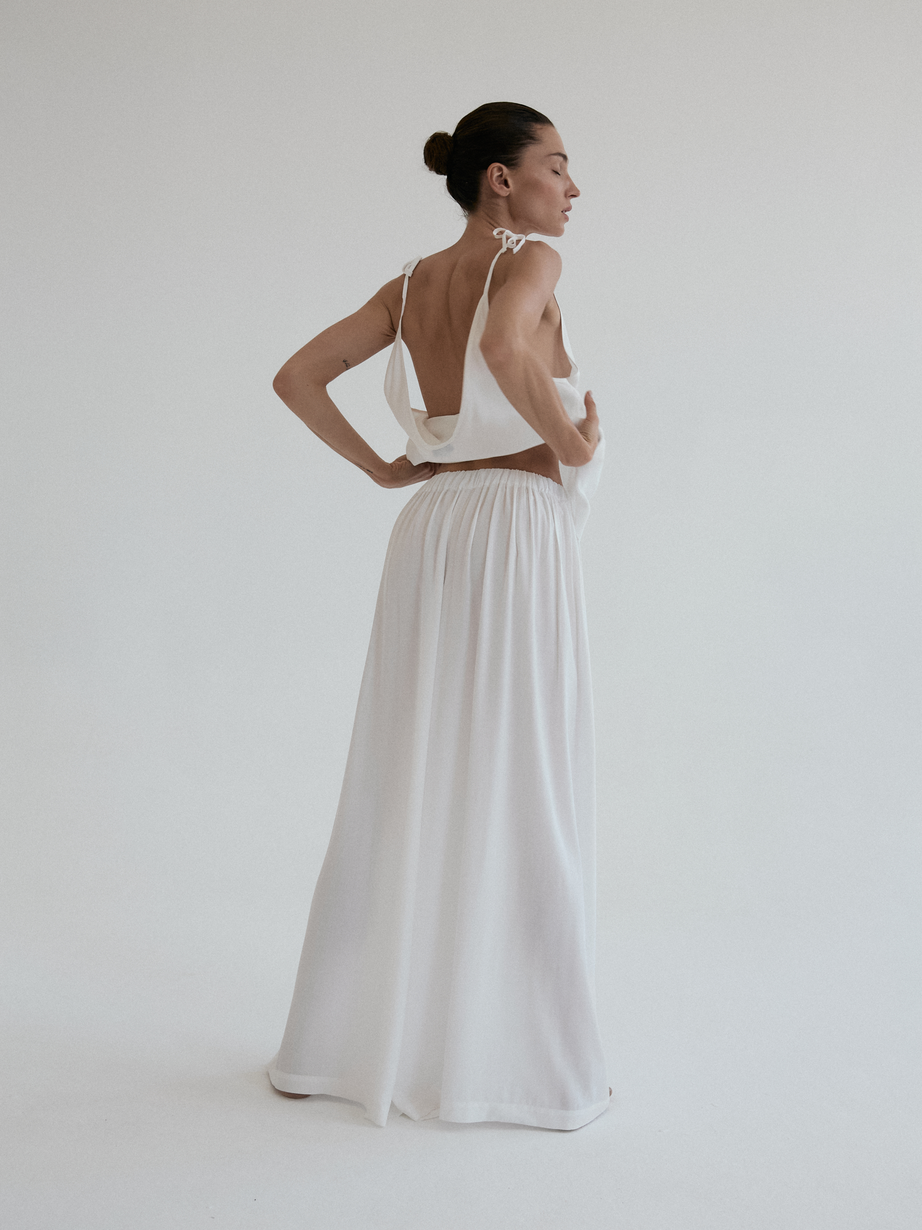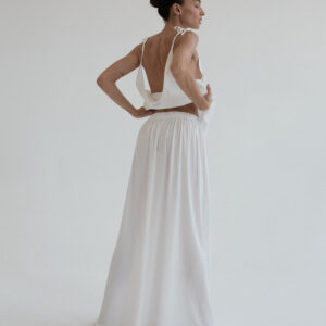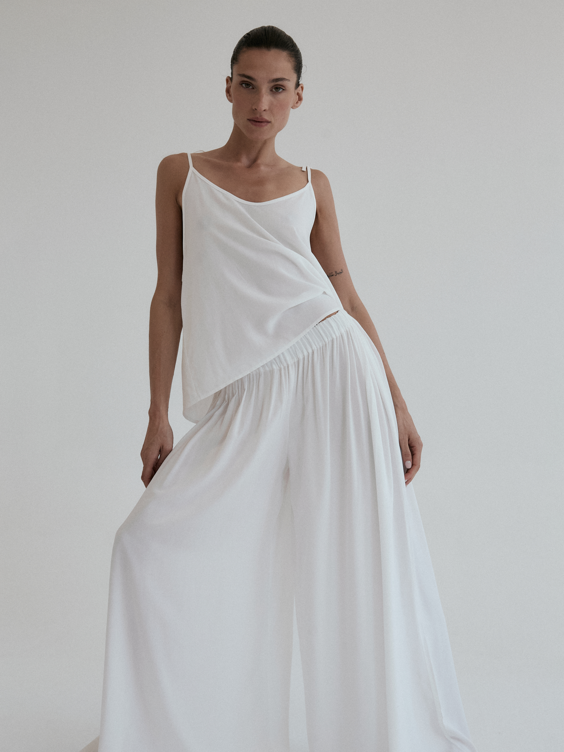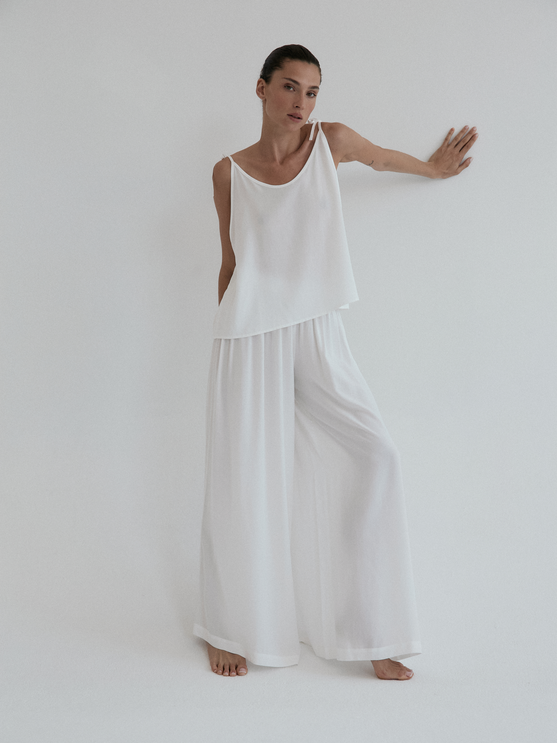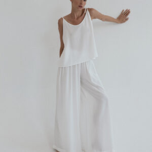 Zwiewna koszulka na cienkich ramiączkach. Głębokie wycięcia doskonale podkreślają zarówno biust jak i linię pleców. Związywane ramiączka pozwalają na dopasowanie koszulki do własnych preferencji. Lejący materiał świetnie się układa i delikatnie opływa ciało.