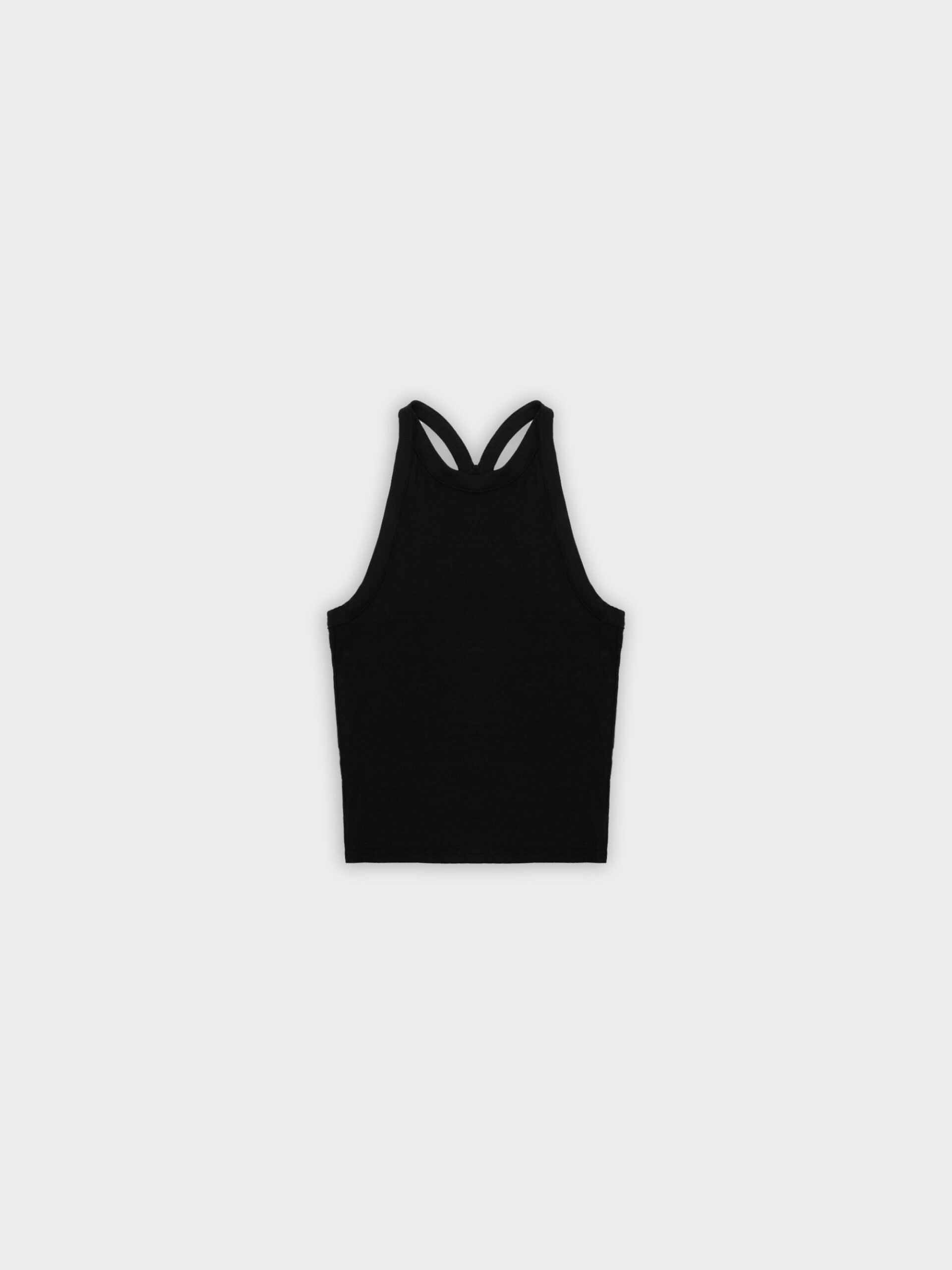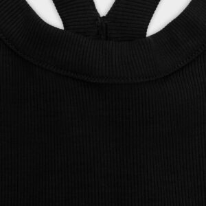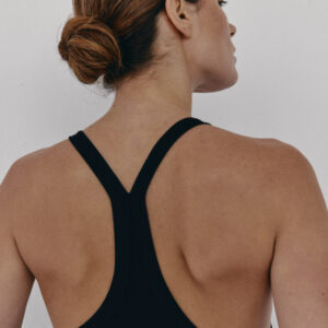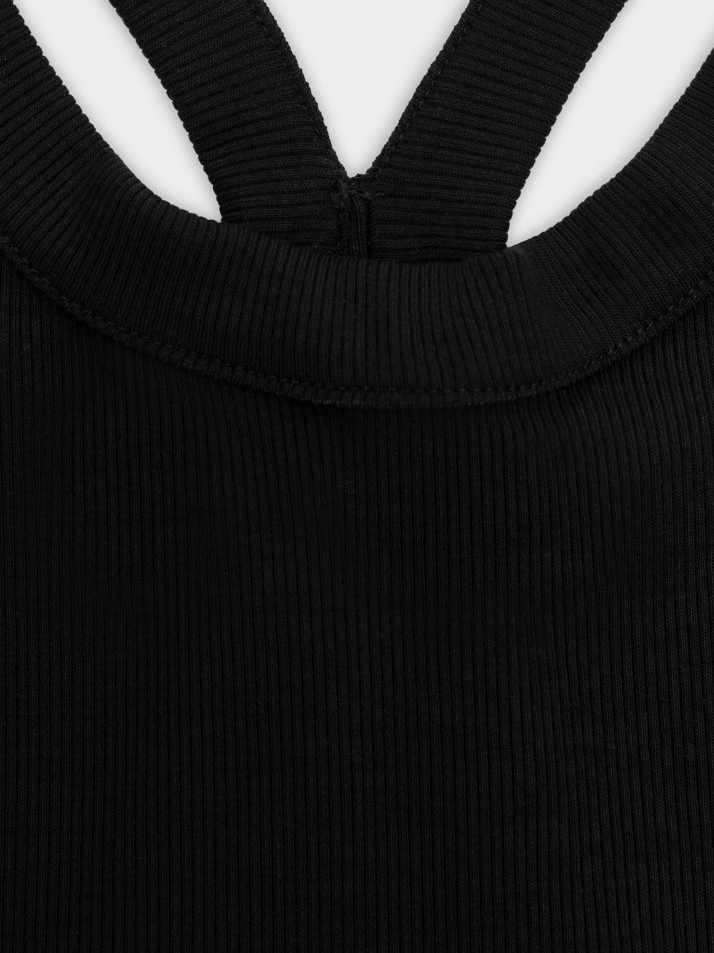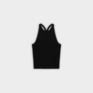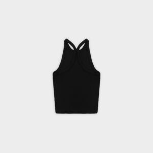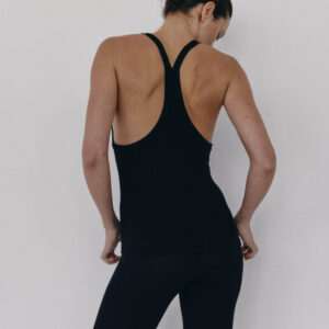 Prążkowany tank top na ramiączka. Model posiada ozdobny tył typu racer. Dopasowany fason oraz elastyczna dzianina zapewnia maksymalną swobodę ruchu. Top sprawdzi się do każdej stylizacji, zarówno w sportowym połączeniu z legginsami jak i eleganckim z marynarką.