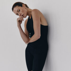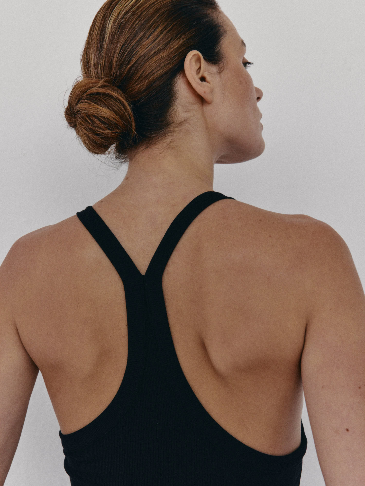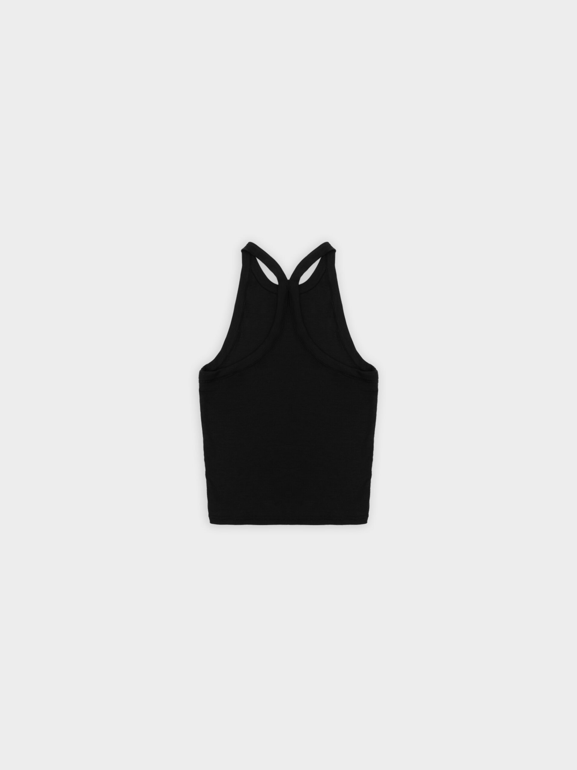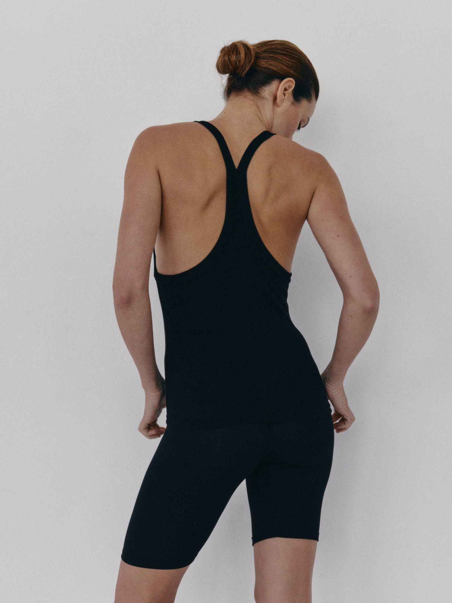 Prążkowany tank top na ramiączka. Model posiada ozdobny tył typu racer. Dopasowany fason oraz elastyczna dzianina zapewnia maksymalną swobodę ruchu. Top sprawdzi się do każdej stylizacji, zarówno w sportowym połączeniu z legginsami jak i eleganckim z marynarką.