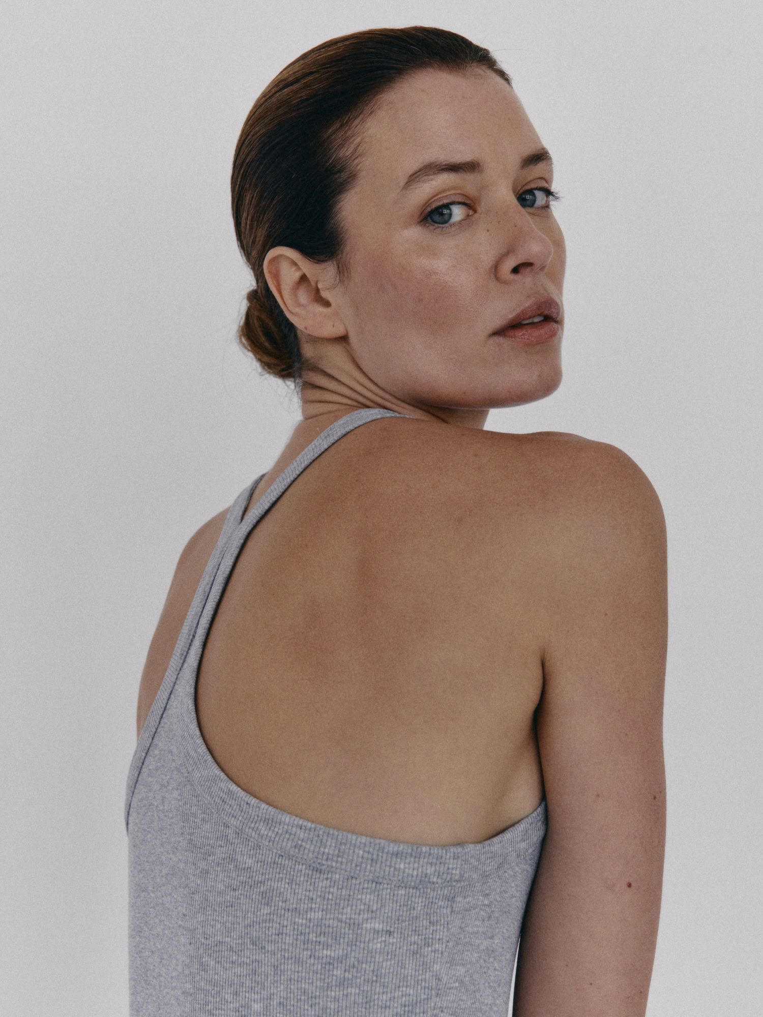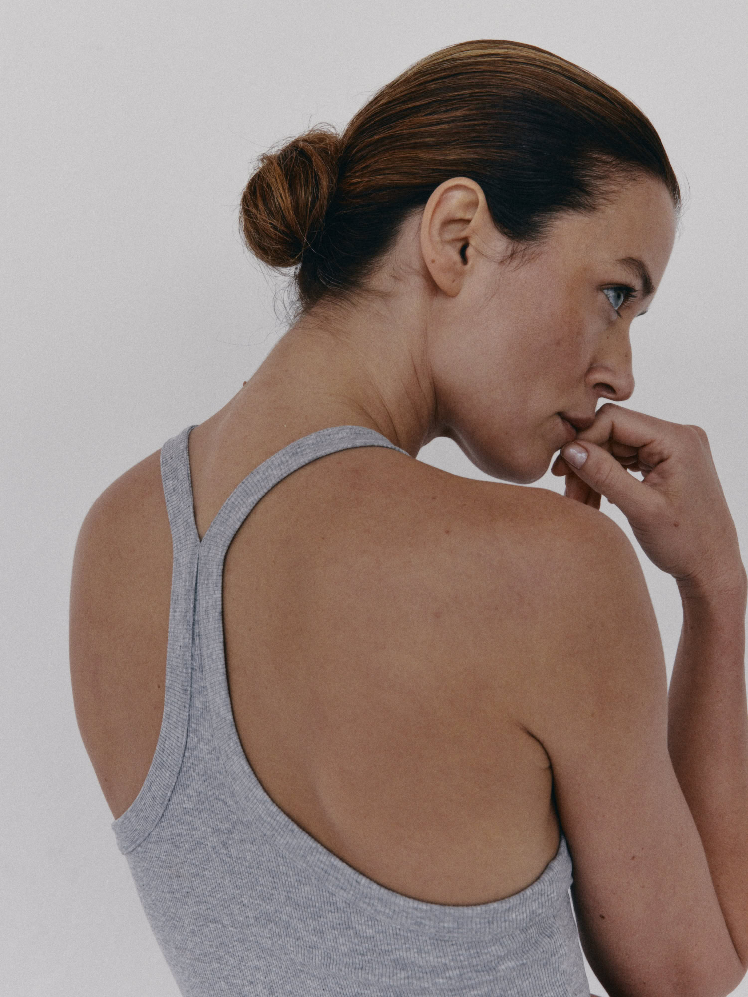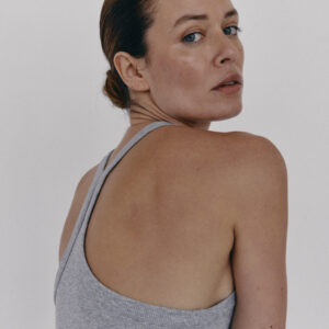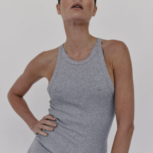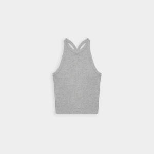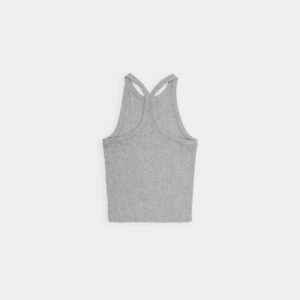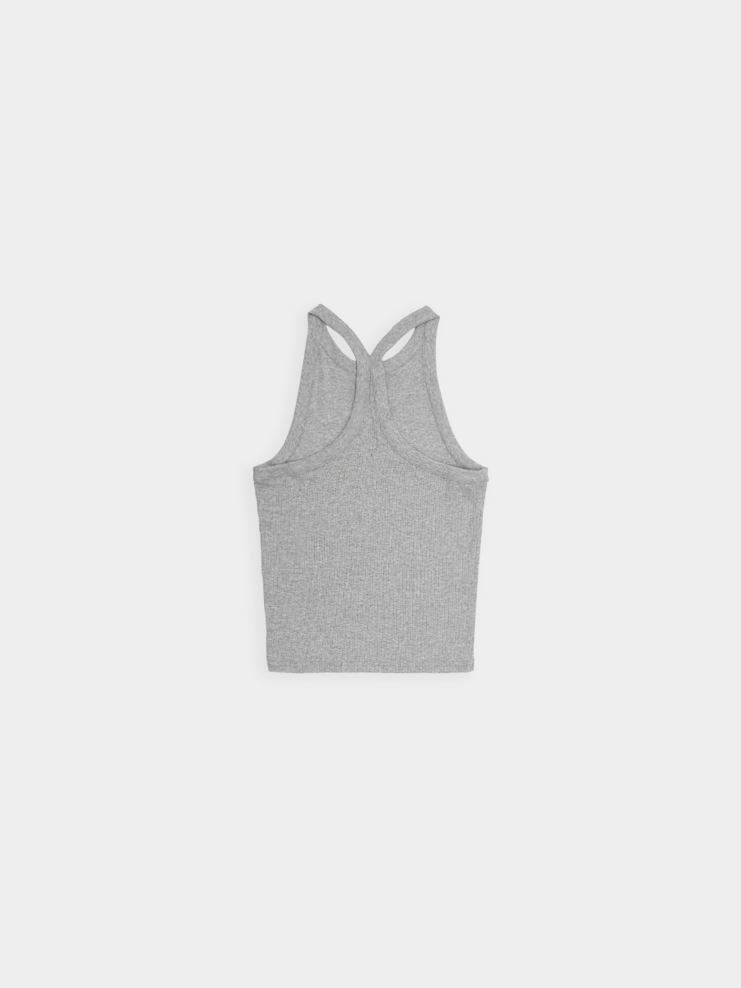 Prążkowany tank top na ramiączka. Model posiada ozdobny tył typu racer. Dopasowany fason oraz elastyczna dzianina zapewnia maksymalną swobodę ruchu. Top sprawdzi się do każdej stylizacji, zarówno w sportowym połączeniu z legginsami jak i eleganckim z marynarką.