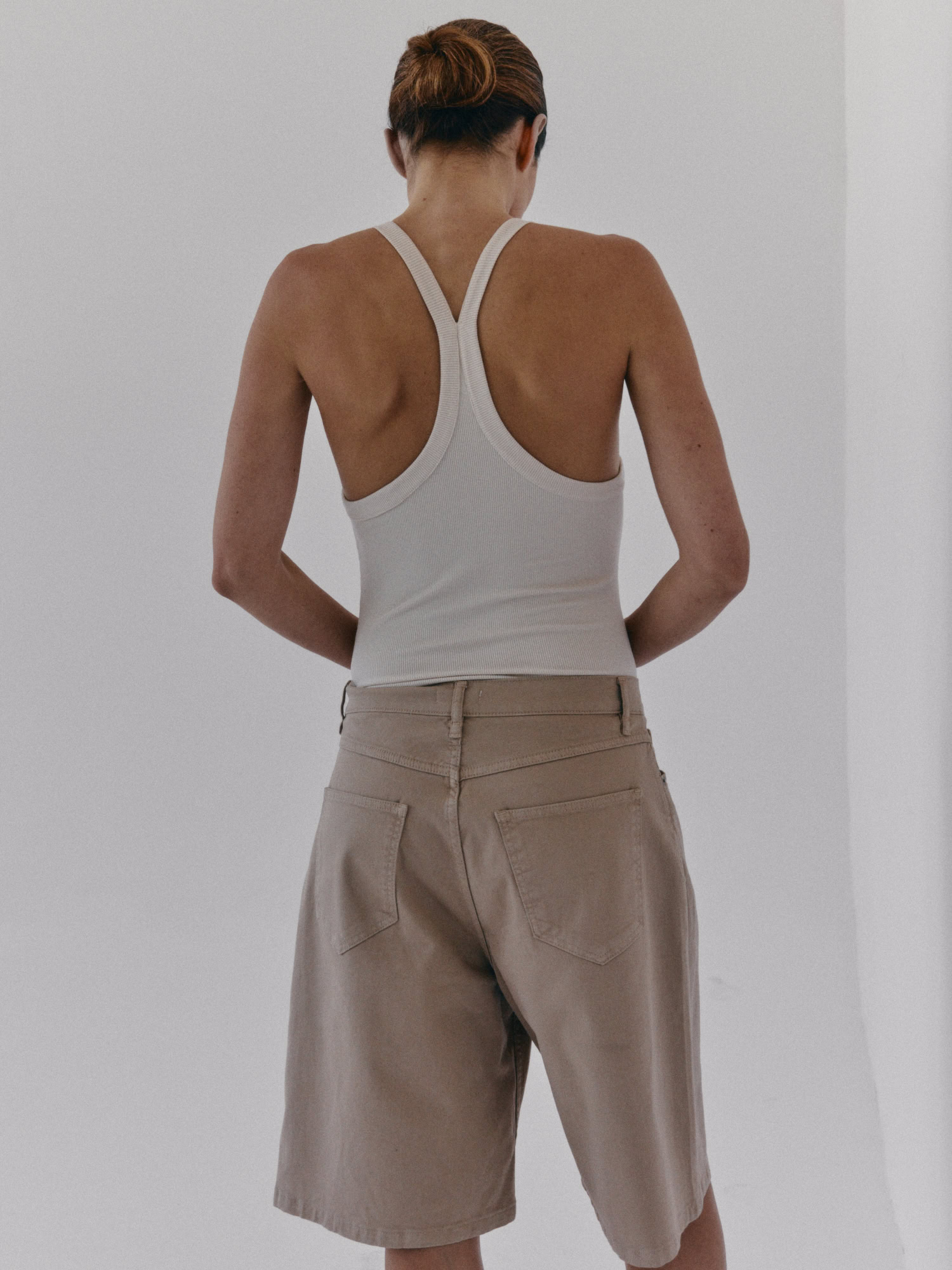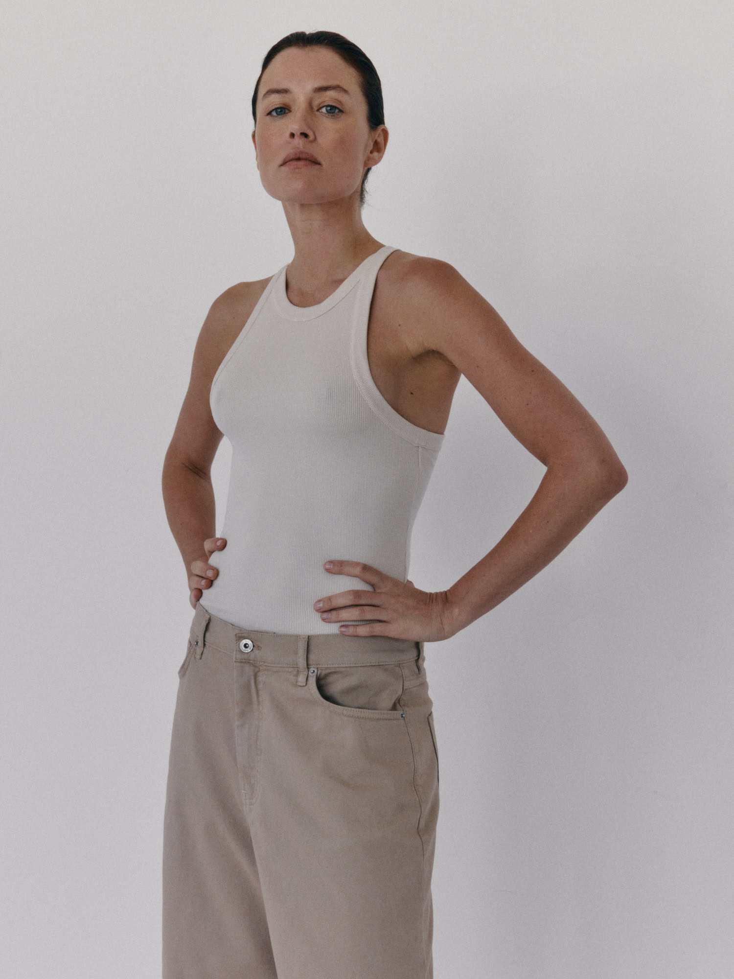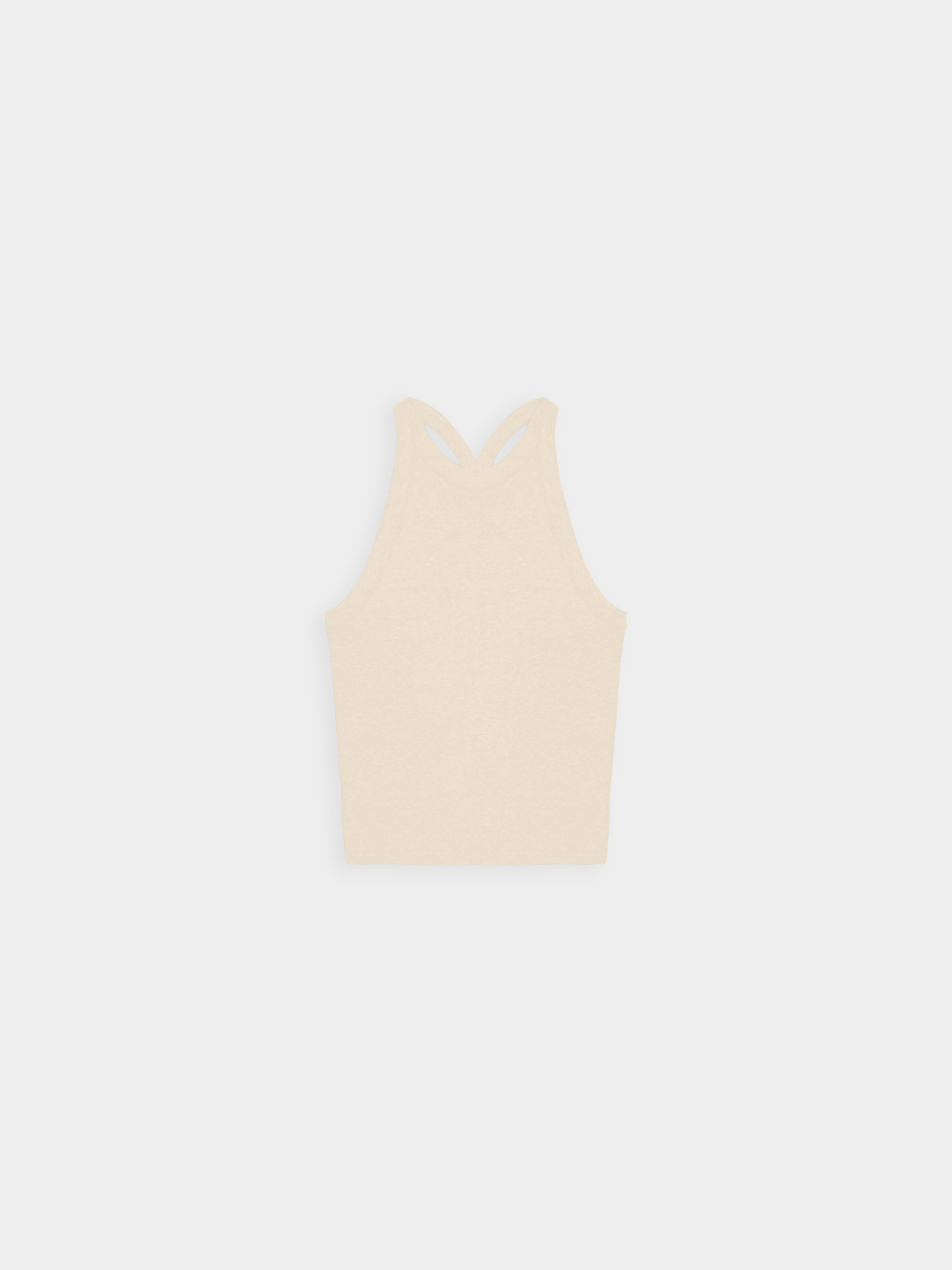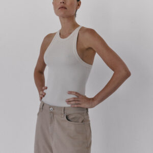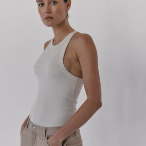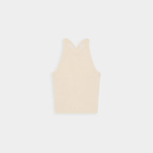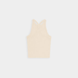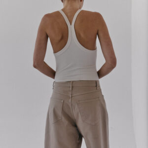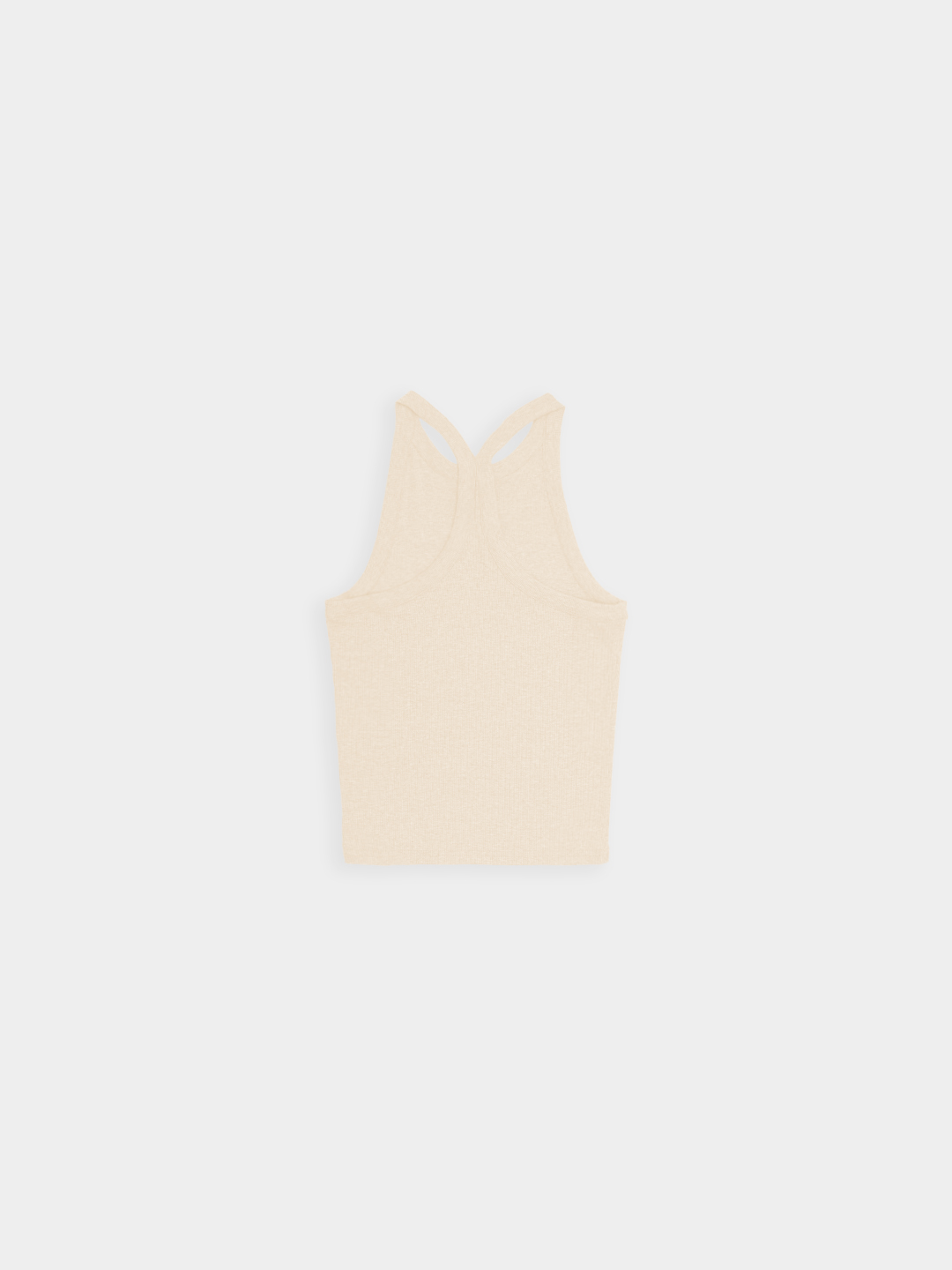 Prążkowany tank top na ramiączka. Model posiada ozdobny tył typu racer. Dopasowany fason oraz elastyczna dzianina zapewnia maksymalną swobodę ruchu. Top sprawdzi się do każdej stylizacji, zarówno w sportowym połączeniu z legginsami jak i eleganckim z marynarką.