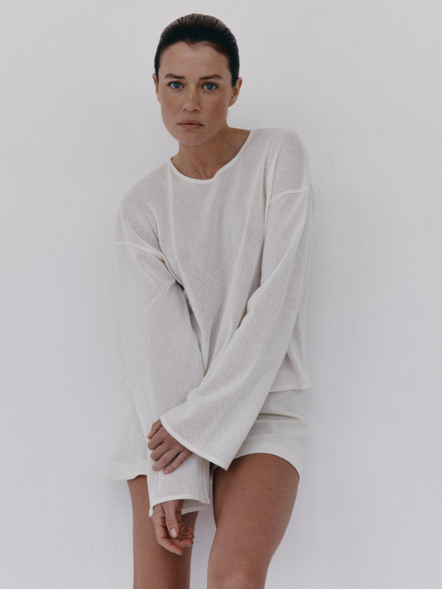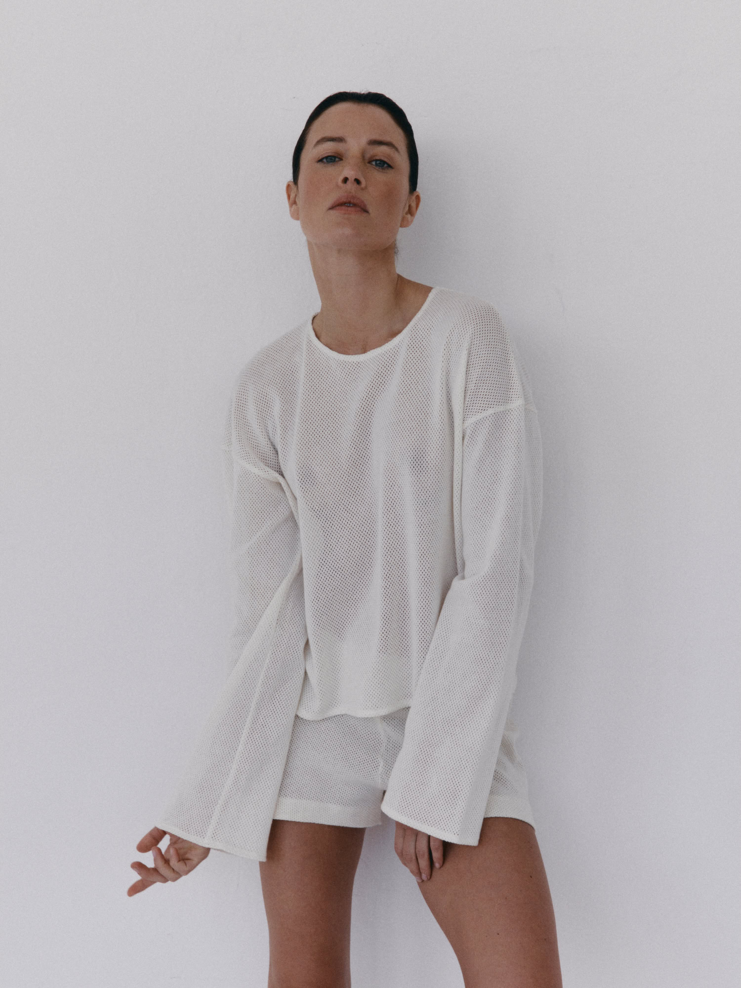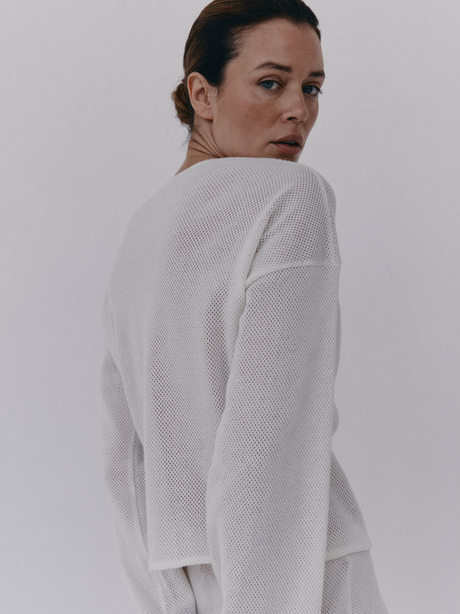 Siateczkowy longsleeve z obniżoną linią ramion oraz przydługim długim rękawem. Wygodny, minimalistyczny. Model doskonały zarówno na co dzień jak i na wieczór. Długość longsleeve’u jest odpowiednia dla każdego rodzaju spodni, jeansów i leginsów. Idealnie sprawdzi się w zestawie z szortami LLARD w tym samym odcieniu.