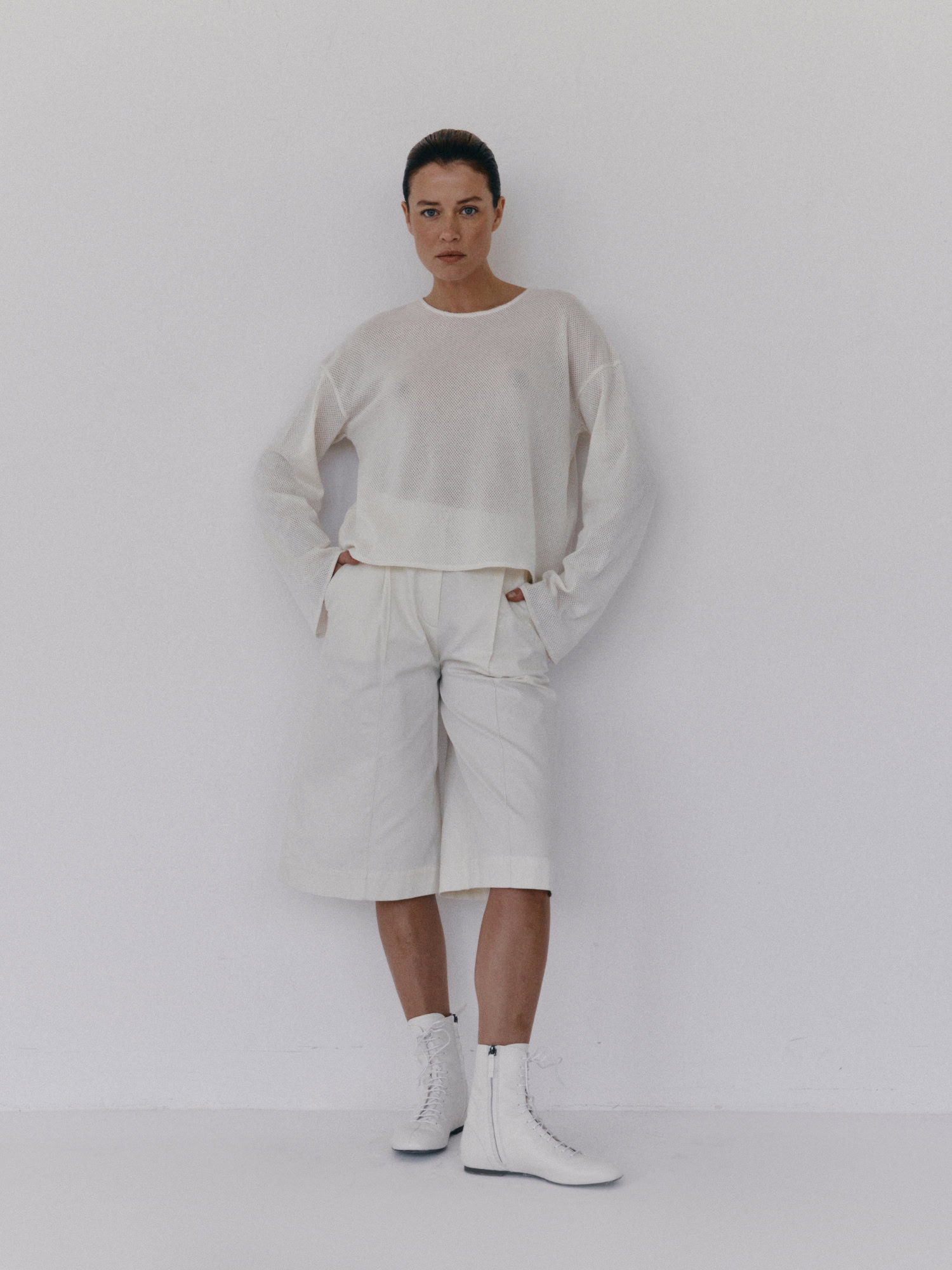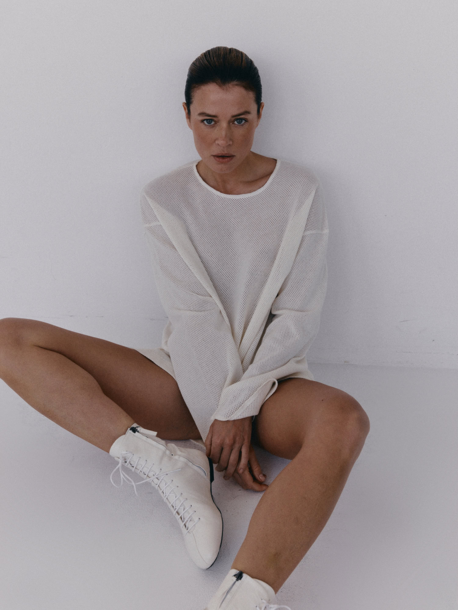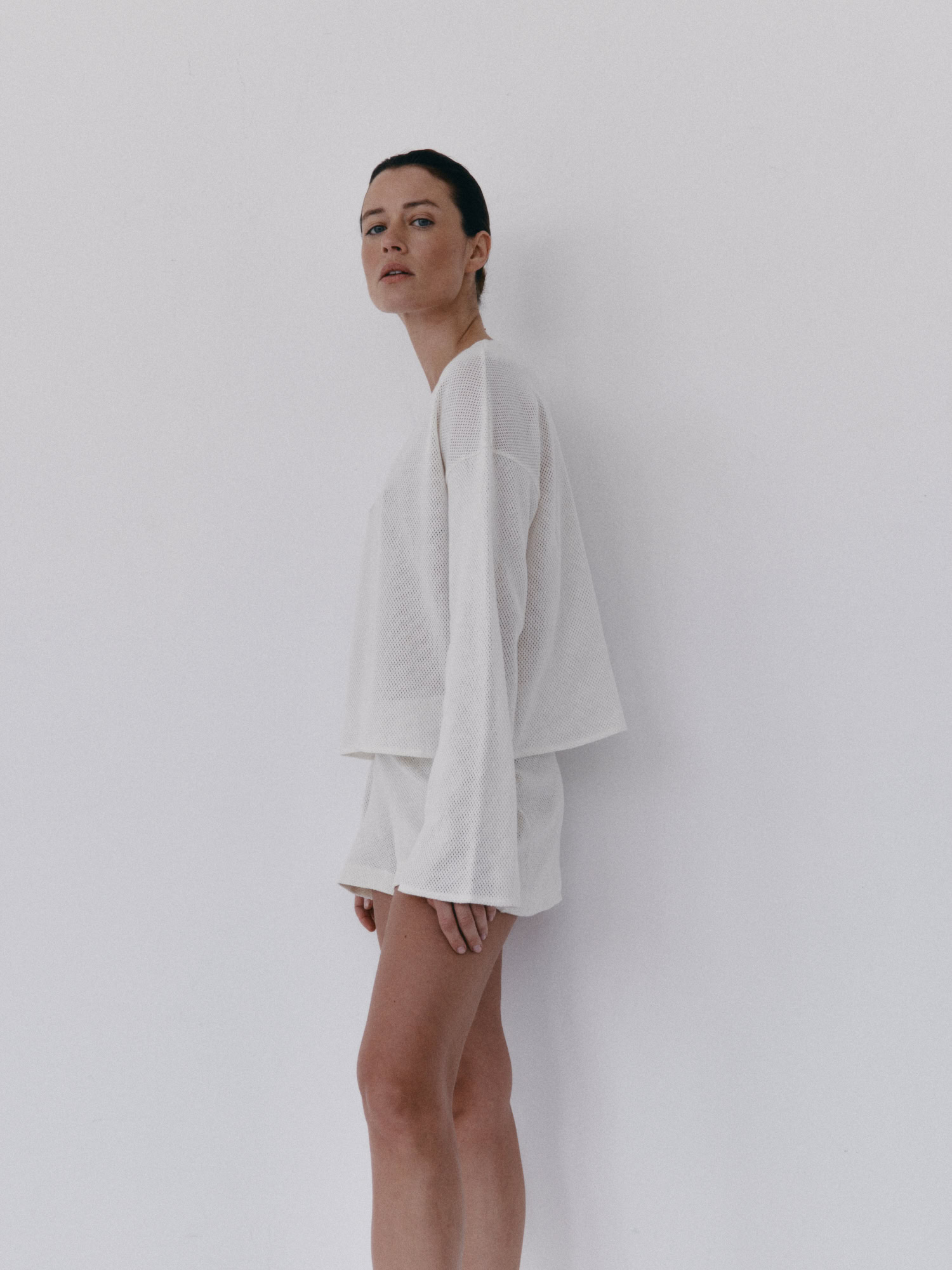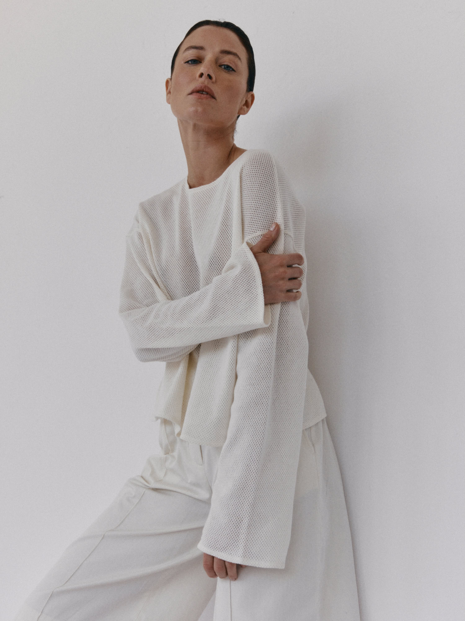 Siateczkowy longsleeve z obniżoną linią ramion oraz przydługim długim rękawem. Wygodny, minimalistyczny. Model doskonały zarówno na co dzień jak i na wieczór. Długość longsleeve’u jest odpowiednia dla każdego rodzaju spodni, jeansów i leginsów. Idealnie sprawdzi się w zestawie z szortami LLARD w tym samym odcieniu.