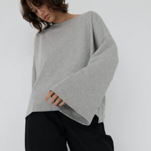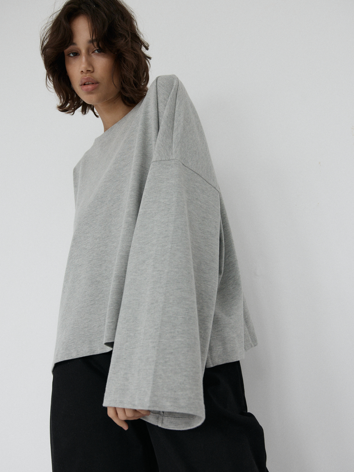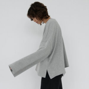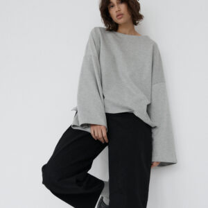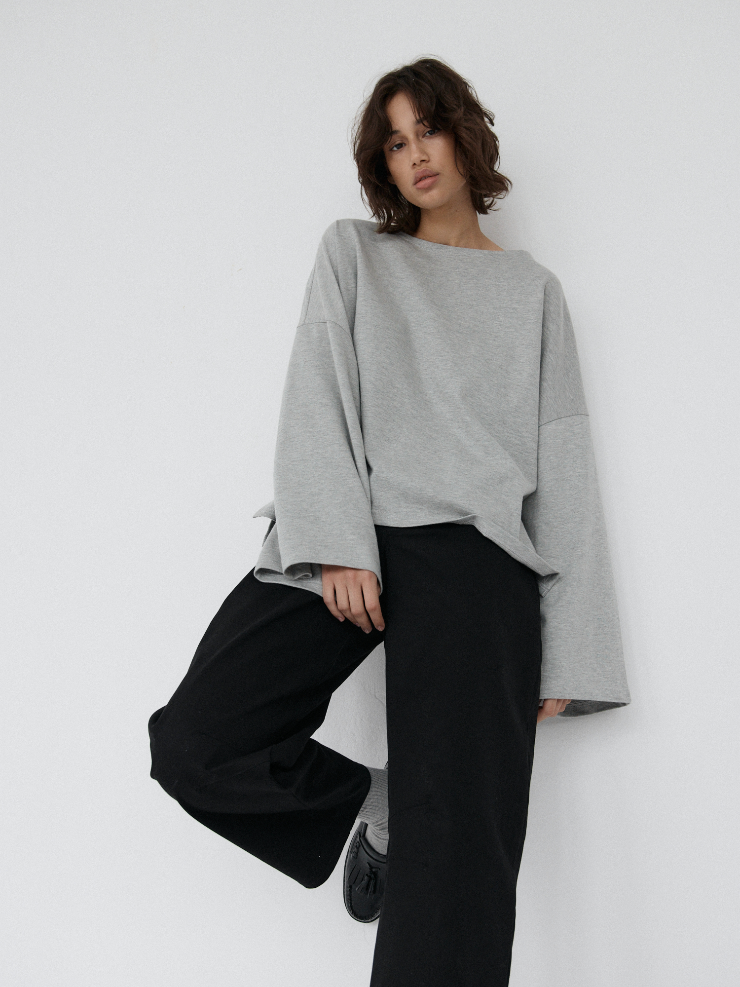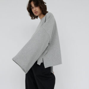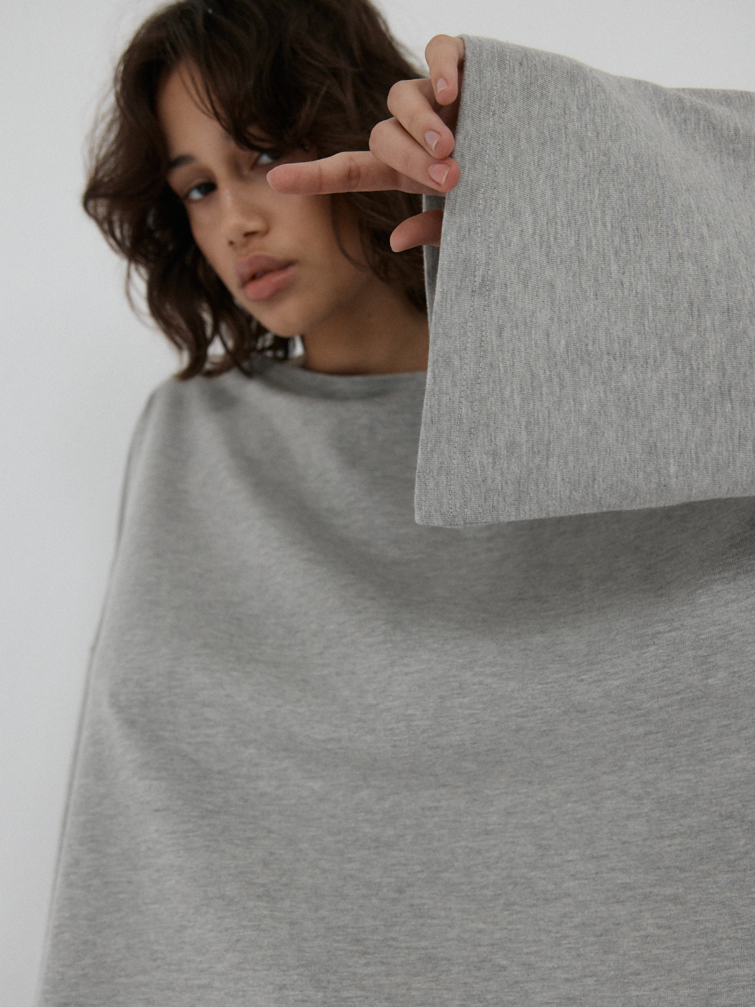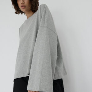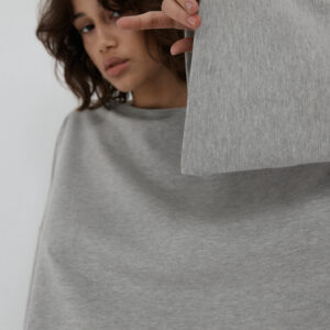Ultra oversize’owy z obniżoną linią ramion z wydłużonymi rękawami, o lekko zabudowanym dekolcie. Wygodny, minimalistyczny. Model doskonały zarówno na co dzień jak i na wieczór. Długość longsleeve’u jest odpowiednia dla każdego rodzaju spodni, jeansów i leginsów. Najlepiej prezentuje się w monochromatycznych zestawach.