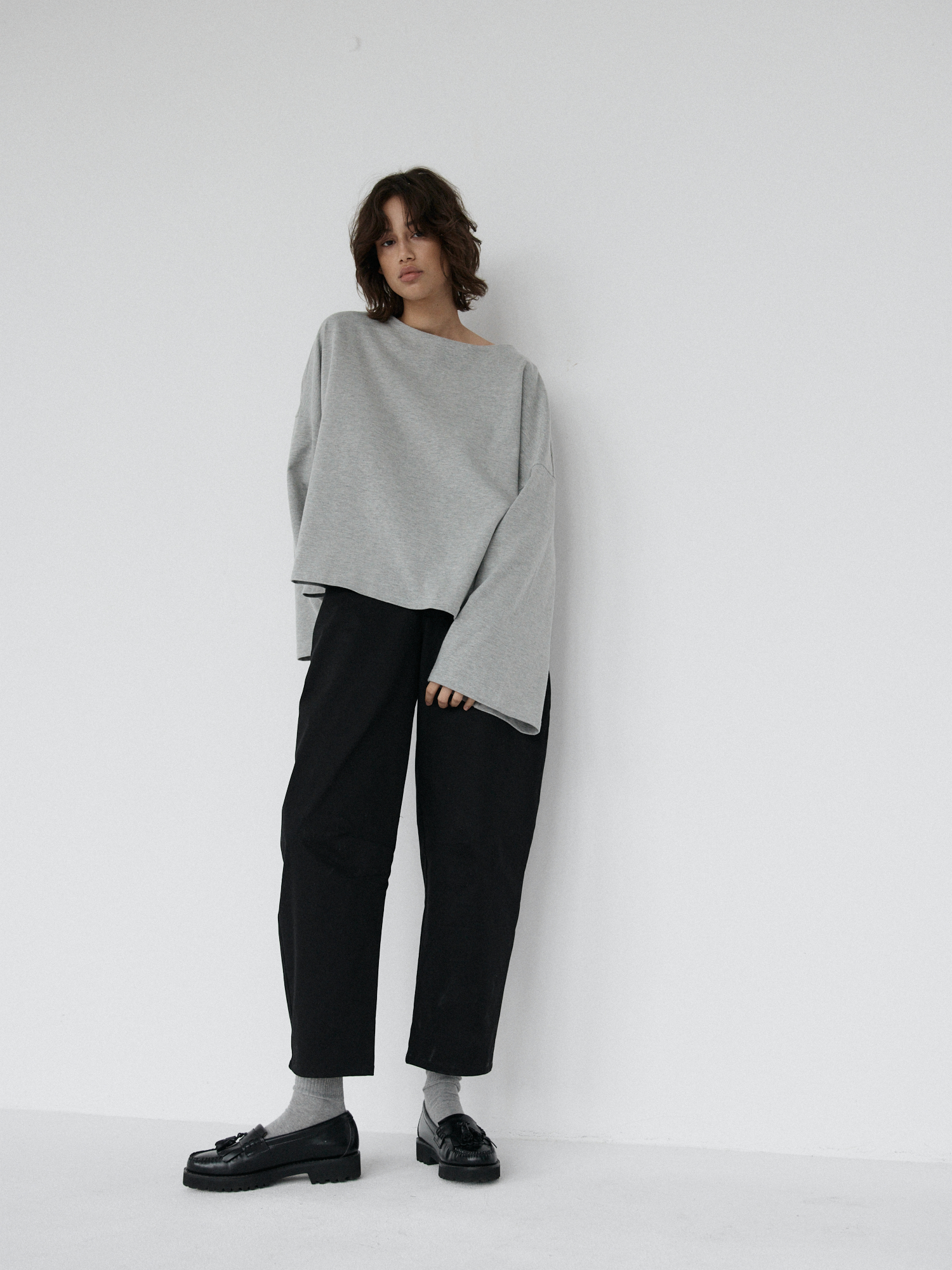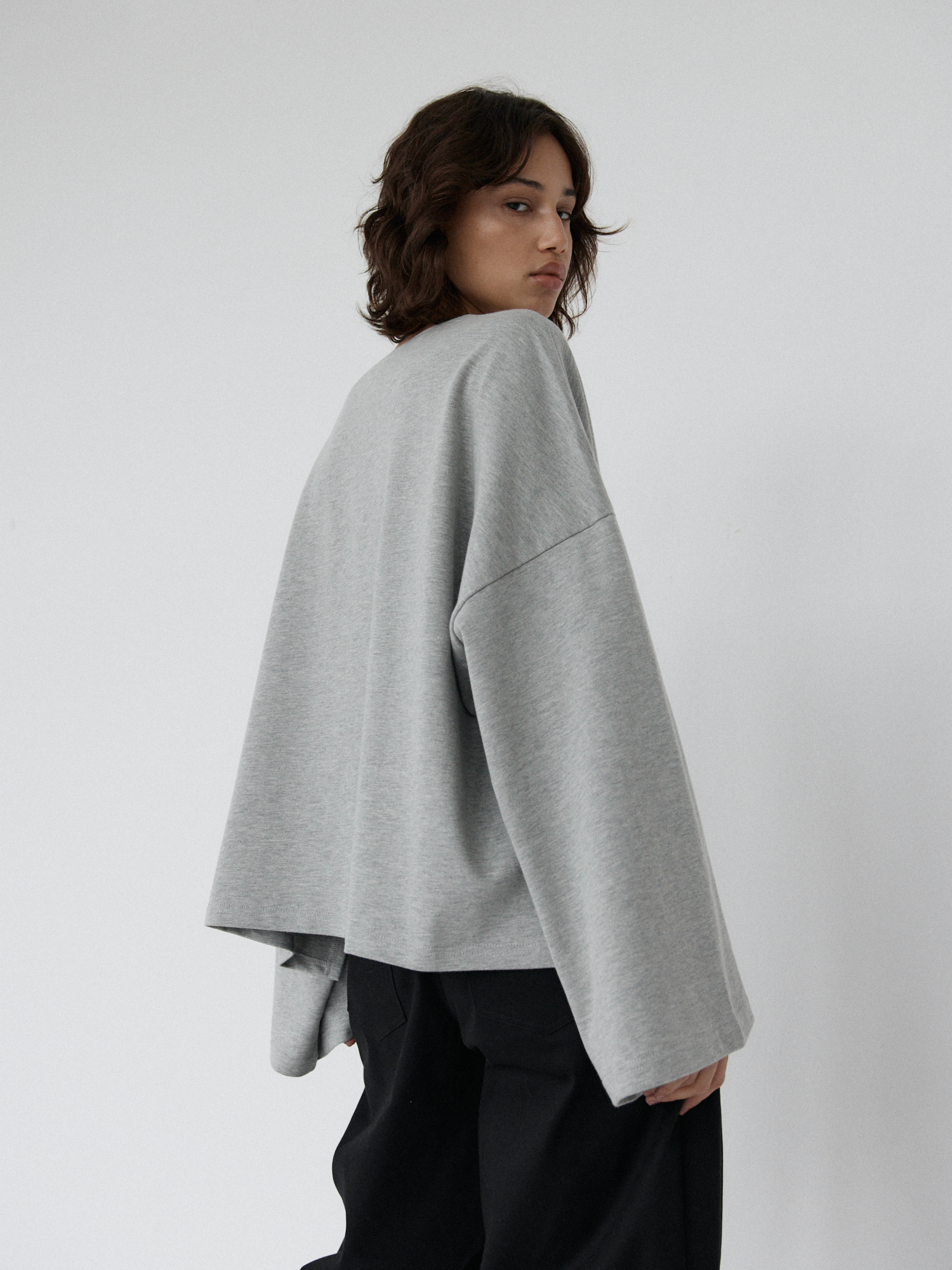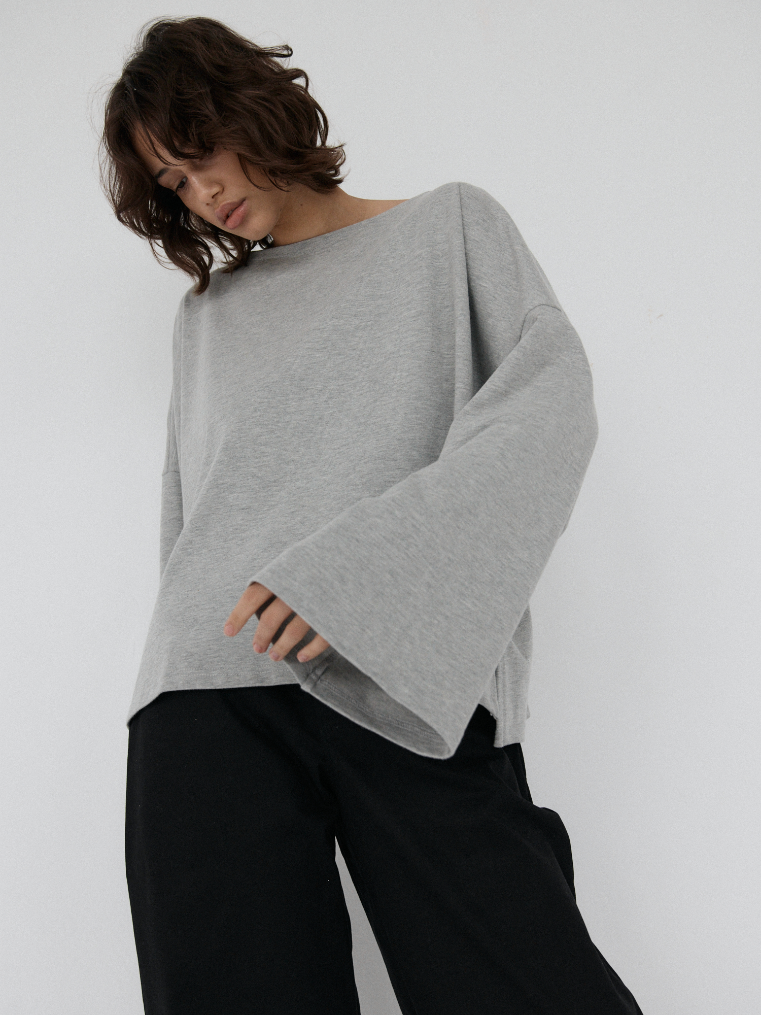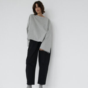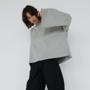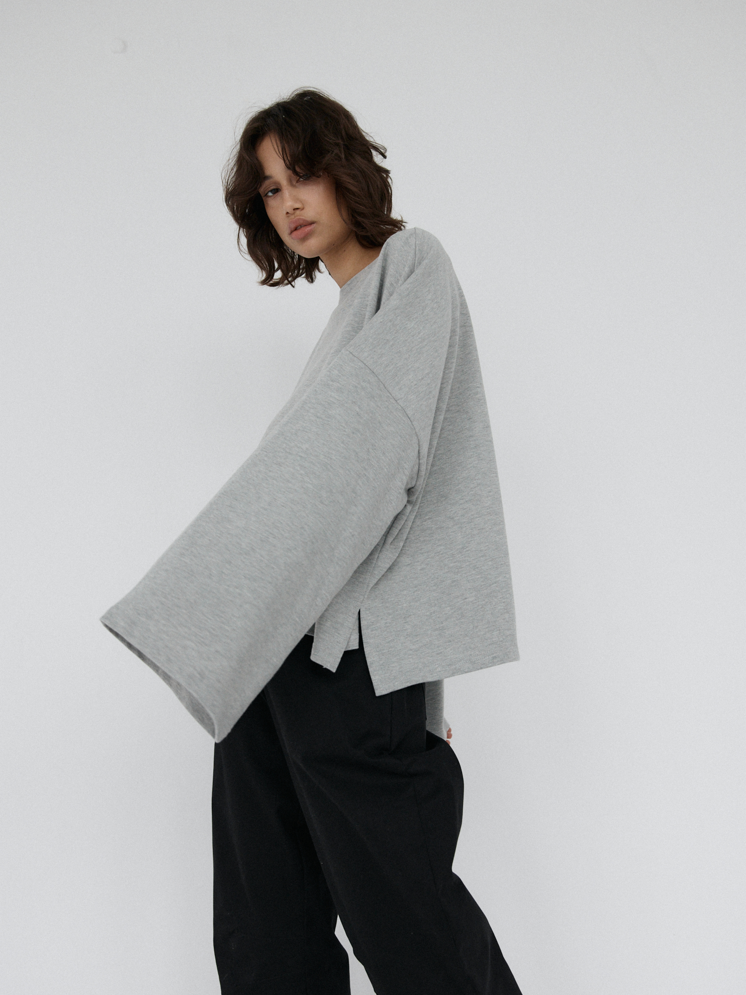 Ultra oversize’owy z obniżoną linią ramion z wydłużonymi rękawami, o lekko zabudowanym dekolcie. Wygodny, minimalistyczny. Model doskonały zarówno na co dzień jak i na wieczór. Długość longsleeve’u jest odpowiednia dla każdego rodzaju spodni, jeansów i leginsów. Najlepiej prezentuje się w monochromatycznych zestawach.