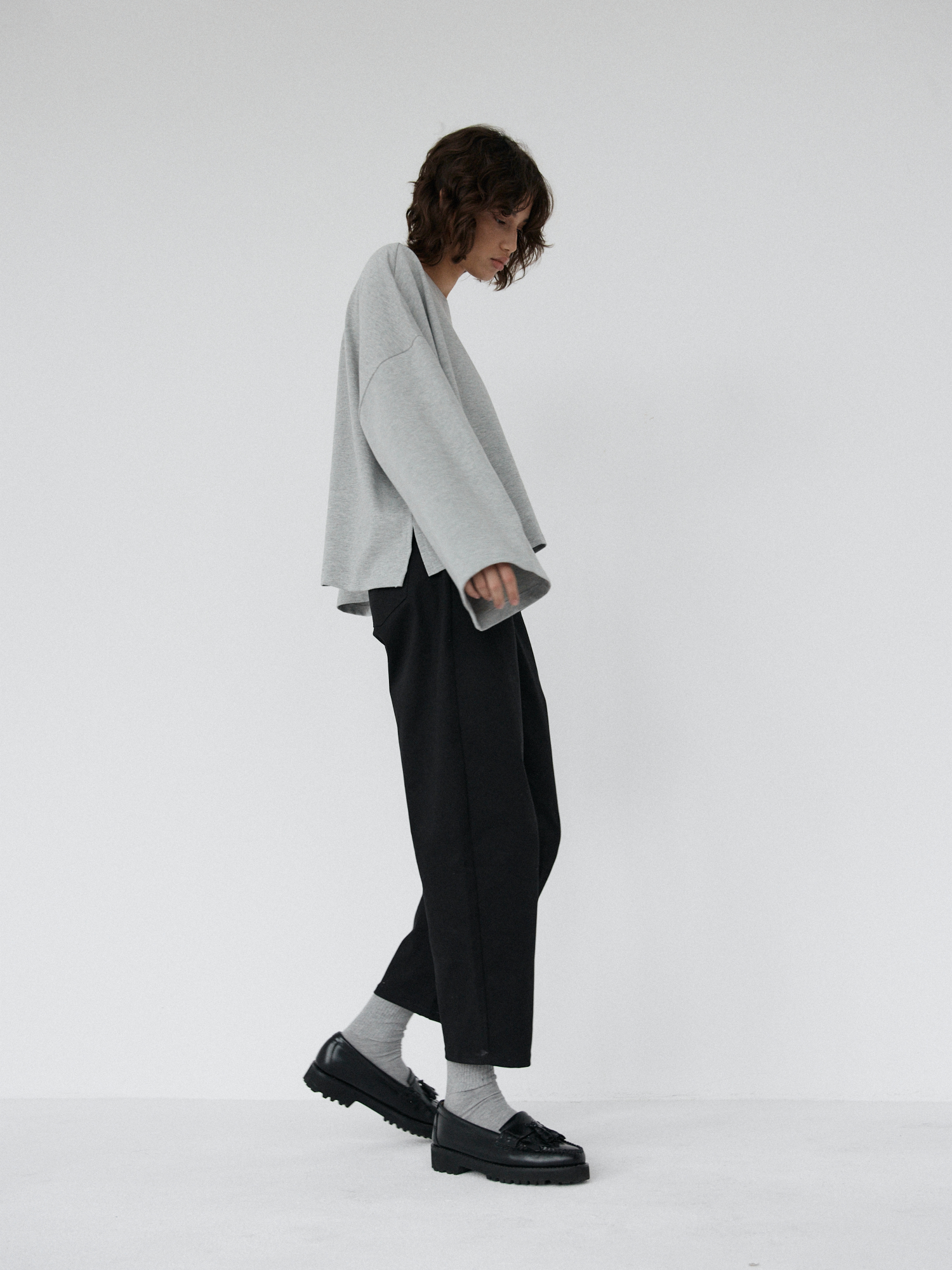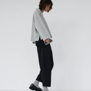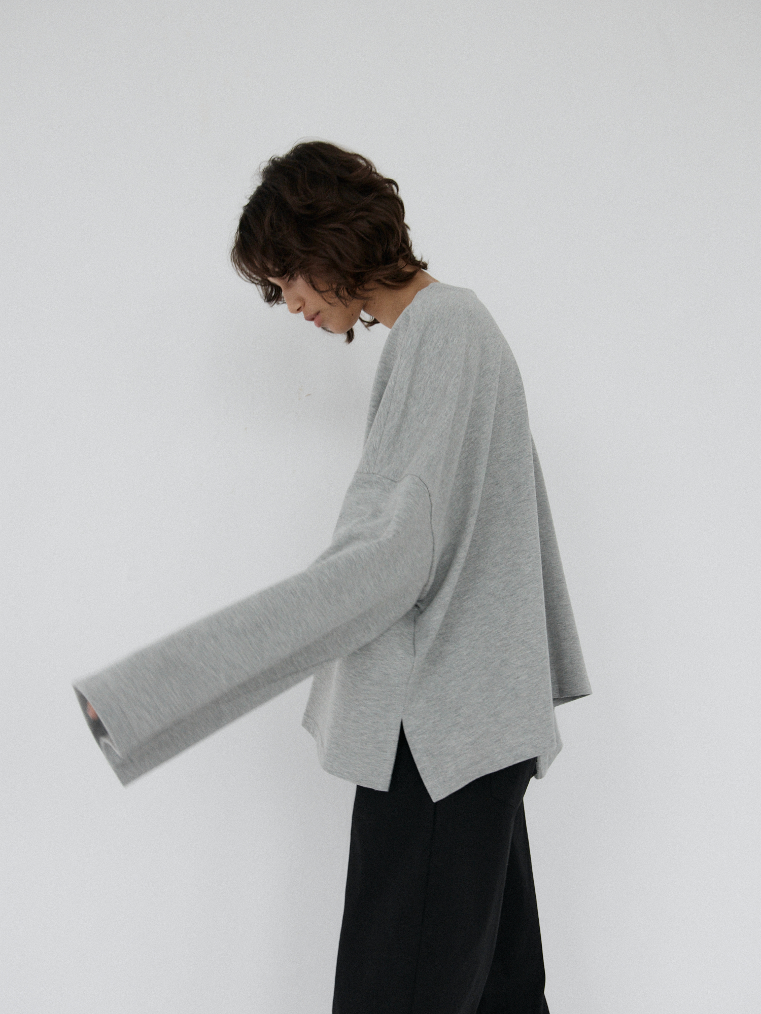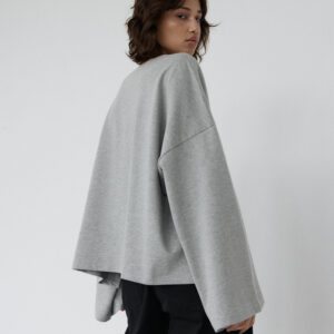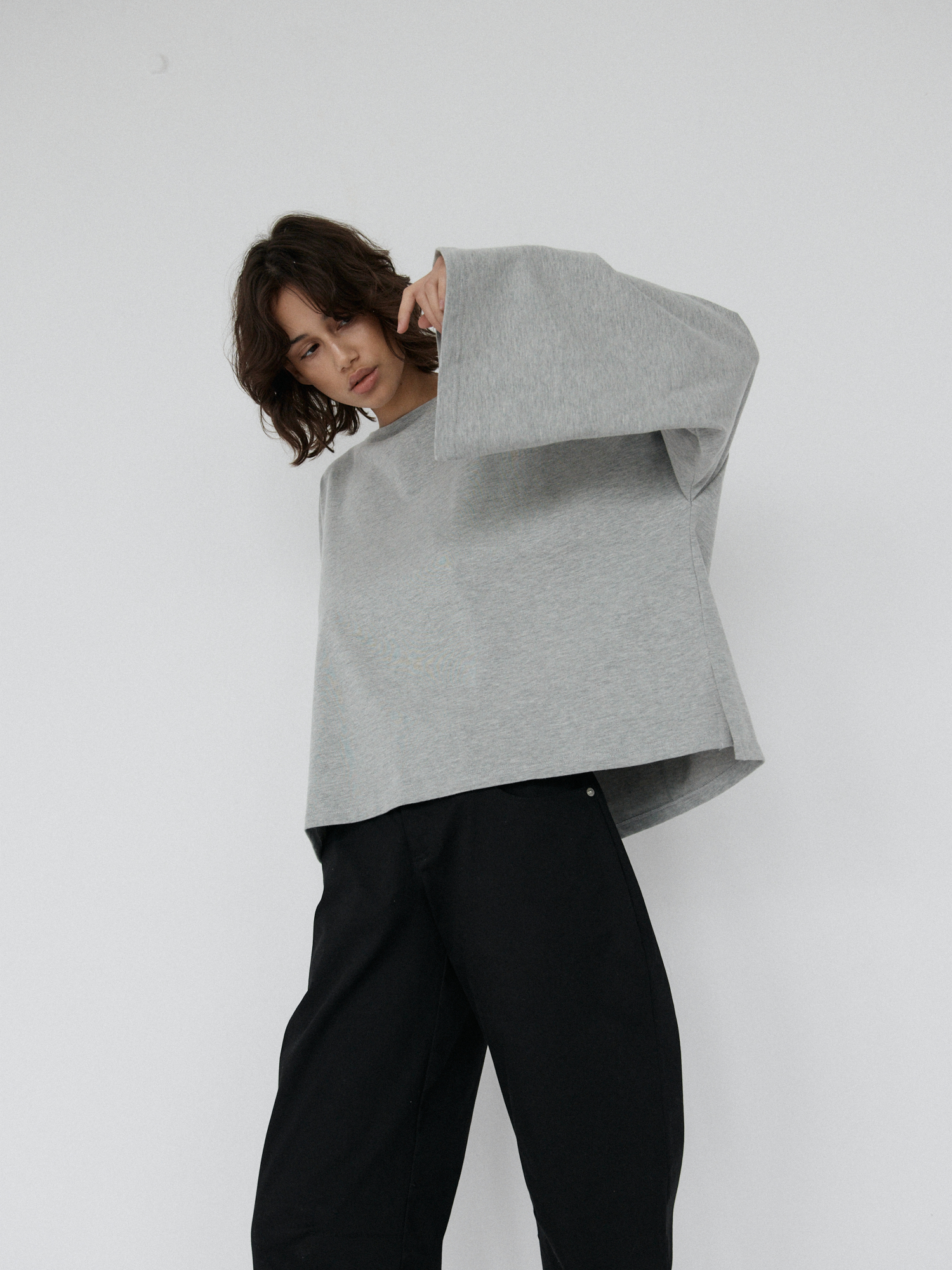 Ultra oversize’owy z obniżoną linią ramion z wydłużonymi rękawami, o lekko zabudowanym dekolcie. Wygodny, minimalistyczny. Model doskonały zarówno na co dzień jak i na wieczór. Długość longsleeve’u jest odpowiednia dla każdego rodzaju spodni, jeansów i leginsów. Najlepiej prezentuje się w monochromatycznych zestawach.