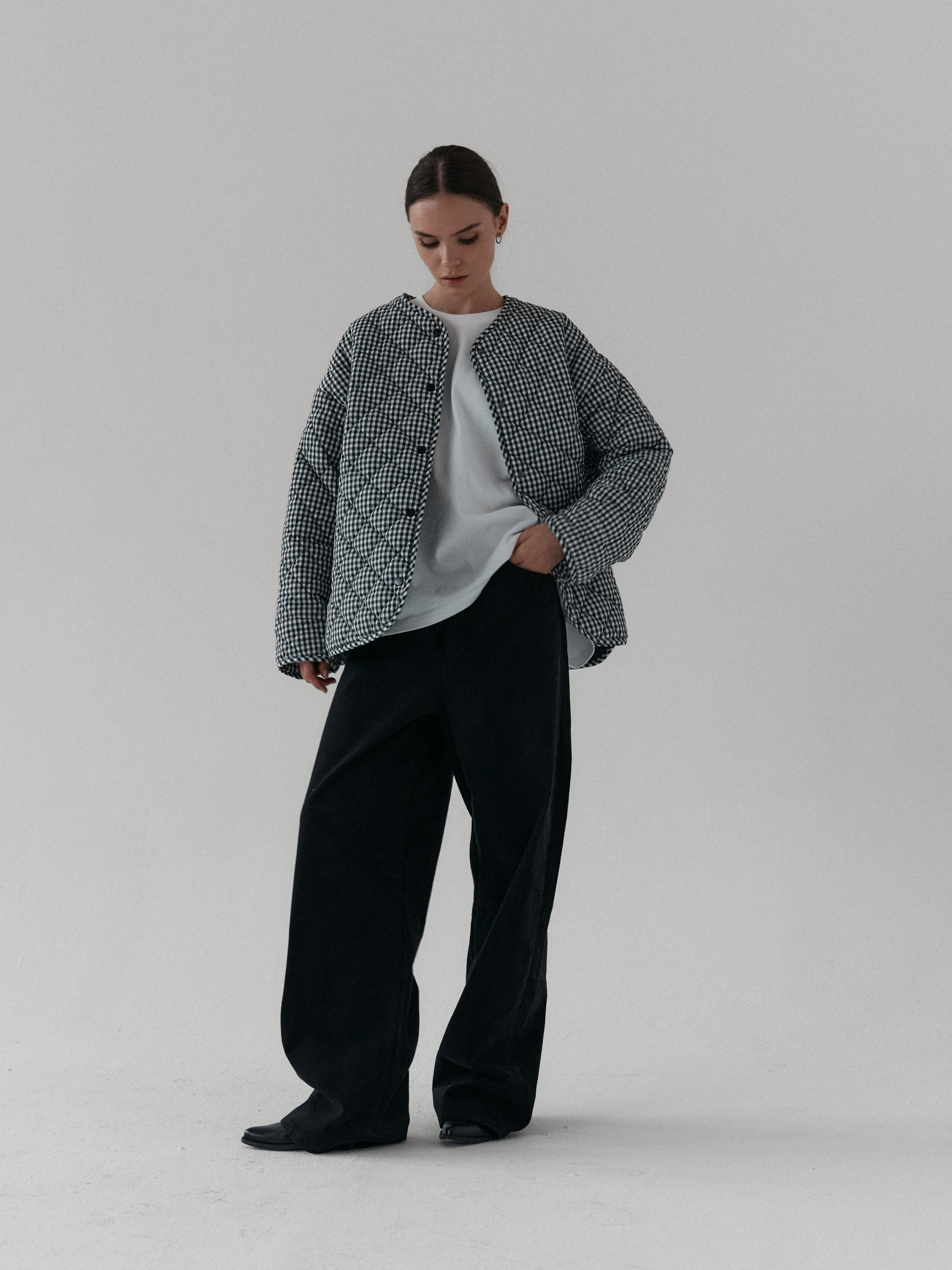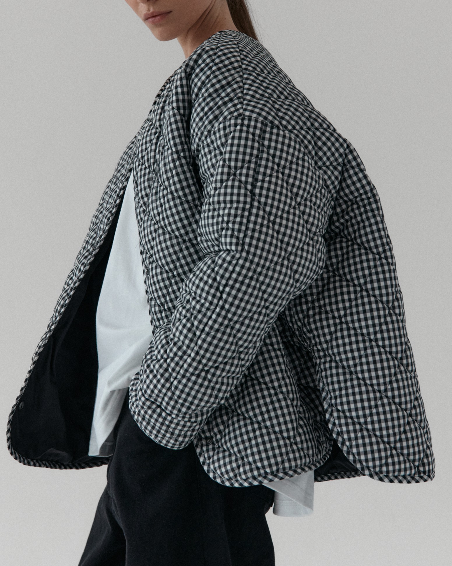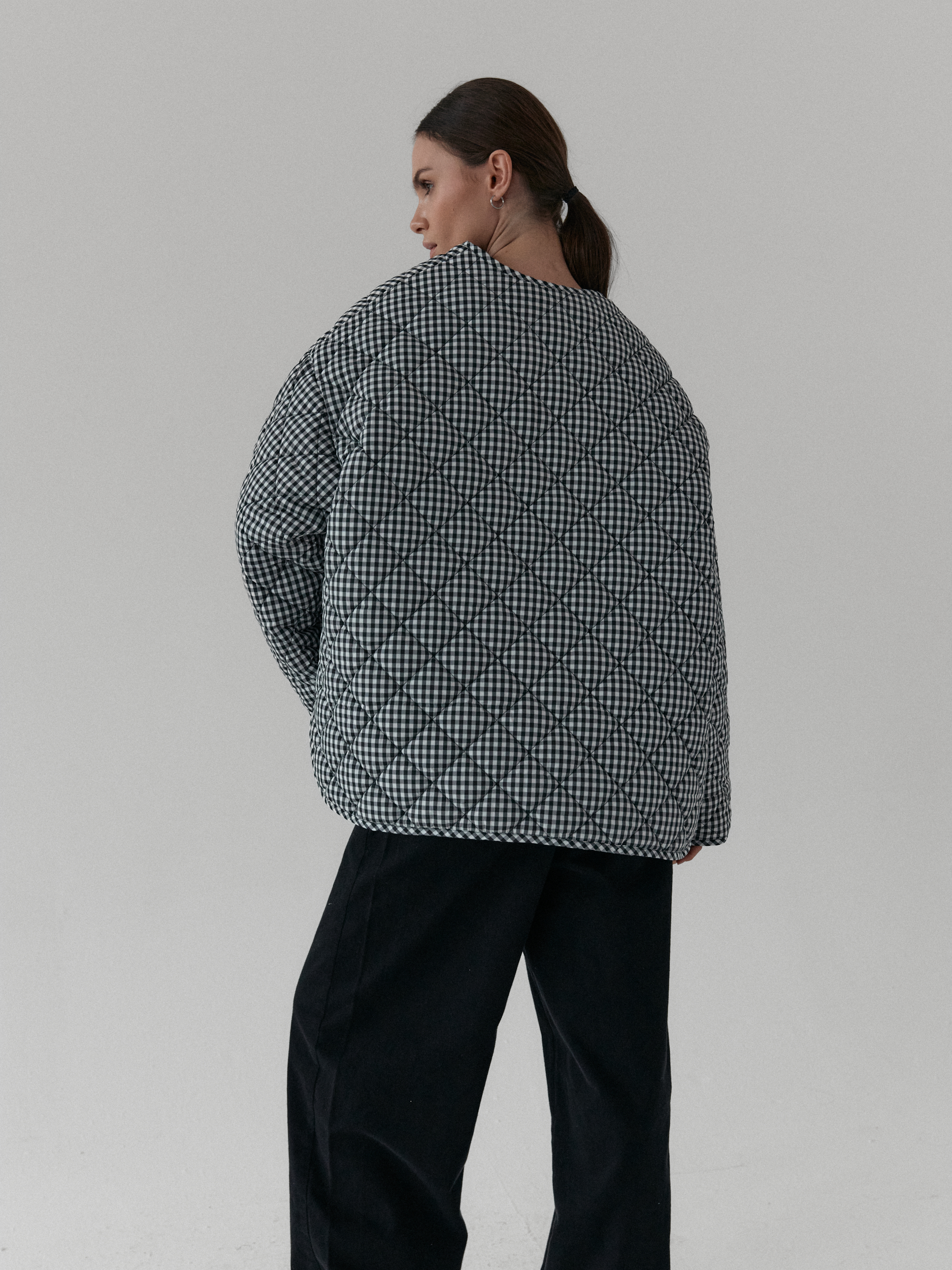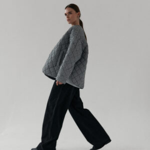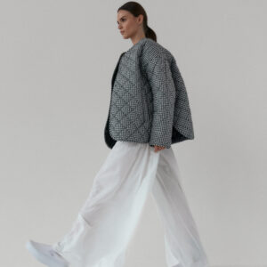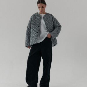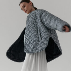 Pikowana kurtka oversize. Luźny krój i obniżona linia ramion nadają jej kopenhaski charakter, a lekko zaokrąglony dół z rozcięciami po bokach zapewnia swobodę ruchów. Pikowanie w romby nadaje kurtce strukturę, dzięki czemu utrzymuje ona swój kształt. Zapinana na metalowe zatrzaski. Całości dopełniają funkcjonalne kieszenie.
