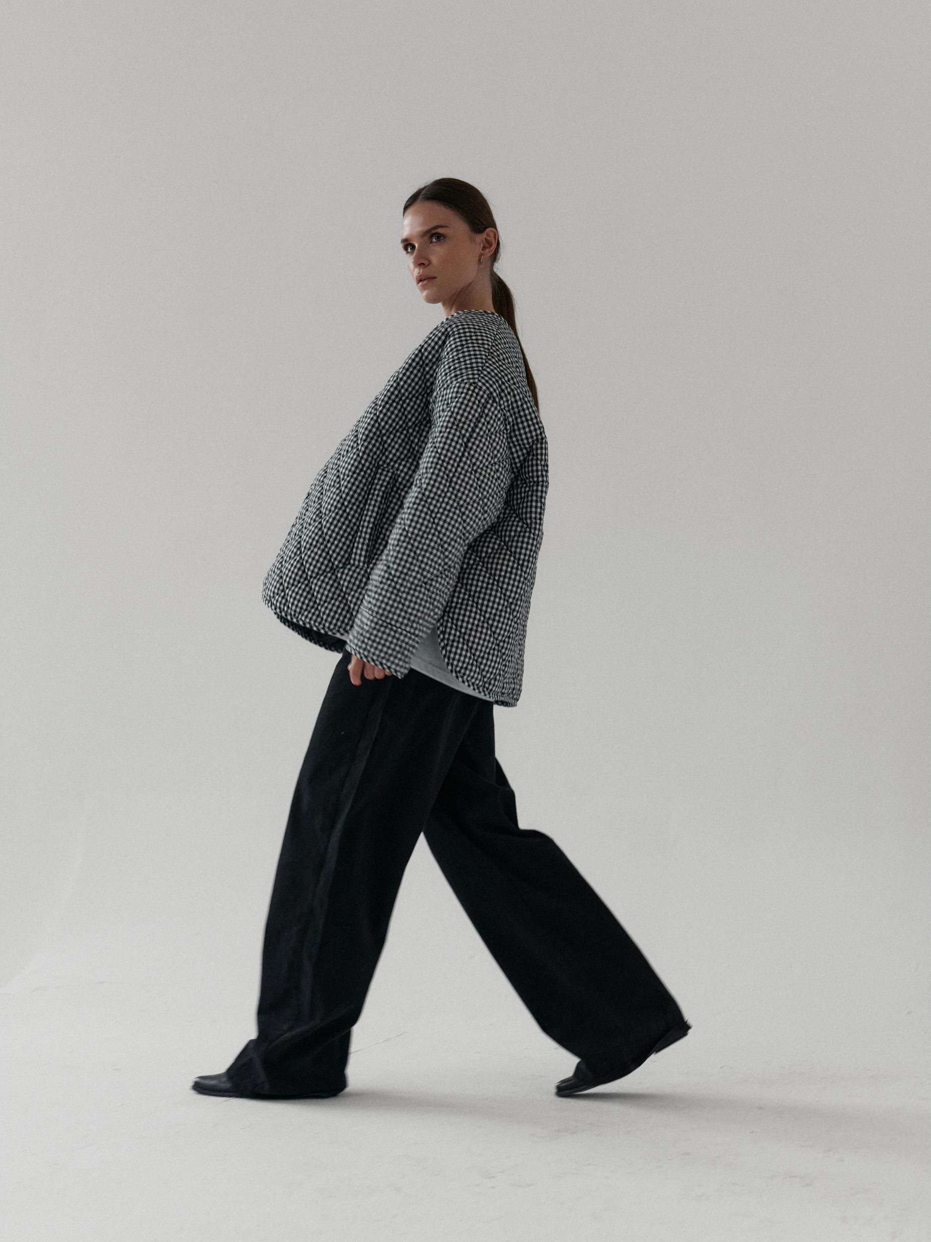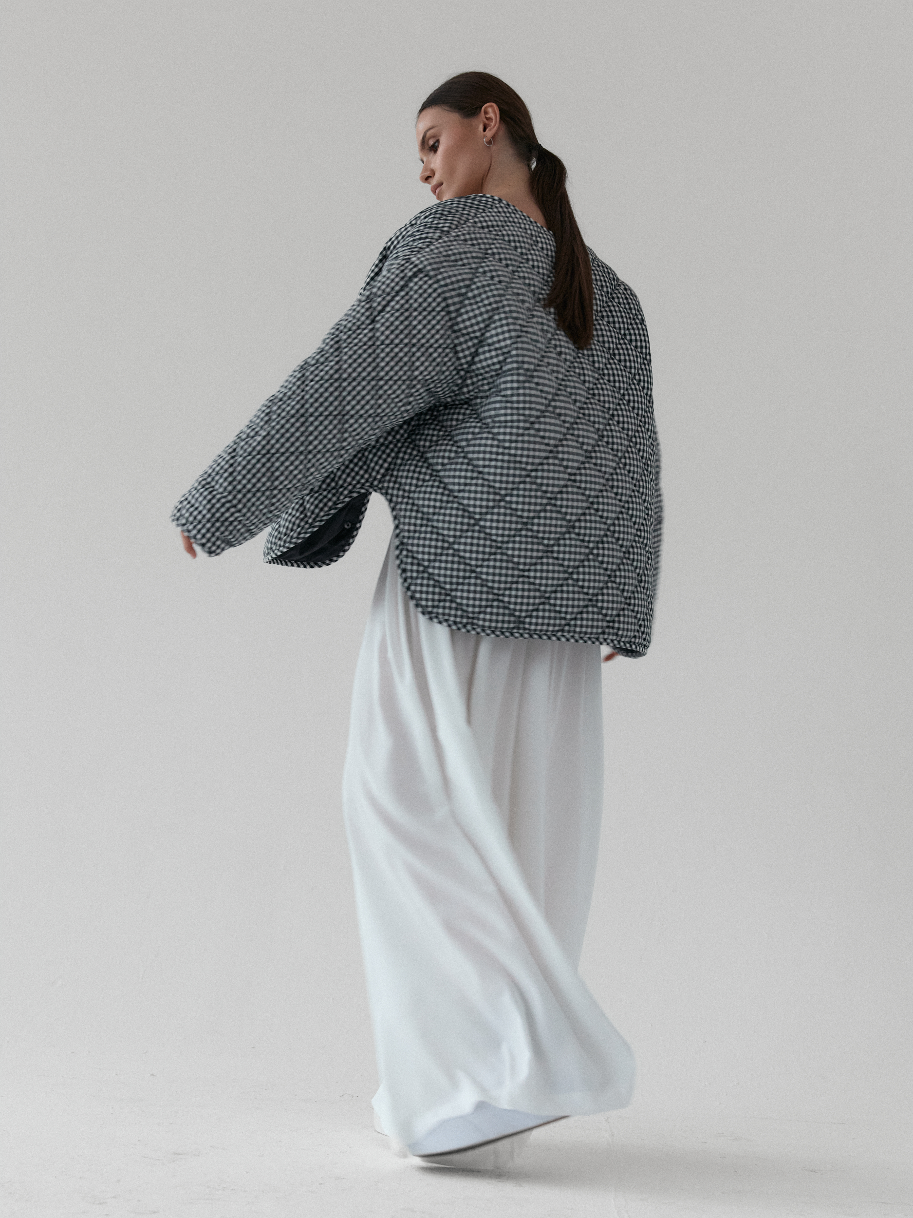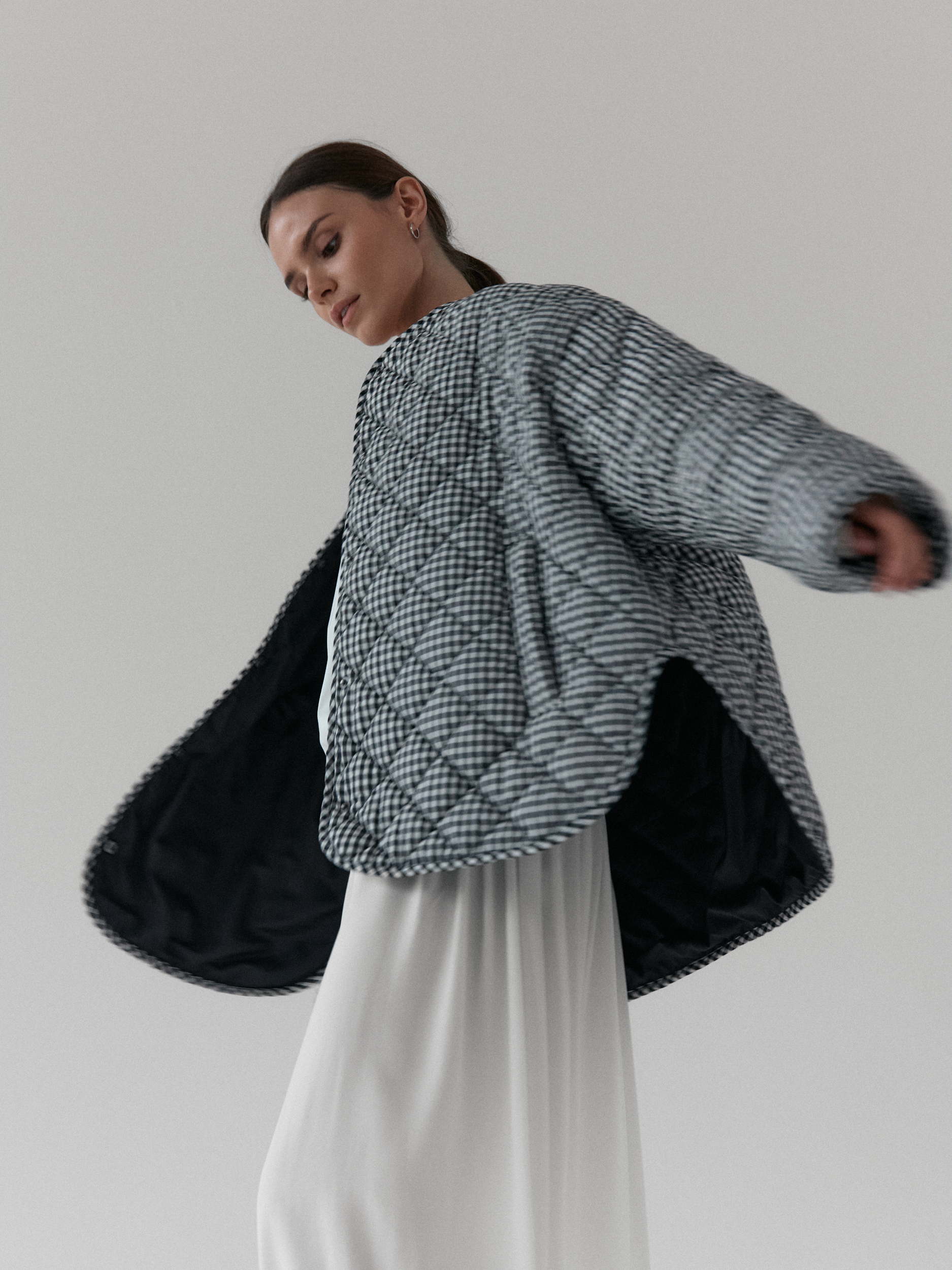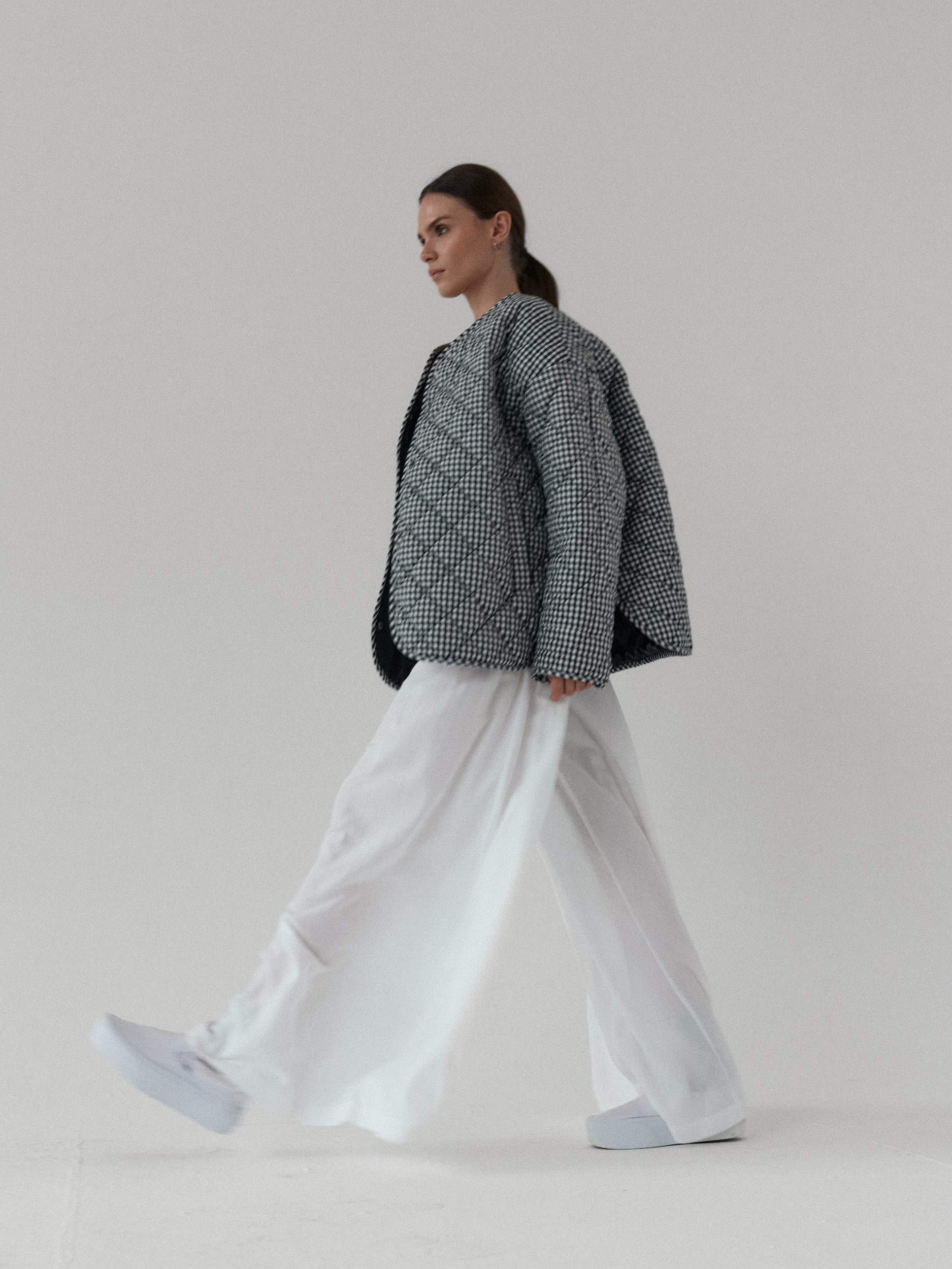 Pikowana kurtka oversize. Luźny krój i obniżona linia ramion nadają jej kopenhaski charakter, a lekko zaokrąglony dół z rozcięciami po bokach zapewnia swobodę ruchów. Pikowanie w romby nadaje kurtce strukturę, dzięki czemu utrzymuje ona swój kształt. Zapinana na metalowe zatrzaski. Całości dopełniają funkcjonalne kieszenie.