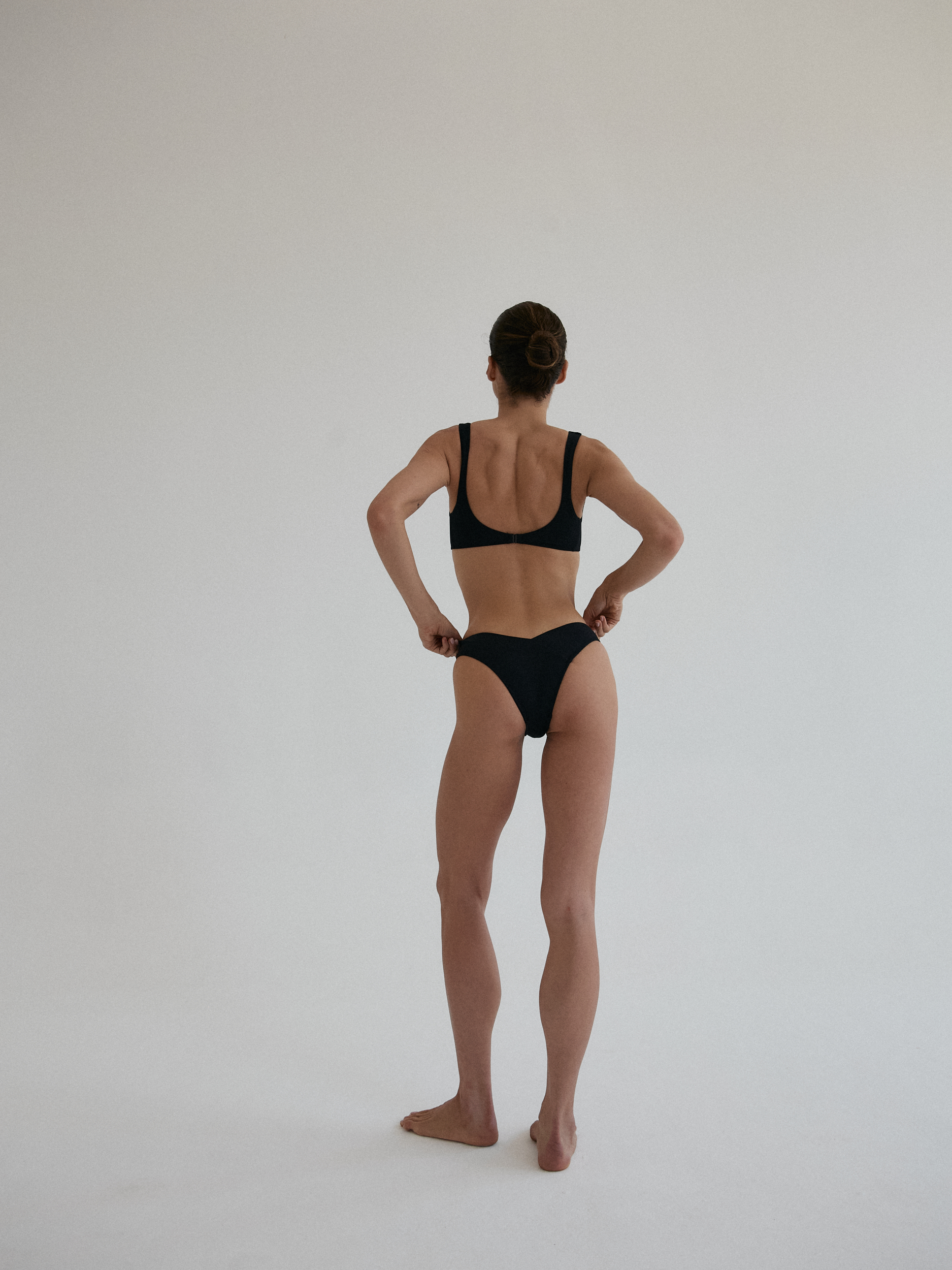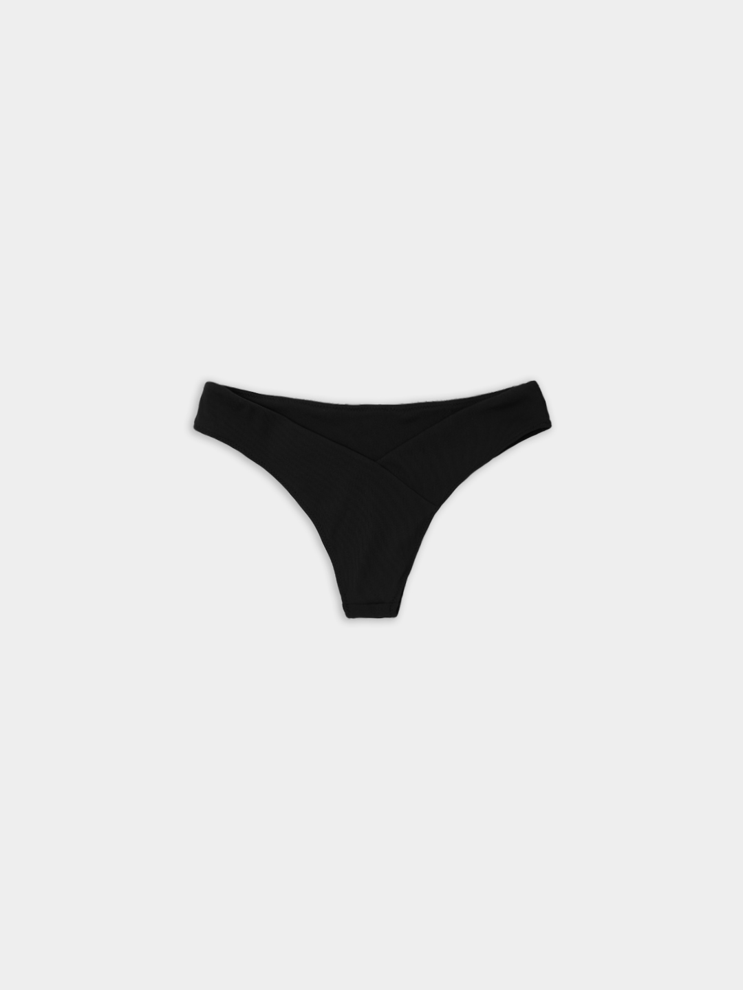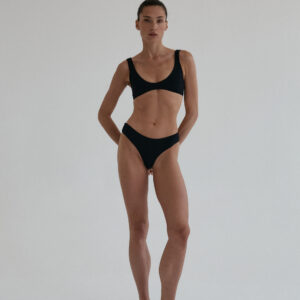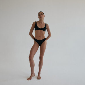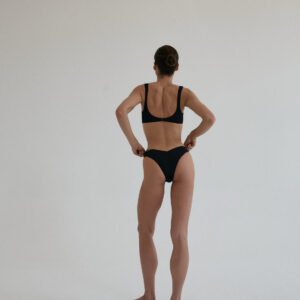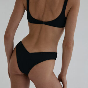 Figi kąpielowe typu cheeky z przeszyciem z tyłu układającym się w delikatne wycięcie. Komfort noszenia zapewnia optymalne zabudowanie majtek (kształt pomiędzy klasycznymi figami, a stringami) oraz wykończenie specjalistycznymi gumkami. Figi wykończone bardzo przyjemną w dotyku podszewką, w kolorze materiału zewnętrznego, która umożliwia cyrkulację powietrza i sprawnie odprowadza wilgoć.