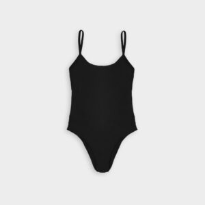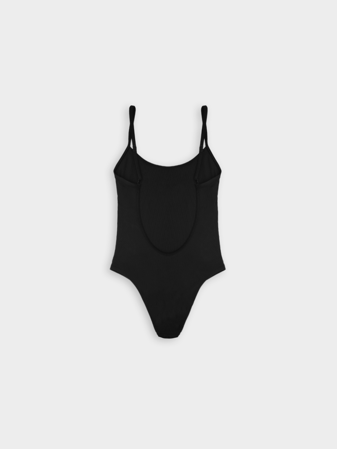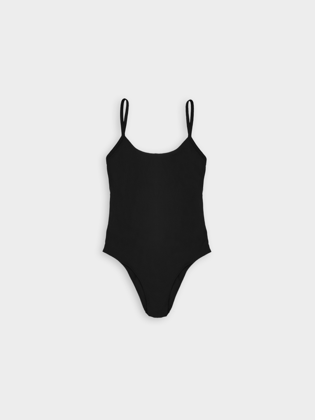 Jednoczęściowy prążkowany kostium na bardzo cienkich ramiączkach z ultra głębokim wycięciem na plecach, które przełamuje klasyczny krój. Doskonale trzyma biust, zachowując jego okrągły kształt. Kostium dodatkowo wykończony jest delikatnymi, specjalistycznymi gumkami, które zapewniają komfort pływania, jednocześnie nie wcinając się w ciało. Wycięcia po bokach optycznie wydłużają nogi. Tył pięknie podkreśla pośladki, jednocześnie poprzez swoją formę dobrze je podtrzymuje.