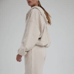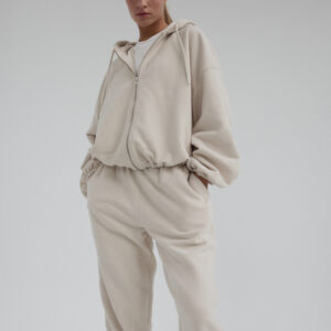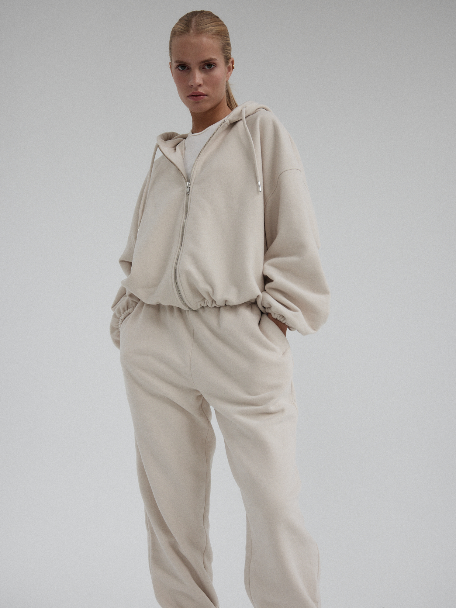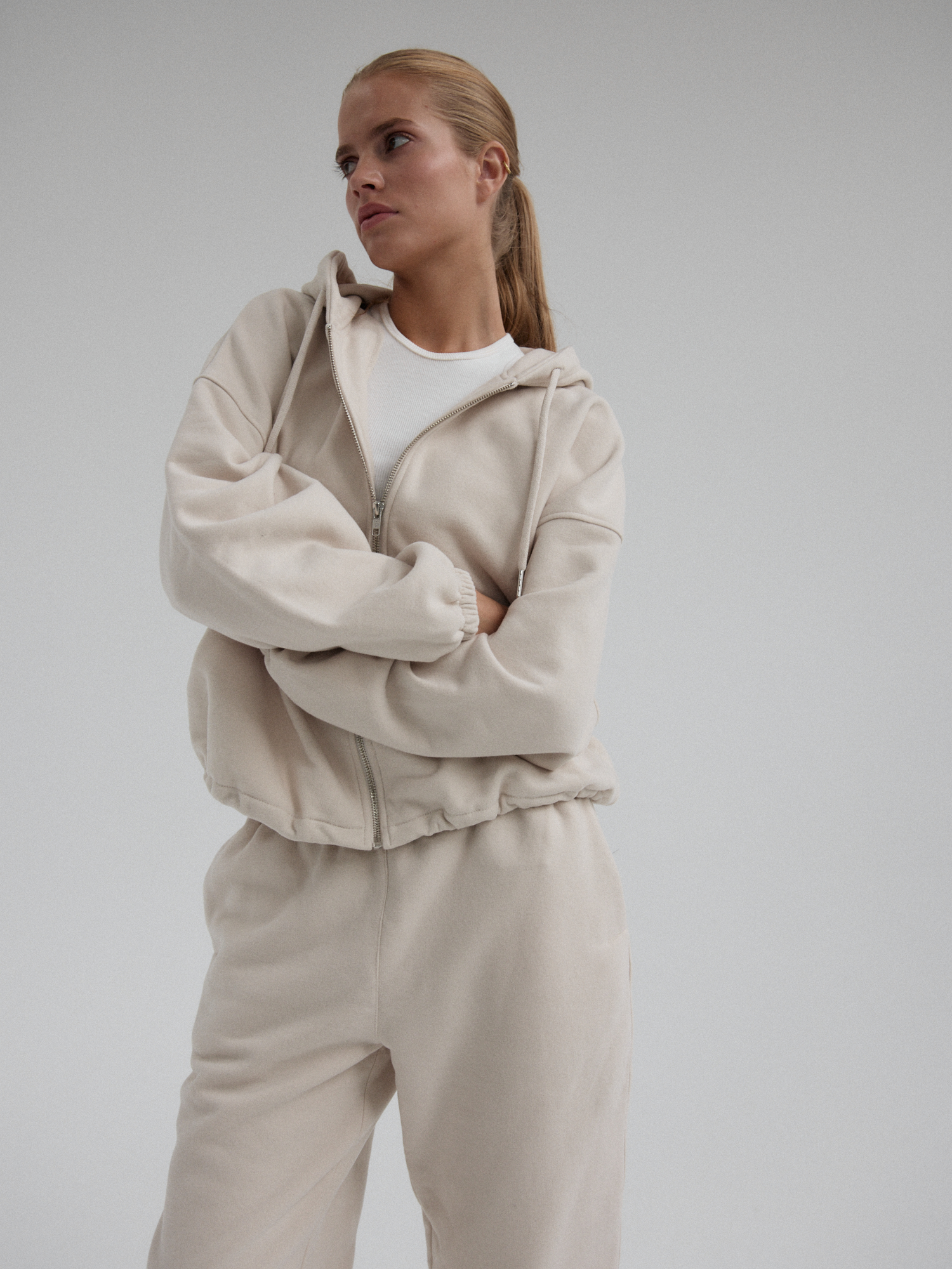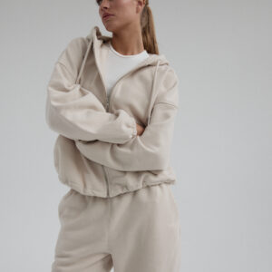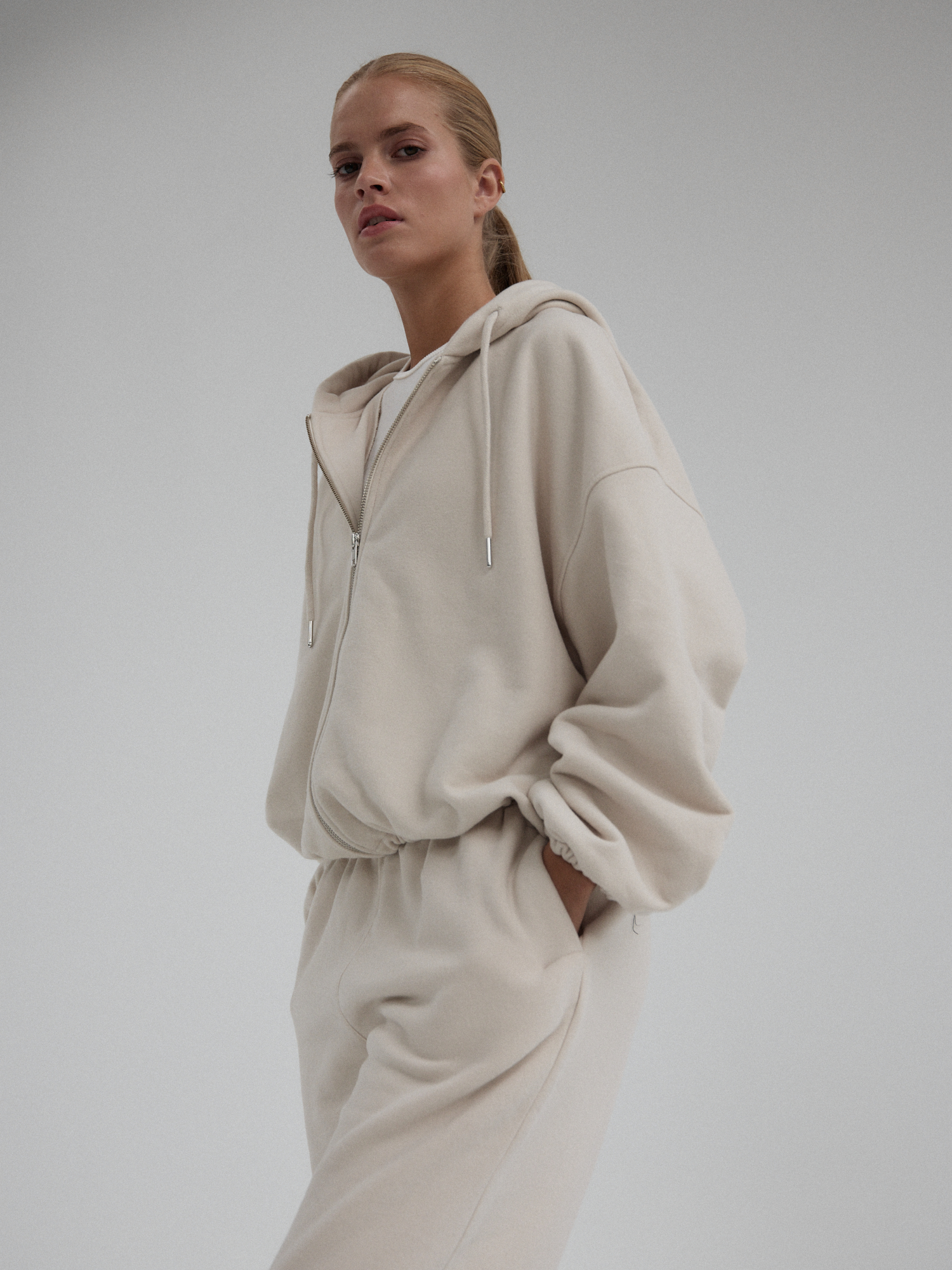Oversize’owa bluza z obszernym kapturem zapinana na zamek. Model wyróżnia się charakterystycznymi bufiastymi rękawami typu balloon sleeve, które nadają całości stylowy charakter. Bluza posiada dwie funkcjonalne kieszenie. Miękka, przyjemna w dotyku tkanina zapewnia komfort noszenia przez cały dzień, a luźny krój sprawia, że doskonale układa się na sylwetce..