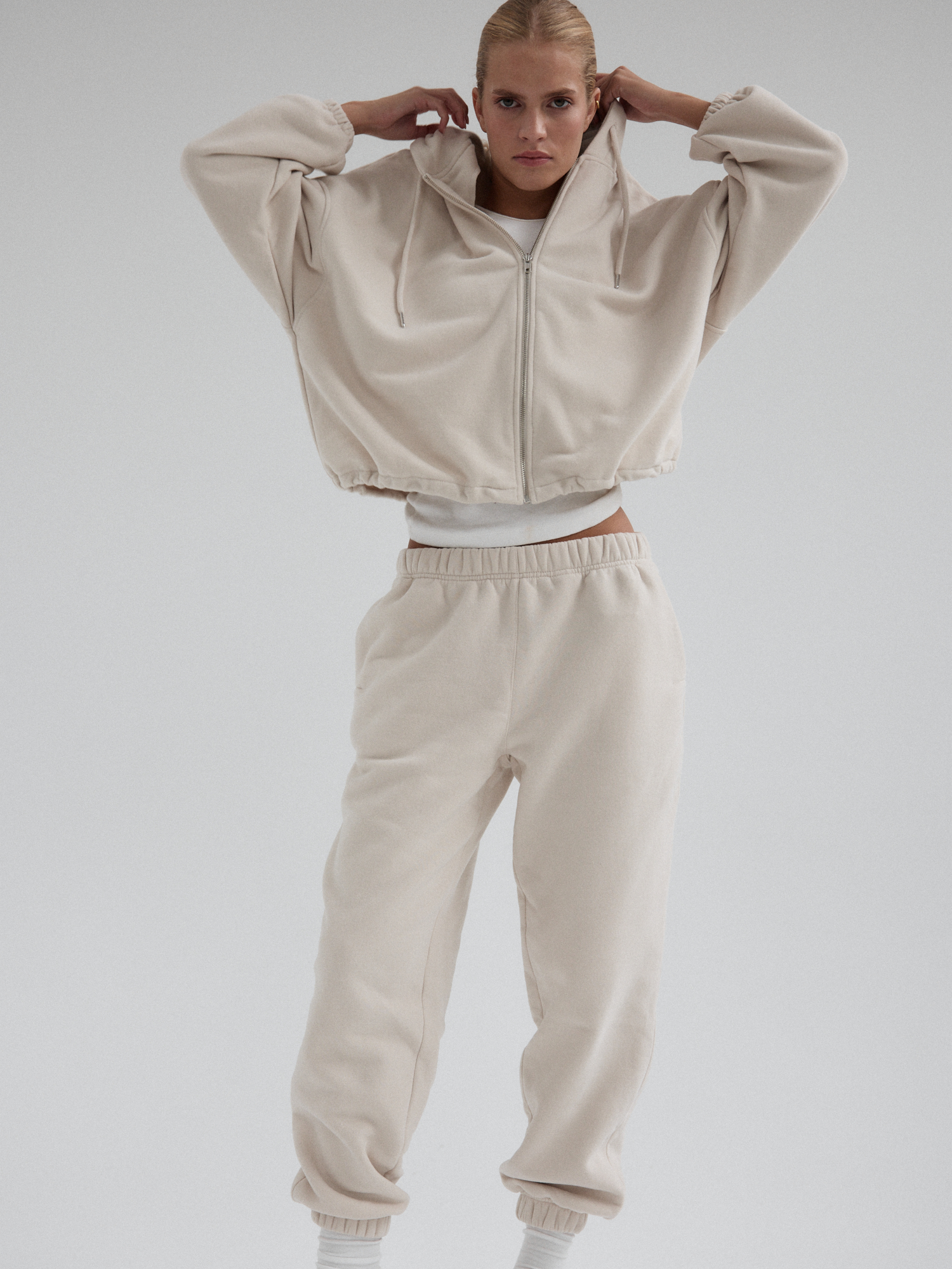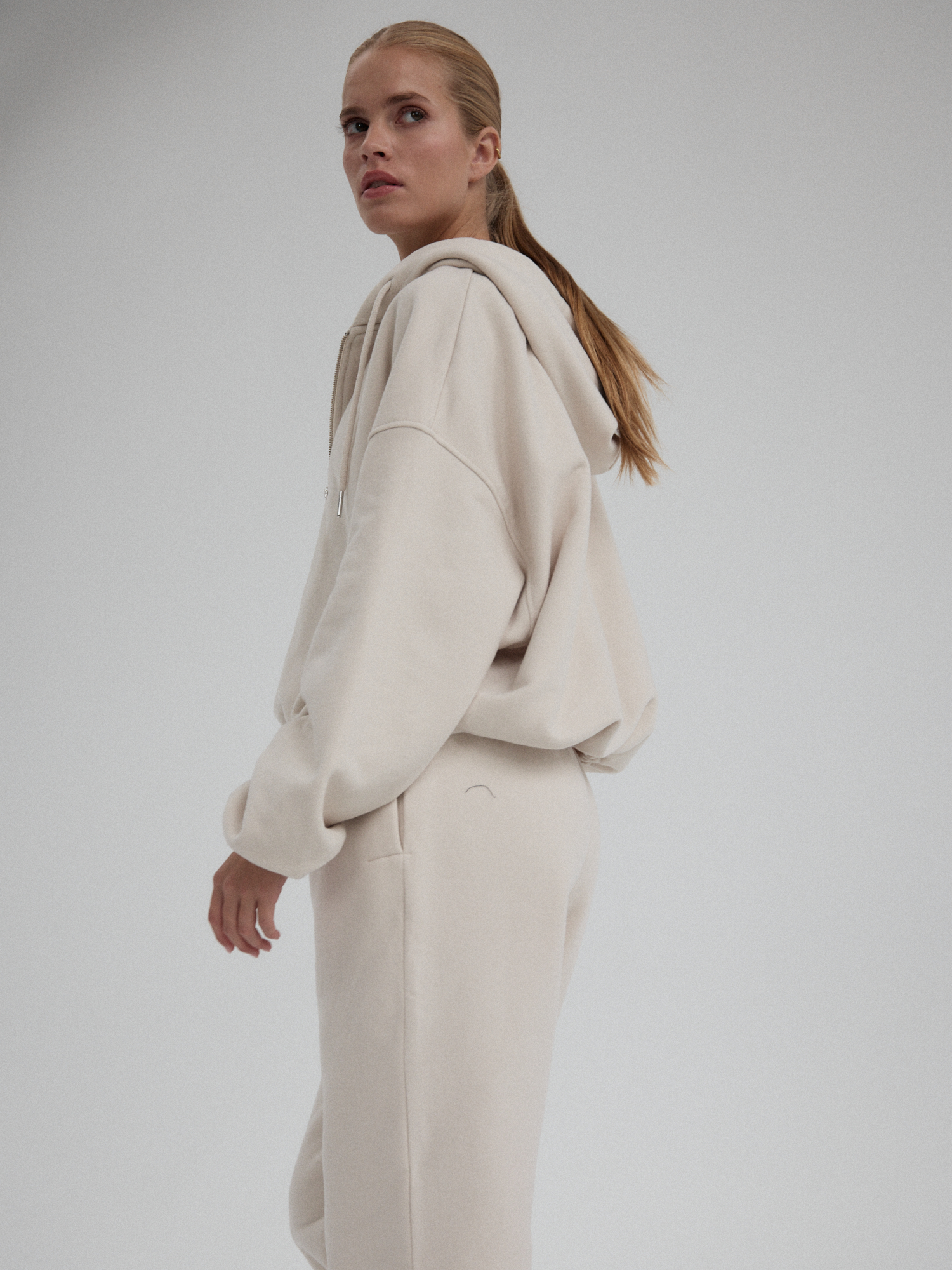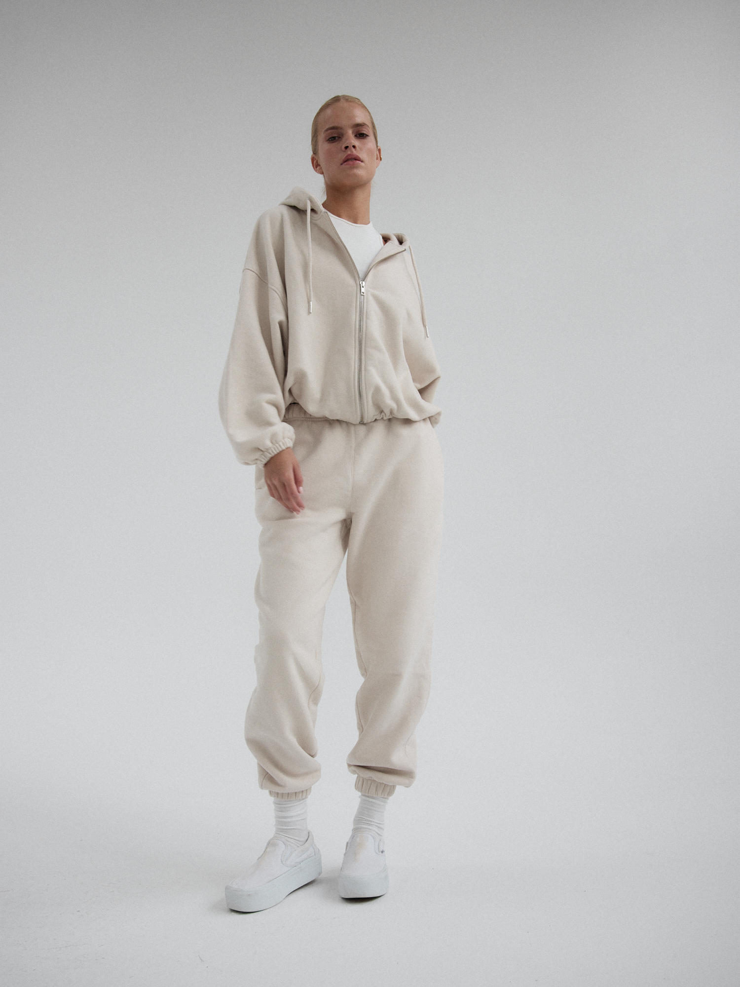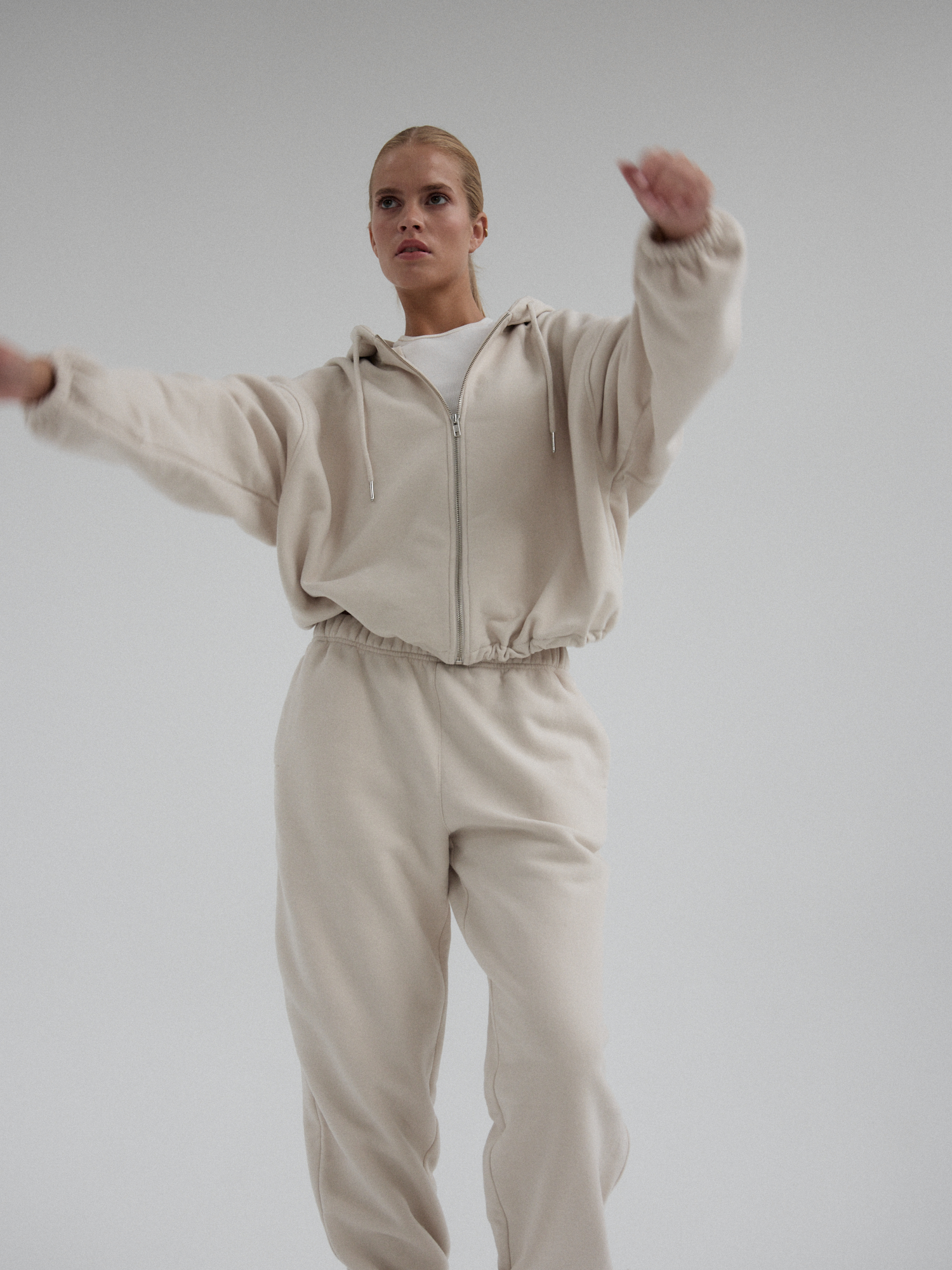 Oversize’owa bluza z obszernym kapturem zapinana na zamek. Model wyróżnia się charakterystycznymi bufiastymi rękawami typu balloon sleeve, które nadają całości stylowy charakter. Bluza posiada dwie funkcjonalne kieszenie. Miękka, przyjemna w dotyku tkanina zapewnia komfort noszenia przez cały dzień, a luźny krój sprawia, że doskonale układa się na sylwetce..