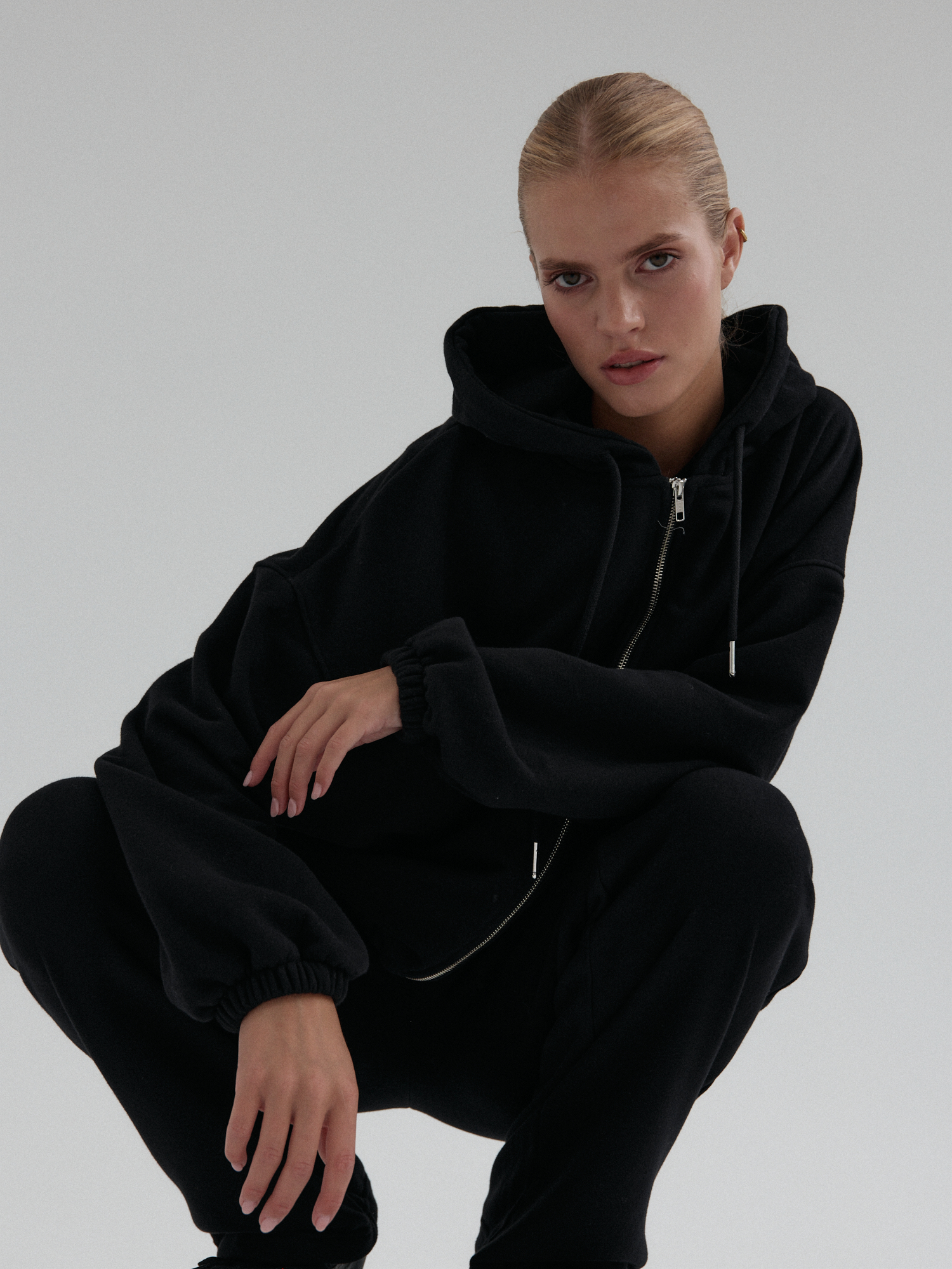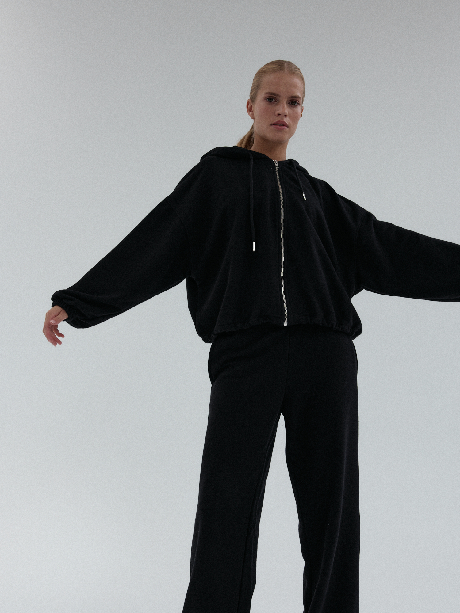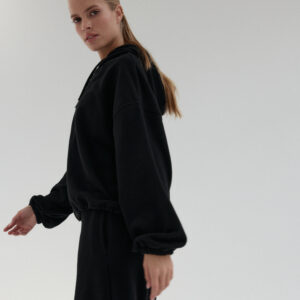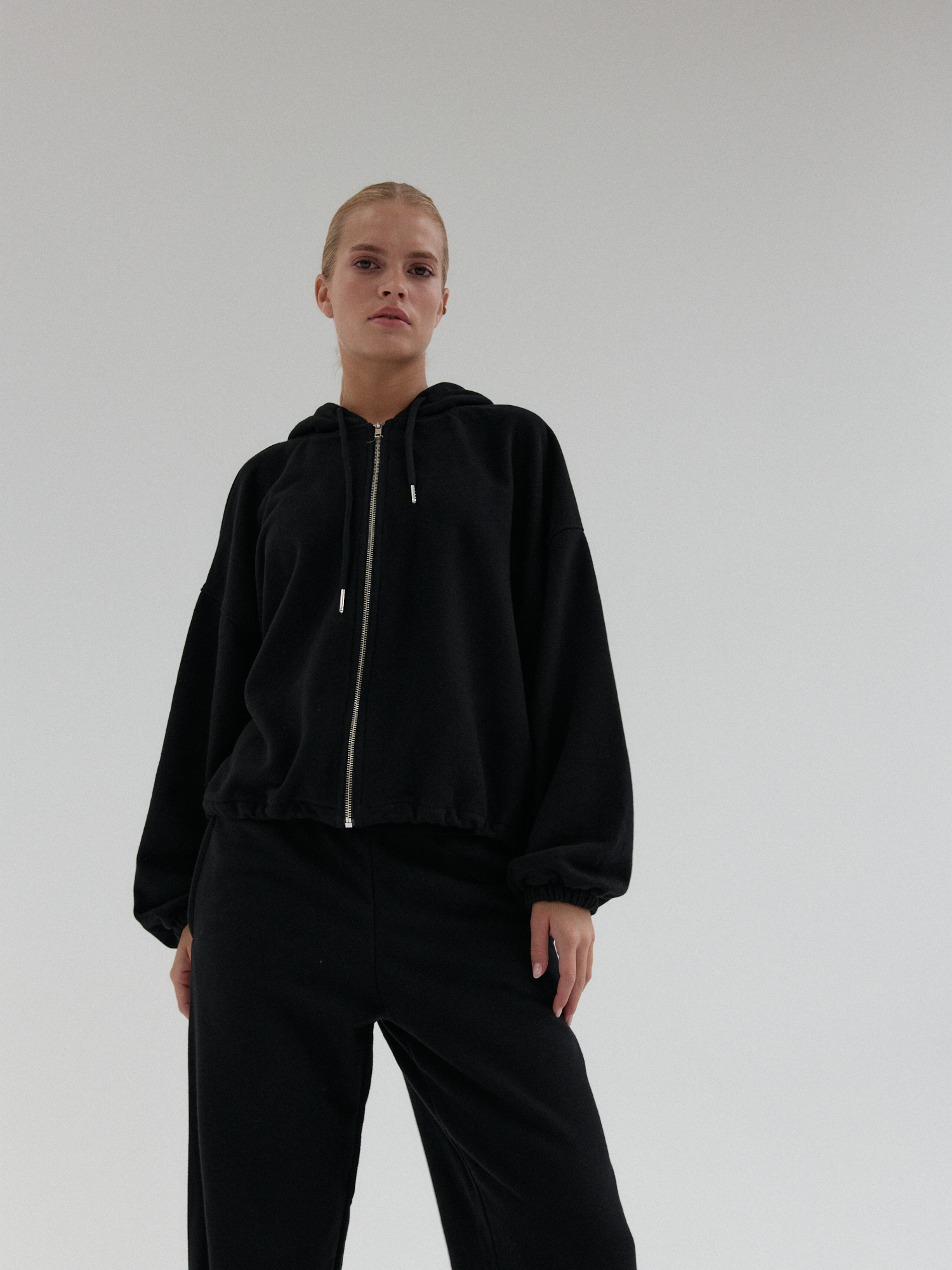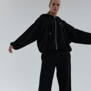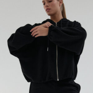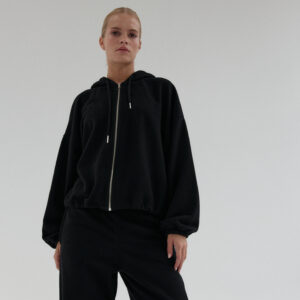 Oversize’owa bluza z obszernym kapturem zapinana na zamek. Model wyróżnia się charakterystycznymi bufiastymi rękawami typu balloon sleeve, które nadają całości stylowy charakter. Bluza posiada dwie funkcjonalne kieszenie. Miękka, przyjemna w dotyku tkanina zapewnia komfort noszenia przez cały dzień, a luźny krój sprawia, że doskonale układa się na sylwetce..
