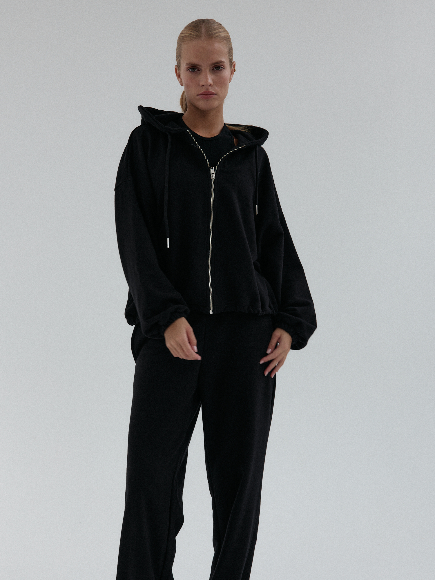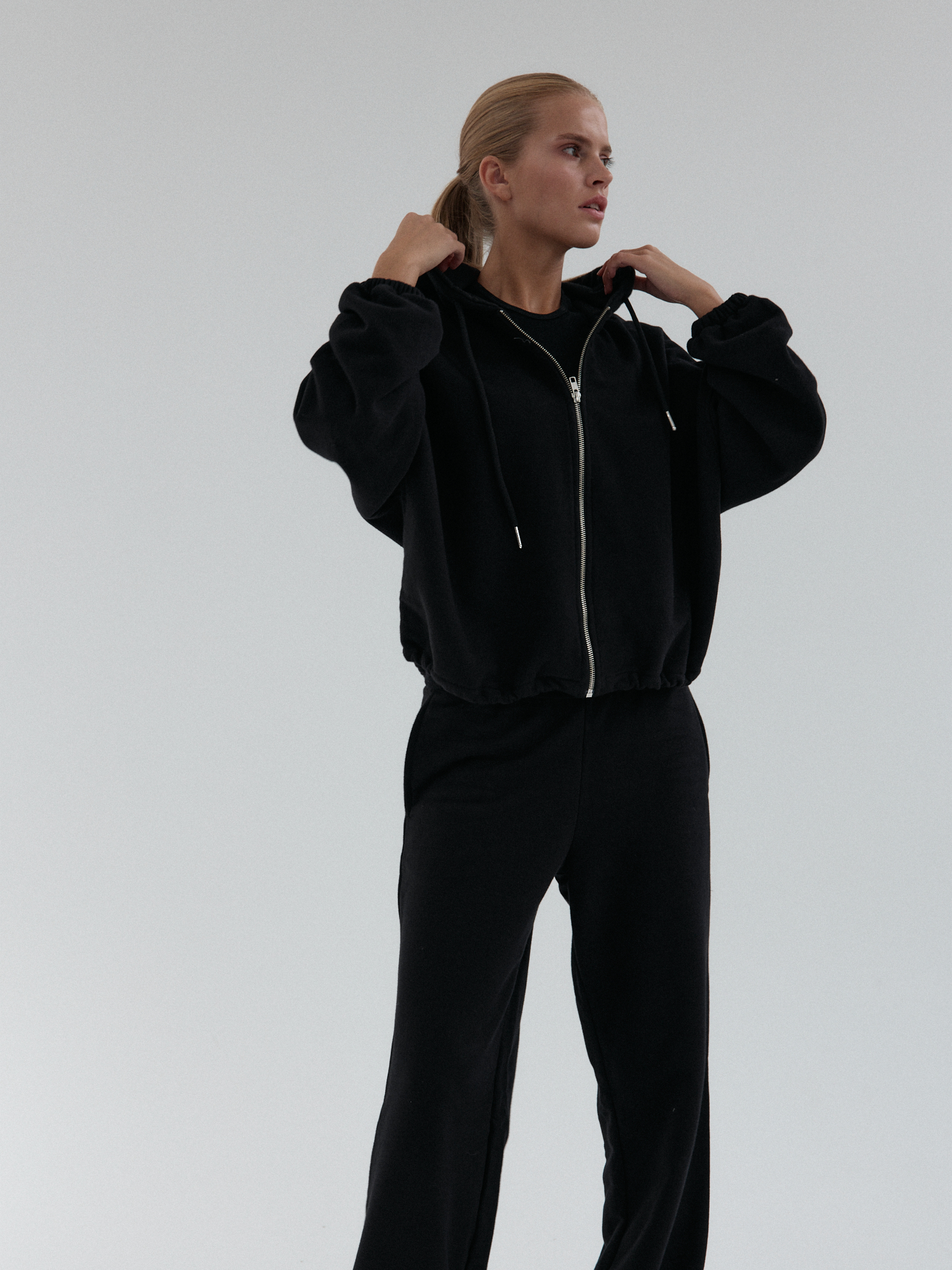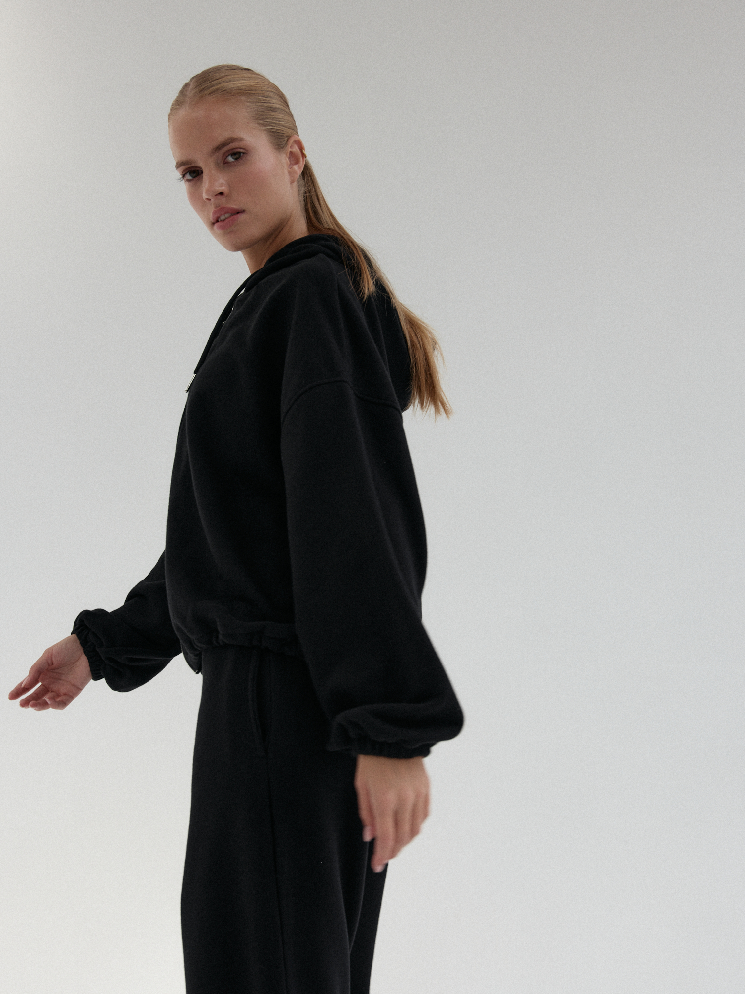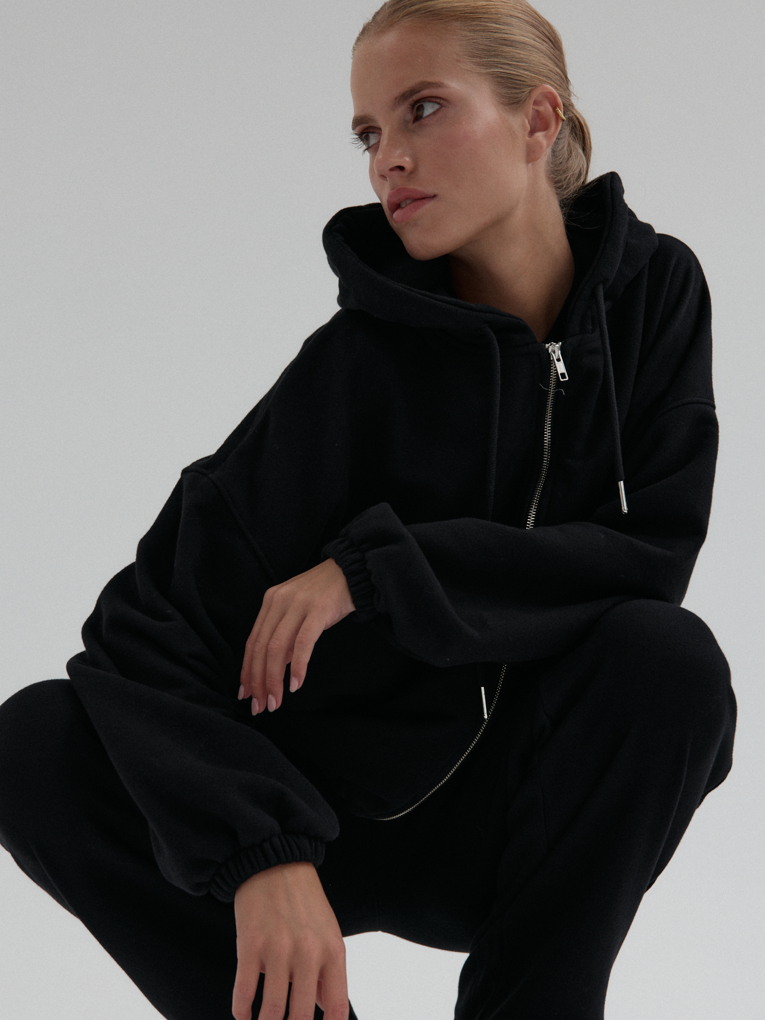 Oversize’owa bluza z obszernym kapturem zapinana na zamek. Model wyróżnia się charakterystycznymi bufiastymi rękawami typu balloon sleeve, które nadają całości stylowy charakter. Bluza posiada dwie funkcjonalne kieszenie. Miękka, przyjemna w dotyku tkanina zapewnia komfort noszenia przez cały dzień, a luźny krój sprawia, że doskonale układa się na sylwetce..