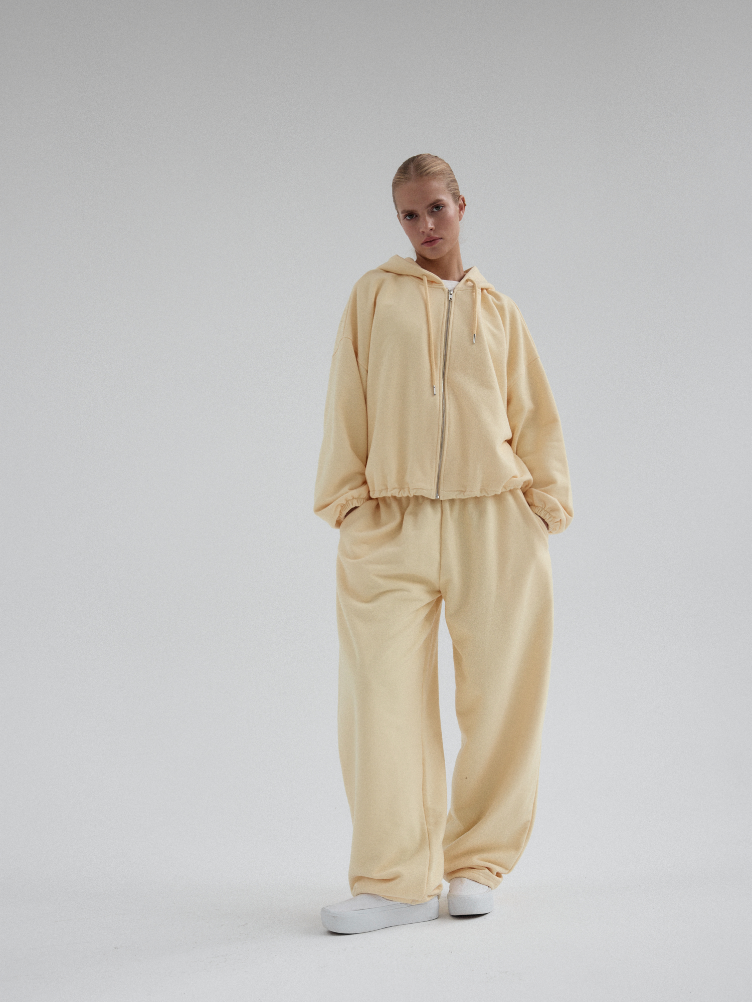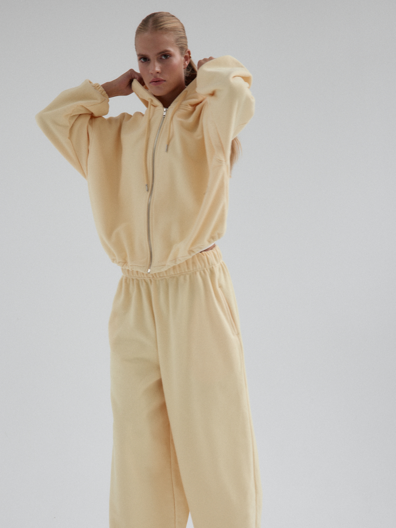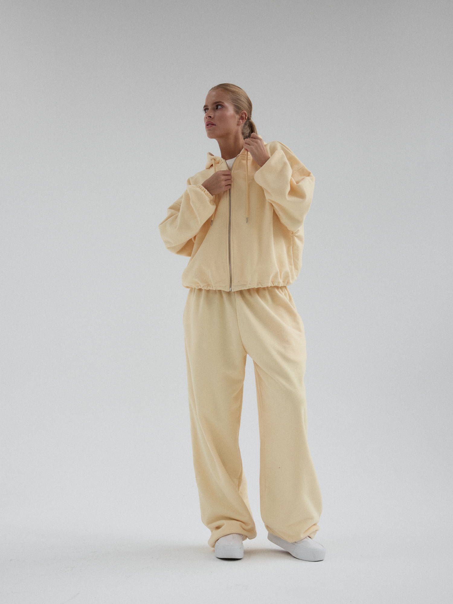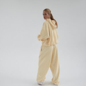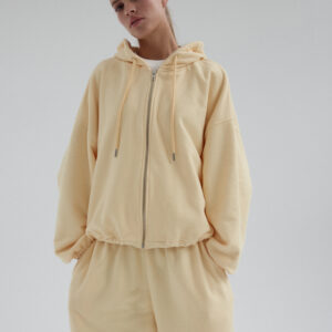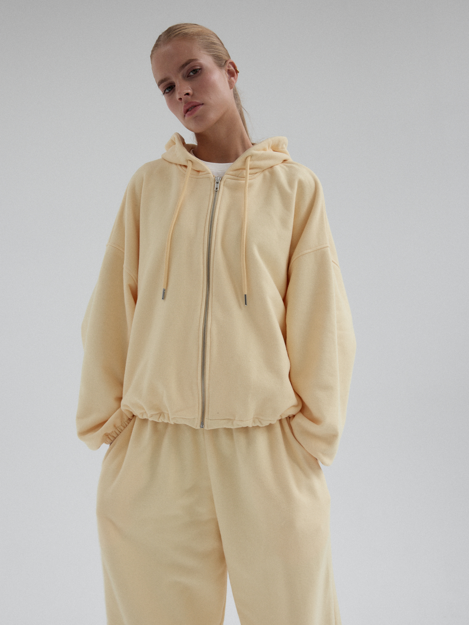 Oversize’owa bluza z obszernym kapturem zapinana na zamek. Model wyróżnia się charakterystycznymi bufiastymi rękawami typu balloon sleeve, które nadają całości stylowy charakter. Bluza posiada dwie funkcjonalne kieszenie. Miękka, przyjemna w dotyku tkanina zapewnia komfort noszenia przez cały dzień, a luźny krój sprawia, że doskonale układa się na sylwetce..