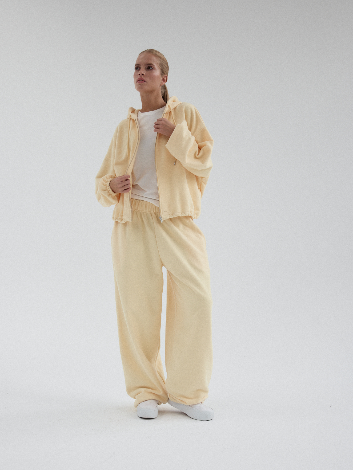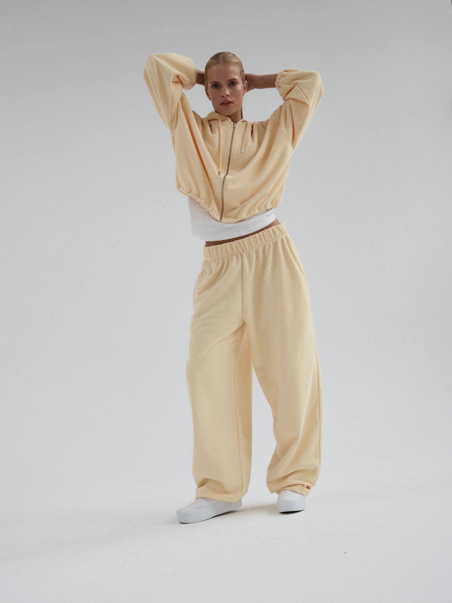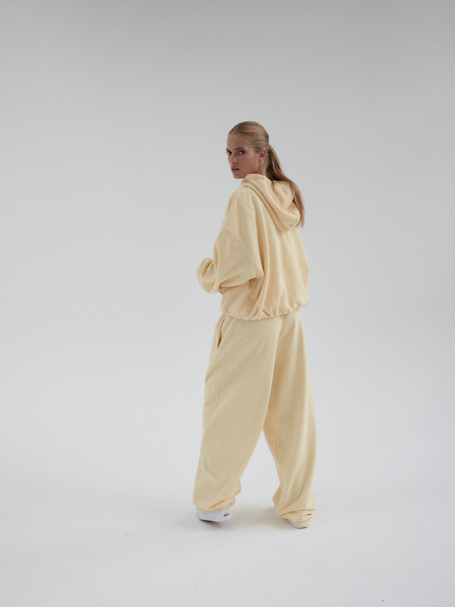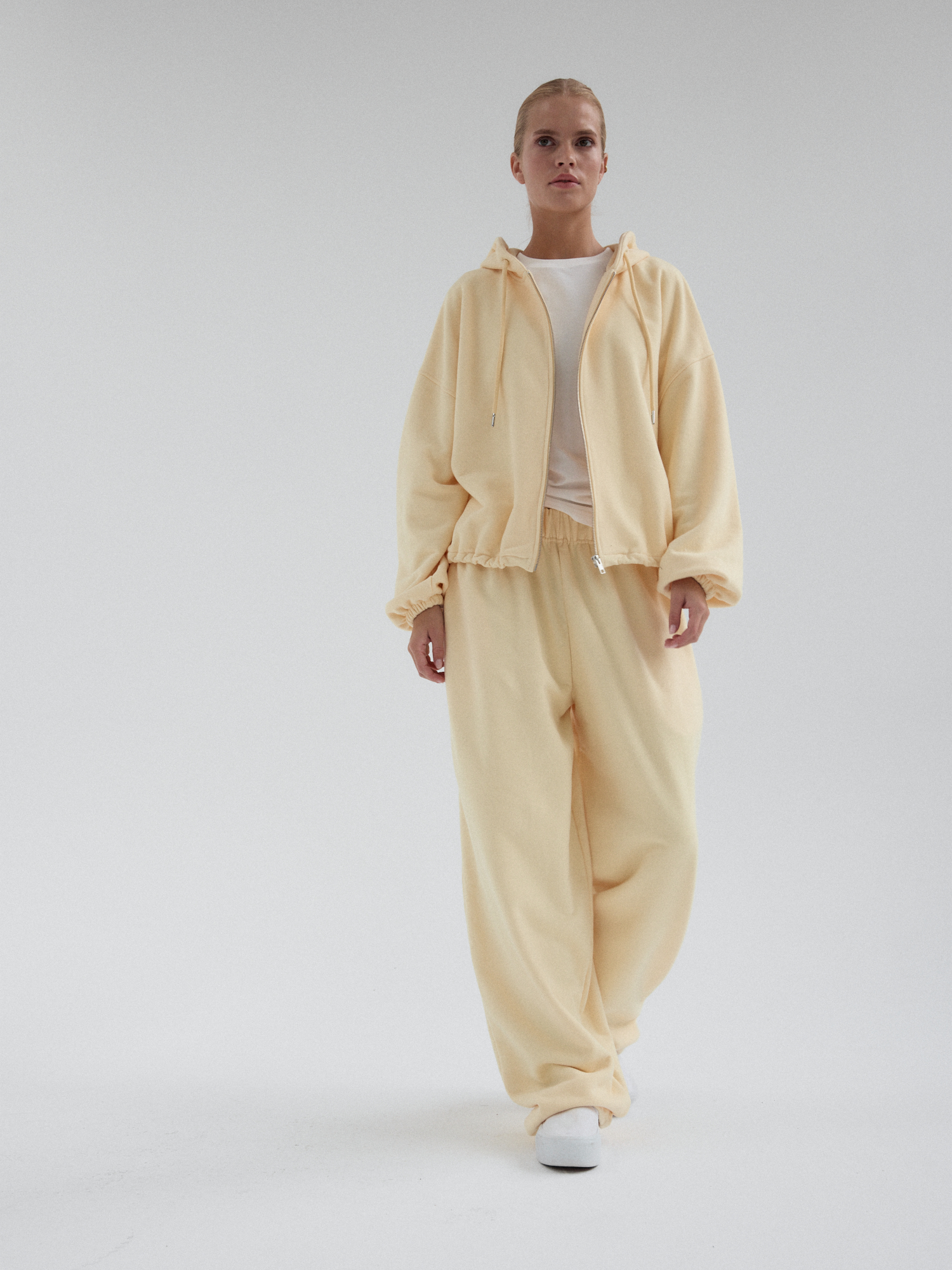 Oversize’owa bluza z obszernym kapturem zapinana na zamek. Model wyróżnia się charakterystycznymi bufiastymi rękawami typu balloon sleeve, które nadają całości stylowy charakter. Bluza posiada dwie funkcjonalne kieszenie. Miękka, przyjemna w dotyku tkanina zapewnia komfort noszenia przez cały dzień, a luźny krój sprawia, że doskonale układa się na sylwetce..