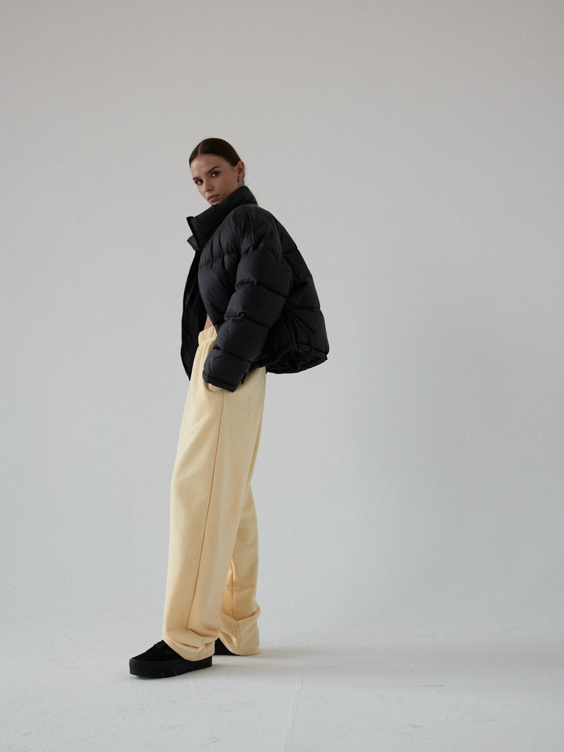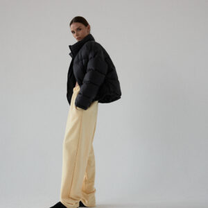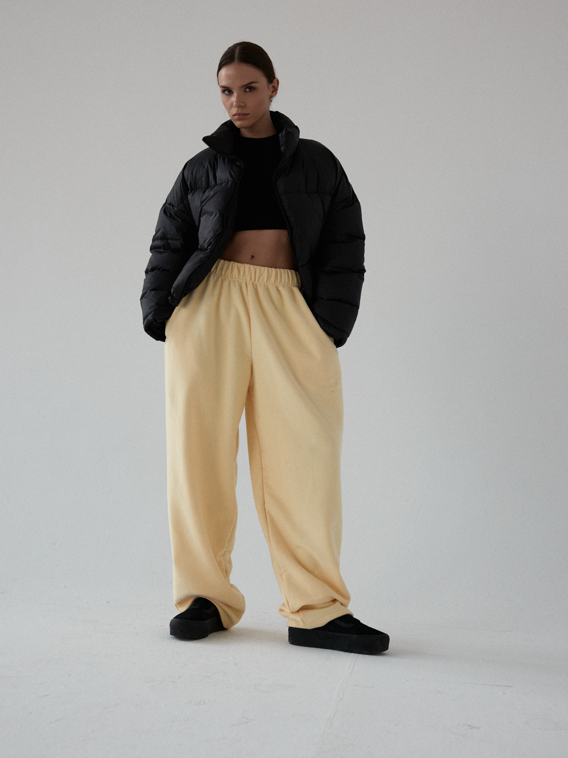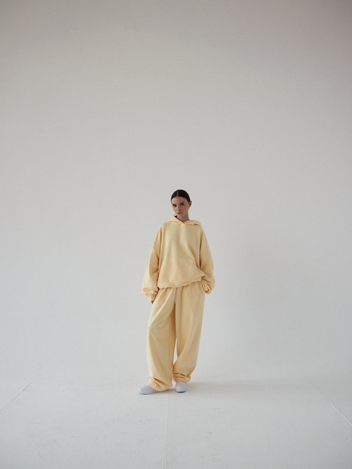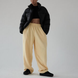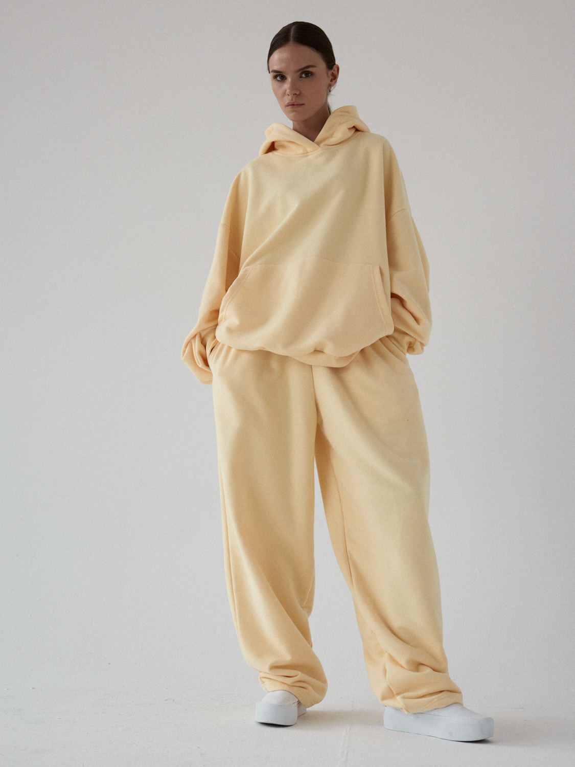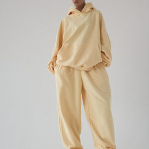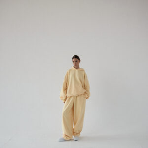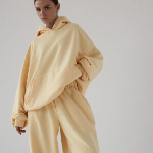 Spodnie dresowe o luźniejszym kroju z wysokim stanem i zaczepnie przydługimi nogawkami. Charakterystyczna dla tego modelu jest szeroka guma w pasie oraz proste nogawki swobodnie opadające na stopy. Model posiada funkcjonalne kieszenie po bokach. Razem z oversize’ową bluzą z kapturem LE PUMP stanowią zestaw doskonały.