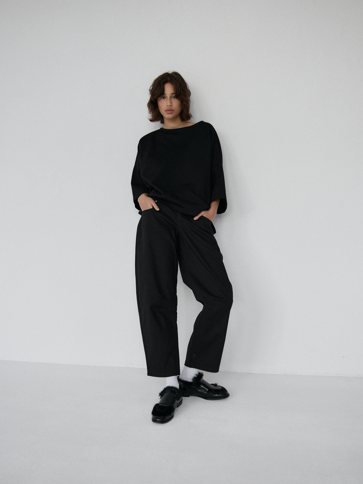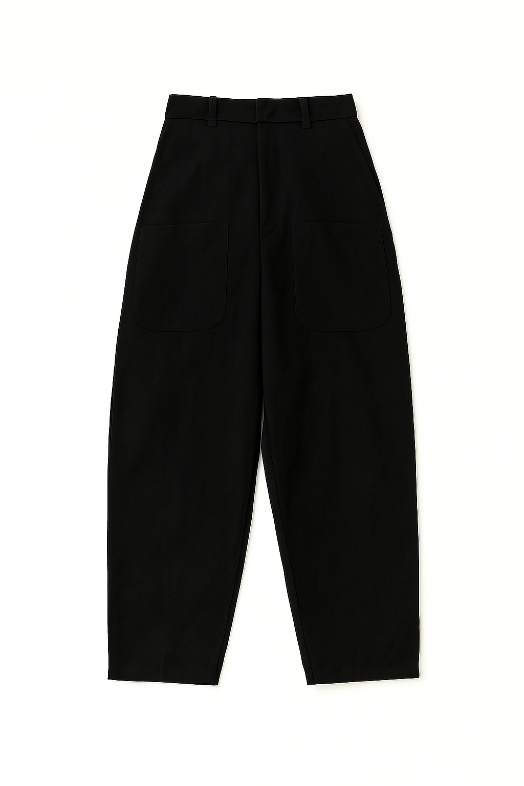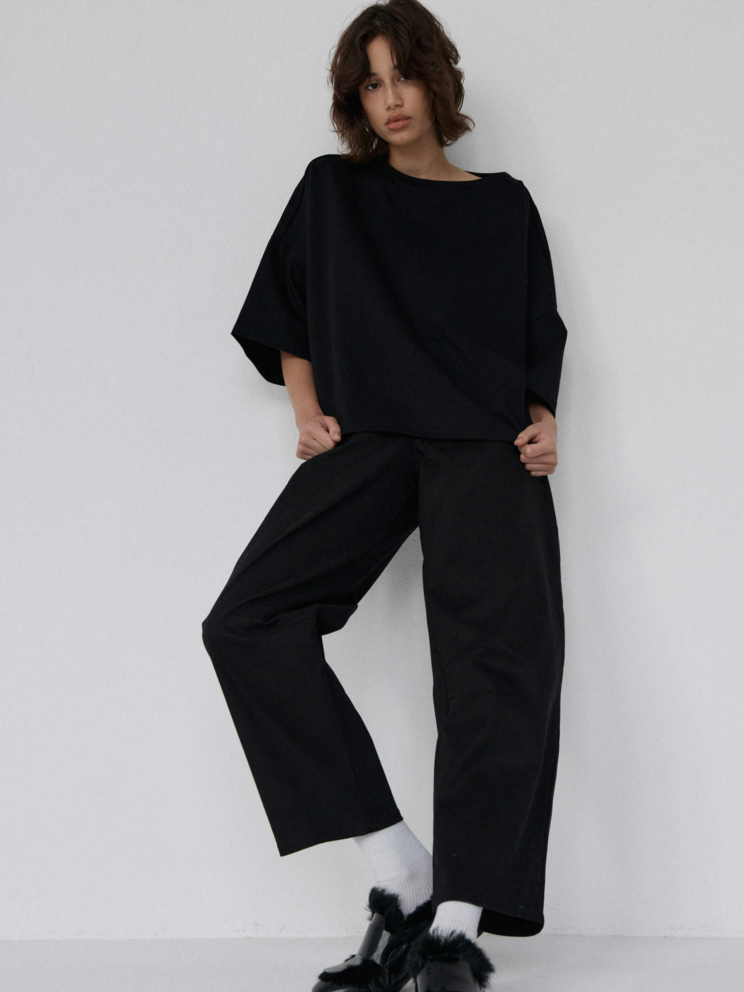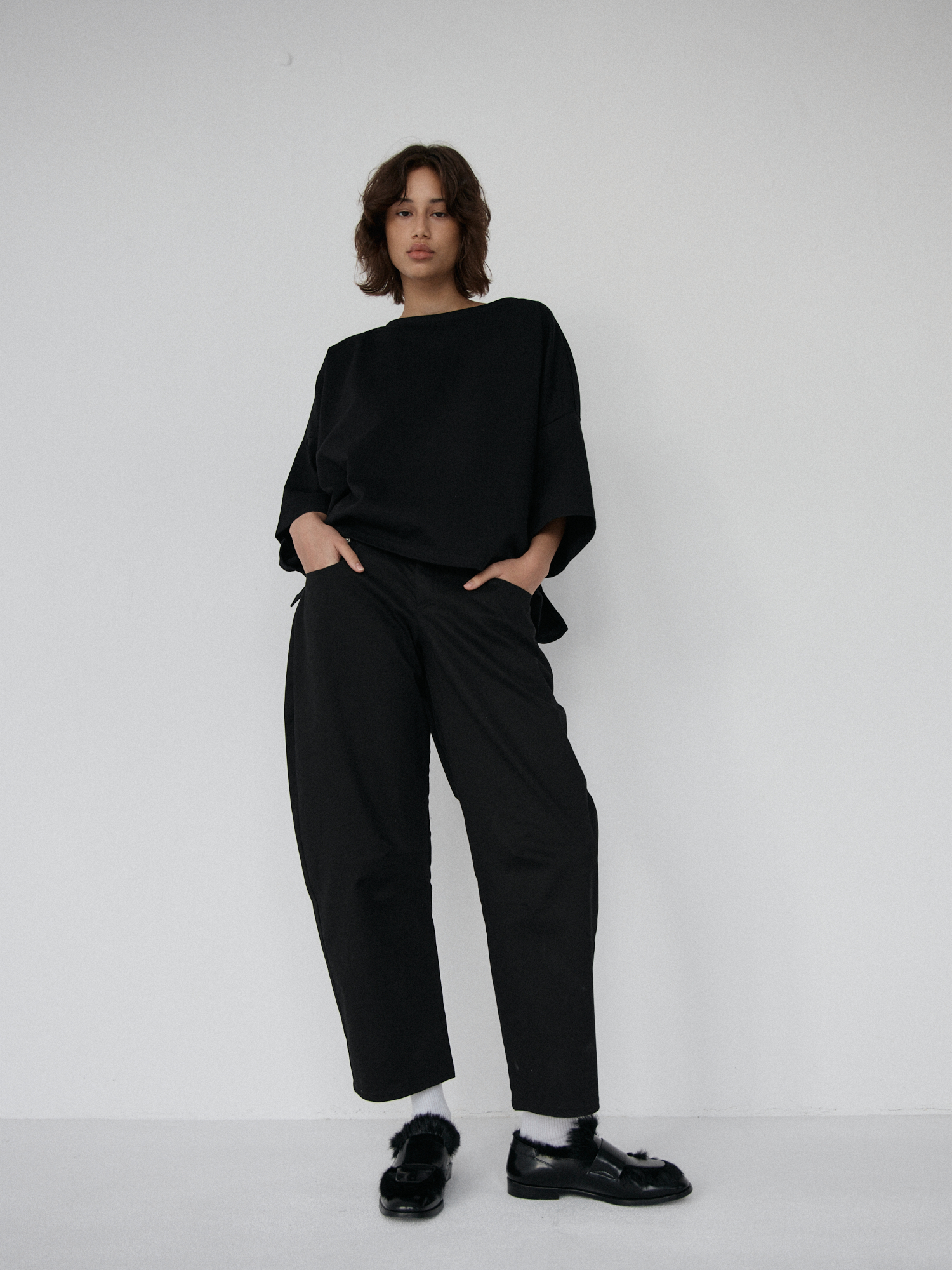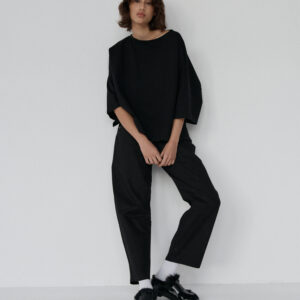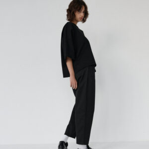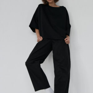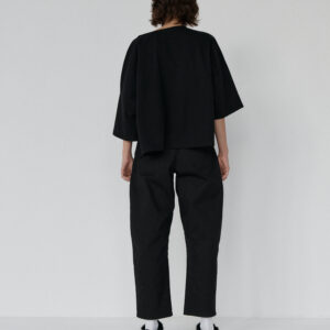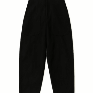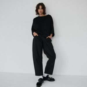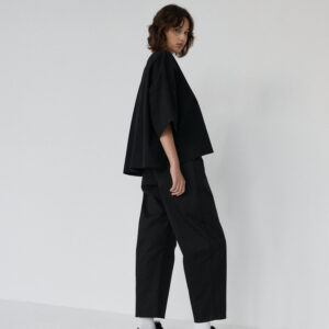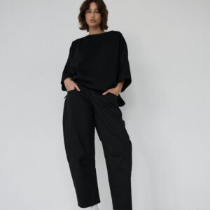 Spodnie typu balloon o luźnym, prostym kroju. Model posiada średni stan i nogawki przed kostkę. Wysoka gramatura bawełny sprawia, że spodnie trzymają formę, jednocześnie zapewniając komfort noszenia. Całości dopełniają funkcjonalne kieszenie oraz przeszycia na kolanach. Doskonale komponują się z oversize’ową koszulą czy dopasowanym topem.