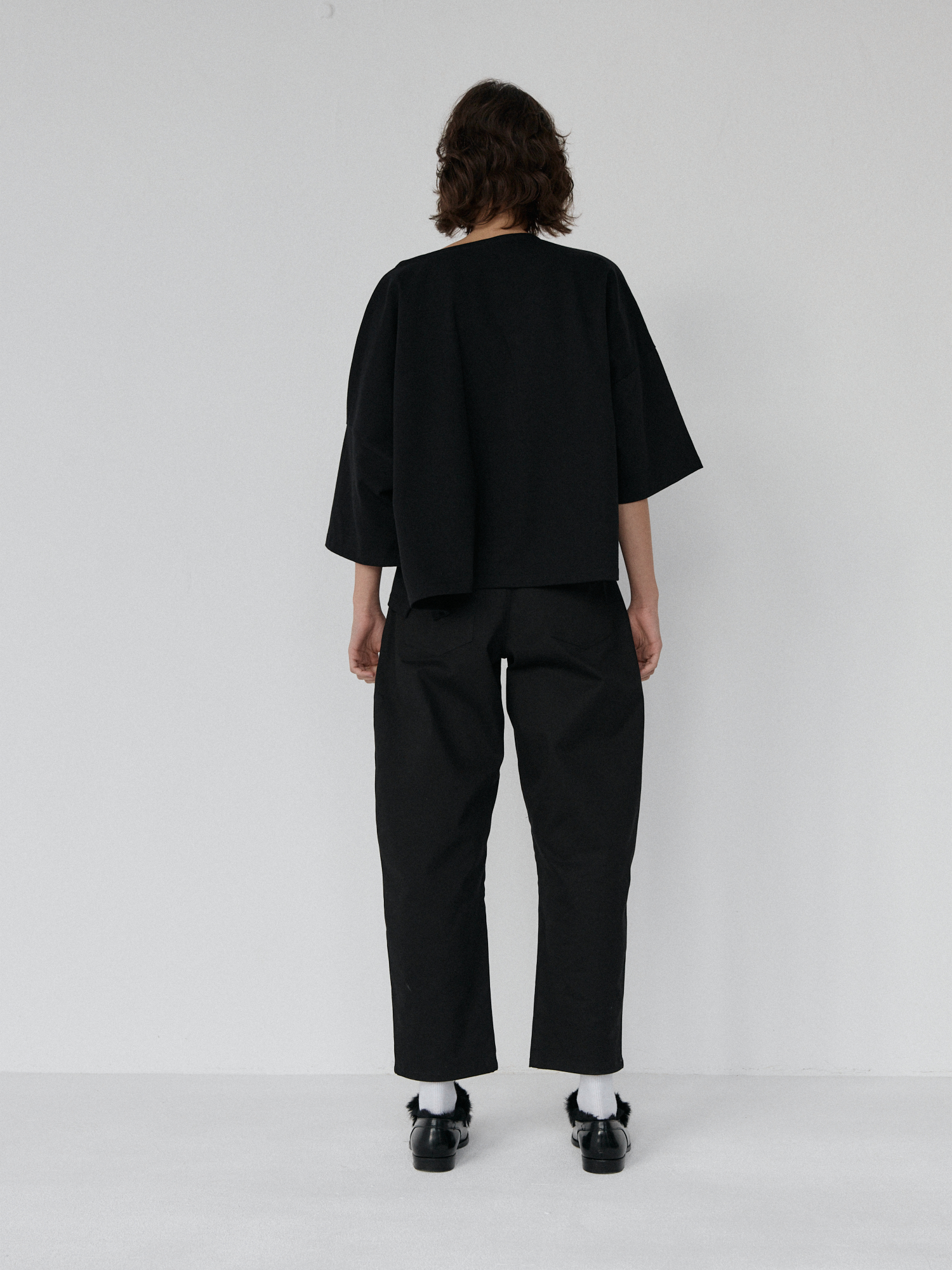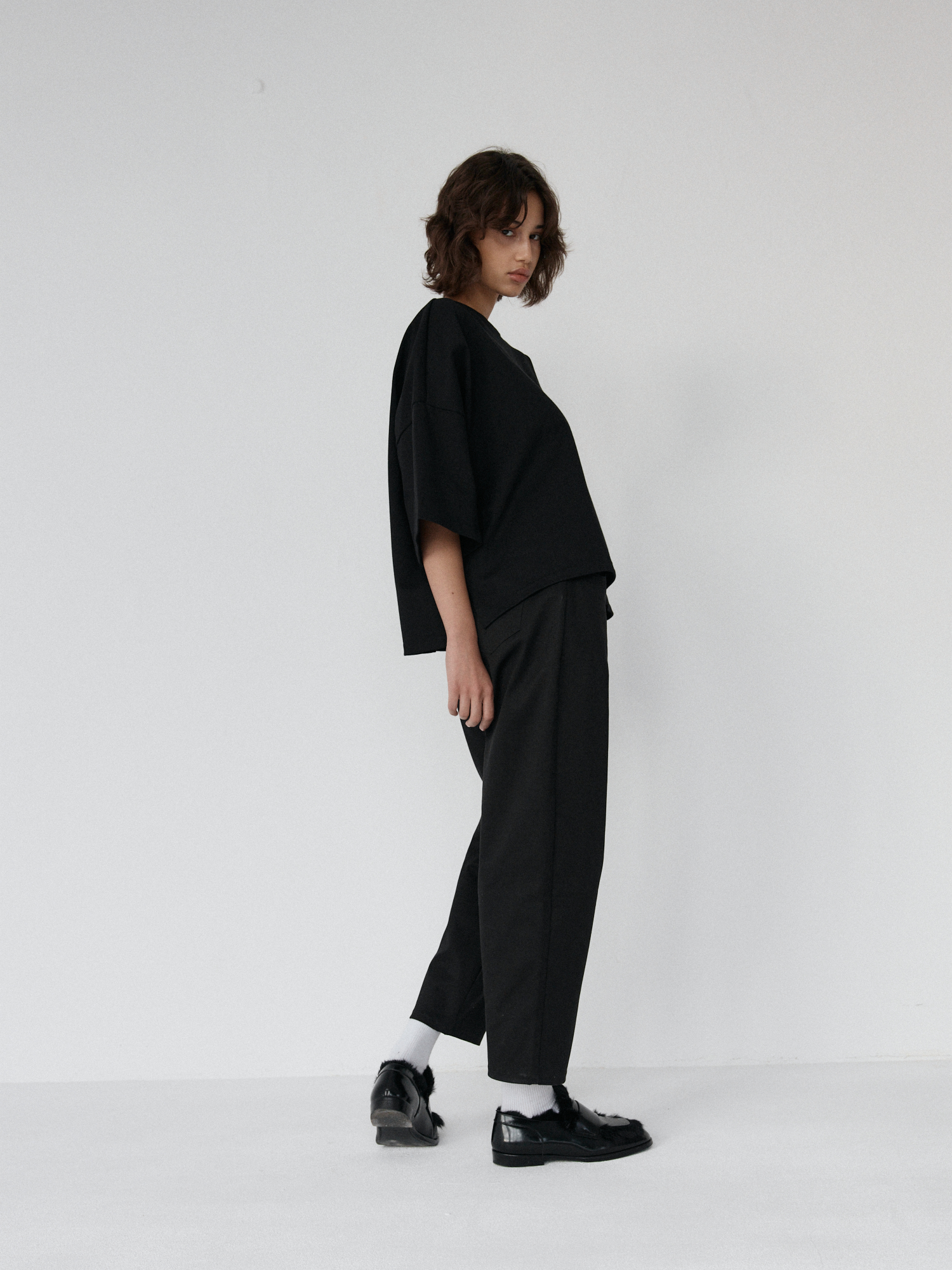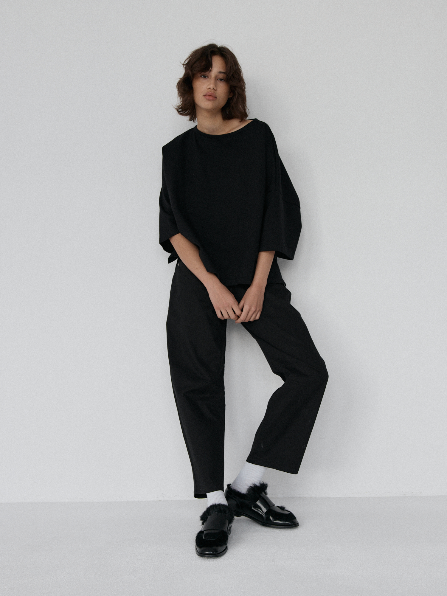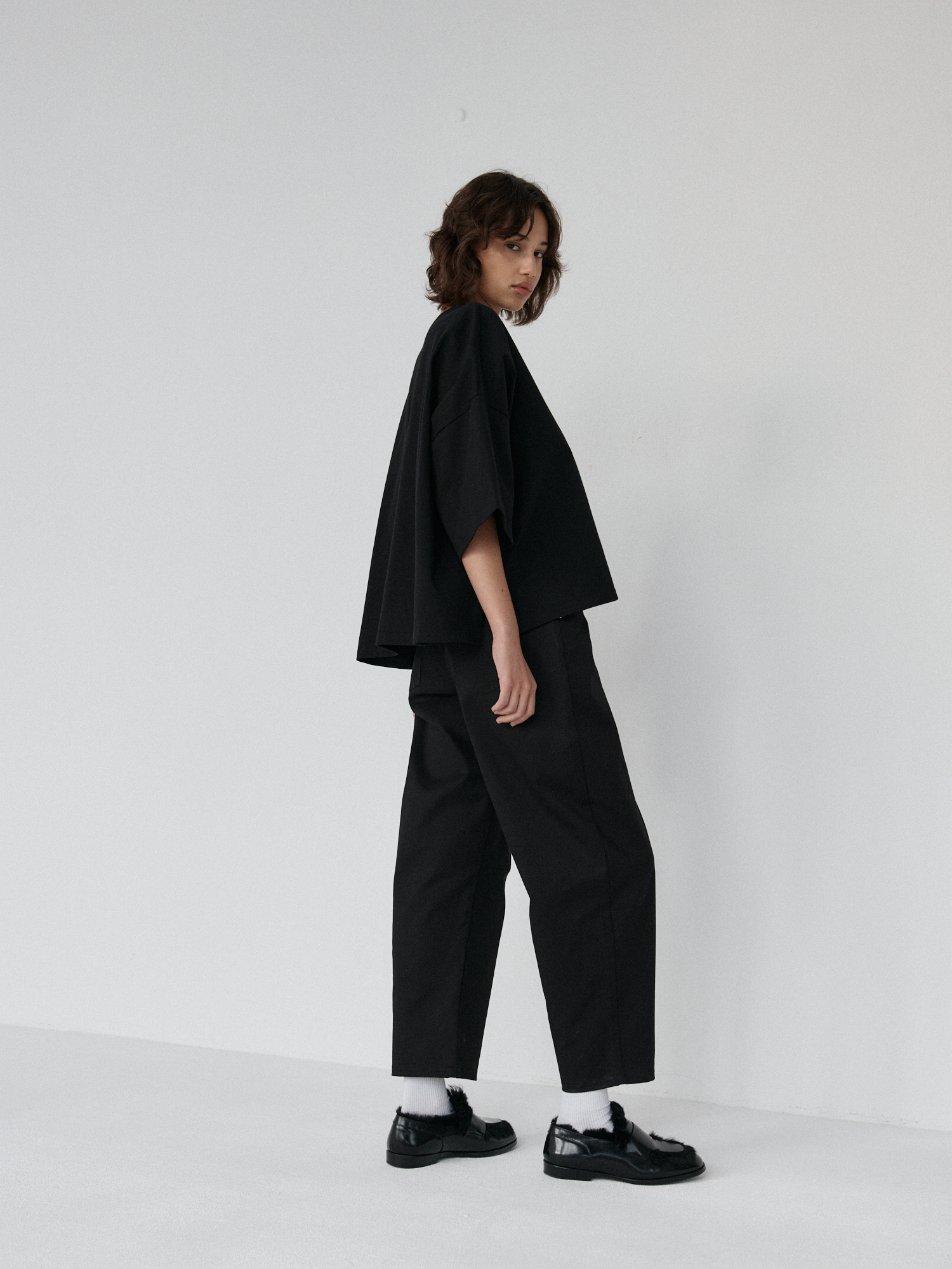 Spodnie typu balloon o luźnym, prostym kroju. Model posiada średni stan i nogawki przed kostkę. Wysoka gramatura bawełny sprawia, że spodnie trzymają formę, jednocześnie zapewniając komfort noszenia. Całości dopełniają funkcjonalne kieszenie oraz przeszycia na kolanach. Doskonale komponują się z oversize’ową koszulą czy dopasowanym topem.