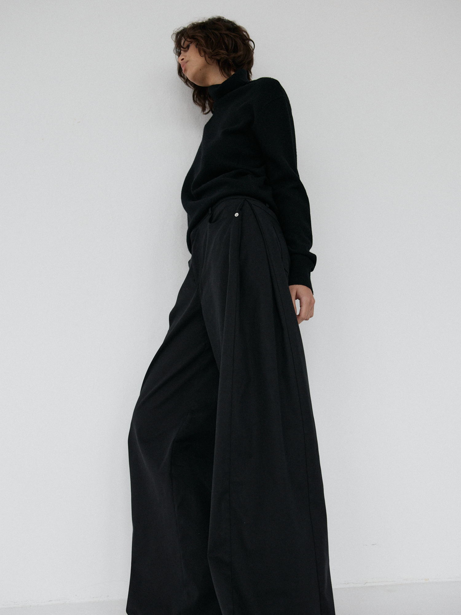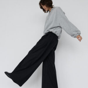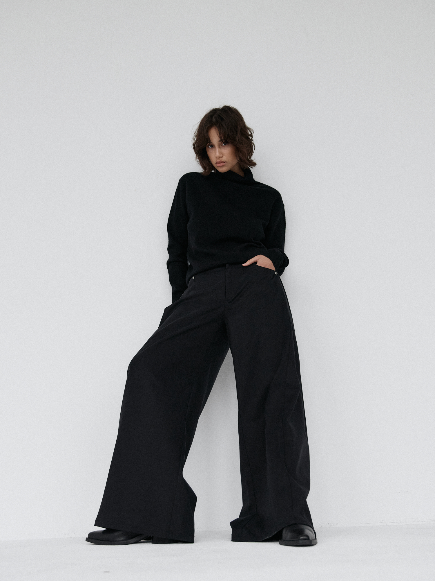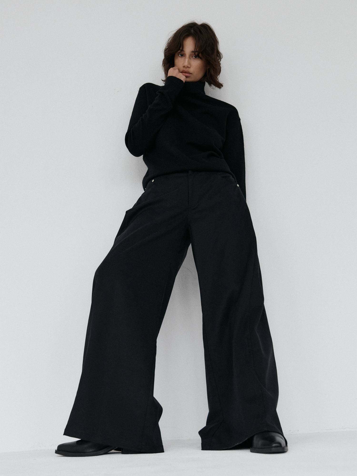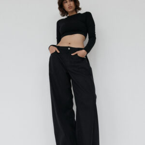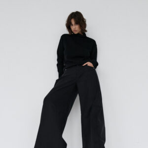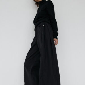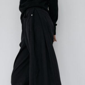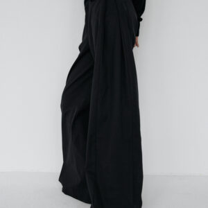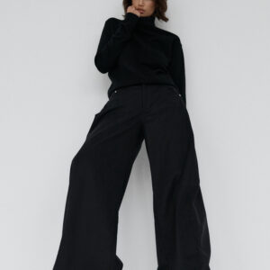 Spodnie o luźnym, ultra szerokim kroju typu wide leg. Model posiada średni stan oraz kontrafałdę z boku nogawki, która dodatkowo ją poszerza. Długie nogawki swobodnie opadają na stopy. Model posiada funkcjonalne kieszenie z przodu i z tyłu. Spodnie zapinane na zamek i guzik. Idealne zarówno do codziennych, jak i bardziej eleganckich stylizacji — świetnie wyglądają z oversize’owym swetrem, koszulą czy dopasowanym topem.