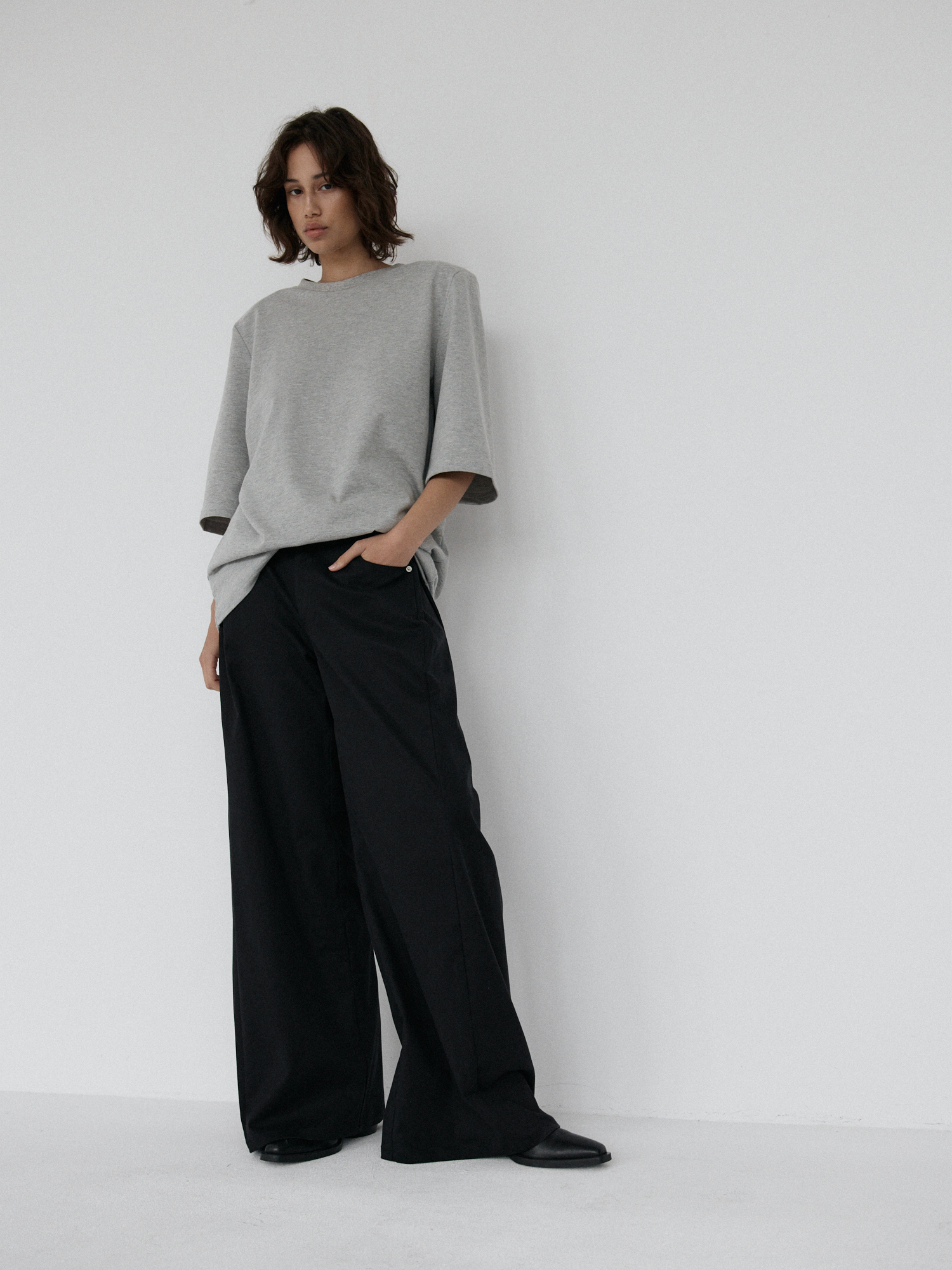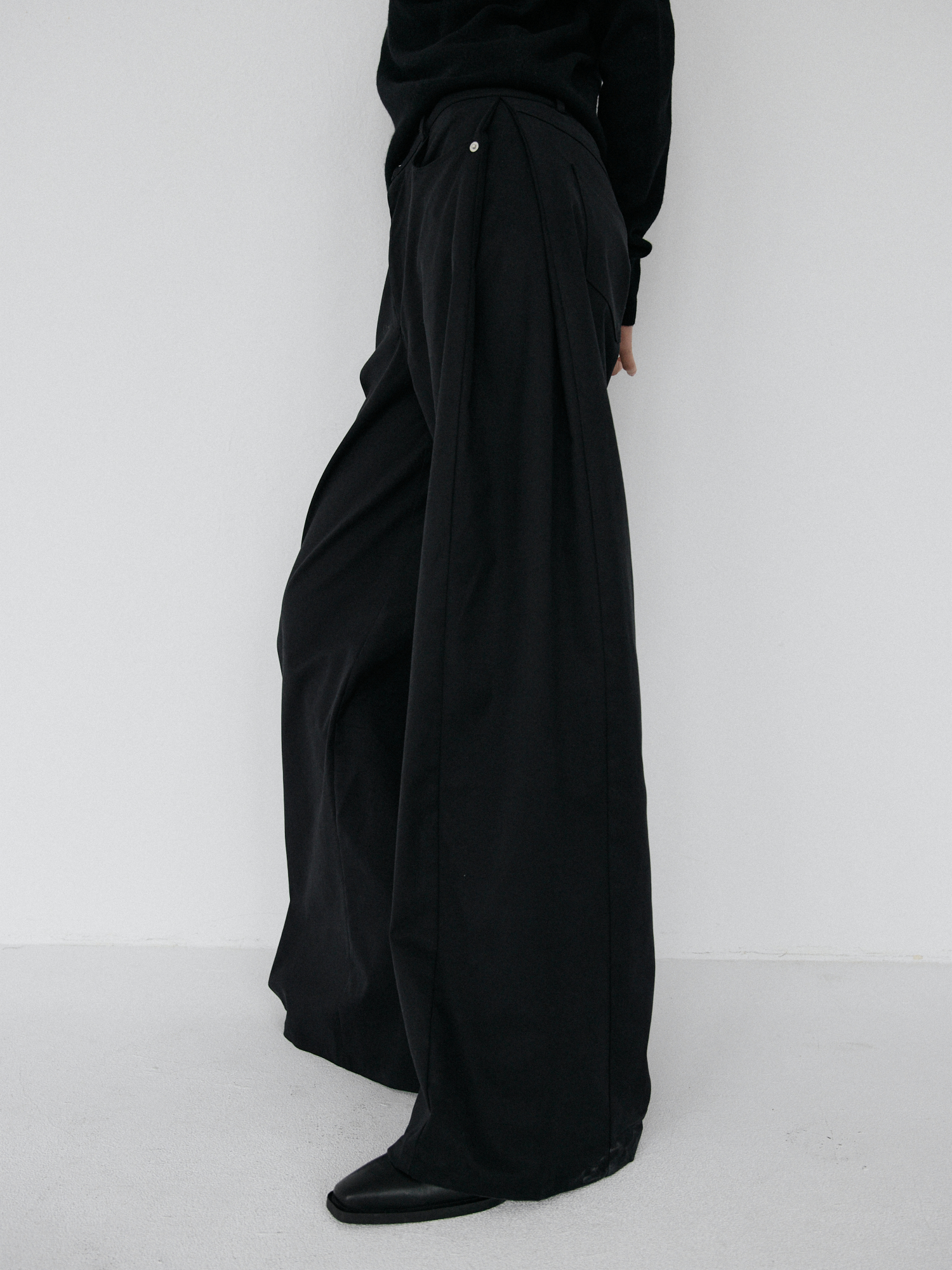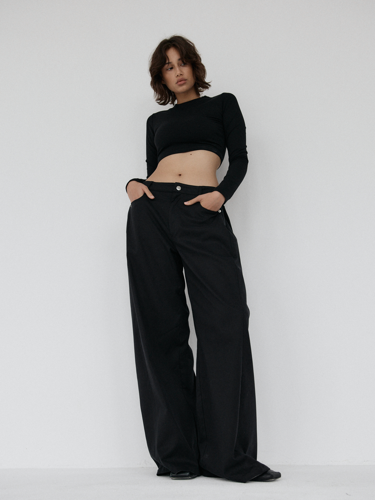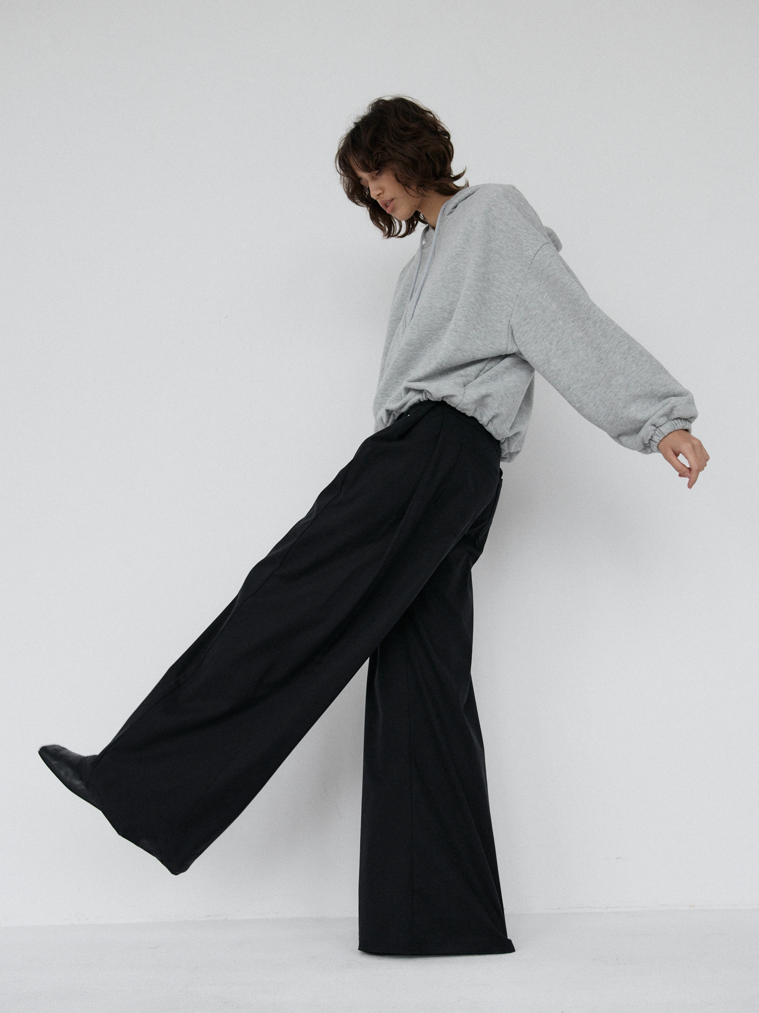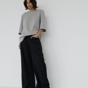 Spodnie o luźnym, ultra szerokim kroju typu wide leg. Model posiada średni stan oraz kontrafałdę z boku nogawki, która dodatkowo ją poszerza. Długie nogawki swobodnie opadają na stopy. Model posiada funkcjonalne kieszenie z przodu i z tyłu. Spodnie zapinane na zamek i guzik. Idealne zarówno do codziennych, jak i bardziej eleganckich stylizacji — świetnie wyglądają z oversize’owym swetrem, koszulą czy dopasowanym topem.