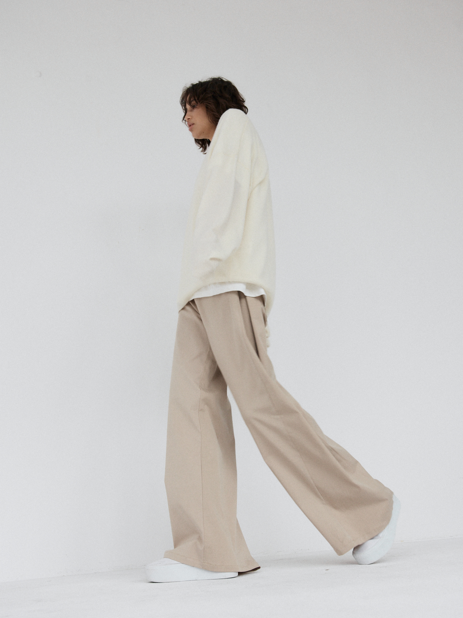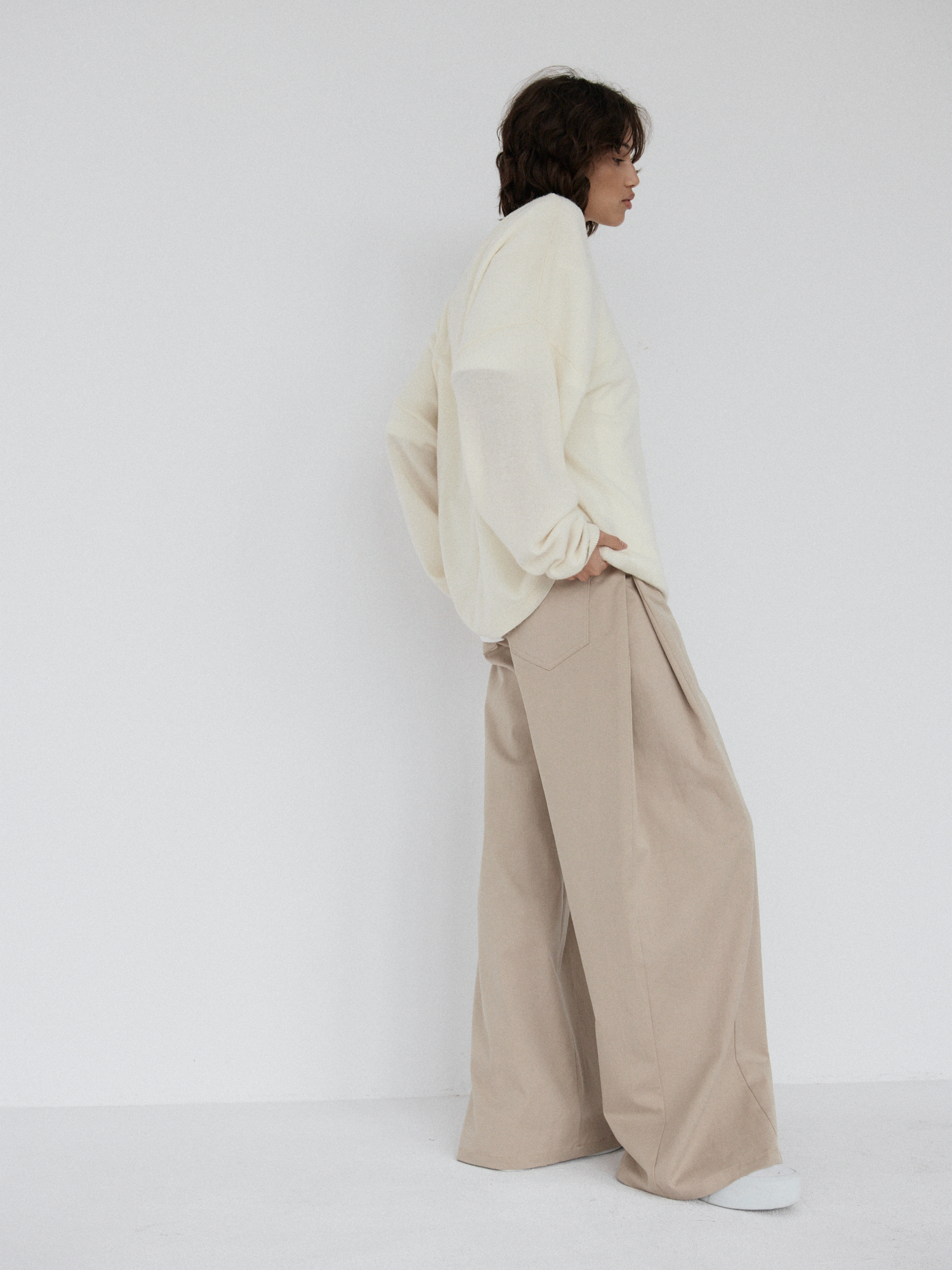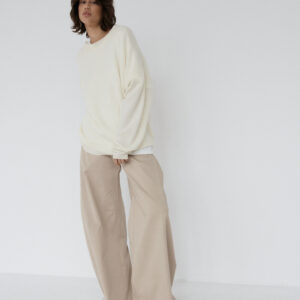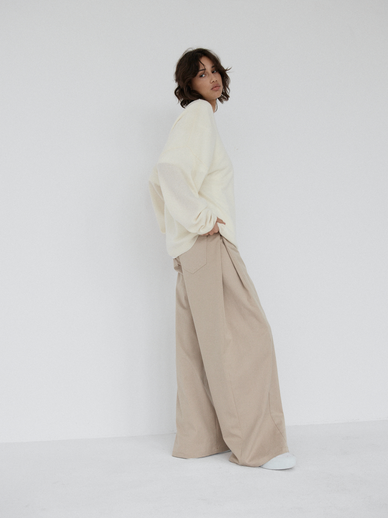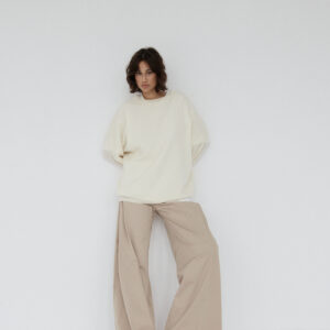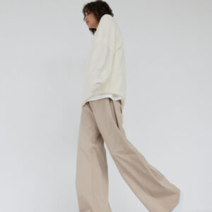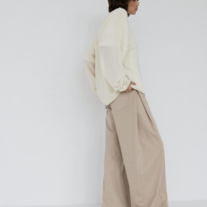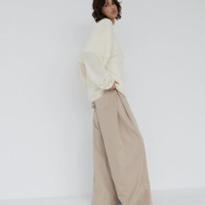 Spodnie o luźnym, ultra szerokim kroju typu wide leg. Model posiada średni stan oraz kontrafałdę z boku nogawki, która dodatkowo ją poszerza. Długie nogawki swobodnie opadają na stopy. Model posiada funkcjonalne kieszenie z przodu i z tyłu. Spodnie zapinane na zamek i guzik. Idealne zarówno do codziennych, jak i bardziej eleganckich stylizacji — świetnie wyglądają z oversize’owym swetrem, koszulą czy dopasowanym topem.