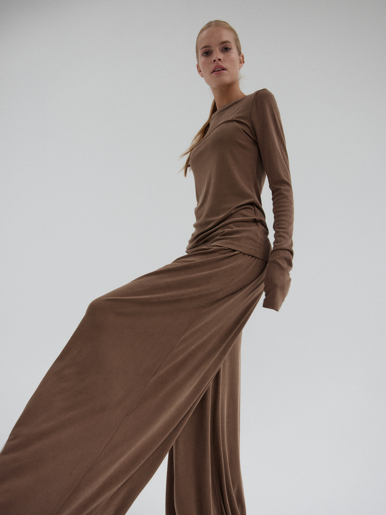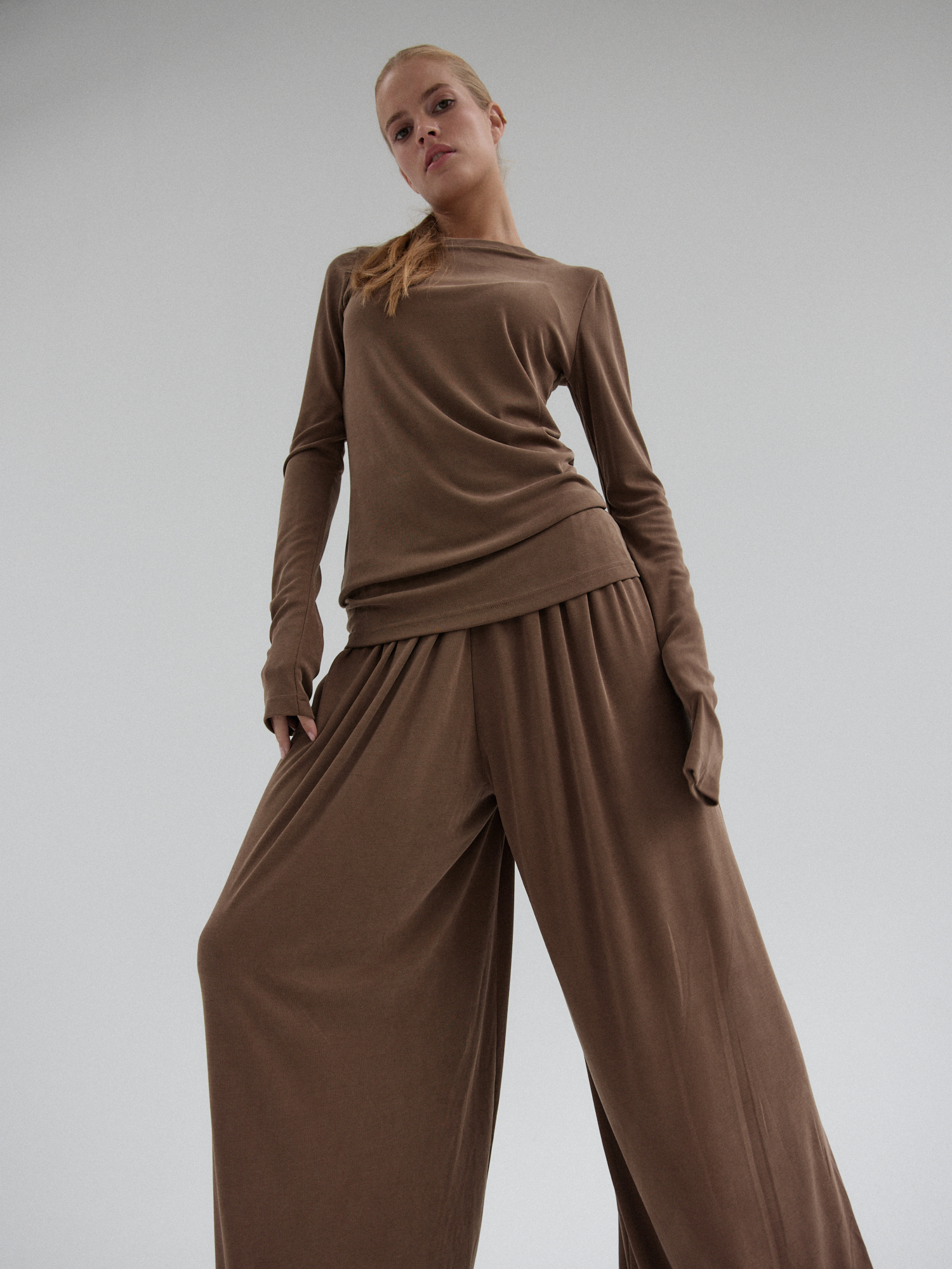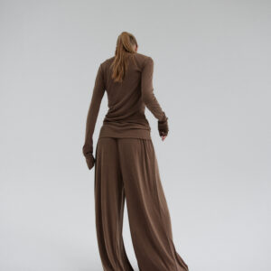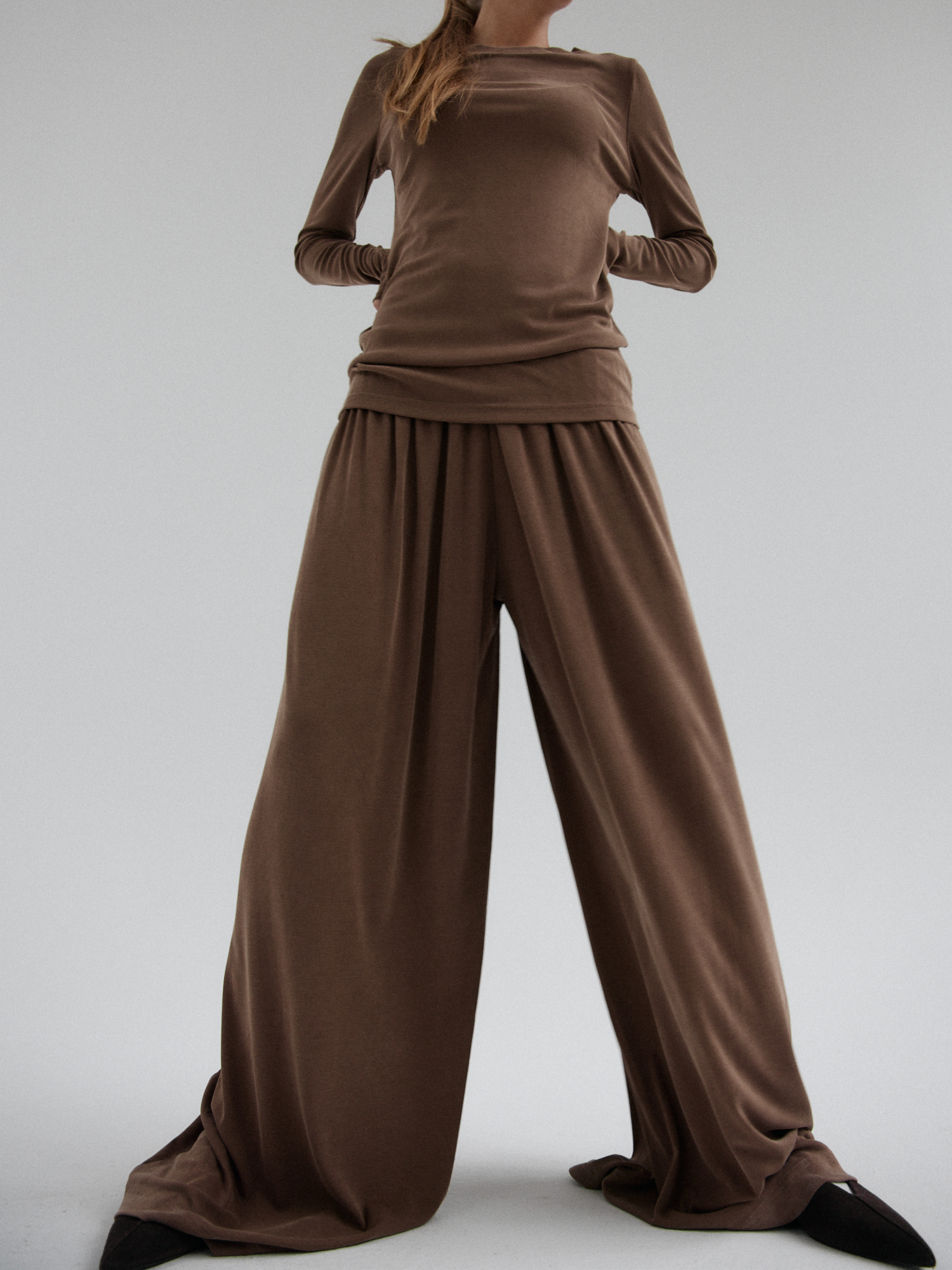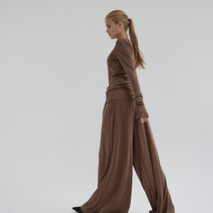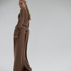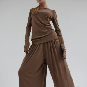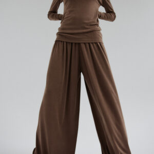 Minimalistyczne spodnie o kroju wide leg, które zachwycają płynnością i lekkością materiału. Wykonane z niezwykle miękkiej i elastycznej dzianiny, pięknie układają się przy każdym ruchu, tworząc nowoczesną, a zarazem komfortową sylwetkę. Model posiada szerokie nogawki oraz elastyczną talię zapewniającą wygodę noszenia i dopasowanie do sylwetki. Spodnie najlepiej wyglądają w zestawieniu z naszym longsleevem CIEO w tym samym odcieniu.