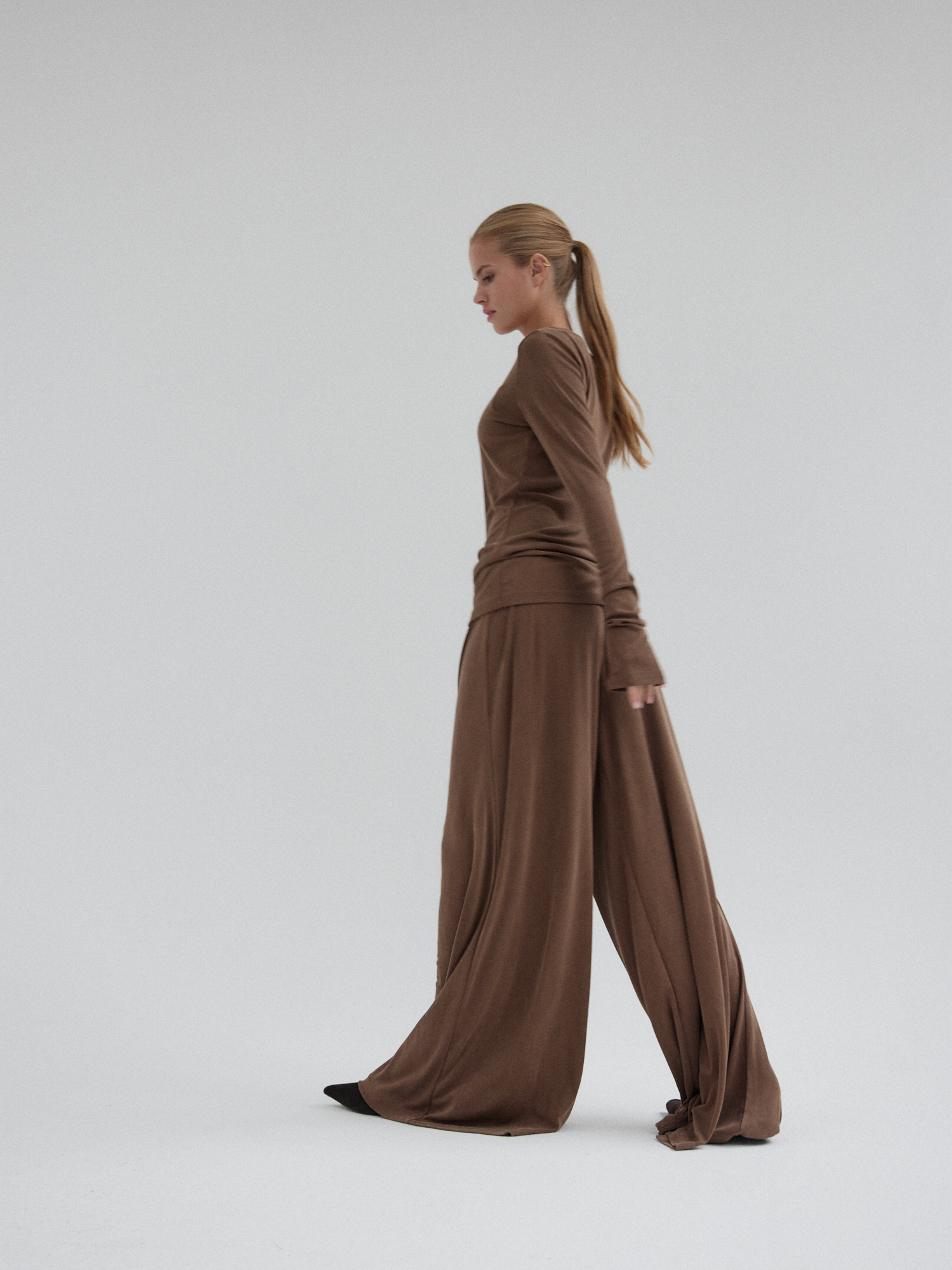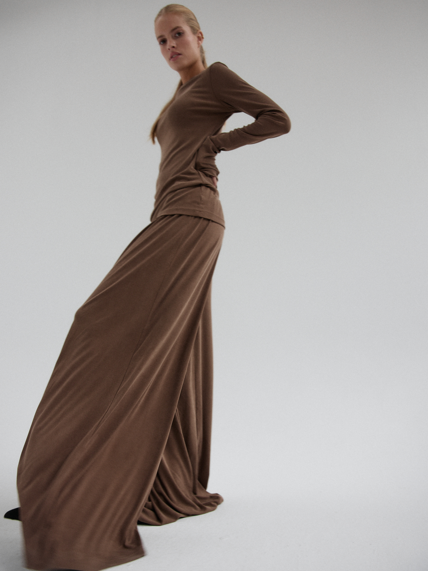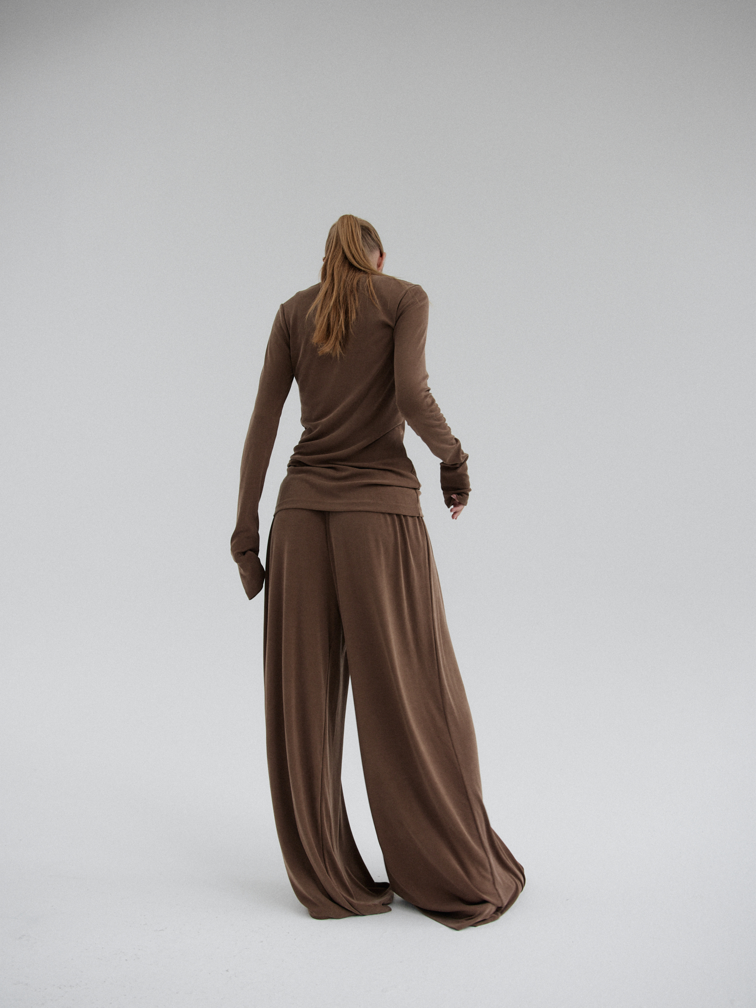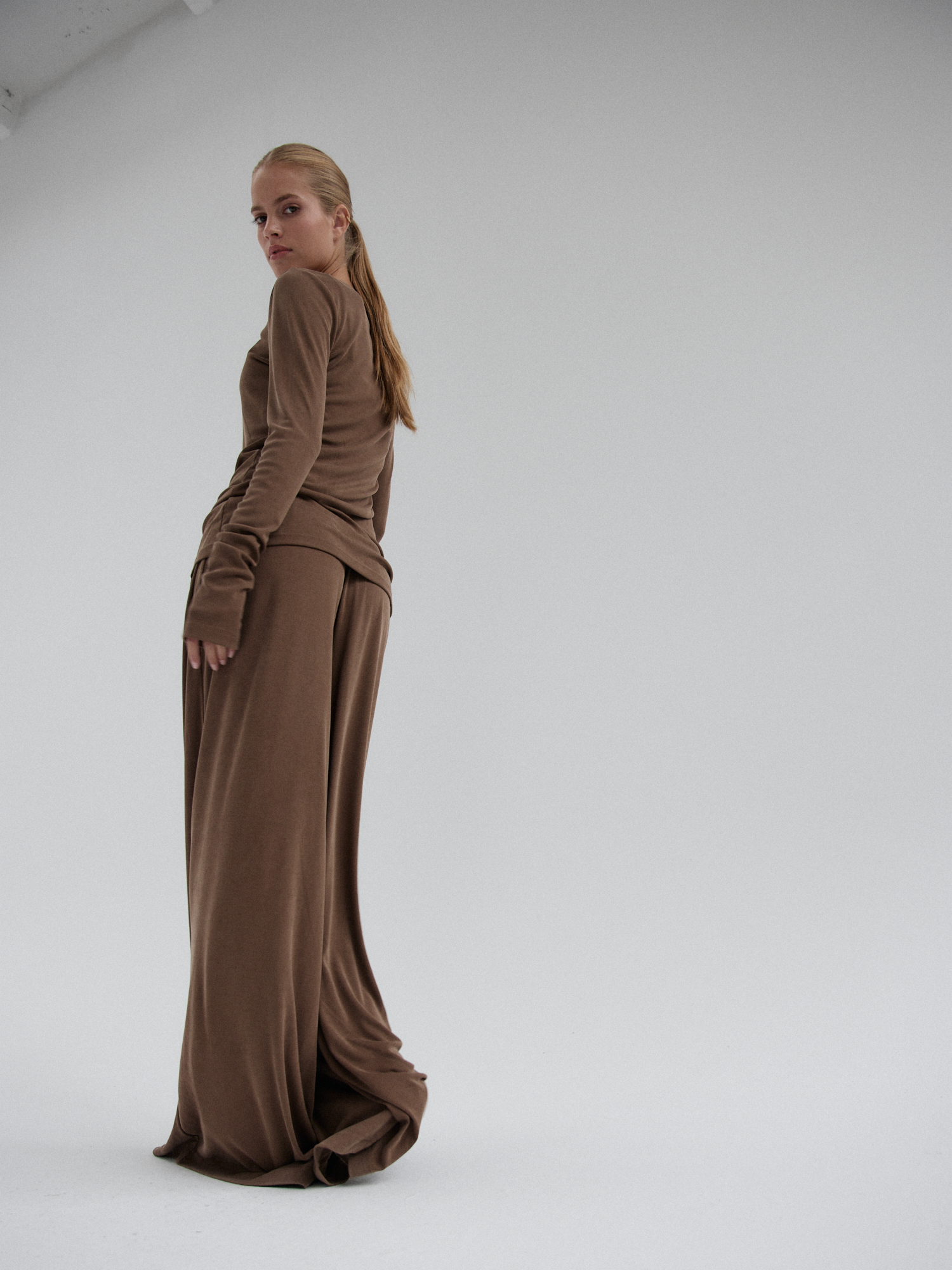 Minimalistyczne spodnie o kroju wide leg, które zachwycają płynnością i lekkością materiału. Wykonane z niezwykle miękkiej i elastycznej dzianiny, pięknie układają się przy każdym ruchu, tworząc nowoczesną, a zarazem komfortową sylwetkę. Model posiada szerokie nogawki oraz elastyczną talię zapewniającą wygodę noszenia i dopasowanie do sylwetki. Spodnie najlepiej wyglądają w zestawieniu z naszym longsleevem CIEO w tym samym odcieniu.