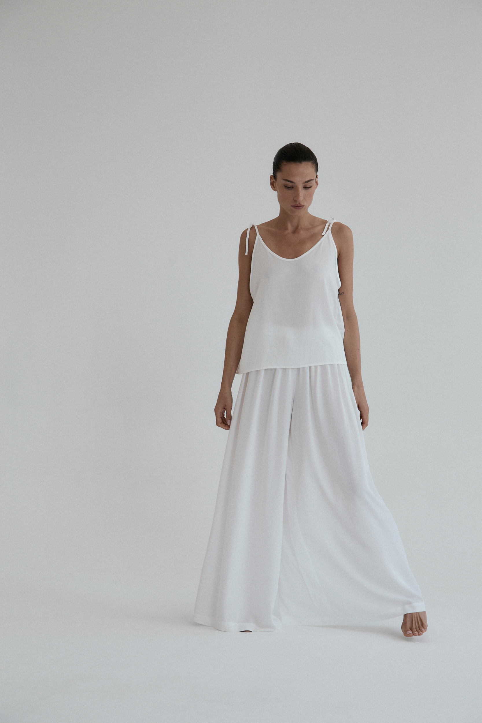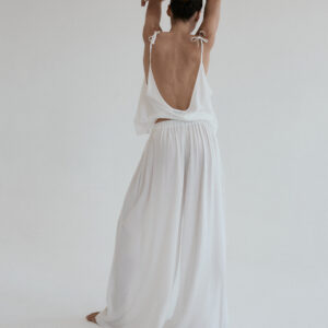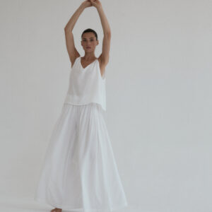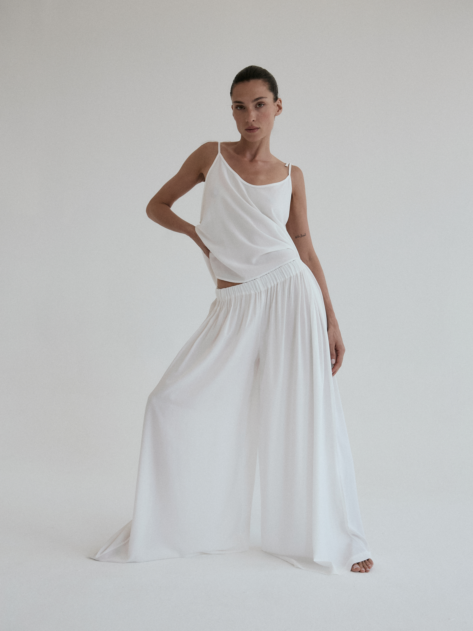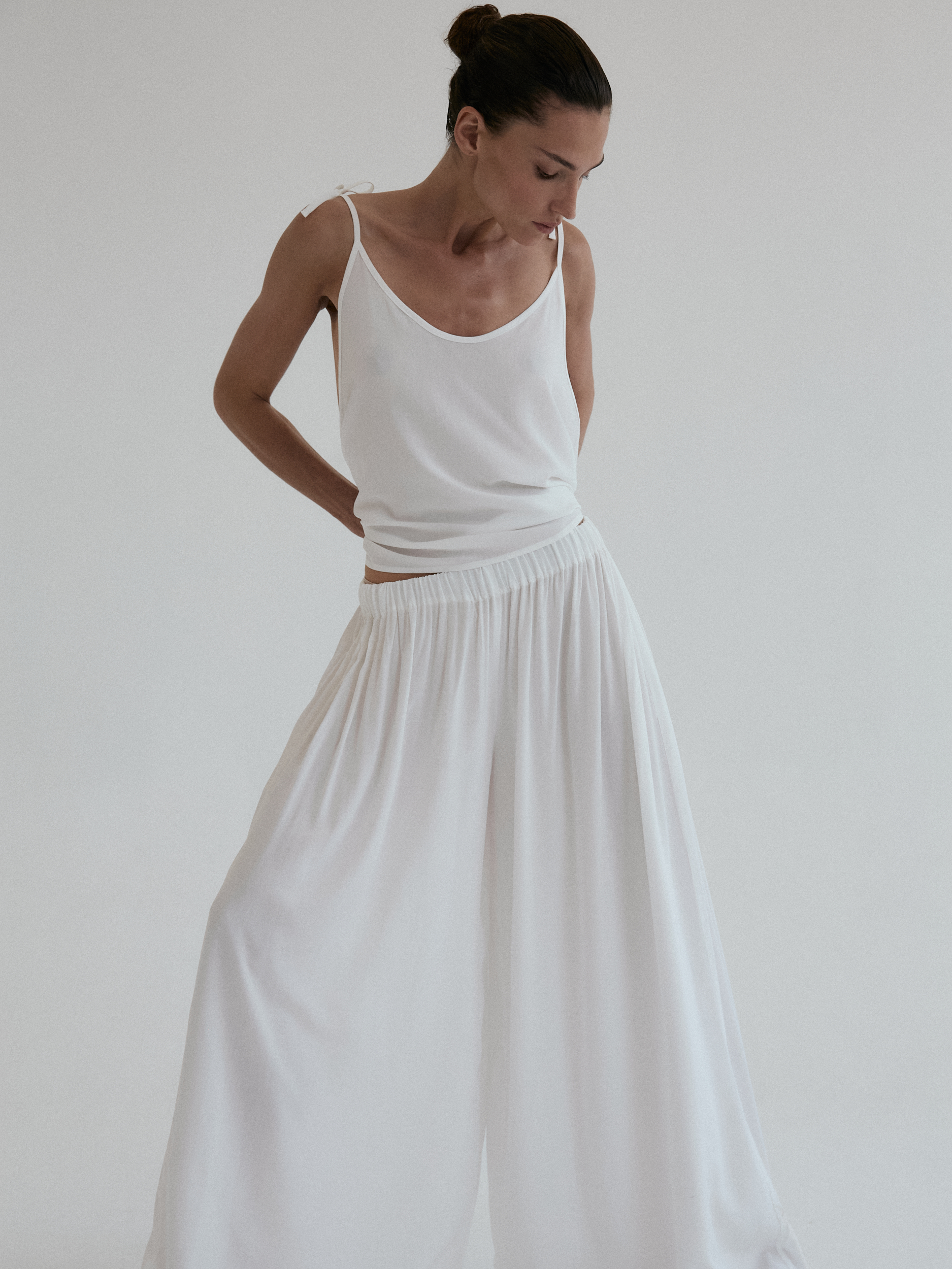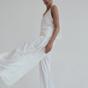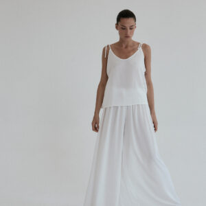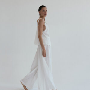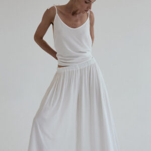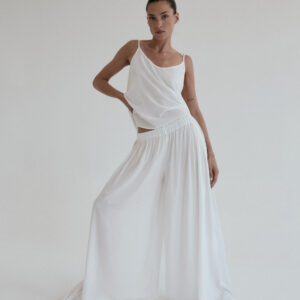 Szerokie spodnie o luźnym kroju. Długość do kostek. W pasie wszyta delikatnie opinająca talię gumka. Idealnie sprawdzi się w zestawie z koszulką DUE w tym samym odcieniu. Lejący materiał świetnie się układa oraz zapewnia swobodę ruchu.