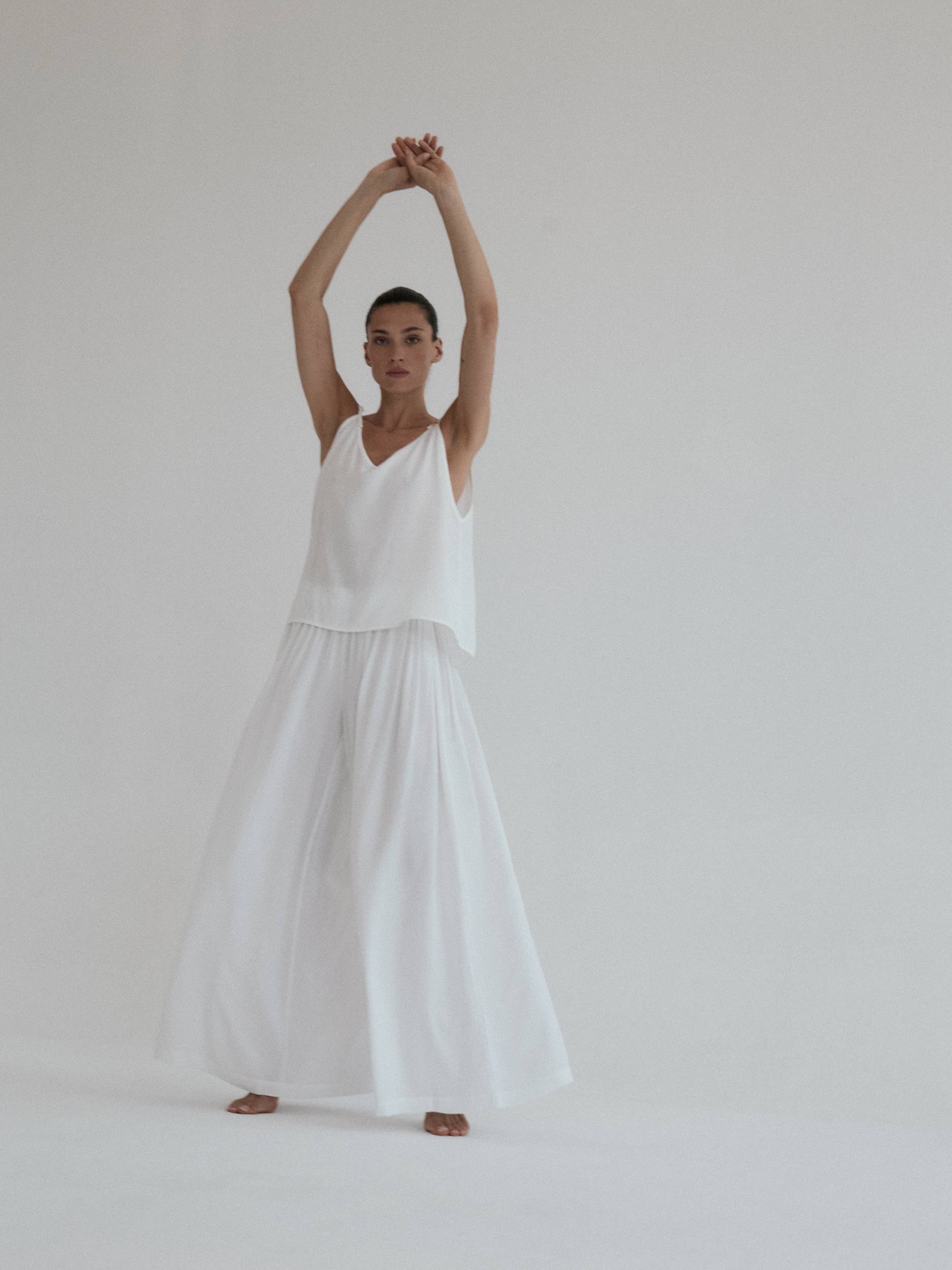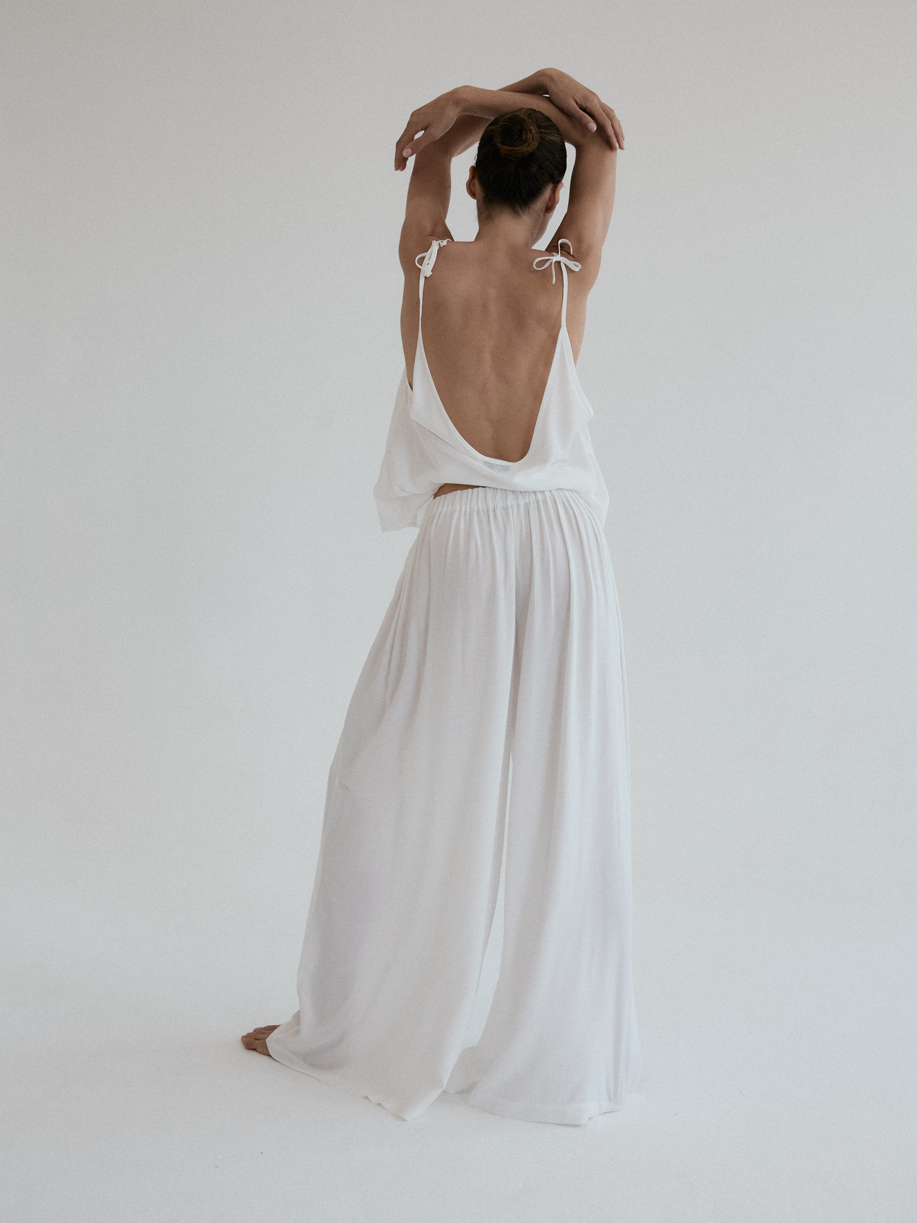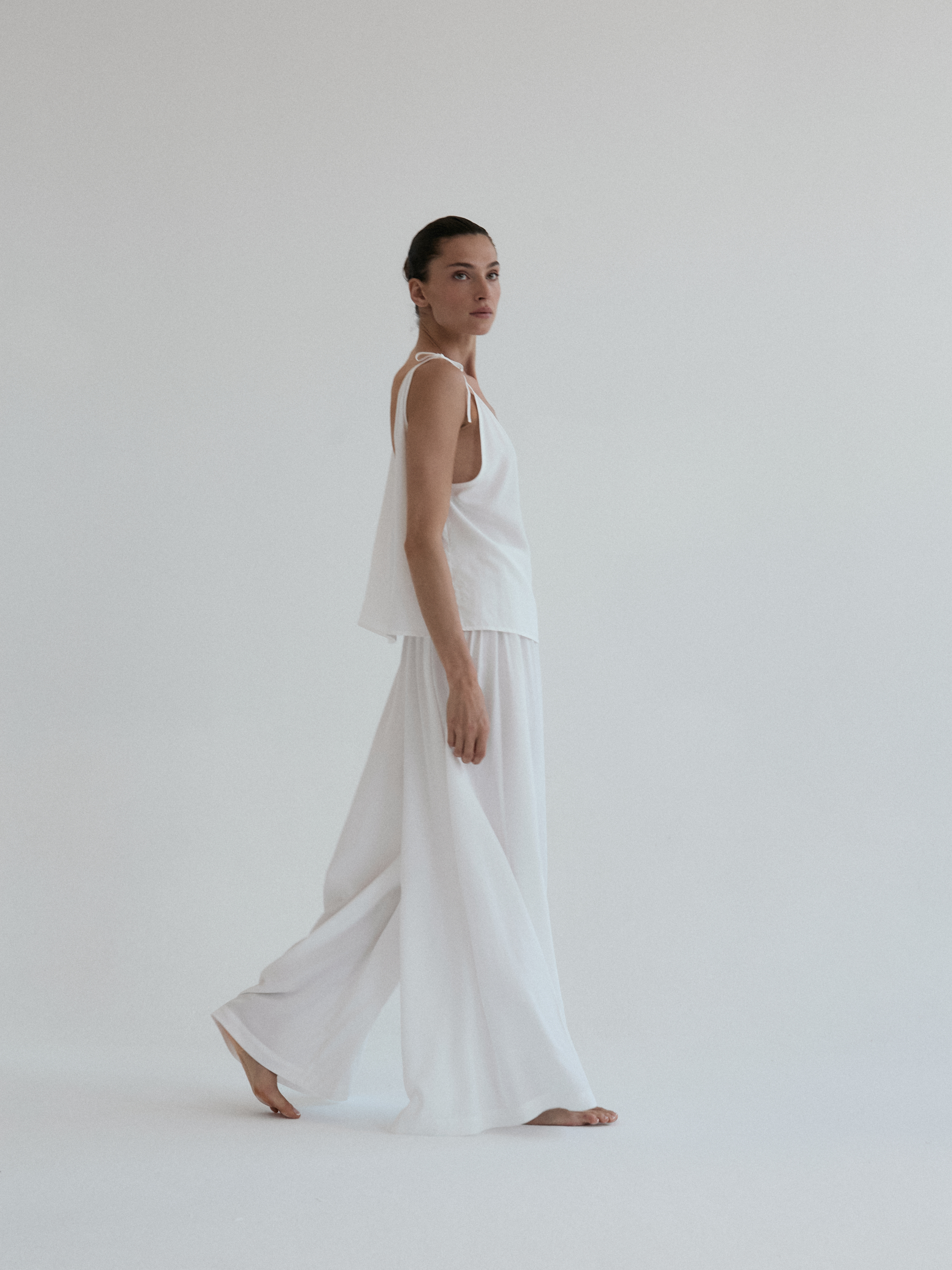 Szerokie spodnie o luźnym kroju. Długość do kostek. W pasie wszyta delikatnie opinająca talię gumka. Idealnie sprawdzi się w zestawie z koszulką DUE w tym samym odcieniu. Lejący materiał świetnie się układa oraz zapewnia swobodę ruchu.