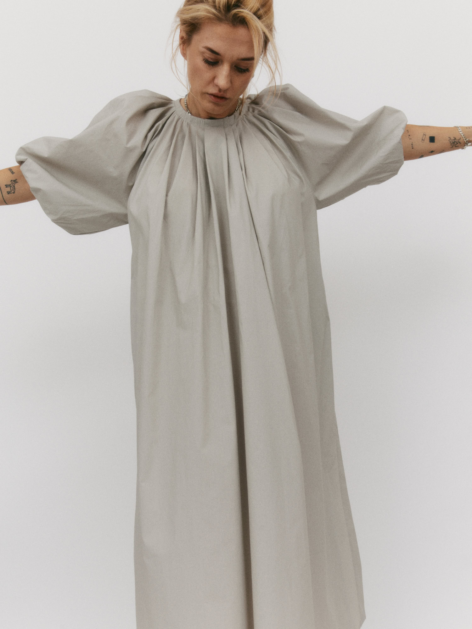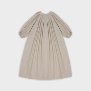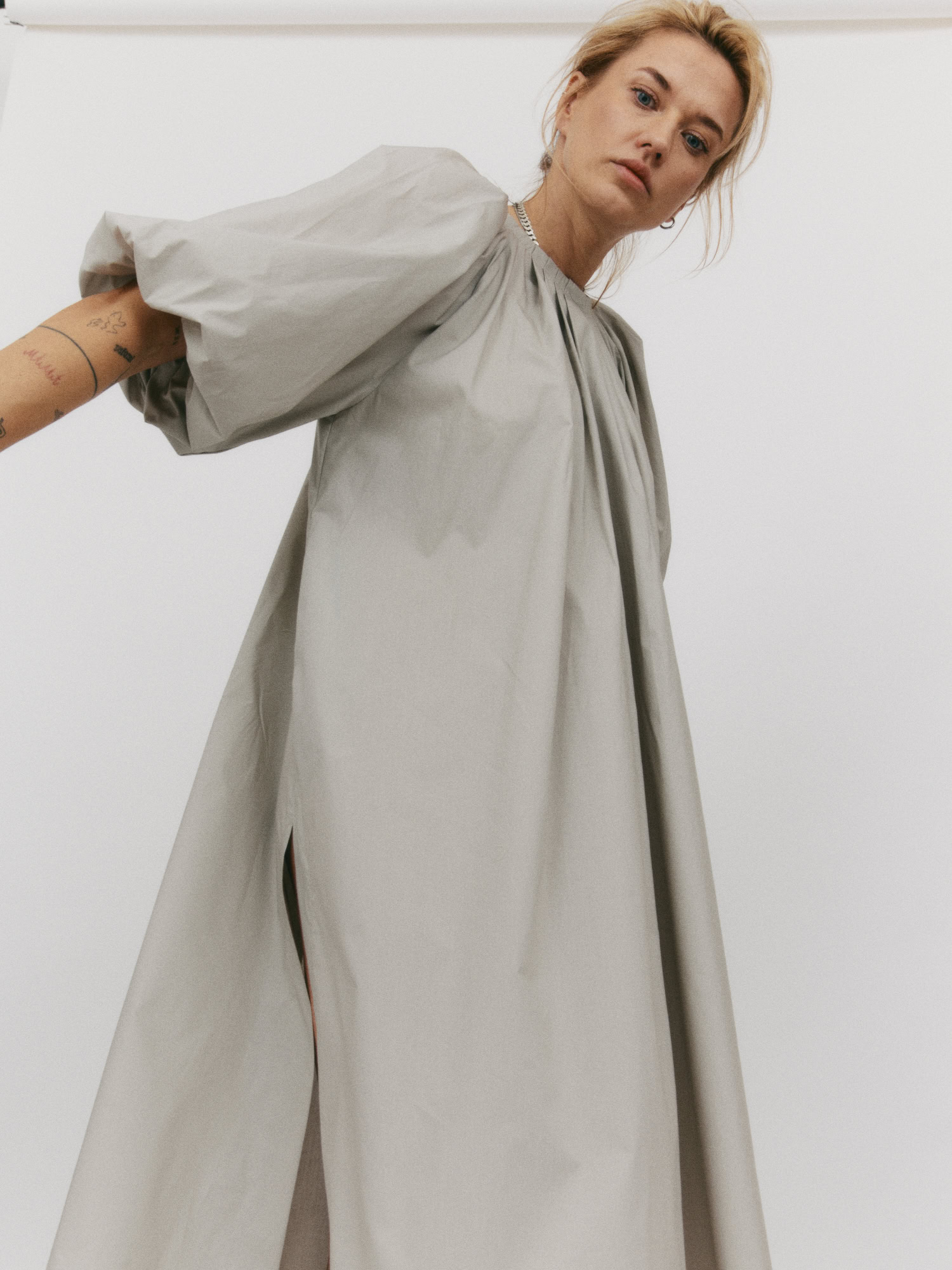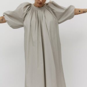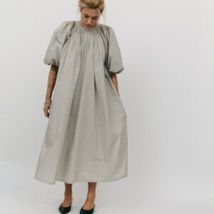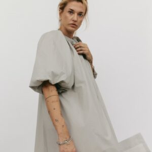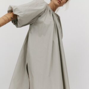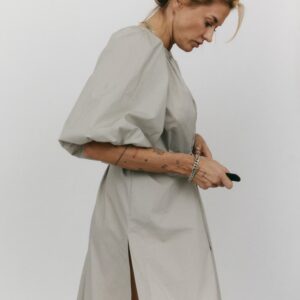 Długa sukienka do połowy łydki z rozcięciem na boku. Bufiaste rękawy o długości ¾ wykończone gumką z możliwością podwinięcia, które stanowią ciekawe przełamanie prostej, klasycznej formy. Oversize’owy, luźny krój pozwala ukryć mankamenty sylwetki. Zabudowany dekolt dopełnia całości. Idealna na każdą okazję – sprawdzi się zarówno na co dzień, jak i wieczorne wyjście.