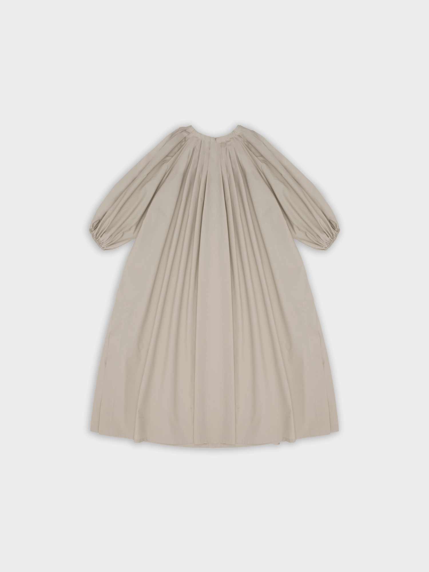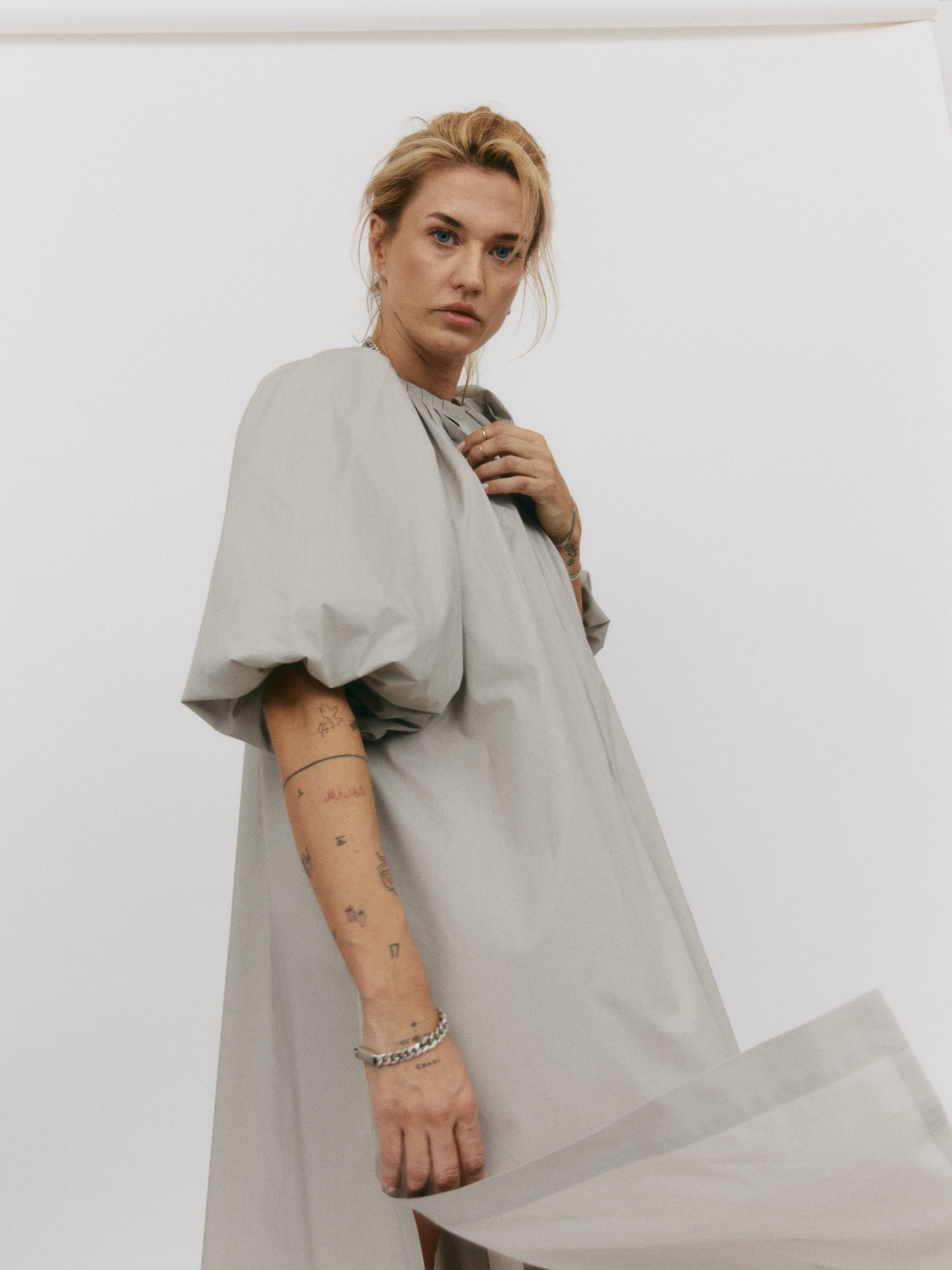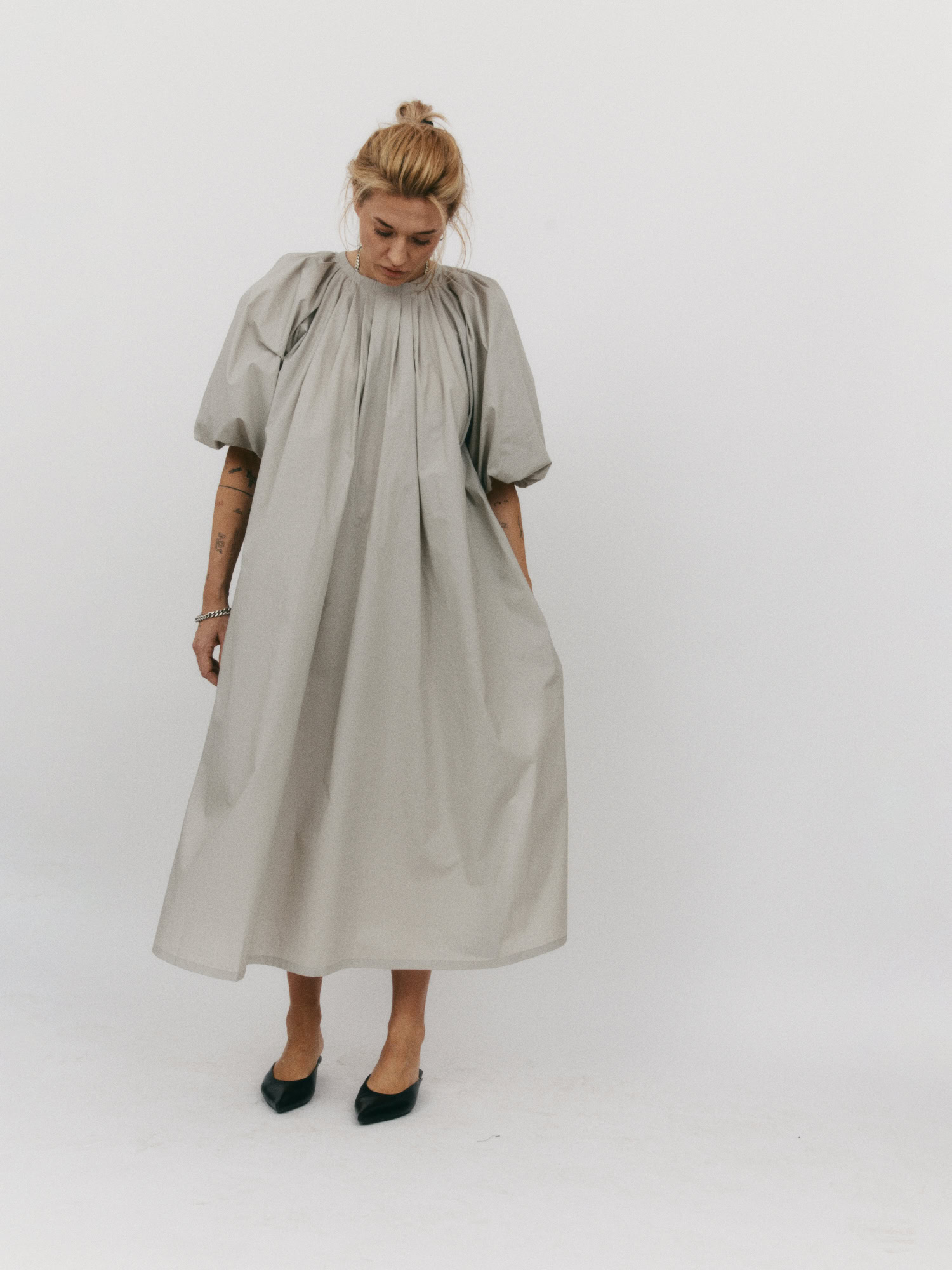 Długa sukienka do połowy łydki z rozcięciem na boku. Bufiaste rękawy o długości ¾ wykończone gumką z możliwością podwinięcia, które stanowią ciekawe przełamanie prostej, klasycznej formy. Oversize’owy, luźny krój pozwala ukryć mankamenty sylwetki. Zabudowany dekolt dopełnia całości. Idealna na każdą okazję – sprawdzi się zarówno na co dzień, jak i wieczorne wyjście.