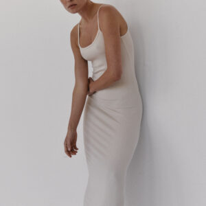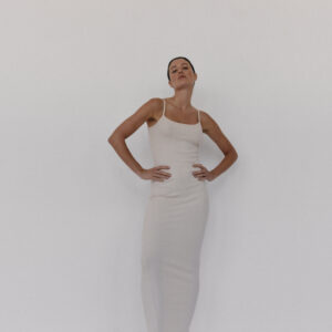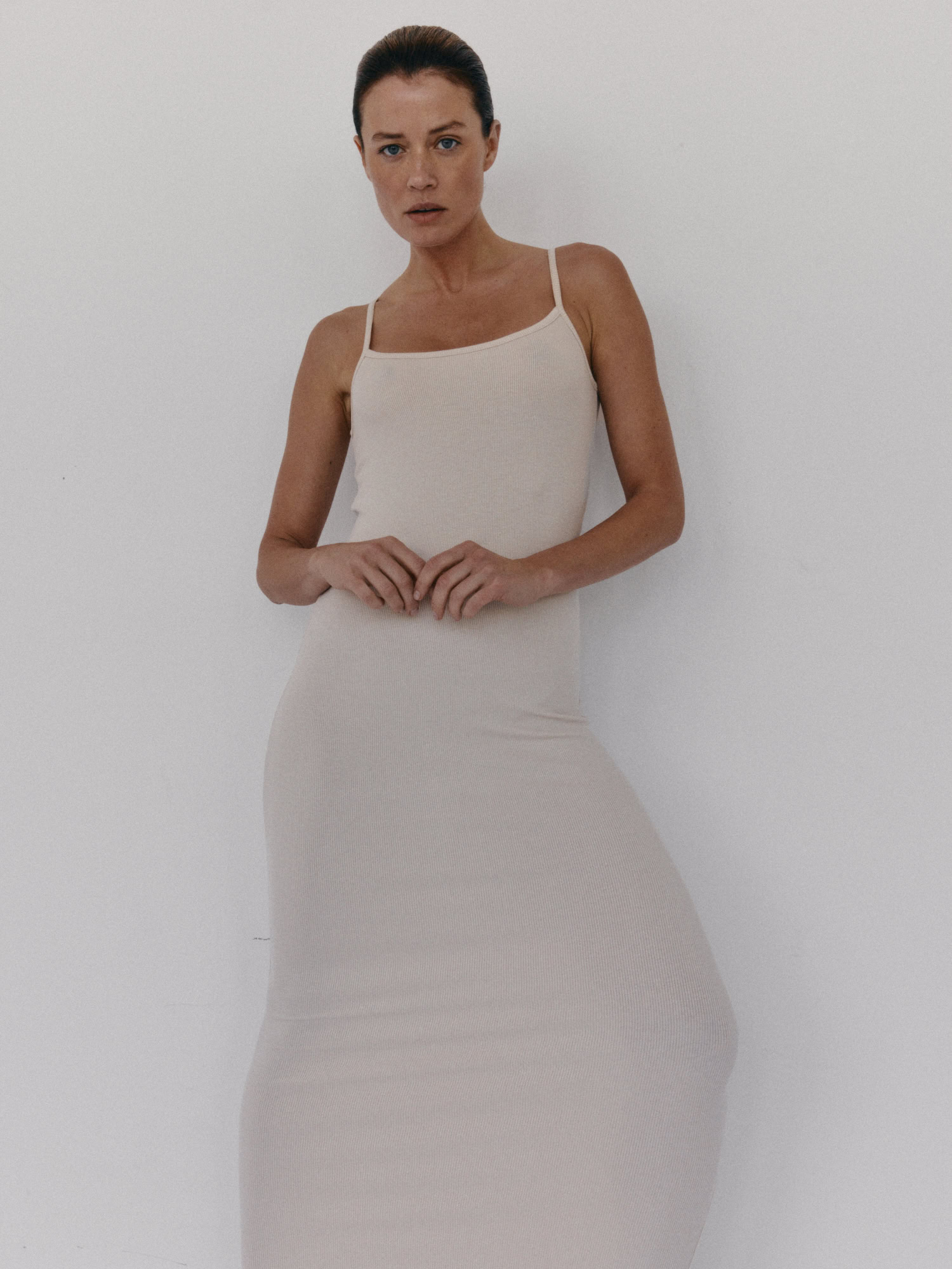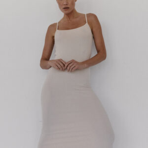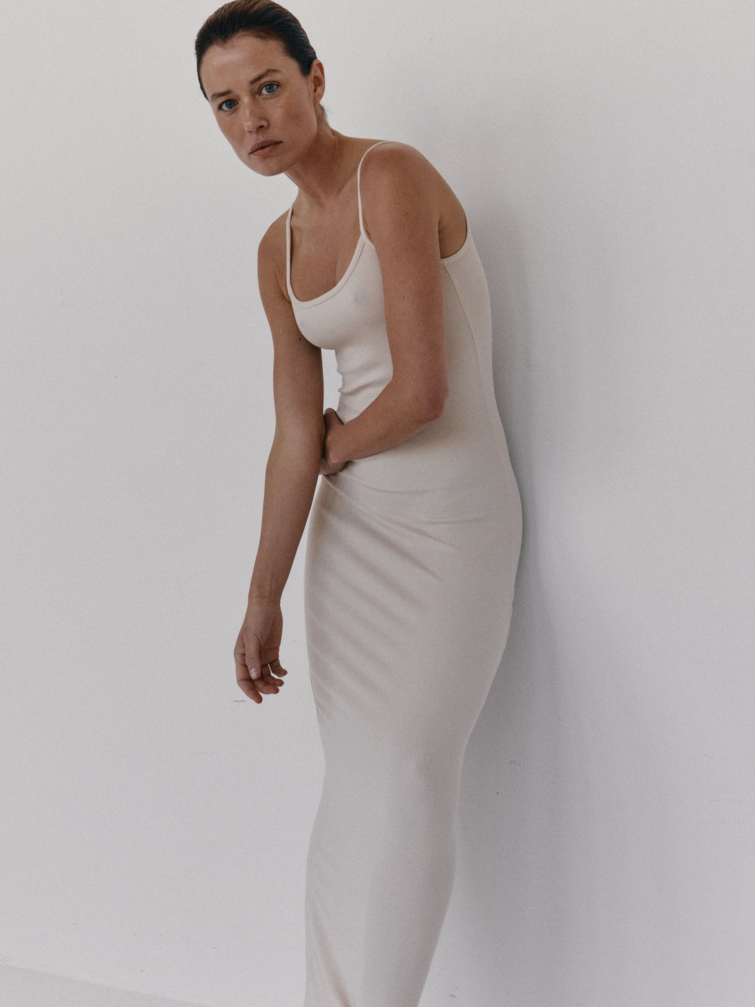 Długa prążkowana sukienka na cienkich ramiączka. Długość do kostek. Sukienka płynnie dopasowuje się do kształtu sylwetki podkreślając ją. Model sprawdzi się idealnie zarówno na codzień, jak i na wieczorne wyjście. Można ją nosić solo lub w połączeniu z bluzą czy marynarką.