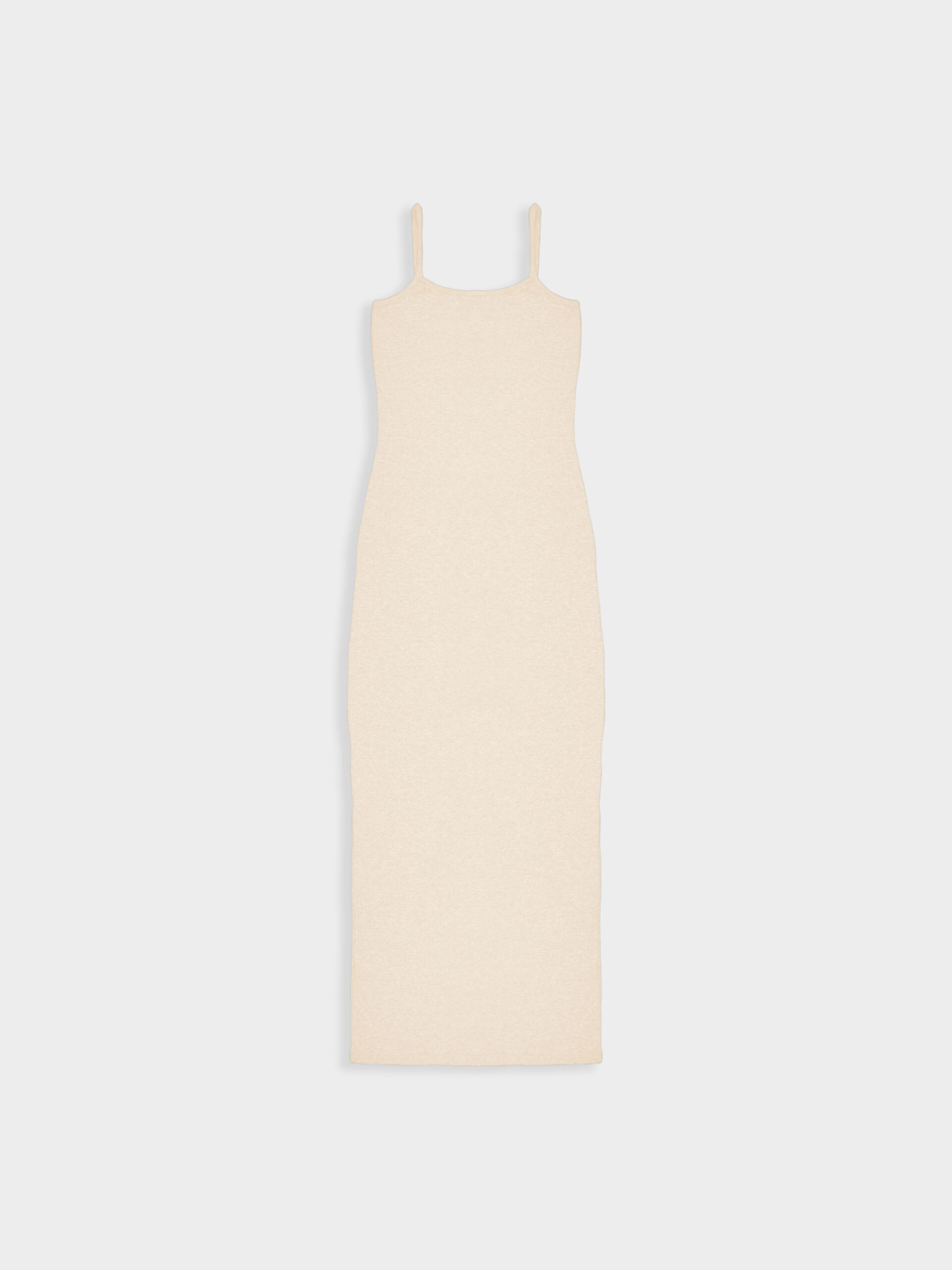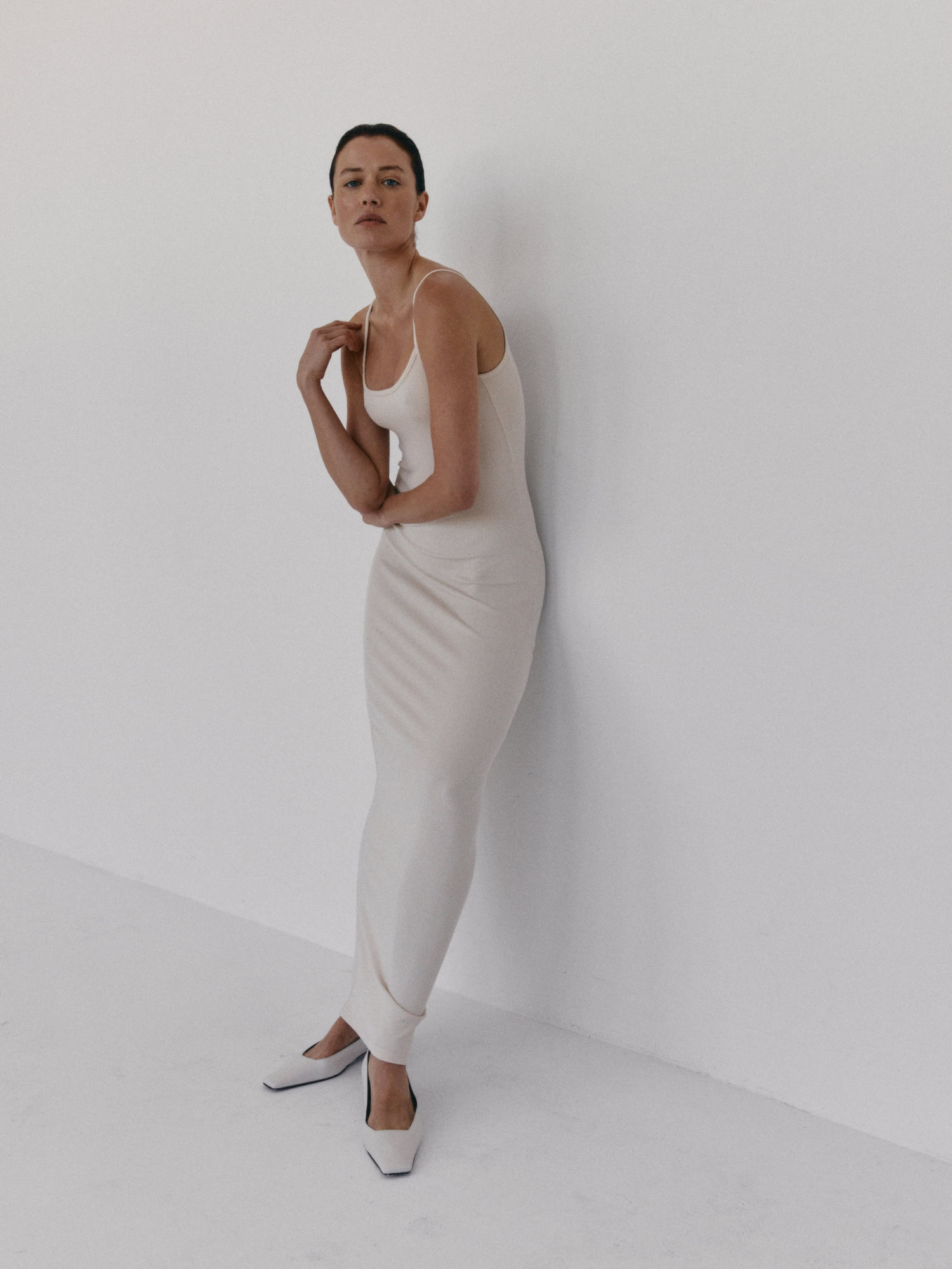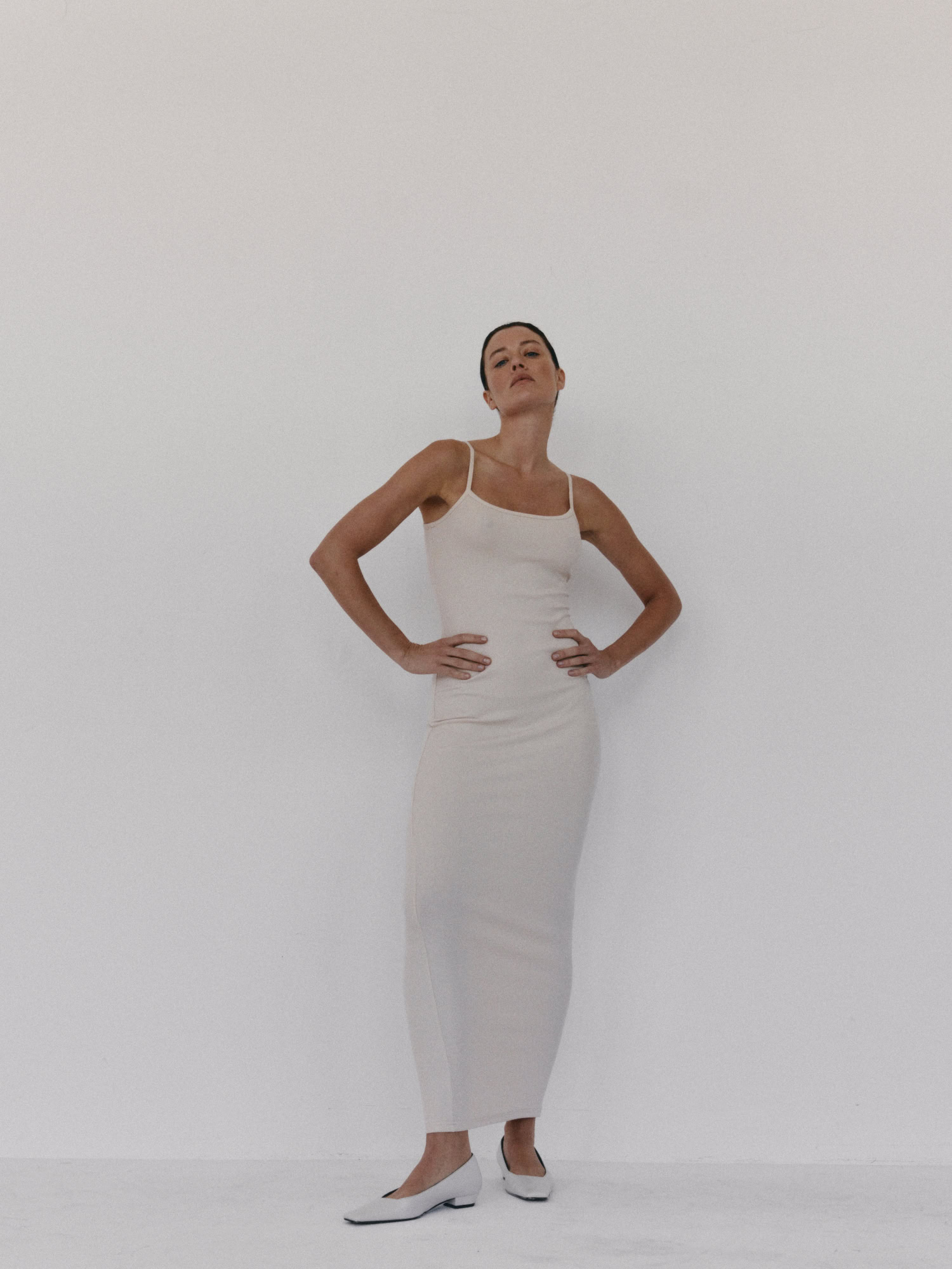 Długa prążkowana sukienka na cienkich ramiączka. Długość do kostek. Sukienka płynnie dopasowuje się do kształtu sylwetki podkreślając ją. Model sprawdzi się idealnie zarówno na codzień, jak i na wieczorne wyjście. Można ją nosić solo lub w połączeniu z bluzą czy marynarką.