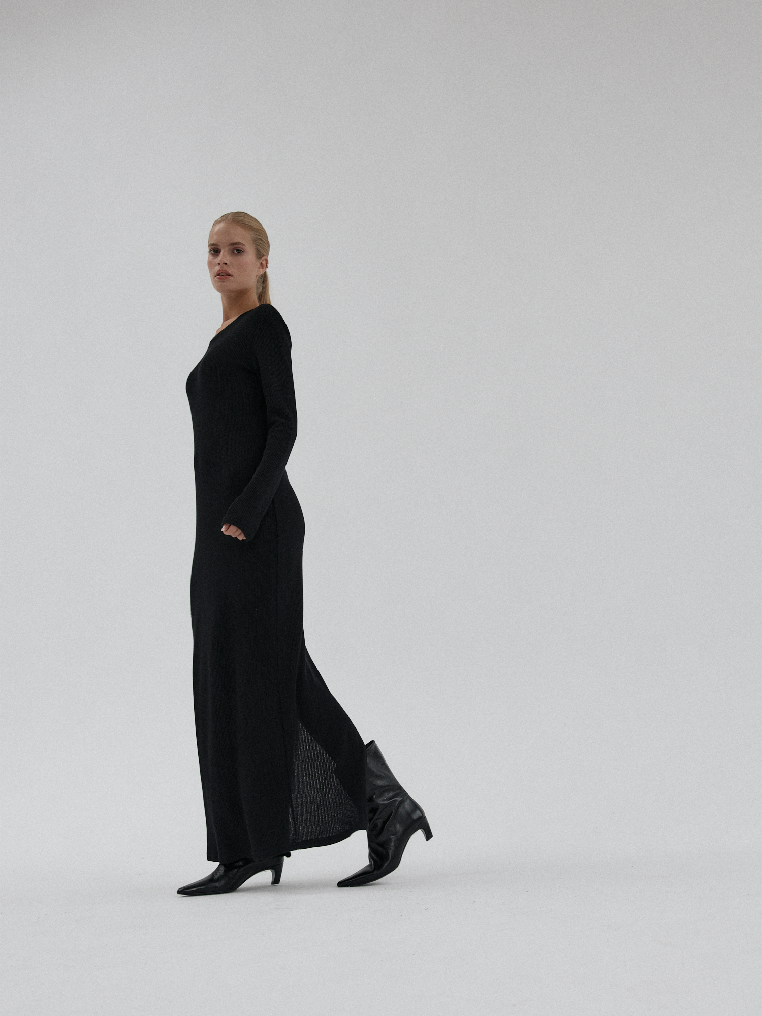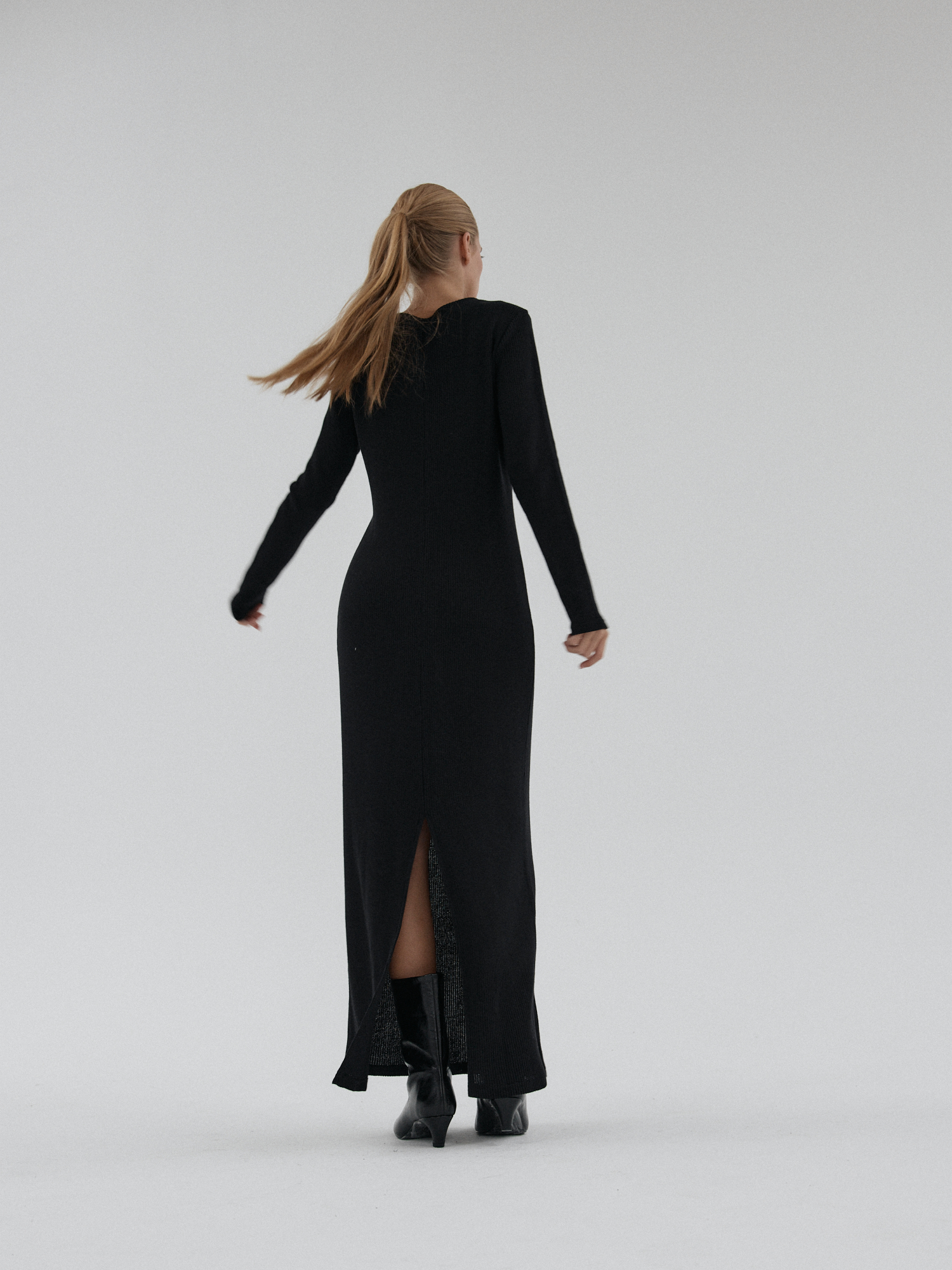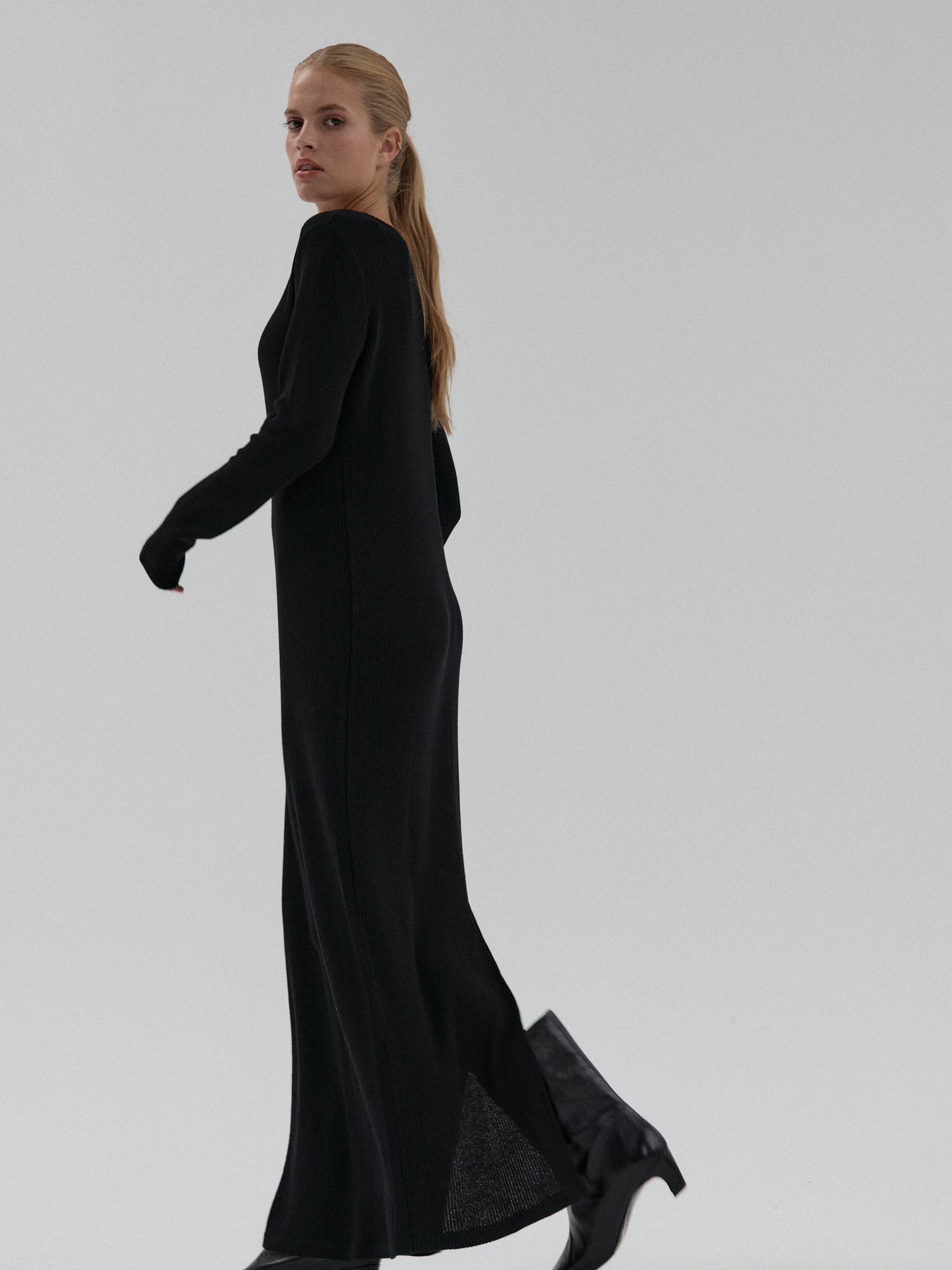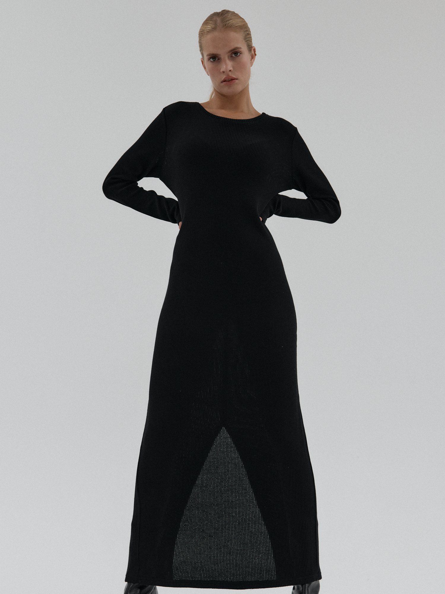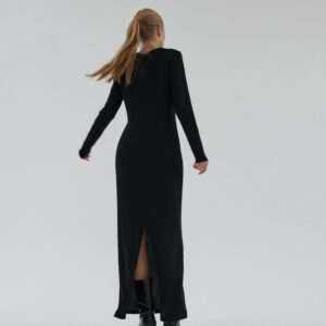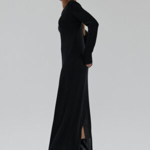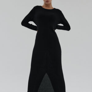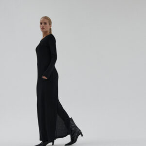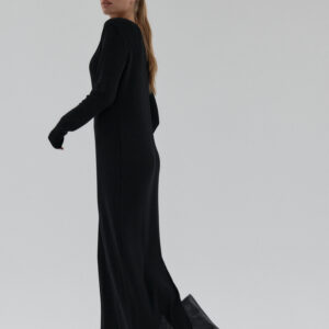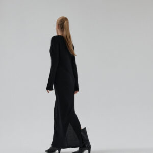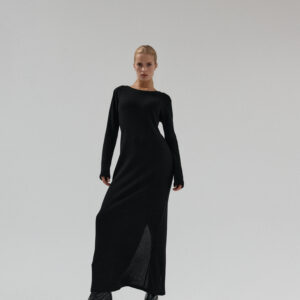 Długa sukienka z dzianiny sweterkowej. Delikatnie dopasowuje się do sylwetki, podkreślając jej kształt, a jednocześnie zapewnia pełen komfort noszenia. Rozcięcie z tyłu pozwala na swobodę ruchu. Idealnie sprawdzi się na co dzień jak i na eleganckie wyjście.