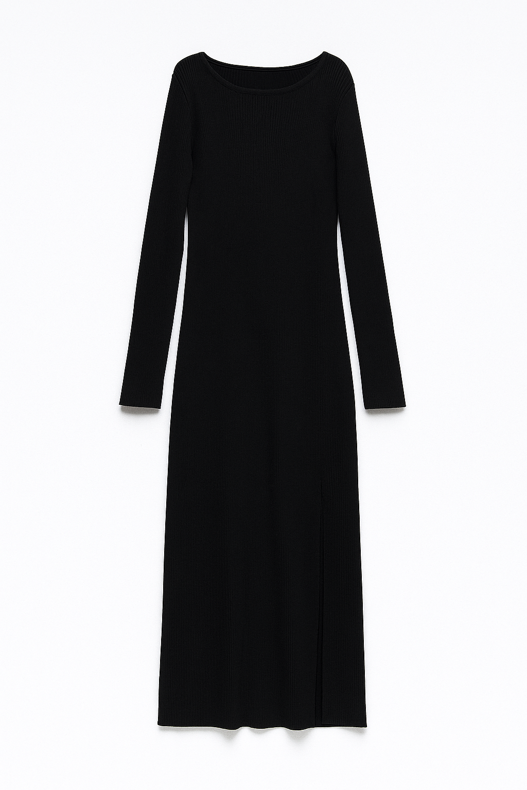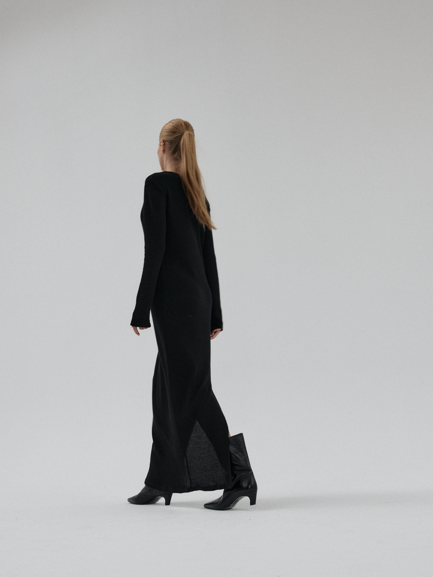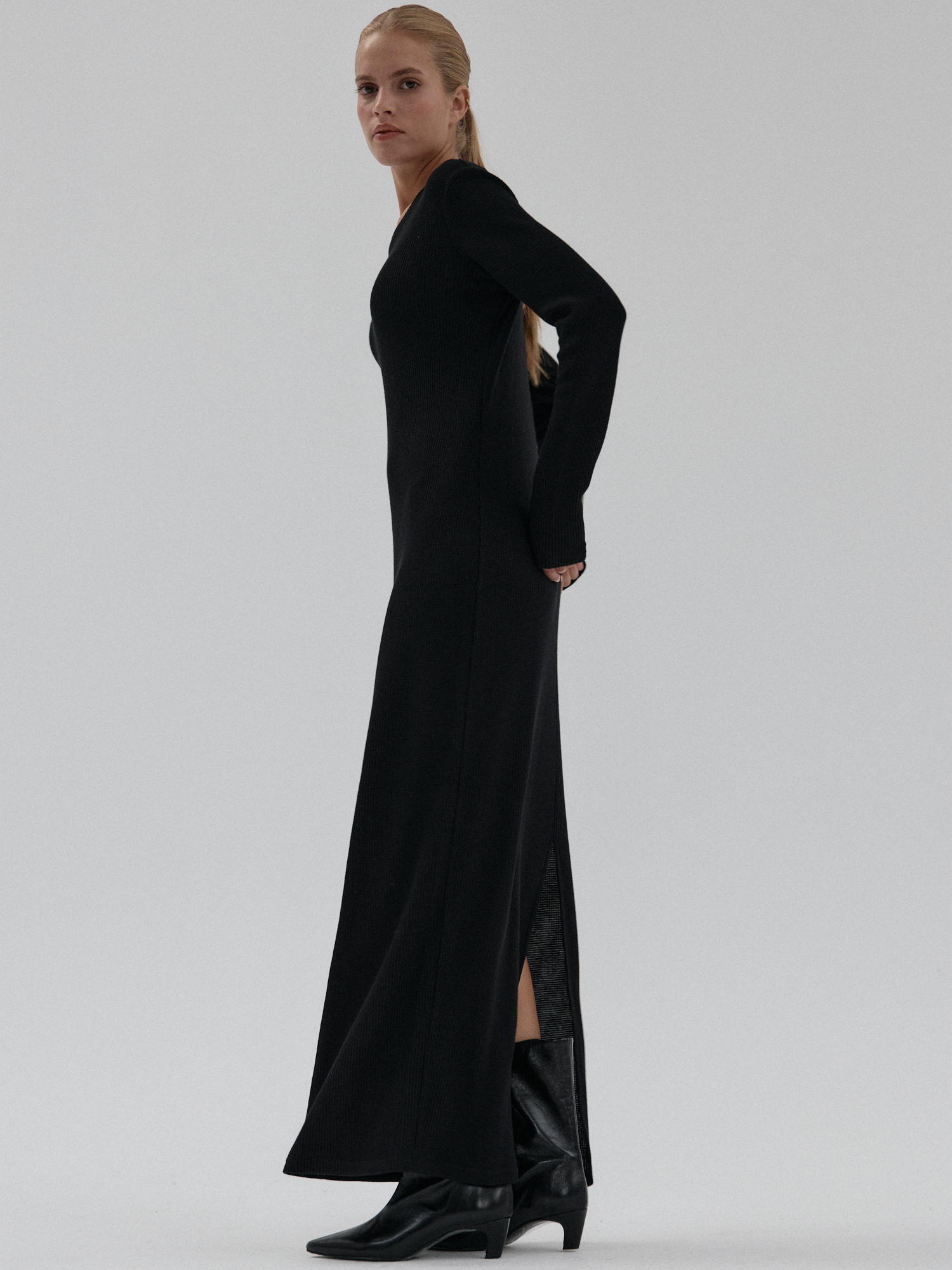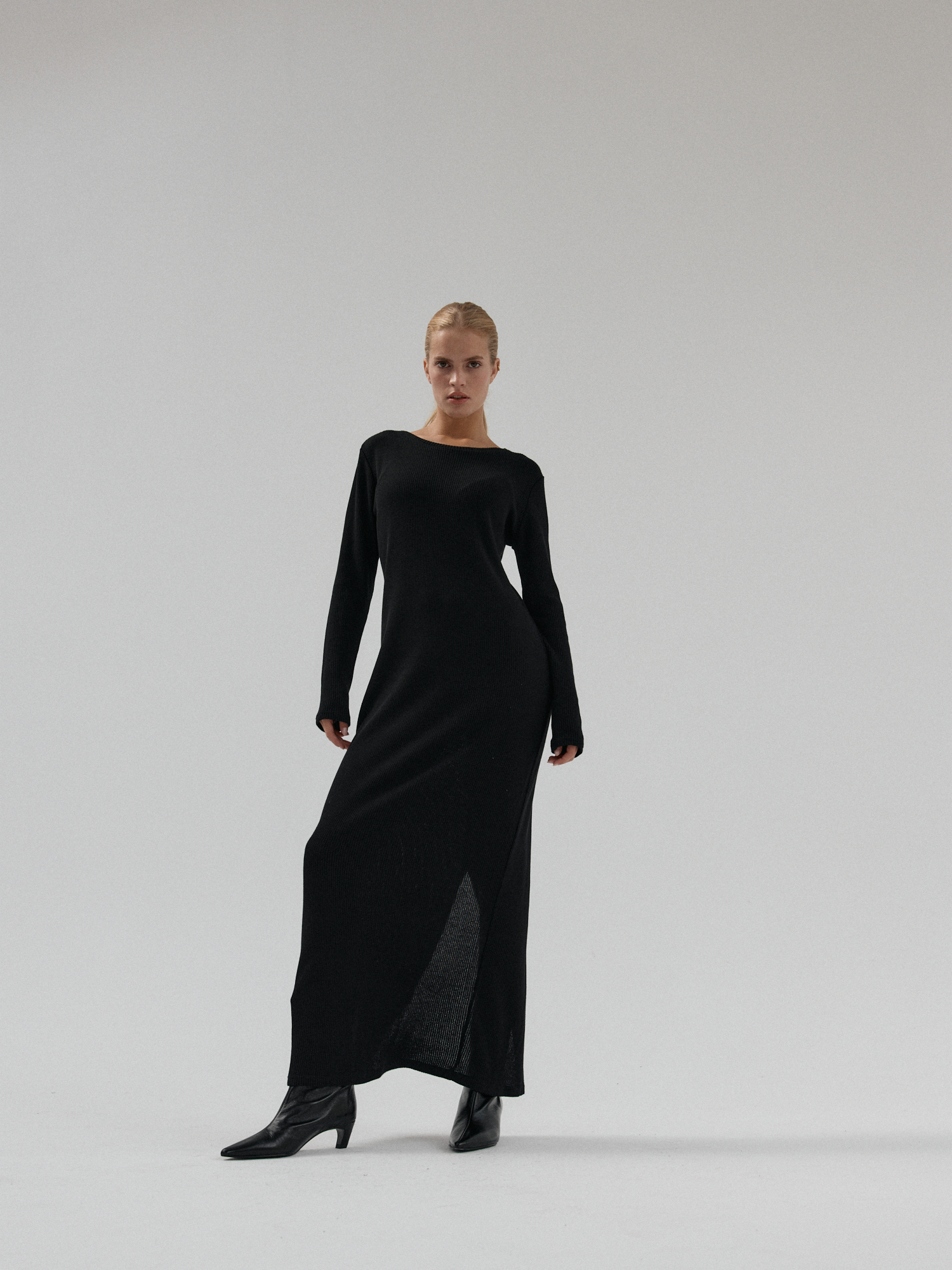 Długa sukienka z dzianiny sweterkowej. Delikatnie dopasowuje się do sylwetki, podkreślając jej kształt, a jednocześnie zapewnia pełen komfort noszenia. Rozcięcie z tyłu pozwala na swobodę ruchu. Idealnie sprawdzi się na co dzień jak i na eleganckie wyjście.