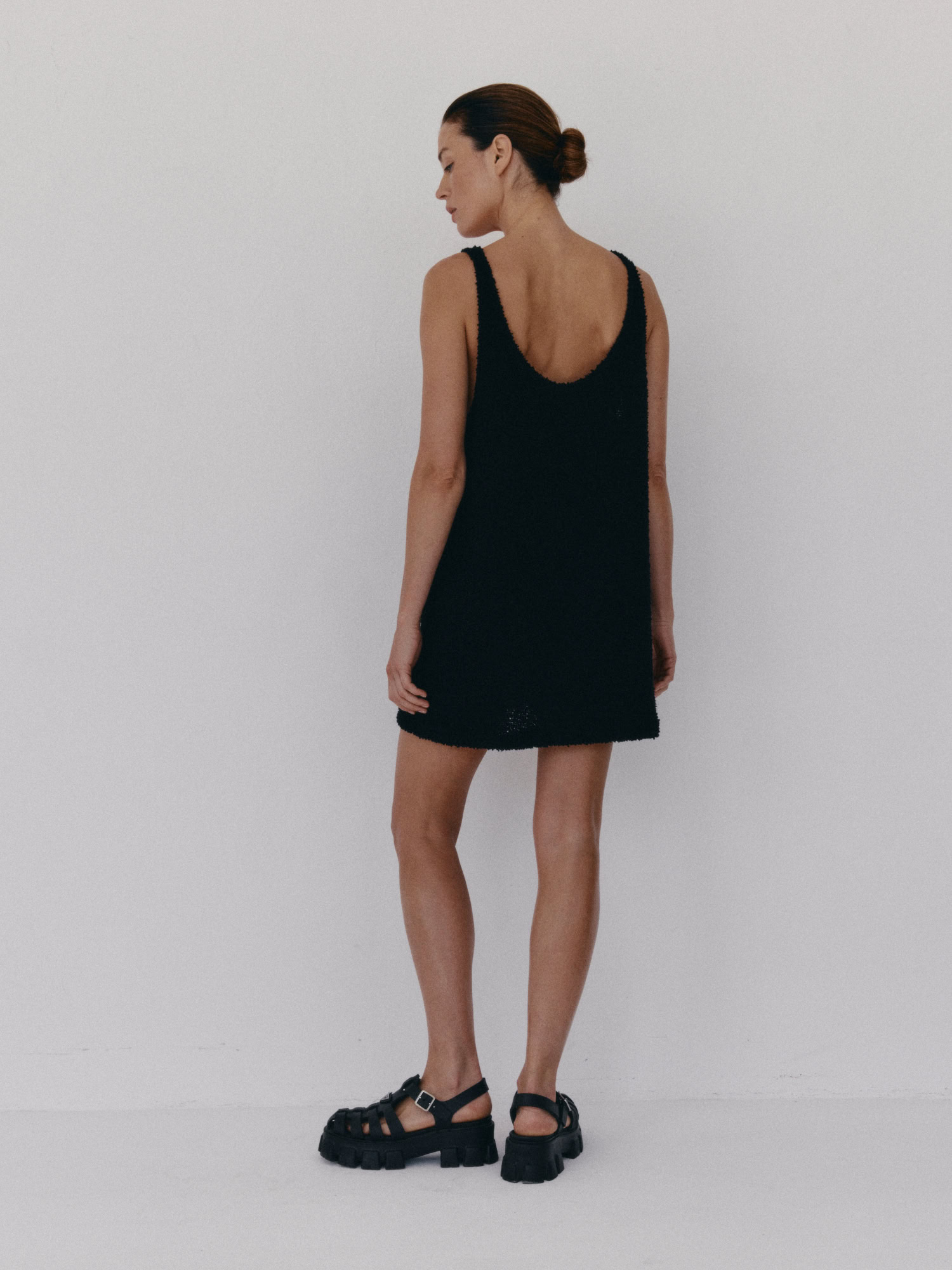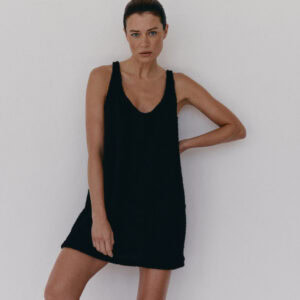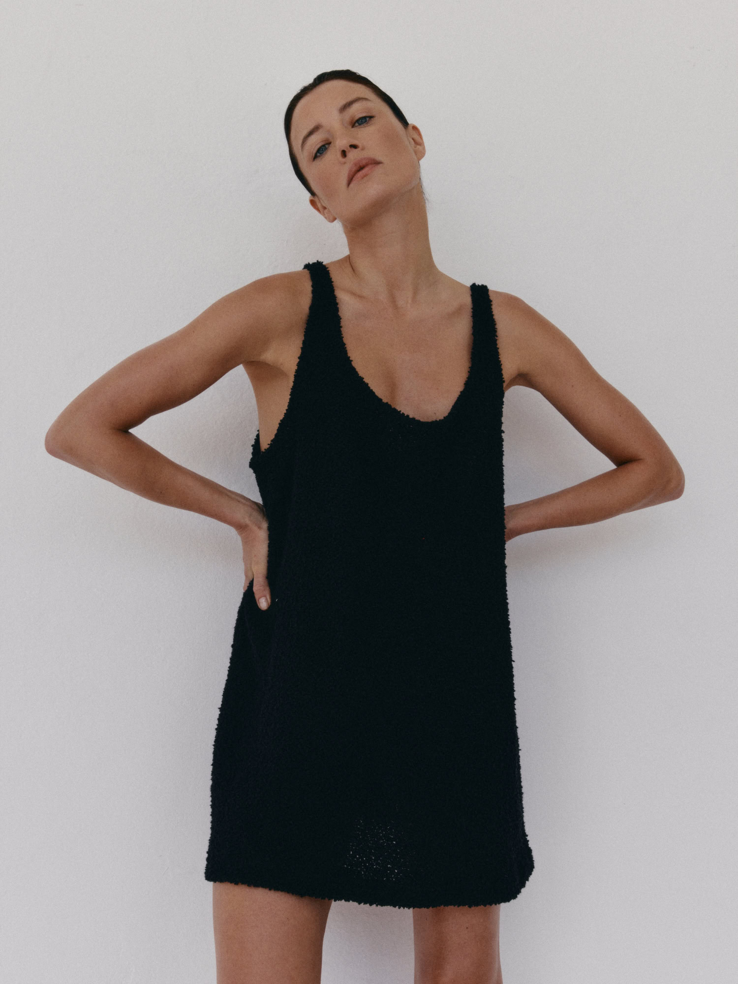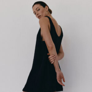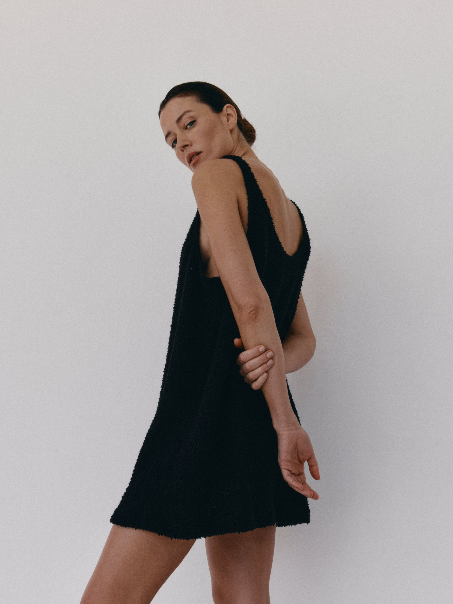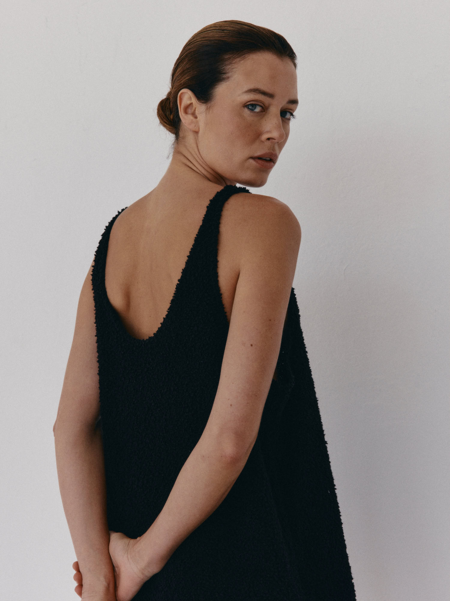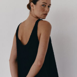 Prosta sukienka na szerokich ramiączkach o strukturze boucle i luźnym kroju. Subtelnie wycięty dekolt w kształcie litery U idealnie podkreśla linię biustu. Model sprawdzi się zarówno na co dzień, jak i wieczorne wyjście.